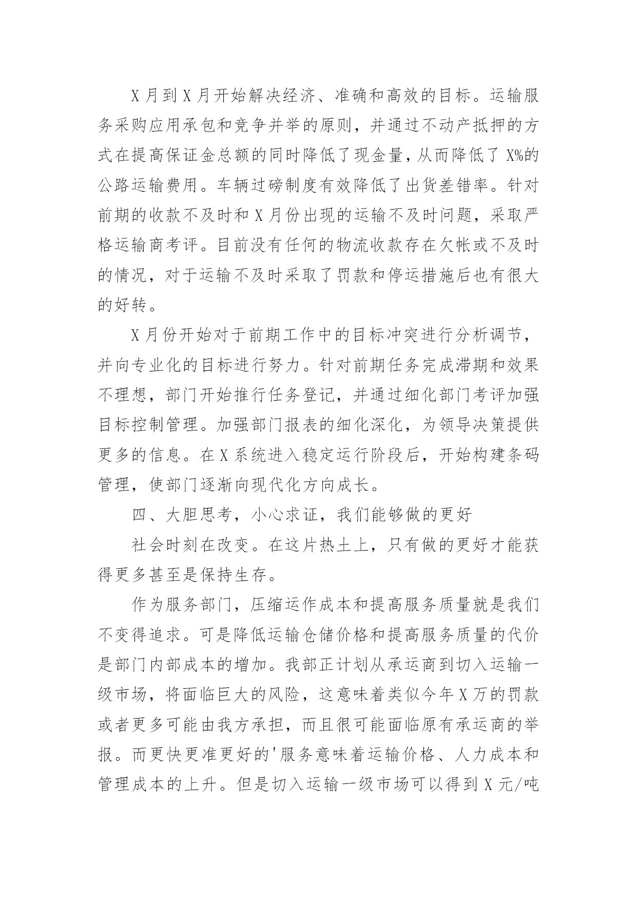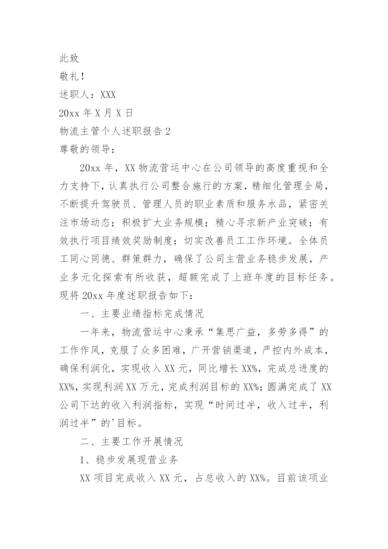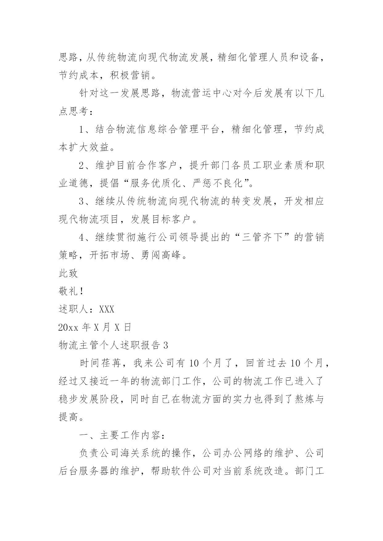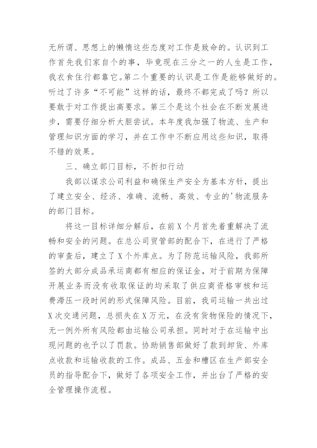 物流主管个人述职报告物流主管个人述职报告随着社会不断地进步,越来越多人会去使用报告,我们在写报告的时候要注意涵盖报告的基本要素。那么一般报告是怎么写的呢?以下是小编整理的物流主管个人述职报告,供大家参考借鉴,希望可以帮助到有需要的朋友。物流主管个人述职报告1尊敬的各位领导:20xx年是XX公司成立和投入运行的年份,也是我个人事业一个新的起点。如果说工作的头两年我主要是在学习,那这一年中就要求我花相当的时间在观察、分析、思考和行动上。一、回首往事年初到X月是XX公司成立的准备工作,在这段时间,协助公司领导做好项目的前期调研评估和各项准备工作。X月下旬开始担任物流部经理主持部门工作。X月份完成了部门的流程和岗位职责建设,和财务一起完善公司单据,构建X和成品公路运输渠道。X月份开始根据销售部需要设立外库,建立水运渠道,配合财务展开X系统的工作开展,建立部门基本档案卷宗和相应管理办法,并在行政部配合下重整了外包工作。X月份在对前期工作作了总结,并针对问题集中解决了外单位入厂车辆管理、X运输衔接、公路运输收款、财务付款等流程,针对X月份库存偏差中的人为因素进行了班组的教育,结合公司安全教育展开了部门的安全检查,对外库点派驻人员的工作进行了分派。X月份配合行政部做好了部门的工作考评表并根据考评内容确立了部门工作检查制度,着手重要岗位的培训计划,建立外库的休假制度,对部分外库点做好了抽检工作,并着手准备运输供应商考评。X月份对部门卫生工作进行了强化,计划如何进一步推进公路运输工作,着手建立部门报表的整合和细化,进行部门费用分析,在部门内部尝试进行办公软件的培训以期培养部门学习氛围。X月开展企业文化的宣讲,着手条码管理项目的计划和前期接触,通过完善部门盘库制度进一步提高了部门数据的准确率,加强了部门数据的保护工作,提出严格备份和报表无纸化,针对考评工作在前期出现的问题对考评条文进行了量化细化。X月开始条码项目的前期调研和硬件架设,部门内部使用任务登记本加强执行力强调执行效率和结果,开展部门礼仪培训,准备年终总结。回想过去,一年的种种情况现在还历历在目,现在细想许多问题的。处理解决还有很多可以改进的地方。但当时部门还是相当尽力的工作,力争达到最好效果。二、加强思想认识,做到学以致用对环境和自我的判断决定我们的行为。我个人认为这一年所有的工作改变首先来自于思想上的转变。怀疑、抱怨、无所谓、思想上的懒惰这些态度对工作是致命的。认识到工作首先我们家自个的事,毕竟现在三分之一的人生是工作,我衣食住行都靠它。第二个重要的认识是工作是能够做好的。听过了许多“不可能”这样的话,最终不都完成了吗?所以要敢于对工作提出高要求。第三个是这个社会在不断发展进步,需要仔细分析大胆尝试。本年度我加强了物流、生产和管理知识方面的学习,并在工作中不断应用这些知识,取得不错的效果。三、确立部门目标,不折扣行动我部以谋求公司利益和确保生产安全为基本方针,提出了建立安全、经济、准确、流畅、高效、专业的'物流服务的部门目标。将这一目标详细分解后,在前X个月首先着重解决了流畅和安全的问题。在总公司贸管部的配合下,在进行了严格的审查后,建立了X个外库点。为了防范运输风险,我部所签的大部分成品承运商都有相应的保证金,对于前期为保障开展业务而没有收取保证的均采取了供应商资格审核和运费滞压一段时间的形式保障风险。目前,我司运输一共出过X次交通问题,总损失在X万元,在没有货物保险的情况下,无一例外所有风险都由运输公司承担。同时对于在运输中出现问题的也予以了罚款。协助销售部做好了款到卸货、外库点收款和运输收款的工作。成品、五金和槽区在生产部安全员的指导配合下,做好了各项安全工作,并出台了严格的安全管理操作流程。X月到X月开始解决经济、准确和高效的目标。运输服务采购应用承包和竞争并举的原则,并通过不动产抵押的方式在提高保证金总额的同时降低了现金量,从而降低了X%的公路运输费用。车辆过磅制度有效降低了出货差错率。针对前期的收款不及时和X月份出现的运输不及时问题,采取严格运输商考评。目前没有任何的物流收款存在欠帐或不及时的情况,对于运输不及时采取了罚款和停运措施后也有很大的好转。X月份开始对于前期工作中的目标冲突进行分析调节,并向专业化的目标进行努力。针对前期任务完成滞期和效果不理想,部门开始推行任务登记,并通过细化部门考评加强目标控制管理。加强部门报表的细化深化,为领导决策提供更多的信息。在X系统进入稳定运行阶段后,开始构建条码管理,使部门逐渐向现代化方向成长。四、大胆思考,小心求证,我们能够做的更好社会时刻在改变。在这片热土上,只有做的更好才能获得更多甚至是保持生存。作为服务部门,压缩运作成本和提高服务质量就是我们不变得追求。可是降低运输仓储价格和提高服务质量的代价是部门内部成本的增加。我部正