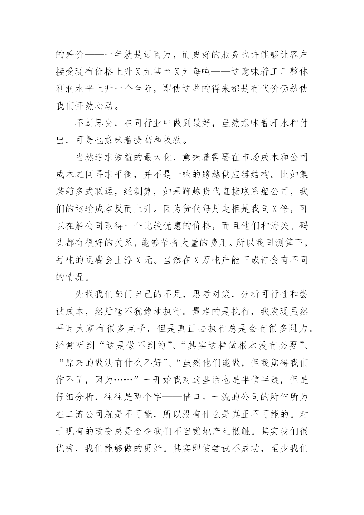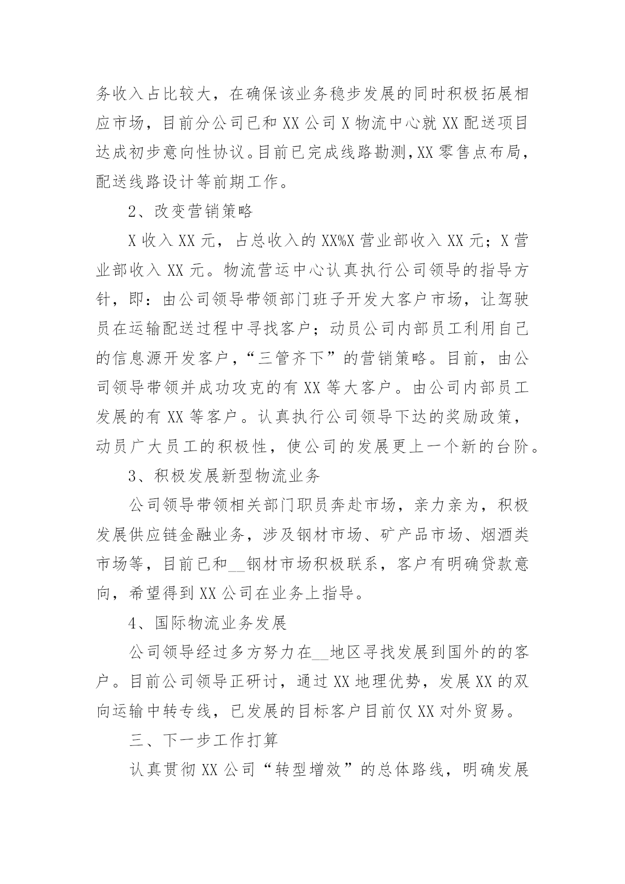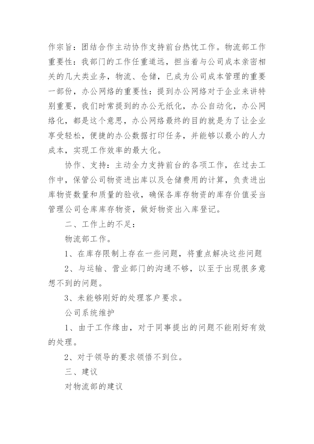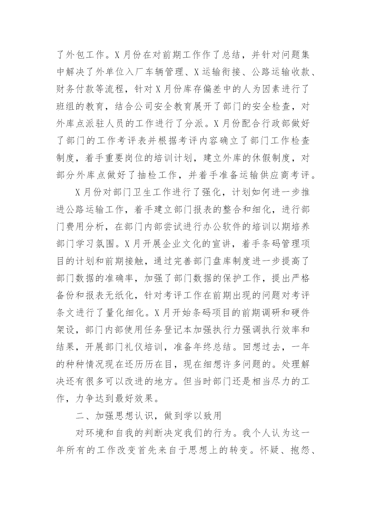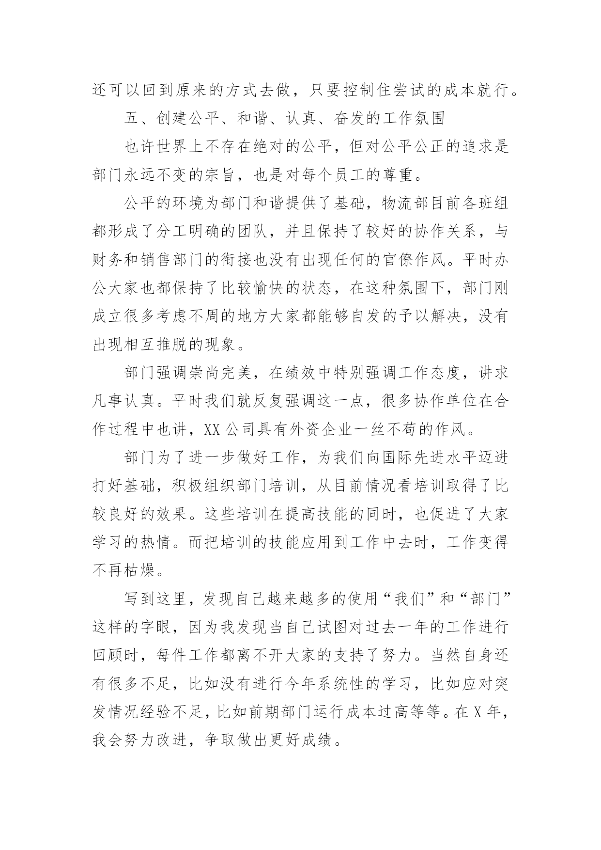 物流主管个人述职报告物流主管个人述职报告随着社会不断地进步,越来越多人会去使用报告,我们在写报告的时候要注意涵盖报告的基本要素。那么一般报告是怎么写的呢?以下是小编整理的物流主管个人述职报告,供大家参考借鉴,希望可以帮助到有需要的朋友。物流主管个人述职报告1尊敬的各位领导:20xx年是XX公司成立和投入运行的年份,也是我个人事业一个新的起点。如果说工作的头两年我主要是在学习,那这一年中就要求我花相当的时间在观察、分析、思考和行动上。一、回首往事年初到X月是XX公司成立的准备工作,在这段时间,协助公司领导做好项目的前期调研评估和各项准备工作。X月下旬开始担任物流部经理主持部门工作。X月份完成了部门的流程和岗位职责建设,和财务一起完善公司单据,构建X和成品公路运输渠道。X月份开始根据销售部需要设立外库,建立水运渠道,配合财务展开X系统的工作开展,建立部门基本档案卷宗和相应管理办法,并在行政部配合下重整了外包工作。X月份在对前期工作作了总结,并针对问题集中解决了外单位入厂车辆管理、X运输衔接、公路运输收款、财务付款等流程,针对X月份库存偏差中的人为因素进行了班组的教育,结合公司安全教育展开了部门的安全检查,对外库点派驻人员的工作进行了分派。X月份配合行政部做好了部门的工作考评表并根据考评内容确立了部门工作检查制度,着手重要岗位的培训计划,建立外库的休假制度,对部分外库点做好了抽检工作,并着手准备运输供应商考评。X月份对部门卫生工作进行了强化,计划如何进一步推进公路运输工作,着手建立部门报表的整合和细化,进行部门费用分析,在部门内部尝试进行办公软件的培训以期培养部门学习氛围。X月开展企业文化的宣讲,着手条码管理项目的计划和前期接触,通过完善部门盘库制度进一步提高了部门数据的准确率,加强了部门数据的保护工作,提出严格备份和报表无纸化,针对考评工作在前期出现的问题对考评条文进行了量化细化。X月开始条码项目的前期调研和硬件架设,部门内部使用任务登记本加强执行力强调执行效率和结果,开展部门礼仪培训,准备年终总结。回想过去,一年的种种情况现在还历历在目,现在细想许多问题的。处理解决还有很多可以改进的地方。但当时部门还是相当尽力的工作,力争达到最好效果。二、加强思想认识,做到学以致用对环境和自我的判断决定我们的行为。我个人认为这一年所有的工作改变首先来自于思想上的转变。怀疑、抱怨、无所谓、思想上的懒惰这些态度对工作是致命的。认识到工作首先我们家自个的事,毕竟现在三分之一的人生是工作,我衣食住行都靠它。第二个重要的认识是工作是能够做好的。听过了许多“不可能”这样的话,最终不都完成了吗?所以要敢于对工作提出高要求。第三个是这个社会在不断发展进步,需要仔细分析大胆尝试。本年度我加强了物流、生产和管理知识方面的学习,并在工作中不断应用这些知识,取得不错的效果。三、确立部门目标,不折扣行动我部以谋求公司利益和确保生产安全为基本方针,提出了建立安全、经济、准确、流畅、高效、专业的'物流服务的部门目标。将这一目标详细分解后,在前X个月首先着重解决了流畅和安全的问题。在总公司贸管部的配合下,在进行了严格的审查后,建立了X个外库点。为了防范运输风险,我部所签的大部分成品承运商都有相应的保证金,对于前期为保障开展业务而没有收取保证的均采取了供应商资格审核和运费滞压一段时间的形式保障风险。目前,我司运输一共出过X次交通问题,总损失在X万元,在没有货物保险的情况下,无一例外所有风险都由运输公司承担。同时对于在运输中出现问题的也予以了罚款。协助销售部做好了款到卸货、外库点收款和运输收款的工作。成品、五金和槽区在生产部安全员的指导配合下,做好了各项安全工作,并出台了严格的安全管理操作流程。X月到X月开始解决经济、准确和高效的目标。运输服务采购应用承包和竞争并举的原则,并通过不动产抵押的方式在提高保证金总额的同时降低了现金量,从而降低了X%的公路运输费用。车辆过磅制度有效降低了出货差错率。针对前期的收款不及时和X月份出现的运输不及时问题,采取严格运输商考评。目前没有任何的物流收款存在欠帐或不及时的情况,对于运输不及时采取了罚款和停运措施后也有很大的好转。X月份开始对于前期工作中的目标冲突进行分析调节,并向专业化的目标进行努力。针对前期任务完成滞期和效果不理想,部门开始推行任务登记,并通过细化部门考评加强目标控制管理。加强部门报表的细化深化,为领导决策提供更多的信息。在X系统进入稳定运行阶段后,开始构建条码管理,使部门逐渐向现代化方向成长。四、大胆思考,小心求证,我们能够做的更好社会时刻在改变。在这片热土上,只有做的更好才能获得更多甚至是保持生存。作为服务部门,压缩运作成本和提高服务质量就是我们不变得追求。可是降低运输仓储价格和提高服务质量的代价是部门内部成本的增加。我部正