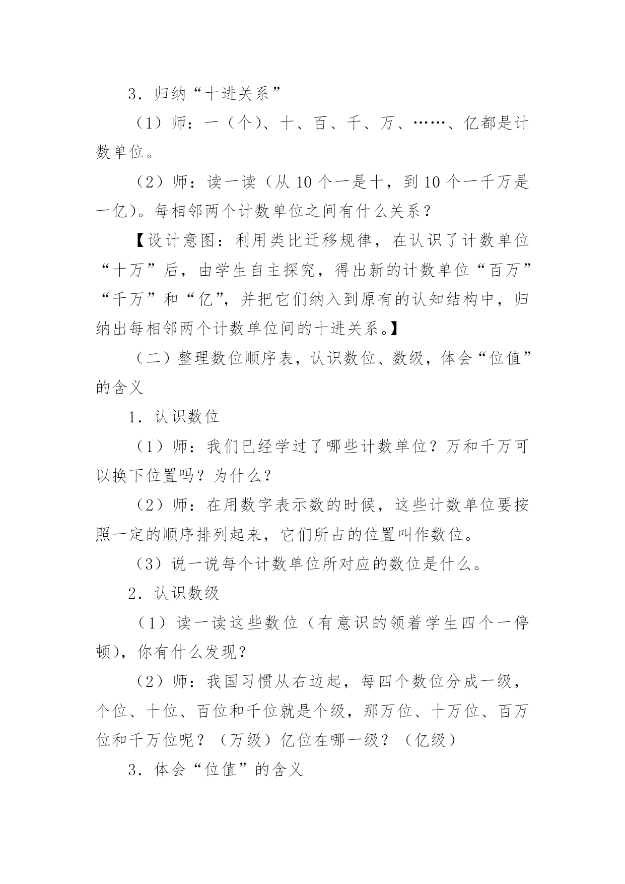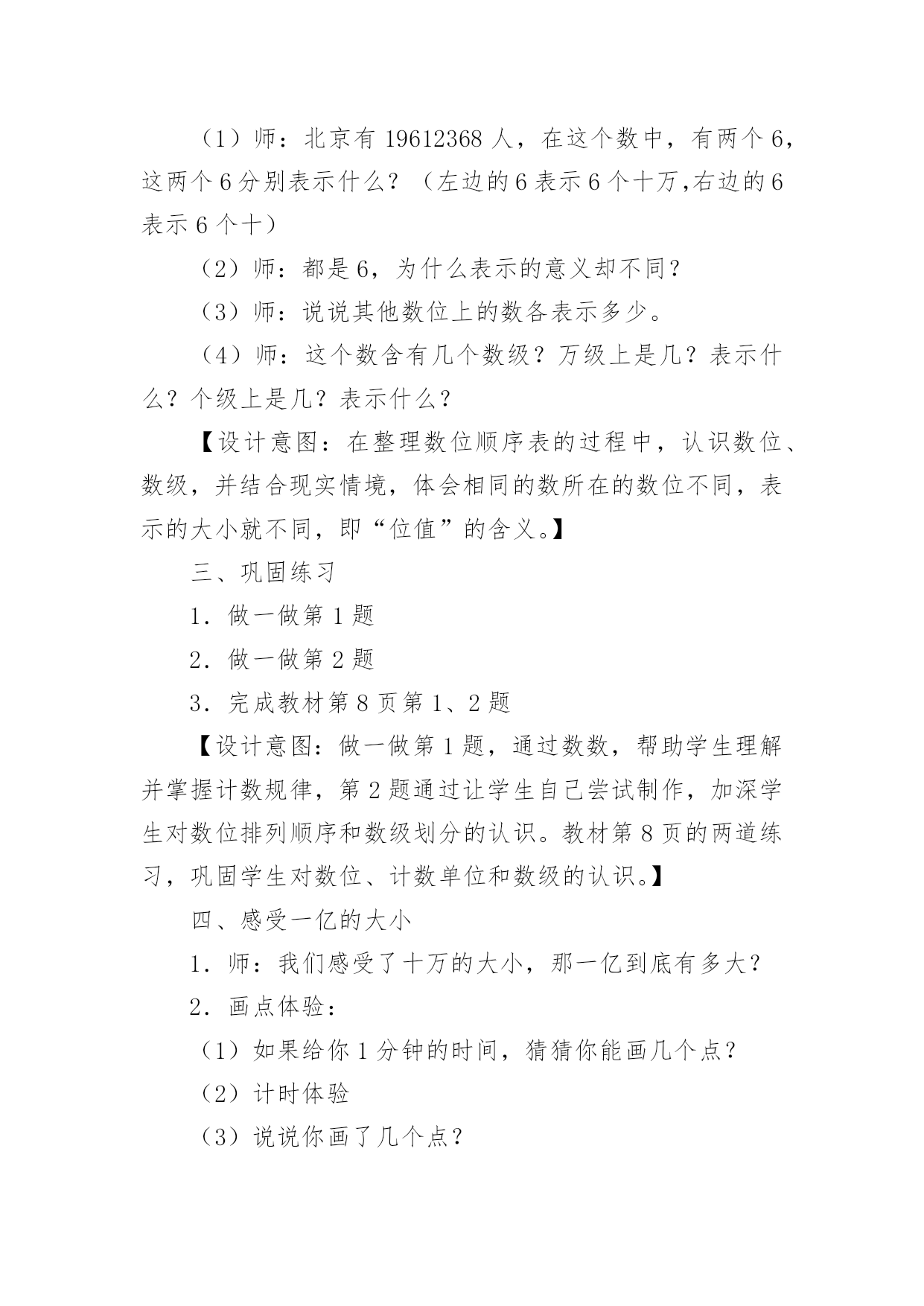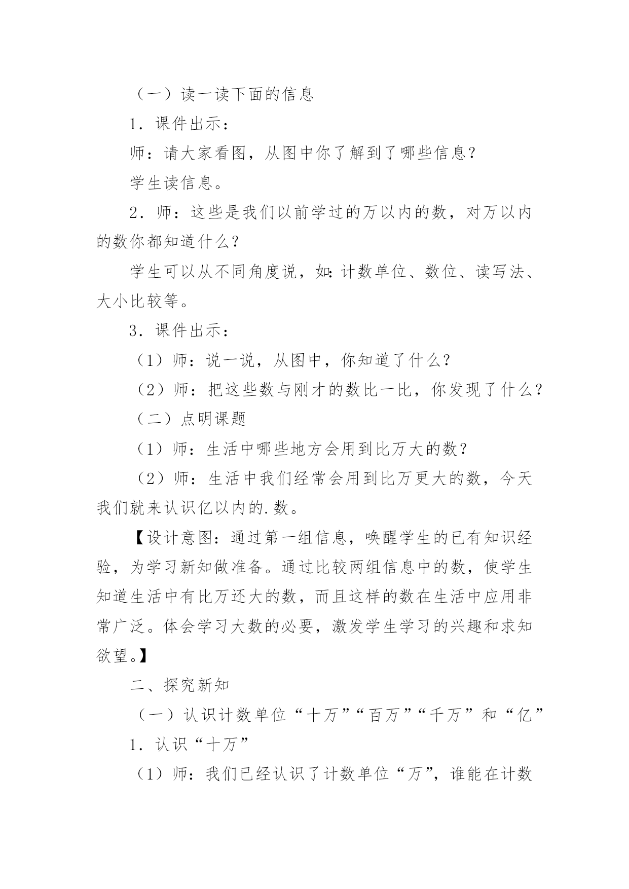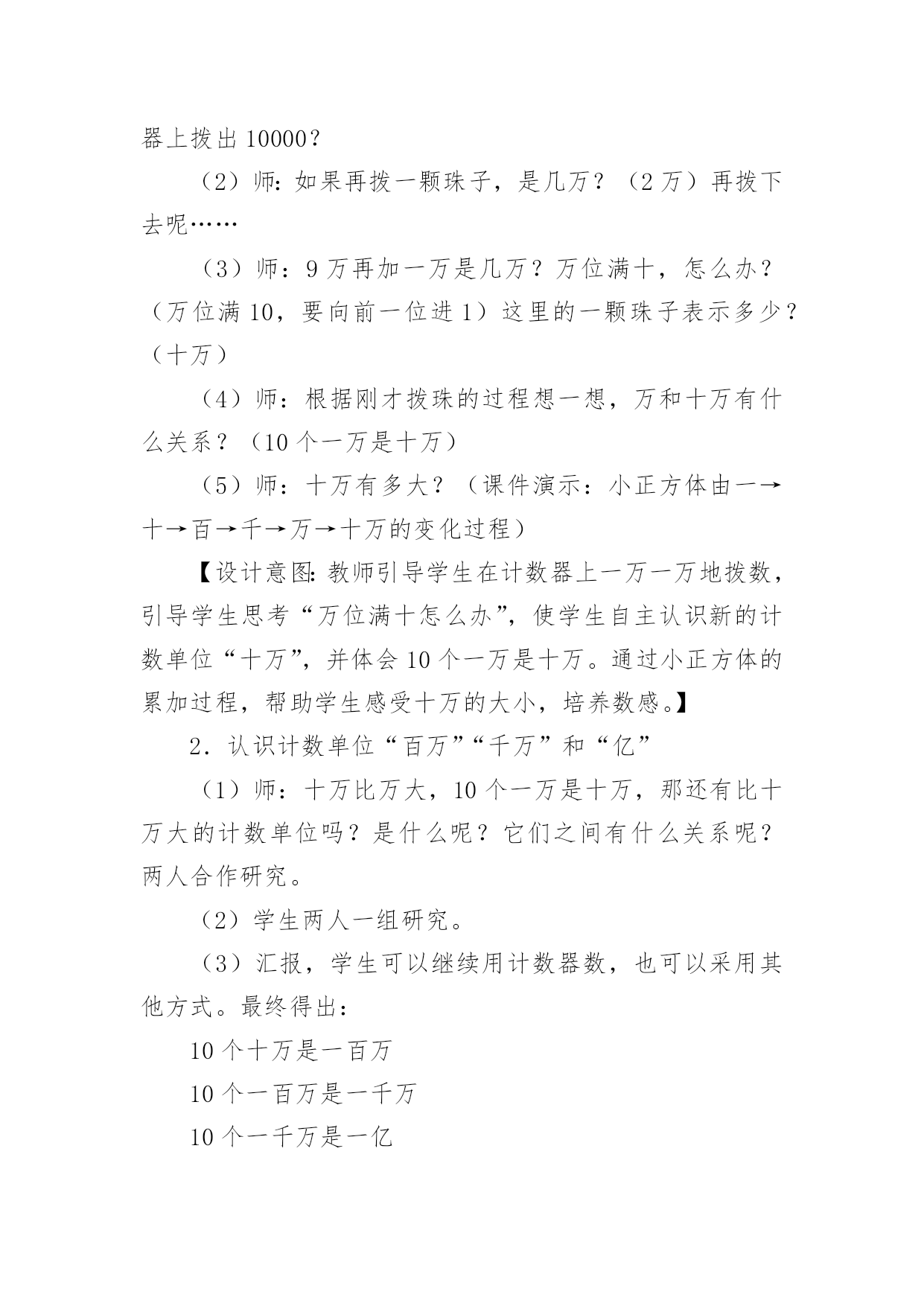 《大数的认识》教学设计作为一名老师,时常需要编写教学设计,教学设计以计划和布局安排的形式,对怎样才能达到教学目标进行创造性的决策,以解决怎样教的问题。那么优秀的教学设计是什么样的呢?以下是小编为大家收集的《大数的认识》教学设计,仅供参考,欢迎大家阅读。《大数的认识》教学设计1教学目标:1.知道生活中有比万大的数;认识新的计数单位“十万”“百万”“千万”“亿”,知道亿以内各个计数单位的名称,类推每相邻两个计数单位之间的关系,知道数级、数位,掌握数位顺序表。2.结合现实情境,利用数位顺序表进一步体会“位值”的含义。3.在结合现实情境认识大数的过程中,体会大数的意义。教学重点:认识计数单位“万、十万、百万、千万、亿”。教学难点:体会“位值”的含义。教学准备:课件、计数器教学过程一、情境创设,揭示课题(一)读一读下面的信息1.课件出示:师:请大家看图,从图中你了解到了哪些信息?学生读信息。2.师:这些是我们以前学过的万以内的数,对万以内的数你都知道什么?学生可以从不同角度说,如:计数单位、数位、读写法、大小比较等。3.课件出示:(1)师:说一说,从图中,你知道了什么?(2)师:把这些数与刚才的数比一比,你发现了什么?(二)点明课题(1)师:生活中哪些地方会用到比万大的数?(2)师:生活中我们经常会用到比万更大的数,今天我们就来认识亿以内的.数。【设计意图:通过第一组信息,唤醒学生的已有知识经验,为学习新知做准备。通过比较两组信息中的数,使学生知道生活中有比万还大的数,而且这样的数在生活中应用非常广泛。体会学习大数的必要,激发学生学习的兴趣和求知欲望。】二、探究新知(一)认识计数单位“十万”“百万”“千万”和“亿”1.认识“十万”(1)师:我们已经认识了计数单位“万”,谁能在计数器上拨出10000?(2)师:如果再拨一颗珠子,是几万?(2万)再拨下去呢……(3)师:9万再加一万是几万?万位满十,怎么办?(万位满10,要向前一位进1)这里的一颗珠子表示多少?(十万)(4)师:根据刚才拨珠的过程想一想,万和十万有什么关系?(10个一万是十万)(5)师:十万有多大?(课件演示:小正方体由一→十→百→千→万→十万的变化过程)【设计意图:教师引导学生在计数器上一万一万地拨数,引导学生思考“万位满十怎么办”,使学生自主认识新的计数单位“十万”,并体会10个一万是十万。通过小正方体的累加过程,帮助学生感受十万的大小,培养数感。】2.认识计数单位“百万”“千万”和“亿”(1)师:十万比万大,10个一万是十万,那还有比十万大的计数单位吗?是什么呢?它们之间有什么关系呢?两人合作研究。(2)学生两人一组研究。(3)汇报,学生可以继续用计数器数,也可以采用其他方式。最终得出:10个十万是一百万10个一百万是一千万10个一千万是一亿3.归纳“十进关系”(1)师:一(个)、十、百、千、万、……、亿都是计数单位。(2)师:读一读(从10个一是十,到10个一千万是一亿)。每相邻两个计数单位之间有什么关系?【设计意图:利用类比迁移规律,在认识了计数单位“十万”后,由学生自主探究,得出新的计数单位“百万”“千万”和“亿”,并把它们纳入到原有的认知结构中,归纳出每相邻两个计数单位间的十进关系。】(二)整理数位顺序表,认识数位、数级,体会“位值”的含义1.认识数位(1)师:我们已经学过了哪些计数单位?万和千万可以换下位置吗?为什么?(2)师:在用数字表示数的时候,这些计数单位要按照一定的顺序排列起来,它们所占的位置叫作数位。(3)说一说每个计数单位所对应的数位是什么。2.认识数级(1)读一读这些数位(有意识的领着学生四个一停顿),你有什么发现?(2)师:我国习惯从右边起,每四个数位分成一级,个位、十位、百位和千位就是个级,那万位、十万位、百万位和千万位呢?(万级)亿位在哪一级?(亿级)3.体会“位值”的含义(1)师:北京有19612368人,在这个数中,有两个6,这两个6分别表示什么?(左边的6表示6个十万,右边的6表示6个十)(2)师:都是6,为什么表示的意义却不同?(3)师:说说其他数位上的数各表示多少。(4)师:这个数含有几个数级?万级上是几?表示什么?个级上是几?表示什么?【设计意图:在整理数位顺序表的过程中,认识数位、数级,并结合现实情境,体会相同的数所在的数位不同,表示的大小就不同,即“位值”的含义。】三、巩固练习1.做一做第1题2.做一做第2题3.完成教材第1、2题【设计意图:做一做第1题,通过数数,帮助学生理解并掌握计数规律,第2题通过让学生自己尝试制作,加深学生对数位排列顺序和数级划分的认识。教材的两道练习,巩固学生对数位、计数单位和数级的认识。】四、感受一亿的大小1.师:我们感受了十万的大小,那一亿到底有多大?2.画点体验:(1)如果给你1分钟的时间