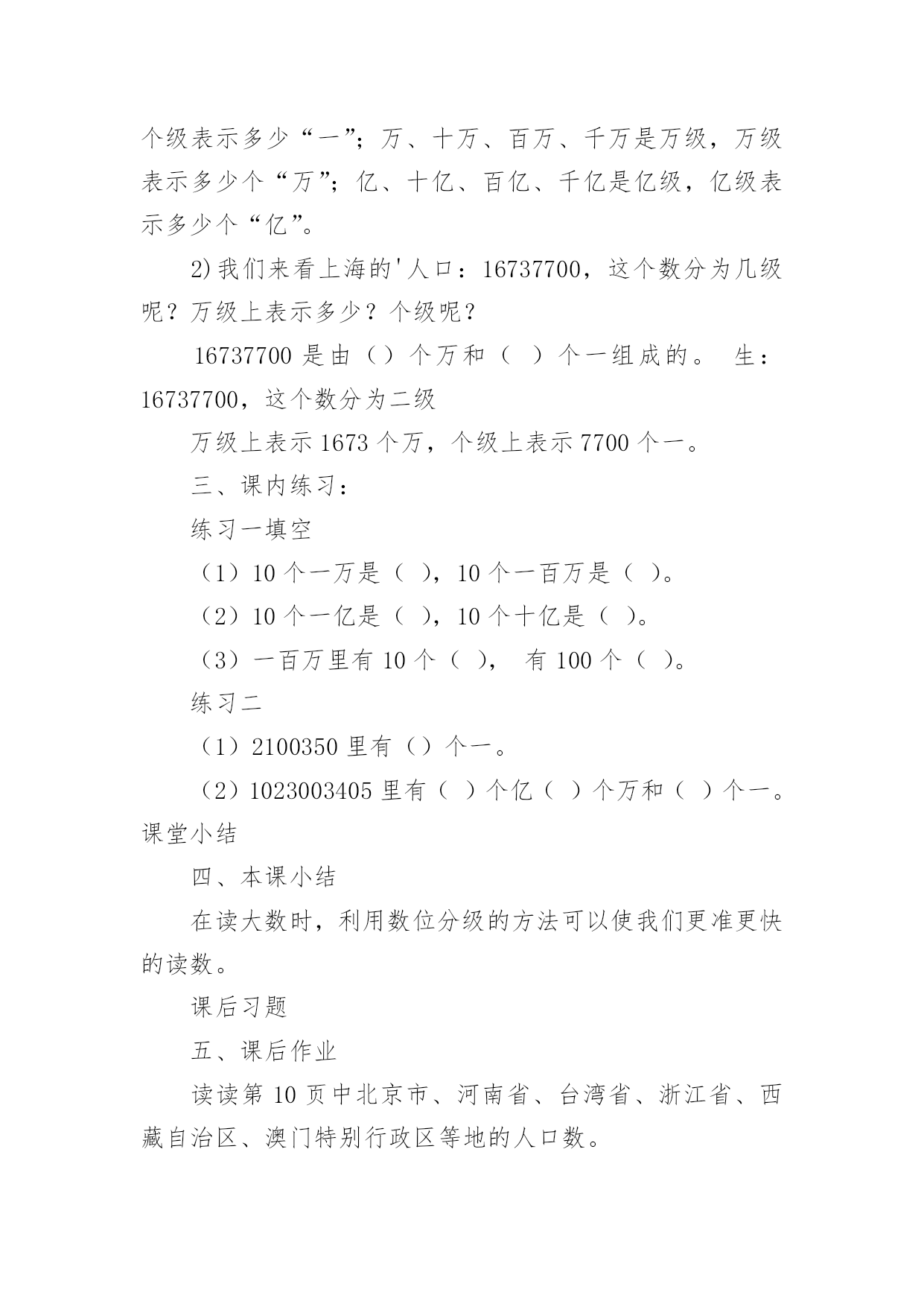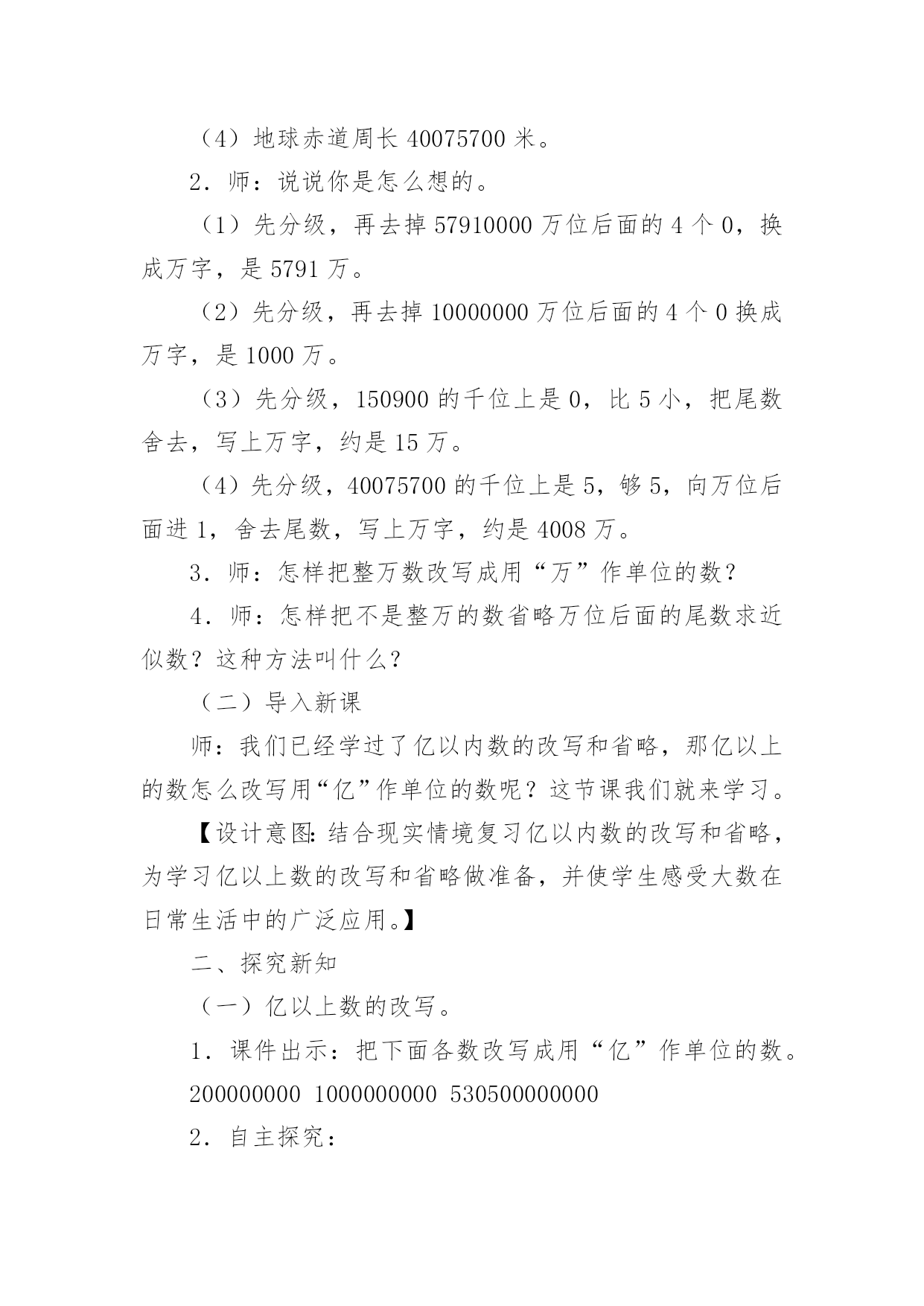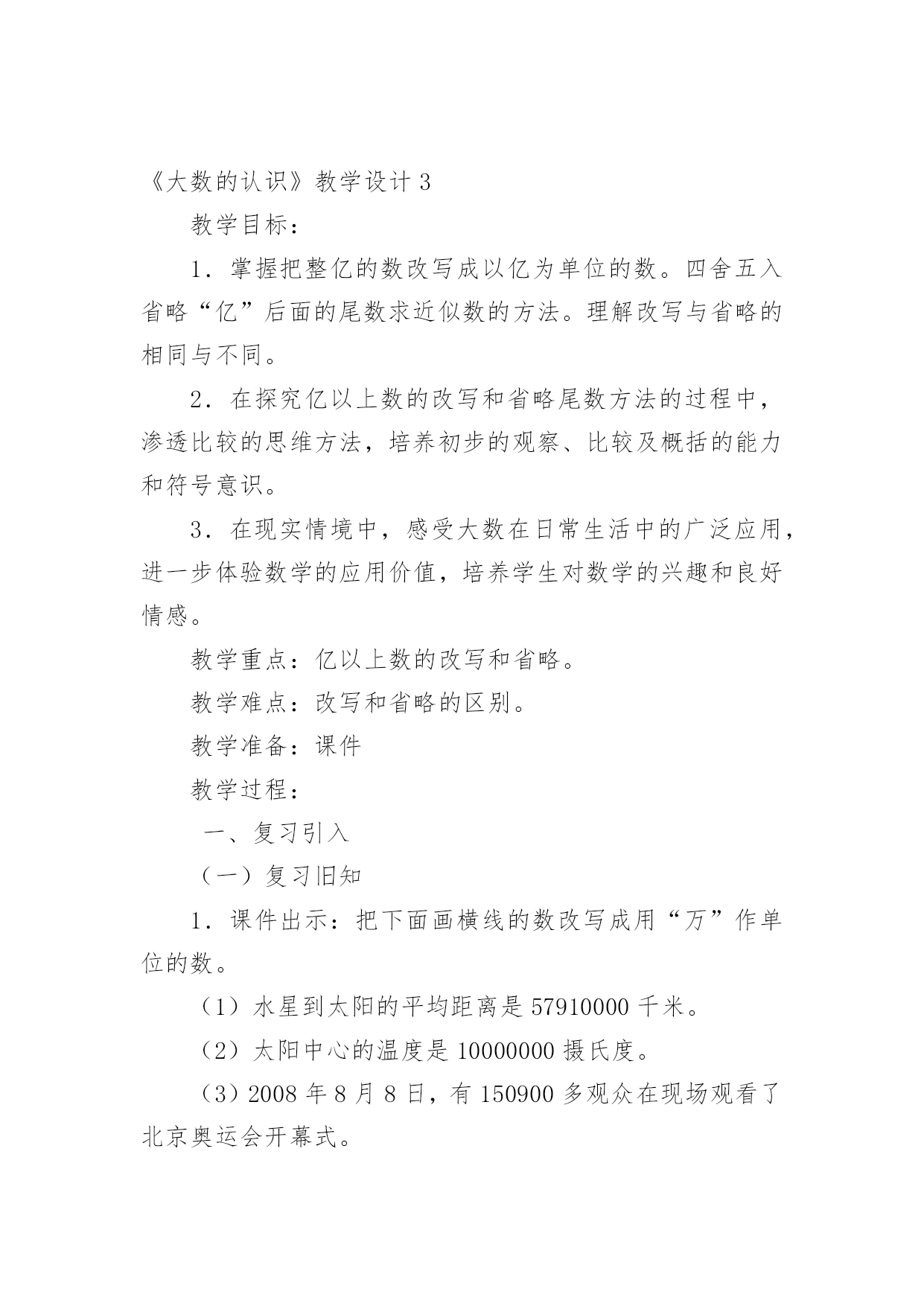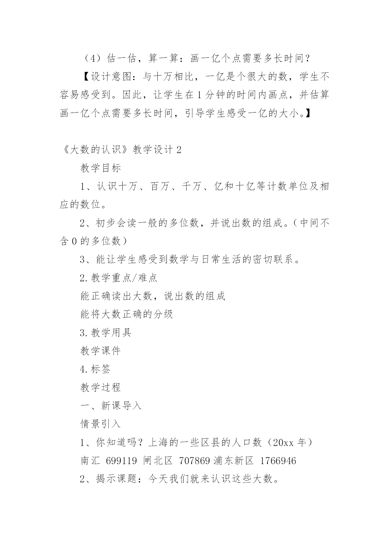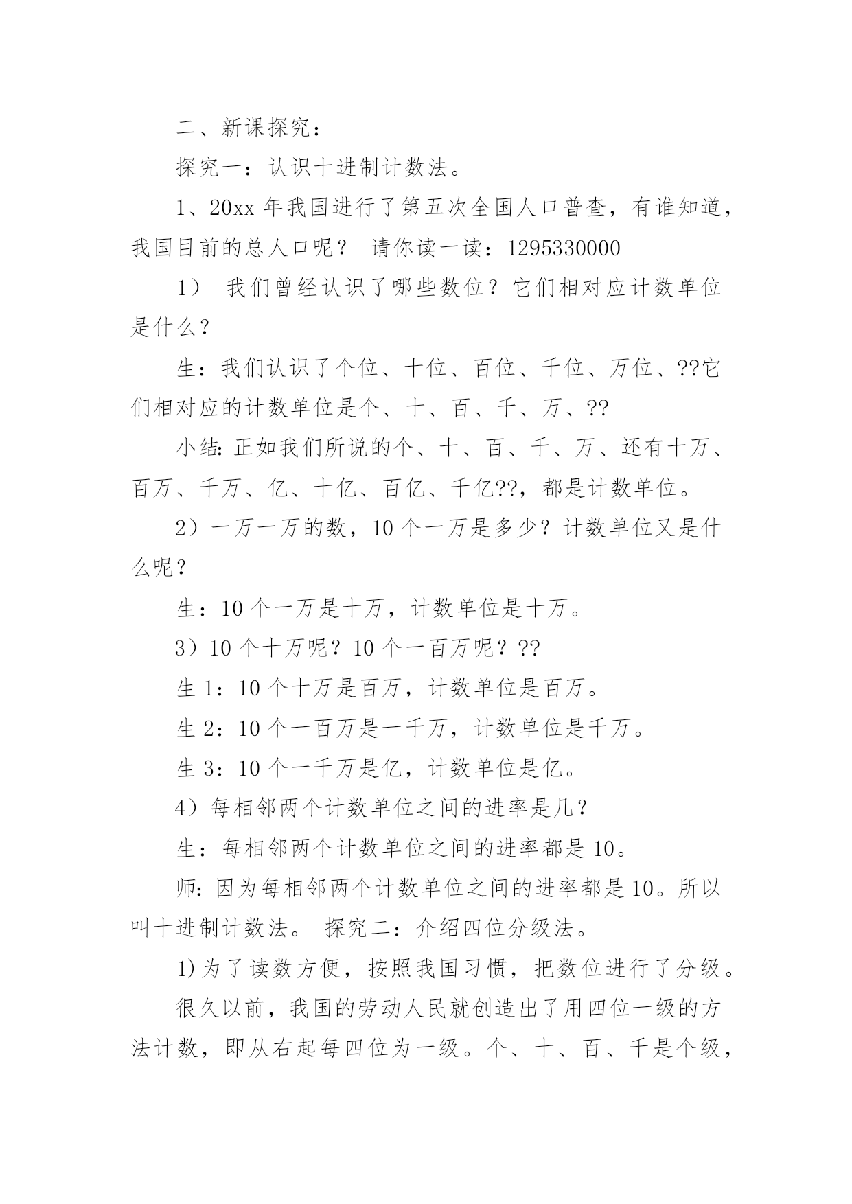 《大数的认识》教学设计作为一名老师,时常需要编写教学设计,教学设计以计划和布局安排的形式,对怎样才能达到教学目标进行创造性的决策,以解决怎样教的问题。那么优秀的教学设计是什么样的呢?以下是小编为大家收集的《大数的认识》教学设计,仅供参考,欢迎大家阅读。《大数的认识》教学设计1教学目标:1.知道生活中有比万大的数;认识新的计数单位“十万”“百万”“千万”“亿”,知道亿以内各个计数单位的名称,类推每相邻两个计数单位之间的关系,知道数级、数位,掌握数位顺序表。2.结合现实情境,利用数位顺序表进一步体会“位值”的含义。3.在结合现实情境认识大数的过程中,体会大数的意义。教学重点:认识计数单位“万、十万、百万、千万、亿”。教学难点:体会“位值”的含义。教学准备:课件、计数器教学过程一、情境创设,揭示课题(一)读一读下面的信息1.课件出示:师:请大家看图,从图中你了解到了哪些信息?学生读信息。2.师:这些是我们以前学过的万以内的数,对万以内的数你都知道什么?学生可以从不同角度说,如:计数单位、数位、读写法、大小比较等。3.课件出示:(1)师:说一说,从图中,你知道了什么?(2)师:把这些数与刚才的数比一比,你发现了什么?(二)点明课题(1)师:生活中哪些地方会用到比万大的数?(2)师:生活中我们经常会用到比万更大的数,今天我们就来认识亿以内的.数。【设计意图:通过第一组信息,唤醒学生的已有知识经验,为学习新知做准备。通过比较两组信息中的数,使学生知道生活中有比万还大的数,而且这样的数在生活中应用非常广泛。体会学习大数的必要,激发学生学习的兴趣和求知欲望。】二、探究新知(一)认识计数单位“十万”“百万”“千万”和“亿”1.认识“十万”(1)师:我们已经认识了计数单位“万”,谁能在计数器上拨出10000?(2)师:如果再拨一颗珠子,是几万?(2万)再拨下去呢……(3)师:9万再加一万是几万?万位满十,怎么办?(万位满10,要向前一位进1)这里的一颗珠子表示多少?(十万)(4)师:根据刚才拨珠的过程想一想,万和十万有什么关系?(10个一万是十万)(5)师:十万有多大?(课件演示:小正方体由一→十→百→千→万→十万的变化过程)【设计意图:教师引导学生在计数器上一万一万地拨数,引导学生思考“万位满十怎么办”,使学生自主认识新的计数单位“十万”,并体会10个一万是十万。通过小正方体的累加过程,帮助学生感受十万的大小,培养数感。】2.认识计数单位“百万”“千万”和“亿”(1)师:十万比万大,10个一万是十万,那还有比十万大的计数单位吗?是什么呢?它们之间有什么关系呢?两人合作研究。(2)学生两人一组研究。(3)汇报,学生可以继续用计数器数,也可以采用其他方式。最终得出:10个十万是一百万10个一百万是一千万10个一千万是一亿3.归纳“十进关系”(1)师:一(个)、十、百、千、万、……、亿都是计数单位。(2)师:读一读(从10个一是十,到10个一千万是一亿)。每相邻两个计数单位之间有什么关系?【设计意图:利用类比迁移规律,在认识了计数单位“十万”后,由学生自主探究,得出新的计数单位“百万”“千万”和“亿”,并把它们纳入到原有的认知结构中,归纳出每相邻两个计数单位间的十进关系。】(二)整理数位顺序表,认识数位、数级,体会“位值”的含义1.认识数位(1)师:我们已经学过了哪些计数单位?万和千万可以换下位置吗?为什么?(2)师:在用数字表示数的时候,这些计数单位要按照一定的顺序排列起来,它们所占的位置叫作数位。(3)说一说每个计数单位所对应的数位是什么。2.认识数级(1)读一读这些数位(有意识的领着学生四个一停顿),你有什么发现?(2)师:我国习惯从右边起,每四个数位分成一级,个位、十位、百位和千位就是个级,那万位、十万位、百万位和千万位呢?(万级)亿位在哪一级?(亿级)3.体会“位值”的含义(1)师:北京有19612368人,在这个数中,有两个6,这两个6分别表示什么?(左边的6表示6个十万,右边的6表示6个十)(2)师:都是6,为什么表示的意义却不同?(3)师:说说其他数位上的数各表示多少。(4)师:这个数含有几个数级?万级上是几?表示什么?个级上是几?表示什么?【设计意图:在整理数位顺序表的过程中,认识数位、数级,并结合现实情境,体会相同的数所在的数位不同,表示的大小就不同,即“位值”的含义。】三、巩固练习1.做一做第1题2.做一做第2题3.完成教材第1、2题【设计意图:做一做第1题,通过数数,帮助学生理解并掌握计数规律,第2题通过让学生自己尝试制作,加深学生对数位排列顺序和数级划分的认识。教材的两道练习,巩固学生对数位、计数单位和数级的认识。】四、感受一亿的大小1.师:我们感受了十万的大小,那一亿到底有多大?2.画点体验:(1)如果给你1分钟的时间