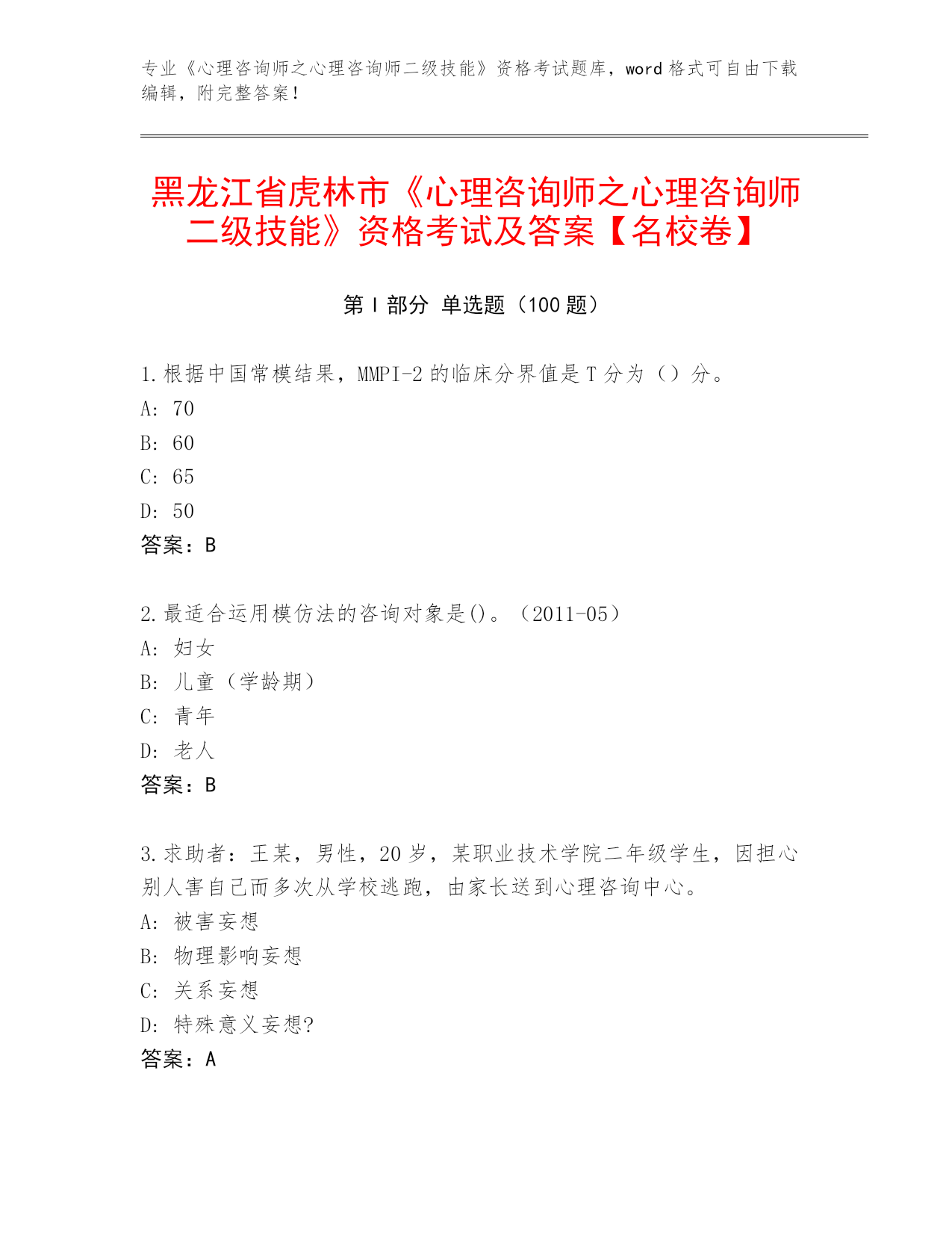 2024黑龙江省虎林市《心理咨询师之心理咨询师二级技能》资格考试必背200题题库附答案
