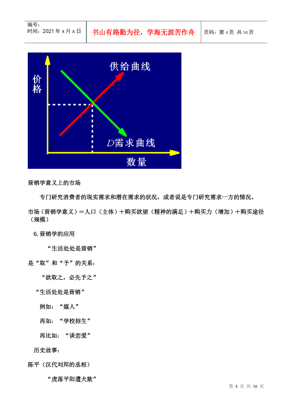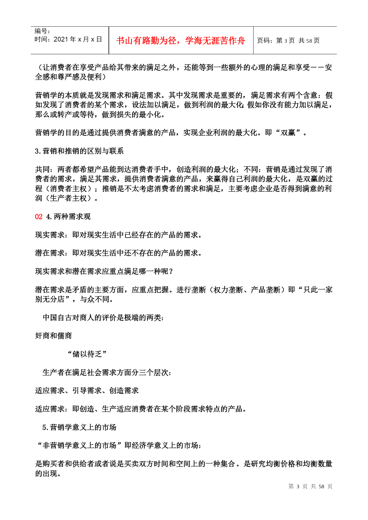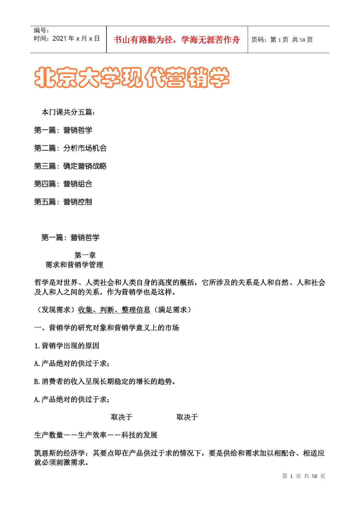 编号:时间:2021年x月x日书山有路勤为径,学海无涯苦作舟页码:第PAGE58页共NUMPAGES58页第PAGE\*MERGEFORMAT58页共NUMPAGES\*MERGEFORMAT58页北京大学现代营销学本门课共分五篇:第一篇:营销哲学第二篇:分析市场机会第三篇:确定营销战略第四篇:营销组合第五篇:营销控制第一篇:营销哲学第一章需求和营销学管理哲学是对世界、人类社会和人类自身的高度的概括,它所涉及的关系是人和自然、人和社会及人和人之间的关系。作为营销学也是这样。(发现需求)收集、判断、整理信息(满足需求)一、营销学的研究对象和营销学意义上的市场1.营销学出现的原因A.产品绝对的供过于求;B.消费者的收入呈现长期稳定的增长的趋势。A.产品绝对的供过于求;取决于取决于生产数量--生产效率--科技的发展凯恩斯的经济学:其要点即在产品供过于求的情况下,要是供给和需求加以相配合、相适应就必须刺激需求。B.消费者的收入呈现长期稳定的增长的趋势。消费者收入增长--具有购买力--生产者才有研究消费者需求的动力--科技的发展“日新月异”--劳动生产率提高--消费者收入增长2.营销学研究的对象、本质及目的营销学这门学科(研究的对象)是站在生产者的立场上,研究如何使自己的产品到达消费者手中的全过程。产品即能够给人带来各种满足和享受的东西。有形产品:看的见、摸的着的物质形态的产品无形产品:看不见、摸不着的物质形态的产品全过程第一个环节:市场调研(发现需求)1.只可意会不可言传;2.言不由衷<节俭、崇俭>;3.生产者自身的原因;第二个环节:开发设计(满足需求)弊端是“协调的费用过高”第三个环节:生产制造(消费者满意的产品)由于企业管理的水平不同、工人的素质不同、认识能力不同,也有可能不能使前两个环节正确的成为现实。第四个环节:制定价格(适当)第五个环节:促销(将产品的信息及时的传递给消费者,让消费者对产品产生认识、兴趣、偏好,最终达到信赖的阶段。)第六个环节:分销(销售渠道)商品销售的高速公路、营销网络是必不可少的,消费者满意的标准是个变量,必须及时调整。最后的环节:售后服务(让消费者在享受产品给其带来的满足之外,还能等到一些额外的心理的满足和享受--安全感和尊严感及便利)营销学的本质就是发现需求和满足需求。其中发现需求是重要的,满足需求有两个含意:假如发现了消费者的某个需求,设法加以满足,做到利润的最大化;假如你没有能力加以满足,那么或转产或等待,做到损失的最小化。营销学的目的是通过提供消费者满意的产品,实现企业利润的最大化。即“双赢”。3.营销和推销的区别与联系共同:两者都希望产品能到达消费者手中,创造利润的最大化;不同:营销是通过发现了消费者的需求,满足其需求,提供消费者满意的产品,来赢得自己利润的最大化,是双赢的过程(消费者主权);推销是不太考虑消费者的需求和满足,主要考虑企业是否得到满意的利润(生产者主权)。024.两种需求观现实需求:即对现实生活中已经存在的产品的需求。潜在需求:即对现实生活中还不存在的产品的需求。现实需求和潜在需求应重点满足哪一种呢?潜在需求是矛盾的主要方面,应重点把握。进行垄断(权力垄断、产品垄断)即“只此一家别无分店”,与众不同。中国自古对商人的评价是极端的两类:奸商和儒商“储以待乏”生产者在满足社会需求方面分三个层次:适应需求、引导需求、创造需求适应需求:即创造、生产适应消费者在某个阶段需求特点的产品。5.营销学意义上的市场“非营销学意义上的市场”即经济学意义上的市场:是购买者和供给者或者说是买卖双方时间和空间上的一种集合。是研究均衡价格和均衡数量的出现。营销学意义上的市场专门研究消费者的现实需求和潜在需求的状况,或者说是专门研究需求一方的情况。市场(营销学意义)=人口(主体)+购买欲望(精神的满足)+购买力(增加)+购买途径(规模)6.营销学的应用“生活处处是营销”是“取”和“予”的关系:“欲取之,必先予之”“生活处处是营销”例如:“媒人”再如:“学校招生”再比如:“谈恋爱”历史故事:陈平(汉代刘邦的丞相)“虎落平阳遭犬欺”“男怕干错行,女怕嫁错郎”潜在需求--车辙据此也可以看出“生活处处是营销”03二、顾客让渡价值其所探讨的是顾客在购买过程中追求的是什么?顾客是怎样计算自己这个追求的?顾客为什么要购物?顾客购买的是这个产品给他带来的满足和享受,或说顾客追求的是效应。效应是满足和享受的程度。计算方法:购买到的产品带来的总的满足和享受-所付出的总的代价=效用(在营销学上就叫“让渡价值”)总价值=产品价值+服务