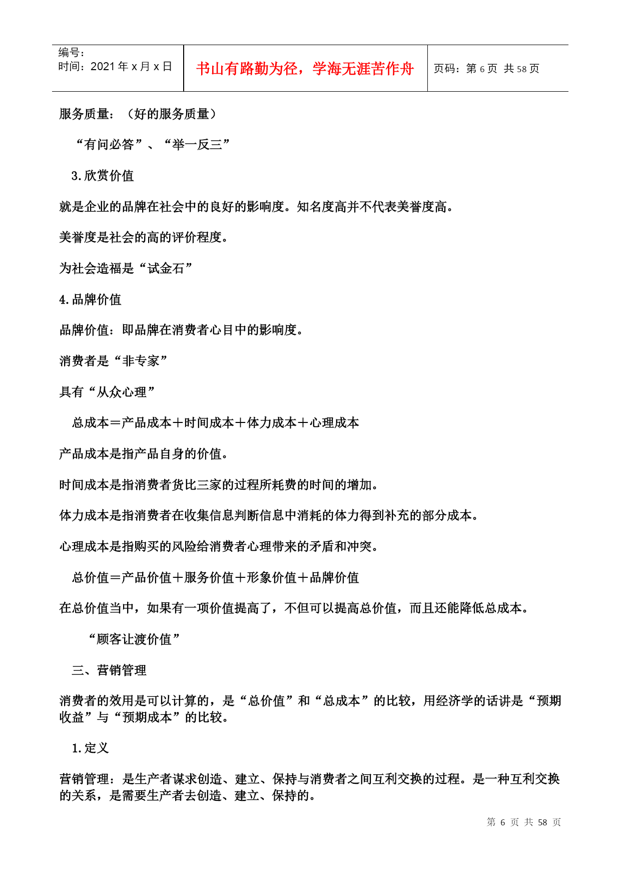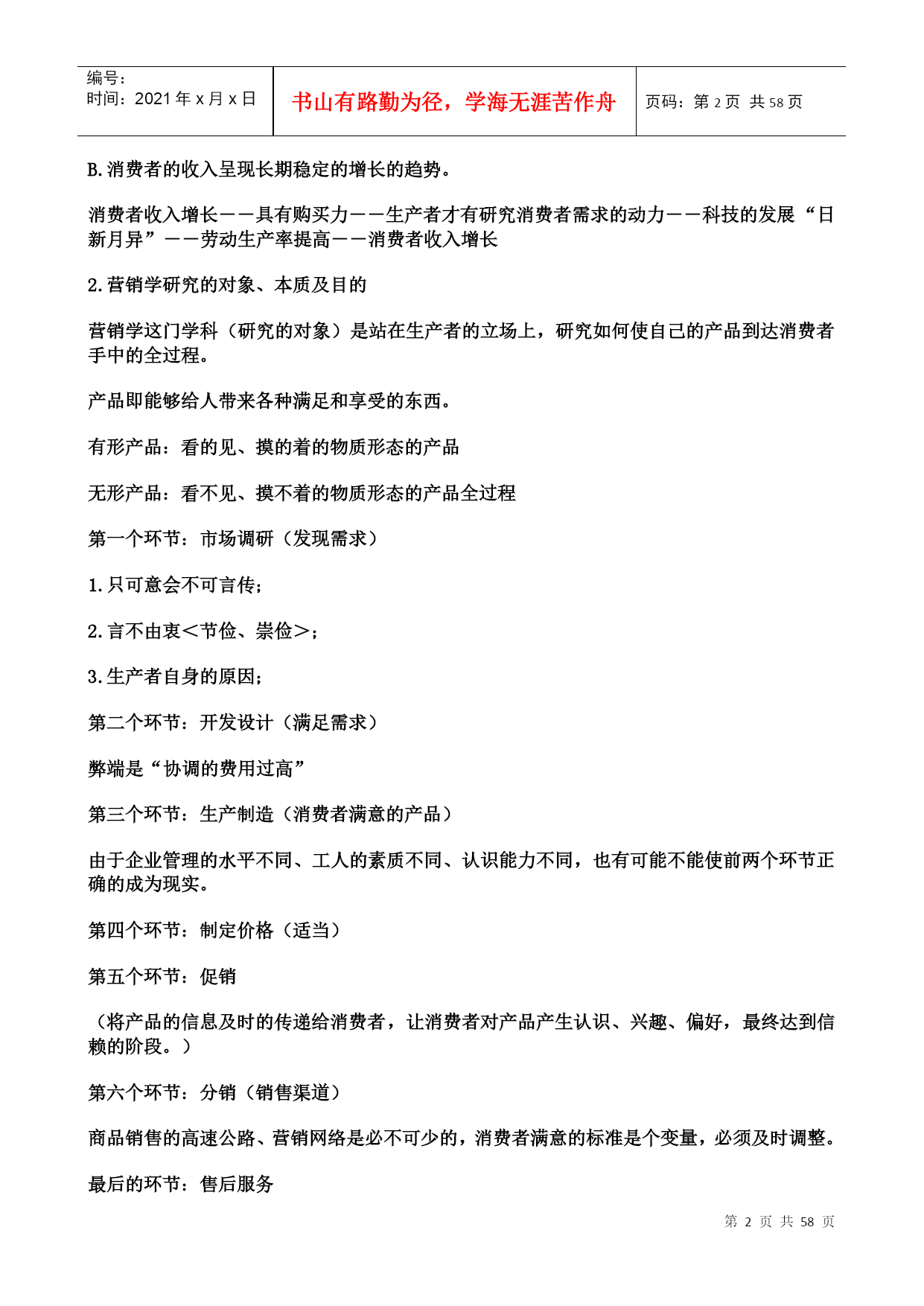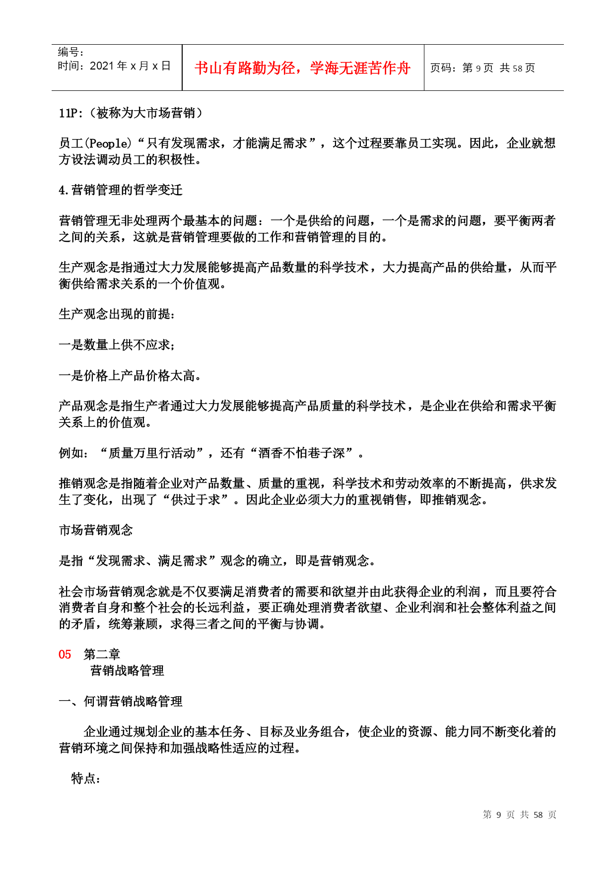 编号:时间:2021年x月x日书山有路勤为径,学海无涯苦作舟页码:第PAGE58页共NUMPAGES58页第PAGE\*MERGEFORMAT58页共NUMPAGES\*MERGEFORMAT58页北京大学现代营销学本门课共分五篇:第一篇:营销哲学第二篇:分析市场机会第三篇:确定营销战略第四篇:营销组合第五篇:营销控制第一篇:营销哲学第一章需求和营销学管理哲学是对世界、人类社会和人类自身的高度的概括,它所涉及的关系是人和自然、人和社会及人和人之间的关系。作为营销学也是这样。(发现需求)收集、判断、整理信息(满足需求)一、营销学的研究对象和营销学意义上的市场1.营销学出现的原因A.产品绝对的供过于求;B.消费者的收入呈现长期稳定的增长的趋势。A.产品绝对的供过于求;取决于取决于生产数量--生产效率--科技的发展凯恩斯的经济学:其要点即在产品供过于求的情况下,要是供给和需求加以相配合、相适应就必须刺激需求。B.消费者的收入呈现长期稳定的增长的趋势。消费者收入增长--具有购买力--生产者才有研究消费者需求的动力--科技的发展“日新月异”--劳动生产率提高--消费者收入增长2.营销学研究的对象、本质及目的营销学这门学科(研究的对象)是站在生产者的立场上,研究如何使自己的产品到达消费者手中的全过程。产品即能够给人带来各种满足和享受的东西。有形产品:看的见、摸的着的物质形态的产品无形产品:看不见、摸不着的物质形态的产品全过程第一个环节:市场调研(发现需求)1.只可意会不可言传;2.言不由衷<节俭、崇俭>;3.生产者自身的原因;第二个环节:开发设计(满足需求)弊端是“协调的费用过高”第三个环节:生产制造(消费者满意的产品)由于企业管理的水平不同、工人的素质不同、认识能力不同,也有可能不能使前两个环节正确的成为现实。第四个环节:制定价格(适当)第五个环节:促销(将产品的信息及时的传递给消费者,让消费者对产品产生认识、兴趣、偏好,最终达到信赖的阶段。)第六个环节:分销(销售渠道)商品销售的高速公路、营销网络是必不可少的,消费者满意的标准是个变量,必须及时调整。最后的环节:售后服务(让消费者在享受产品给其带来的满足之外,还能等到一些额外的心理的满足和享受--安全感和尊严感及便利)营销学的本质就是发现需求和满足需求。其中发现需求是重要的,满足需求有两个含意:假如发现了消费者的某个需求,设法加以满足,做到利润的最大化;假如你没有能力加以满足,那么或转产或等待,做到损失的最小化。营销学的目的是通过提供消费者满意的产品,实现企业利润的最大化。即“双赢”。3.营销和推销的区别与联系共同:两者都希望产品能到达消费者手中,创造利润的最大化;不同:营销是通过发现了消费者的需求,满足其需求,提供消费者满意的产品,来赢得自己利润的最大化,是双赢的过程(消费者主权);推销是不太考虑消费者的需求和满足,主要考虑企业是否得到满意的利润(生产者主权)。024.两种需求观现实需求:即对现实生活中已经存在的产品的需求。潜在需求:即对现实生活中还不存在的产品的需求。现实需求和潜在需求应重点满足哪一种呢?潜在需求是矛盾的主要方面,应重点把握。进行垄断(权力垄断、产品垄断)即“只此一家别无分店”,与众不同。中国自古对商人的评价是极端的两类:奸商和儒商“储以待乏”生产者在满足社会需求方面分三个层次:适应需求、引导需求、创造需求适应需求:即创造、生产适应消费者在某个阶段需求特点的产品。5.营销学意义上的市场“非营销学意义上的市场”即经济学意义上的市场:是购买者和供给者或者说是买卖双方时间和空间上的一种集合。是研究均衡价格和均衡数量的出现。营销学意义上的市场专门研究消费者的现实需求和潜在需求的状况,或者说是专门研究需求一方的情况。市场(营销学意义)=人口(主体)+购买欲望(精神的满足)+购买力(增加)+购买途径(规模)6.营销学的应用“生活处处是营销”是“取”和“予”的关系:“欲取之,必先予之”“生活处处是营销”例如:“媒人”再如:“学校招生”再比如:“谈恋爱”历史故事:陈平(汉代刘邦的丞相)“虎落平阳遭犬欺”“男怕干错行,女怕嫁错郎”潜在需求--车辙据此也可以看出“生活处处是营销”03二、顾客让渡价值其所探讨的是顾客在购买过程中追求的是什么?顾客是怎样计算自己这个追求的?顾客为什么要购物?顾客购买的是这个产品给他带来的满足和享受,或说顾客追求的是效应。效应是满足和享受的程度。计算方法:购买到的产品带来的总的满足和享受-所付出的总的代价=效用(在营销学上就叫“让渡价值”)总价值=产品价值+服务