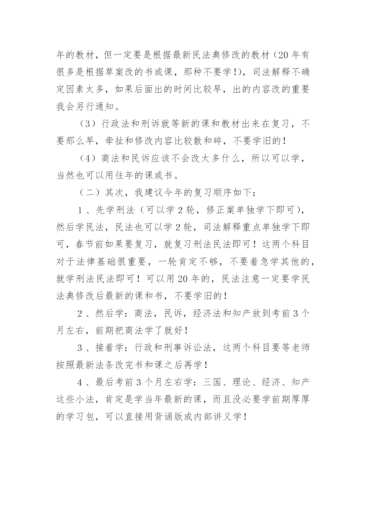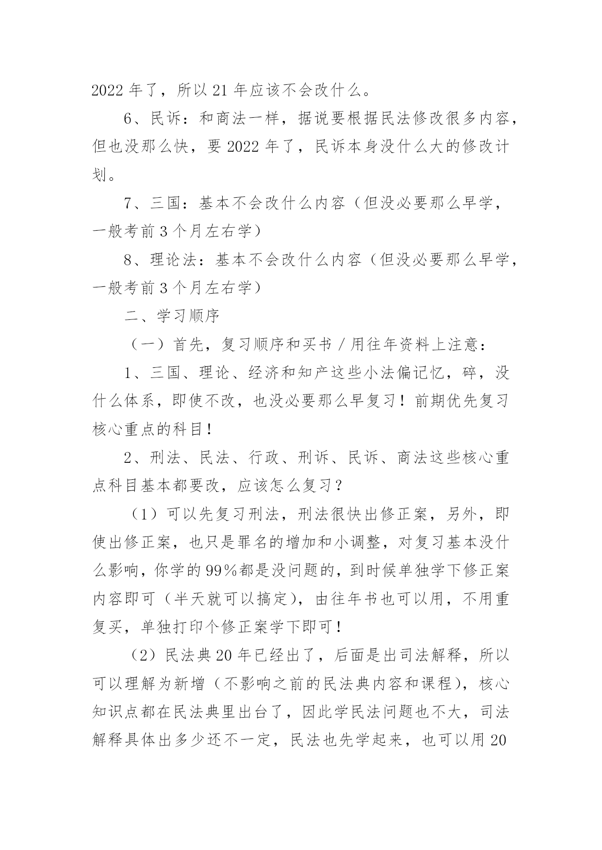 司法考试该怎样准备2021年司法考试该怎样准备国家统一法律职业资格考试(以下简称“法考”)的前身是国家司法考试(简称“司考”)。国家统一法律职业资格考试是中华人民共和国司法部依据《中华人民共和国法官法》、《中华人民共和国检察官法》、《中华人民共和国律师法》、《中华人民共和国公证法》和《国家统一法律职业资格考试实施办法》(2018)的有关规定设立的法律类职业证书考试。以下是小编为大家整理的2021年司法考试该怎样准备相关内容,仅供参考,希望能够帮助大家。一、法考总共考8个科目。1、刑法:要出刑法修正案11,预计在20年12月或21年年初出台!2、民法:要出民法典配套司法解释(据说总的有8000条),我从没看过那么多法条一年出!3、行政法:要修改行政处罚、治安管理处罚、行政复议法!4、刑事诉讼法:修改高法解释!以上是确定要改的!核心的几大学科基本都改了!5、商经知:因为经济法涉及的很多,所以每年都会改一些,知产的著作权和专利部分也有修改;商法会根据民法典和司法解释修改很多内容,但应该不会那么快,可能要2022年了,所以21年应该不会改什么。6、民诉:和商法一样,据说要根据民法修改很多内容,但也没那么快,要2022年了,民诉本身没什么大的修改计划。7、三国:基本不会改什么内容(但没必要那么早学,一般考前3个月左右学)8、理论法:基本不会改什么内容(但没必要那么早学,一般考前3个月左右学)二、学习顺序(一)首先,复习顺序和买书/用往年资料上注意:1、三国、理论、经济和知产这些小法偏记忆,碎,没什么体系,即使不改,也没必要那么早复习!前期优先复习核心重点的科目!2、刑法、民法、行政、刑诉、民诉、商法这些核心重点科目基本都要改,应该怎么复习?(1)可以先复习刑法,刑法很快出修正案,另外,即使出修正案,也只是罪名的增加和小调整,对复习基本没什么影响,你学的99%都是没问题的,到时候单独学下修正案内容即可(半天就可以搞定),由往年书也可以用,不用重复买,单独打印个修正案学下即可!(2)民法典20年已经出了,后面是出司法解释,所以可以理解为新增(不影响之前的民法典内容和课程),核心知识点都在民法典里出台了,因此学民法问题也不大,司法解释具体出多少还不一定,民法也先学起来,也可以用20年的教材,但一定要是根据最新民法典修改的教材(20年有很多是根据草案改的书或课,那种不要学!),司法解释不确定因素太多,如果后面出的时间比较早,出的内容改的重要我会另行通知。(3)行政法和刑诉就等新的课和教材出来在复习,不要那么早,牵扯和修改内容比较散和碎,不要学旧的!(4)商法和民诉应该不会改太多什么,所以可以学,当然也可以用往年的课或书。(二)其次,我建议今年的复习顺序如下:1、先学刑法(可以学2轮,修正案单独学下即可),然后学民法,民法也可以学2轮,司法解释重点单独学下即可,春节前如果要复习,就复习刑法民法即可!这两个科目对于法律基础很重要,一轮肯定不够,不要着急学其他的,就学刑法民法即可!可以用20年的,民法注意一定要学民法典修改后最新的课和书,不要学旧的!2、然后学:商法,民诉,经济法和知产放到考前3个月左右,前期把商法学了就好!3、接着学:行政和刑事诉讼法,这两个科目要等老师按照最新法条改完书和课之后再学!4、最后考前3个月左右学:三国、理论、经济、知产这些小法,肯定是学当年最新的课,而且没必要学前期厚厚的学习包,可以直接用背诵版或内部讲义学!