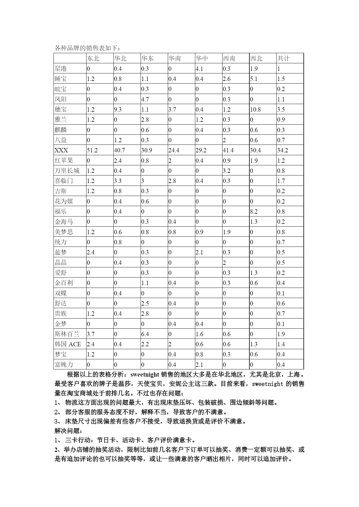 品牌分析报告一、Sweetnight与国内外乳胶床垫牌子的比较:销售区域主要竞争品牌(问卷被访者选择百分比)竞争优势(经销商观点)国内品牌:江苏(南京等)斯林百兰(46%)、喜临门(42%)、麒麟(33%)、花为媒(20%)价格较低、经营方式较灵活河北石家庄穗宝(49%)、喜临门(23%)、吉斯(21%)、君乐美(13%)宣传力度大、价格较低山东济南凤阳(82%)、吉斯(32%)、穗宝(17%)、喜临门(17%)知名度高、宣传力度大、价格较低北京穗宝(47%)、京兰(36%)、强力(35%)、红苹果(27%)产品种类较全、宣传力度大海南海口穗宝(57%)、金盘(39%)、光明、海富、美梦思(16.5%)知名度高、销售网络完善、价格较低、促销力度大河南郑州富魄力(82%)、蓝梦(78%)、喜临门(43%)港梦、花为媒宣传力度大湖南长沙星港(80%)、晚安、梦洁宣传到位、产品知名度高、价位低广西南宁穗宝(65%)、睡宝(65%)、美梦思(21%)、金宁知名度较高重庆万里长城(65%)、八益(61%)、玮兰、佳梦、统力品种齐全、价格低、广告力度大浙江杭州花为媒(66%)、喜临门(65%)、雅兰(34%)、穗宝(26%)地域优势、知名度高、销售网络健全沈阳大连富魄力(82%)、蓝梦(78%)喜临门(43%)、双象、海富价格低、外包装新颖广东佛山Sweetnight中高档产品,价格实在,推广力度较大,销售量高国外品牌美国思涟、舒达、安诺、金可儿、泰普尔高档产品,价位高,定位高,知名度高英国席梦思、卧皇(专做于皇室家族)价格高昂、定位过高,知名度高,德国艾威高端产品。价格高欧洲比利时Go.sleep欧思妮价格高,高端品牌,知名度一般,推广度一般西班牙益卡思知名度低,专做儿童床垫各种品牌的销售表如下:东北华北华东华南华中西南西北共计星港00.40.304.10.31.91睡宝1.20.81.10.40.42.65.11.5皖宝00.40.3000.300.2凤阳004.7000.301.1穗宝1.29.31.13.70.41.210.83.5雅兰1.202.801.20.300.9麒麟000.600.40.30.60.3八益01.20.30020.60.7XXX51.240.730.924.429.241.430.434.2红苹果02.40.820.40.91.91.2万里长城1.20.40003.200.8喜临门1.23.332.80.40.301.7吉斯1.20.80.300000.2花为媒00.40.600000.2福乐00.400008.20.8金海马000.30.4001.30.2美梦思1.20.60.80.80.91.900.8统力00.8000000.7蓝梦2.400.302.10.300.5晶晶00.40.300200.5爱舒000.3000.31.30.2金百利001.10.400.30.60.4双蝶00.4000000.1舒达002.50.40000.6贵族1.20.42.800000.7金梦0000.40.4000.1斯林百兰3.706.401.60.601.9韩国ACE2.40.42.220.60.61.31.4梦宝1.2000.40.80.30.60.4富魄力0000.42.1000.4根据以上的表格分析:sweetnight销售的地区大多是在华北地区,尤其是北京,上海。最受客户喜欢的牌子是温莎,天使宝贝,安妮公主这三款。目前来看,sweetnight的销售量在淘宝商城处于前排几名。不过也存在问题:物流这方面出现的问题最大,有出现床垫压坏、包装破损、围边倾斜等问题。部分客服的服务态度不好,解释不当,导致客户的不满意。床垫尺寸出现偏差有些客户不接受,导致退换货或是评价不满意。解决问题:三卡行动:节日卡、活动卡、客户评价满意卡。2、举办店铺的抽奖活动,限制比如前几名客户下订单可以抽奖、消费一定额可以抽奖、或是有追加评论的也可以抽奖等等,或让一些满意的客户晒出相片,同时可以追加评价。