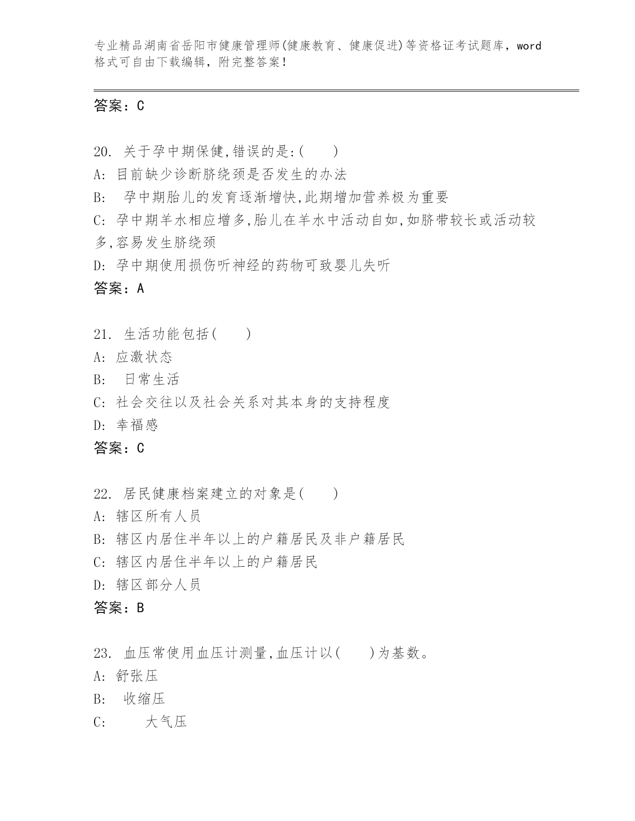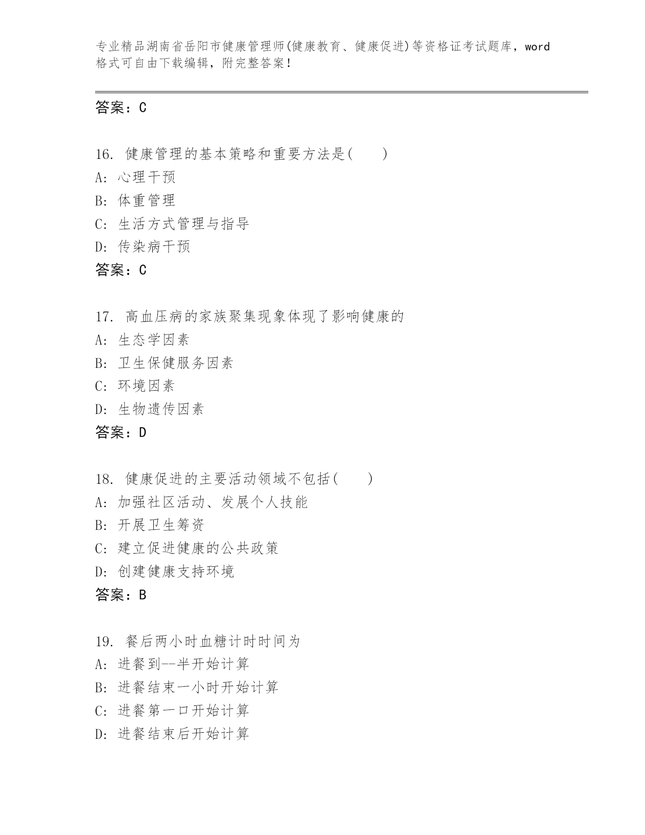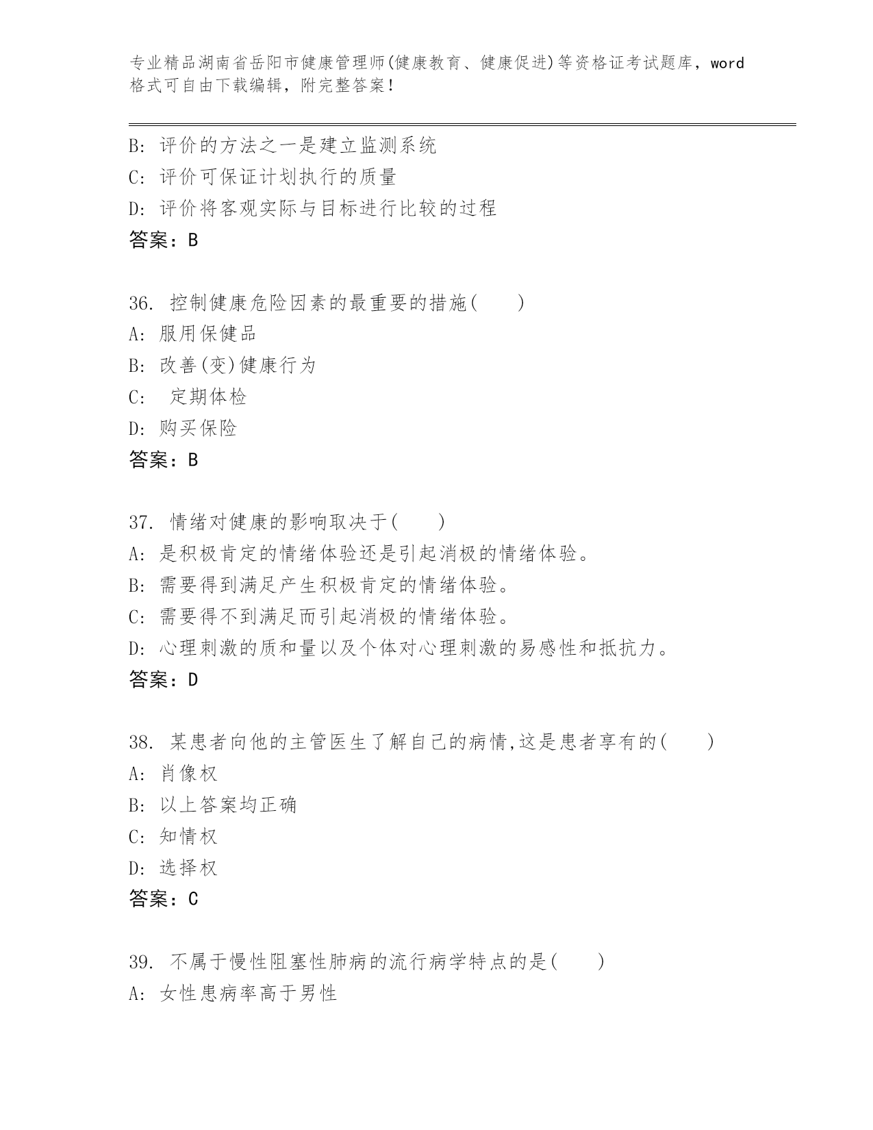 湖南省岳阳市健康管理师(健康教育、健康促进)等资格证考试精品(完整版).docx