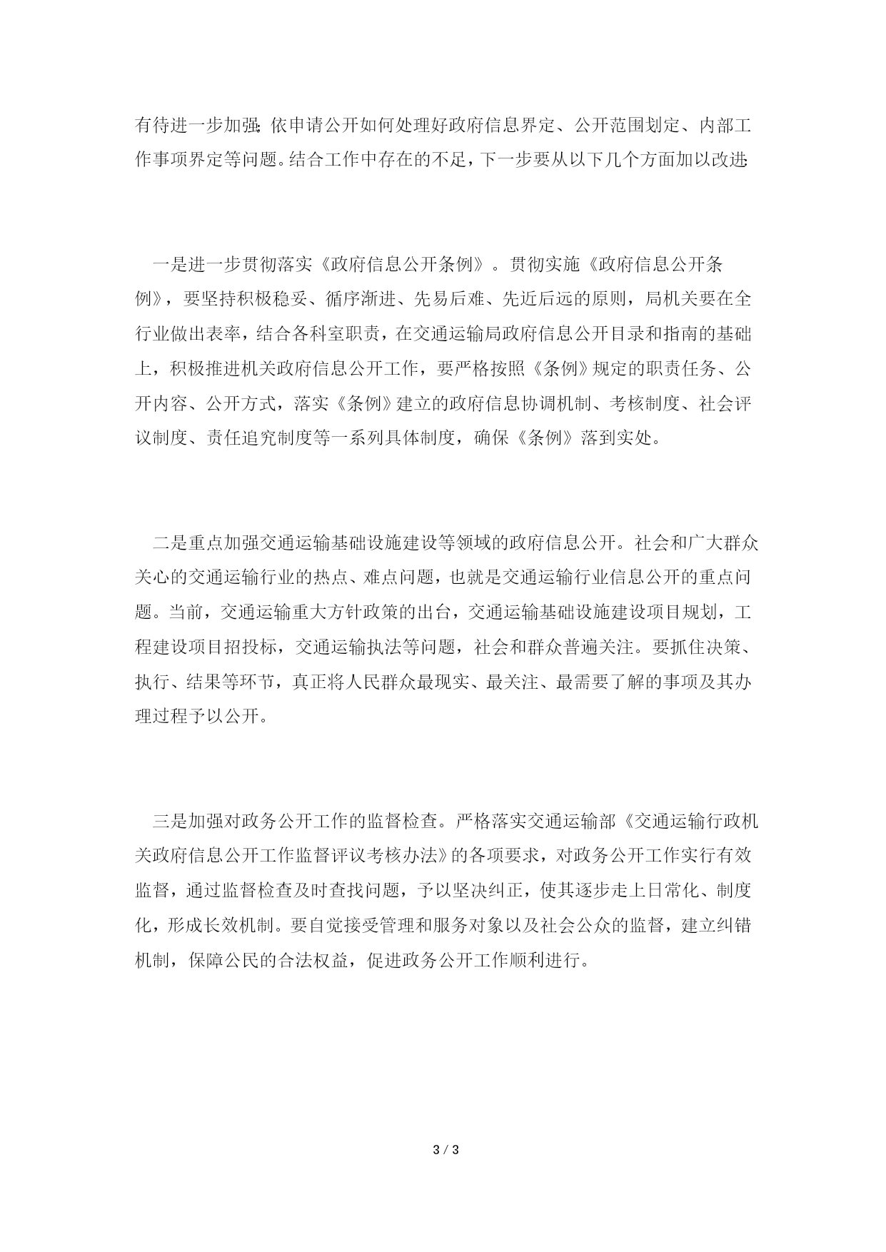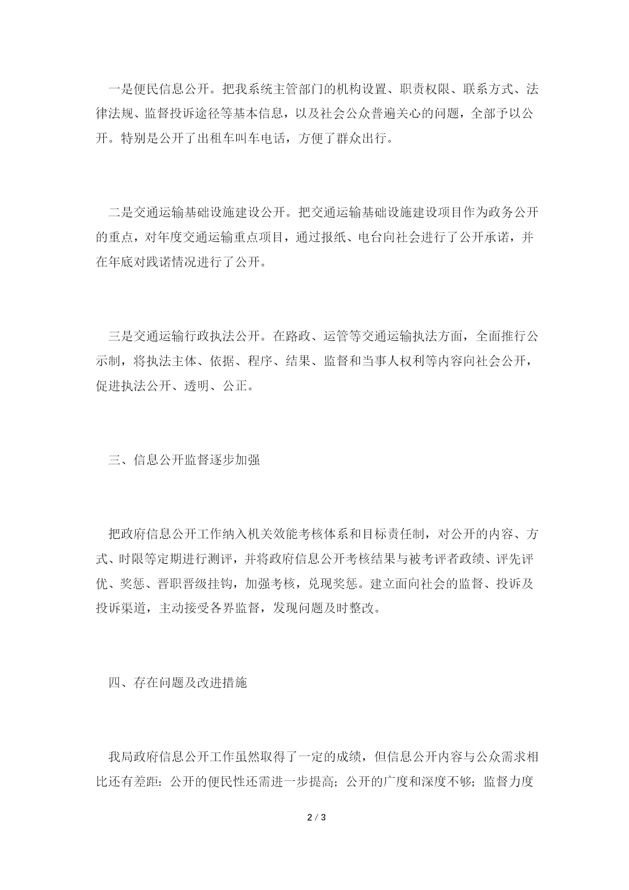 PAGE3/NUMPAGES3交通局信息公开年终报告年,我局认真贯彻实施《政府信息公开条例》和落实国务院《全面推进依法行政实施纲要》,结合交通运输工作实际,针对行业特点和优势,从点到面,积极推进政府信息公开工作,并在机制和制度建设、公开的内容和形式、公开的监督管理等方面,逐步深化和加强,在以往工作的基础上,又取得了一定的进步。主要开展了以下几方面的工作:一、加强领导,加快推进政府信息公开工作我局高度重视政府信息公开工作,局党组和局领导经常听取政府信息公开工作情况汇报,研究部署推进政府信息公开工作,重视信息公开的理论和实践问题,并进行深入系统研究,不断改进工作方式,转变工作思路,创新工作方法,推进了我局政府信息公开工作的开展。各局属单位也把政府信息公开列入重要议事日程,加强组织领导,健全人员机构,为信息公开工作顺利开展创造了有利条件,促进了政府信息公开工作的制度化、规范化建设。二、信息公开内容逐步深化。我局坚持把关系国计民生和社会公众关注的问题作为政务信息公开工作的重点,并逐步向交通运输管理和服务的各个领域延伸。一是便民信息公开。把我系统主管部门的机构设置、职责权限、联系方式、法律法规、监督投诉途径等基本信息,以及社会公众普遍关心的问题,全部予以公开。特别是公开了出租车叫车电话,方便了群众出行。二是交通运输基础设施建设公开。把交通运输基础设施建设项目作为政务公开的重点,对年度交通运输重点项目,通过报纸、电台向社会进行了公开承诺,并在年底对践诺情况进行了公开。三是交通运输行政执法公开。在路政、运管等交通运输执法方面,全面推行公示制,将执法主体、依据、程序、结果、监督和当事人权利等内容向社会公开,促进执法公开、透明、公正。三、信息公开监督逐步加强把政府信息公开工作纳入机关效能考核体系和目标责任制,对公开的内容、方式、时限等定期进行测评,并将政府信息公开考核结果与被考评者政绩、评先评优、奖惩、晋职晋级挂钩,加强考核,兑现奖惩。建立面向社会的监督、投诉及投诉渠道,主动接受各界监督,发现问题及时整改。四、存在问题及改进措施我局政府信息公开工作虽然取得了一定的成绩,但信息公开内容与公众需求相比还有差距:公开的便民性还需进一步提高;公开的广度和深度不够;监督力度有待进一步加强;依申请公开如何处理好政府信息界定、公开范围划定、内部工作事项界定等问题。结合工作中存在的不足,下一步要从以下几个方面加以改进:一是进一步贯彻落实《政府信息公开条例》。贯彻实施《政府信息公开条例》,要坚持积极稳妥、循序渐进、先易后难、先近后远的原则,局机关要在全行业做出表率,结合各科室职责,在交通运输局政府信息公开目录和指南的基础上,积极推进机关政府信息公开工作,要严格按照《条例》规定的职责任务、公开内容、公开方式,落实《条例》建立的政府信息协调机制、考核制度、社会评议制度、责任追究制度等一系列具体制度,确保《条例》落到实处。二是重点加强交通运输基础设施建设等领域的政府信息公开。社会和广大群众关心的交通运输行业的热点、难点问题,也就是交通运输行业信息公开的重点问题。当前,交通运输重大方针政策的出台,交通运输基础设施建设项目规划,工程建设项目招投标,交通运输执法等问题,社会和群众普遍关注。要抓住决策、执行、结果等环节,真正将人民群众最现实、最关注、最需要了解的事项及其办理过程予以公开。三是加强对政务公开工作的监督检查。严格落实交通运输部《交通运输行政机关政府信息公开工作监督评议考核办法》的各项要求,对政务公开工作实行有效监督,通过监督检查及时查找问题,予以坚决纠正,使其逐步走上日常化、制度化,形成长效机制。要自觉接受管理和服务对象以及社会公众的监督,建立纠错机制,保障公民的合法权益,促进政务公开工作顺利进行。