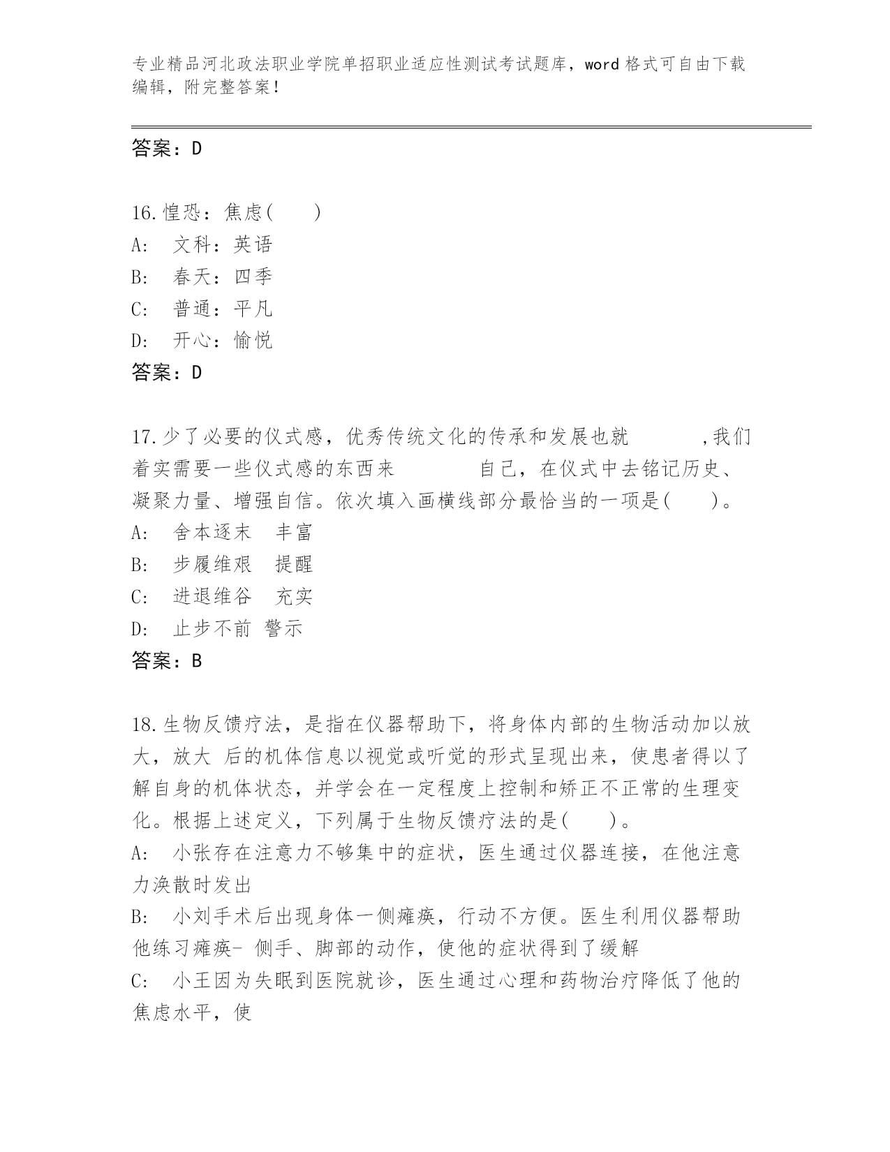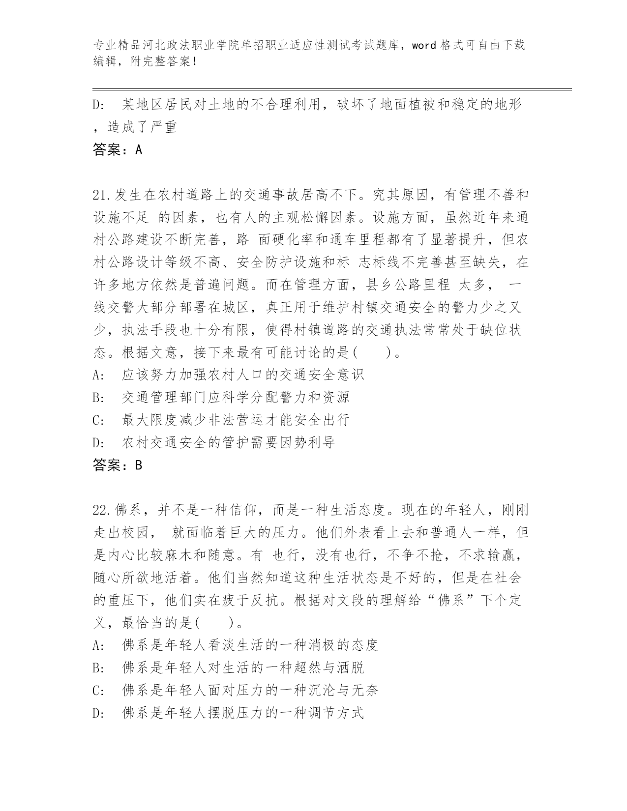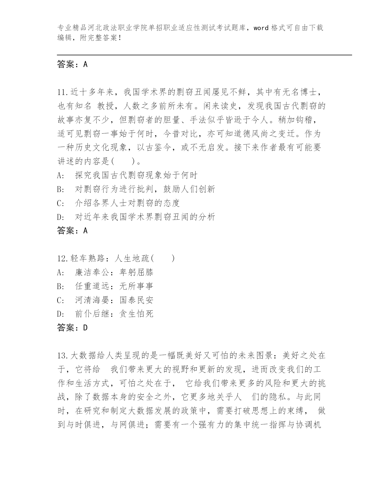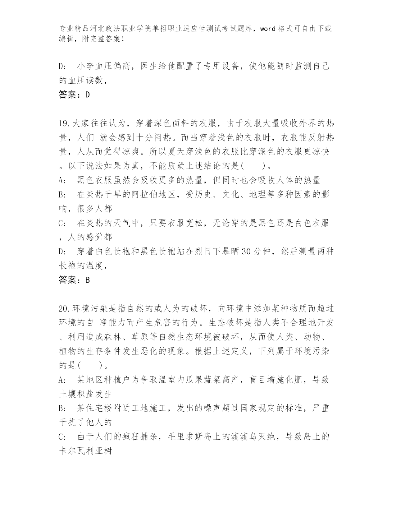 精心整理河北政法职业学院单招职业适应性测试考试完整题库及答案【精选题】.docx