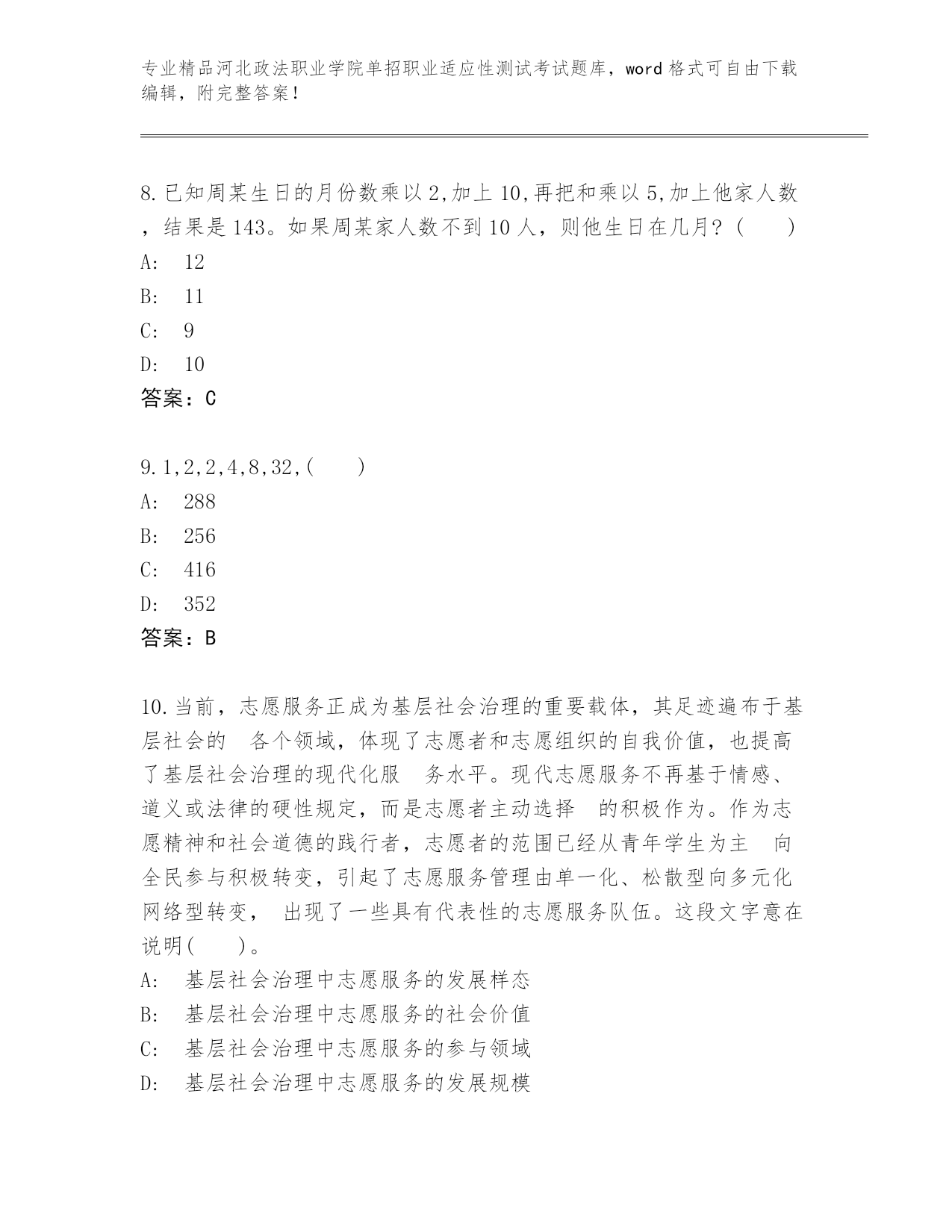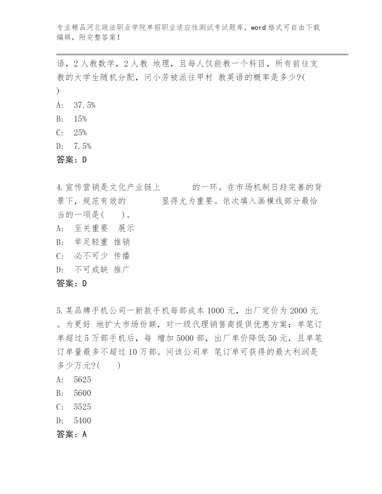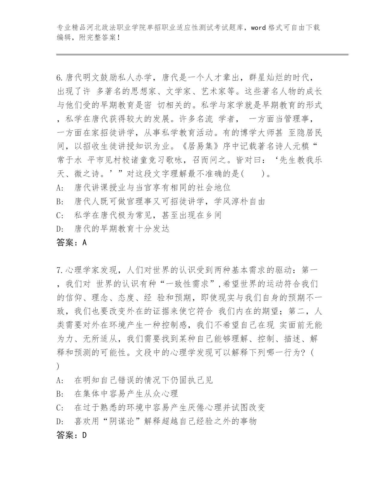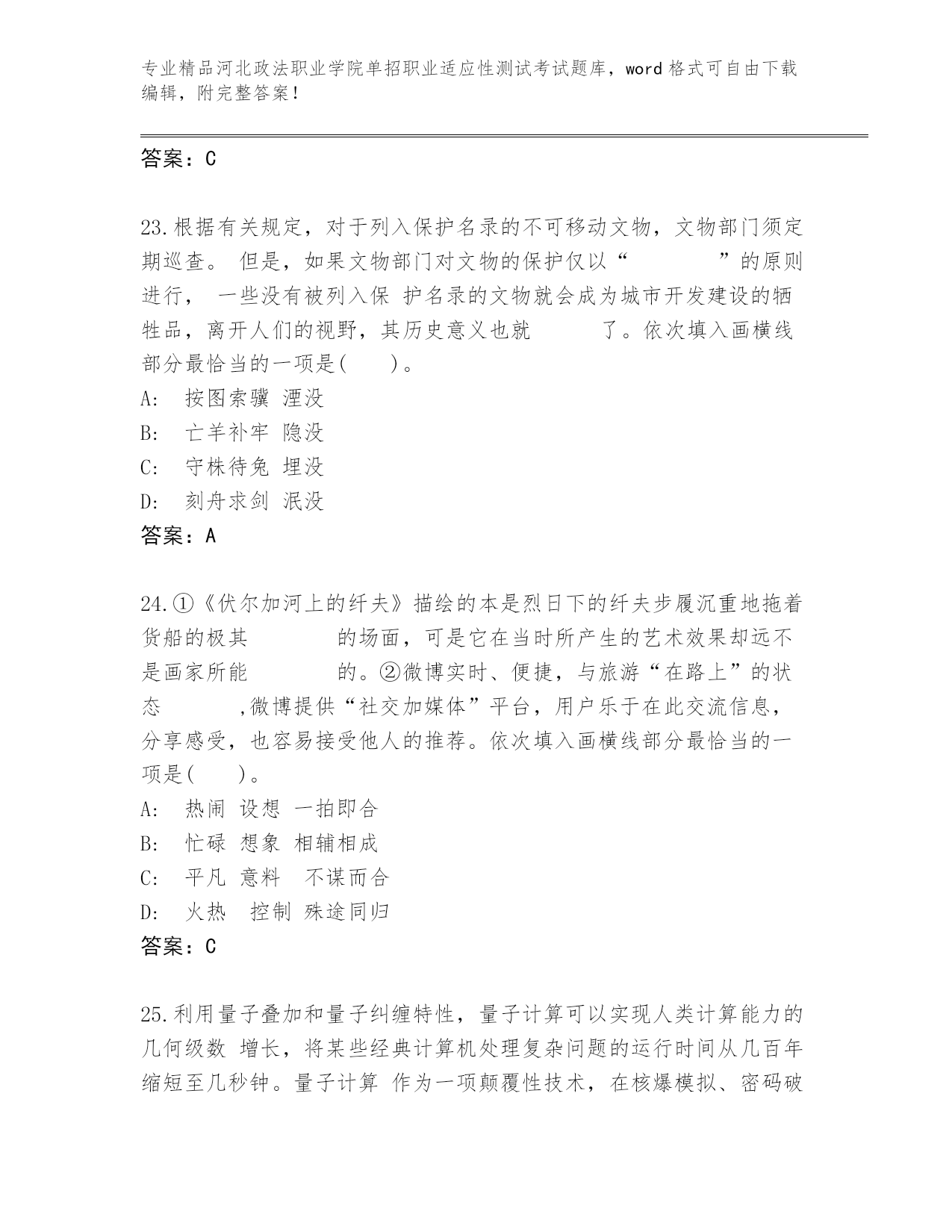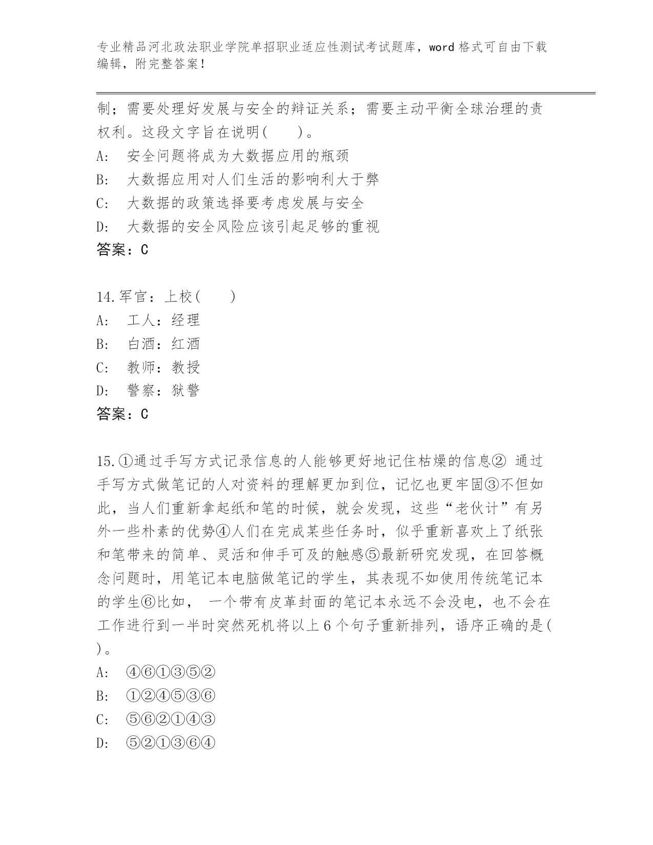 精心整理河北政法职业学院单招职业适应性测试考试完整题库及答案【精选题】.docx