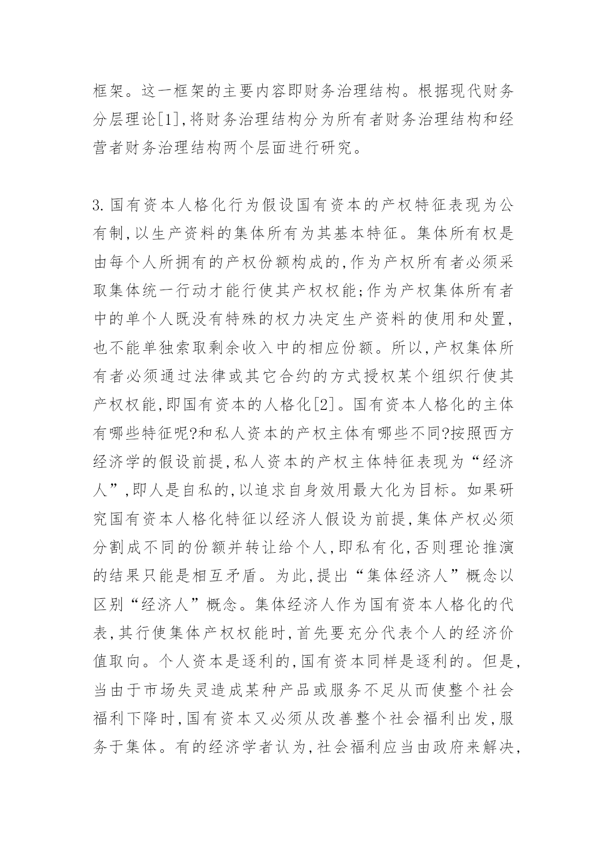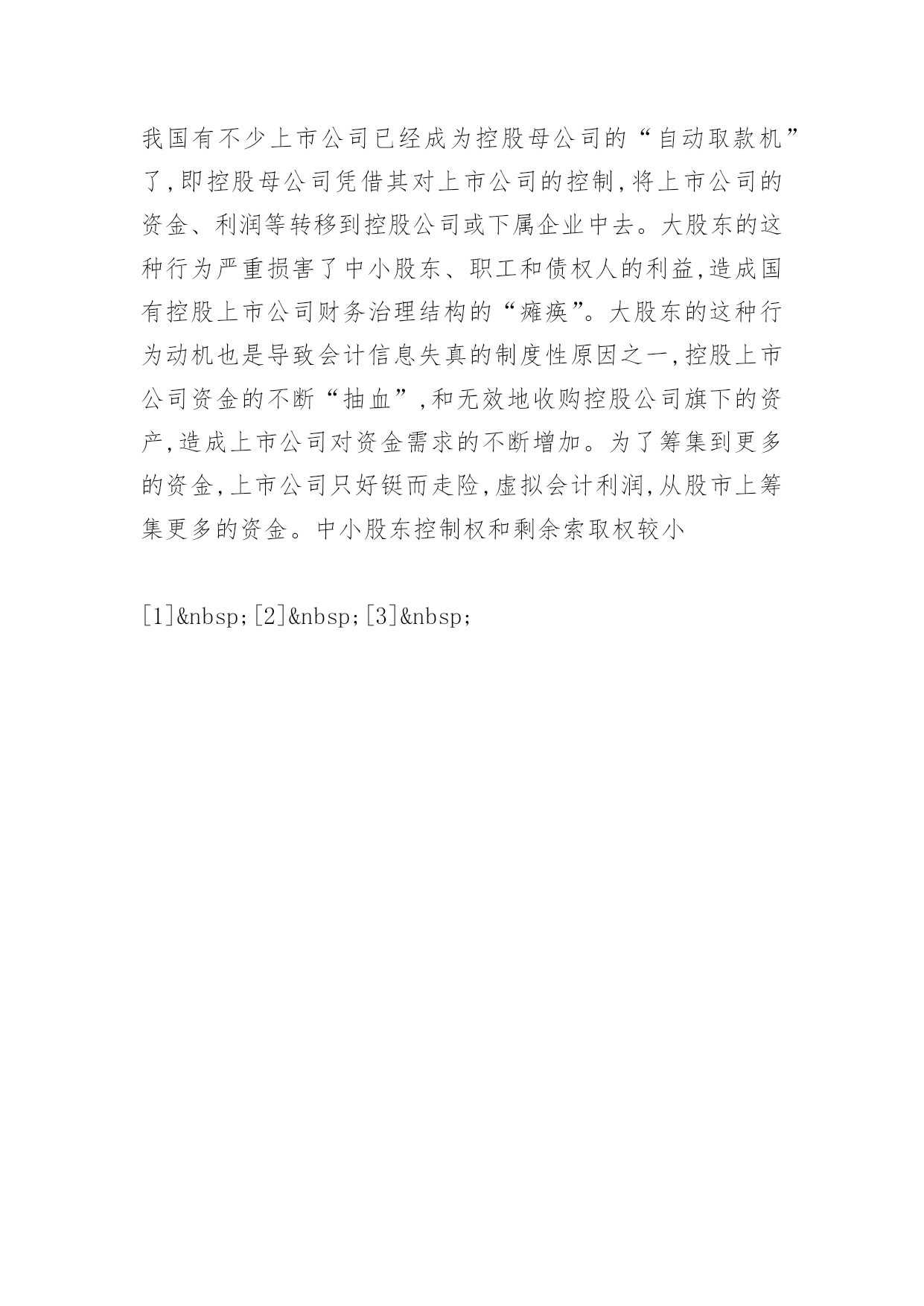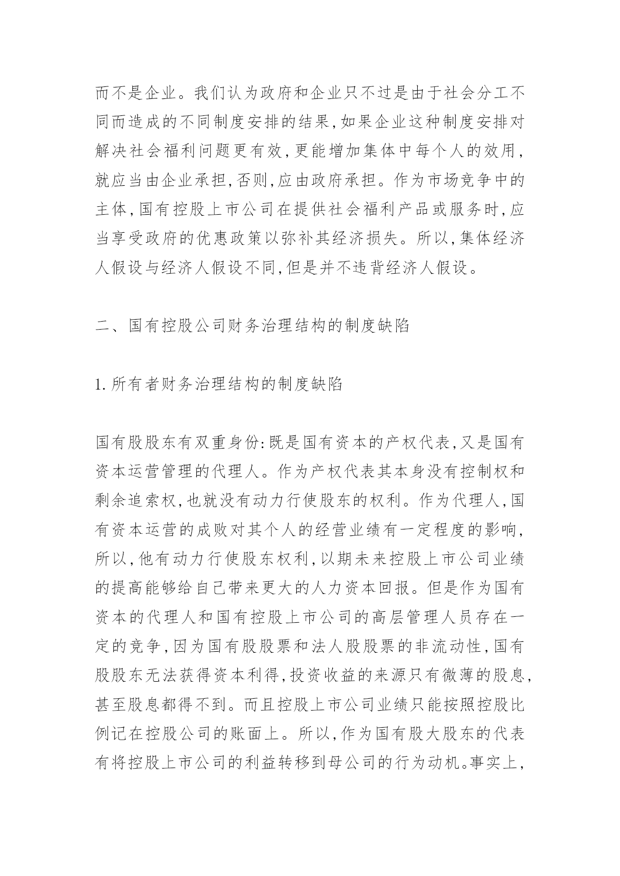 国有控股公司财务治理结构制度缺陷与完善国有控股公司财务治理结构制度缺陷与完善一、研究的基本前提1.国有控股公司研究主体的界定国有控股公司是国有经济战略调整后,国有资本优化配置的结果,是指国有资本处于绝对控股或控股地位的公司。国有控股公司提供的产品主要是为了弥补市场调节失灵而产生的供给不足。从英国和俄罗斯铁路运营公司改革的成败经验来看,国有控股公司是重要的企业财产组织形式。2.财务治理结构概念的界定与财务治理结构相近的词有公司治理、公司治理结构、法人治理结构、公司治理机制和公司机关制度等等。之所以有不同的称谓,是因为研究人员研究问题的角度不同和对CorporateGovernance翻译的不同。从现代企业制度来看,股份有限公司是在所有权与经营权相分离,法人财产权与终极财产权相分离的基础之上形成的;所有者将财务资源委托给具有专长的经营者经营管理,是一种财权的委托和受托关系,其本质是一种财务活动。但是,如何确保经营者按照所有者的利益目标去做,如何将财产的控制权与剩余索取权在所有者与经营者之间进行科学分配,就产生了基于财权分配的企业制度安排框架。这一框架的主要内容即财务治理结构。根据现代财务分层理论[1],将财务治理结构分为所有者财务治理结构和经营者财务治理结构两个层面进行研究。3.国有资本人格化行为假设国有资本的产权特征表现为公有制,以生产资料的集体所有为其基本特征。集体所有权是由每个人所拥有的产权份额构成的,作为产权所有者必须采取集体统一行动才能行使其产权权能;作为产权集体所有者中的单个人既没有特殊的权力决定生产资料的使用和处置,也不能单独索取剩余收入中的相应份额。所以,产权集体所有者必须通过法律或其它合约的方式授权某个组织行使其产权权能,即国有资本的人格化[2]。国有资本人格化的主体有哪些特征呢?和私人资本的产权主体有哪些不同?按照西方经济学的假设前提,私人资本的产权主体特征表现为“经济人”,即人是自私的,以追求自身效用最大化为目标。如果研究国有资本人格化特征以经济人假设为前提,集体产权必须分割成不同的份额并转让给个人,即私有化,否则理论推演的结果只能是相互矛盾。为此,提出“集体经济人”概念以区别“经济人”概念。集体经济人作为国有资本人格化的代表,其行使集体产权权能时,首先要充分代表个人的经济价值取向。个人资本是逐利的,国有资本同样是逐利的。但是,当由于市场失灵造成某种产品或服务不足从而使整个社会福利下降时,国有资本又必须从改善整个社会福利出发,服务于集体。有的经济学者认为,社会福利应当由政府来解决,而不是企业。我们认为政府和企业只不过是由于社会分工不同而造成的不同制度安排的结果,如果企业这种制度安排对解决社会福利问题更有效,更能增加集体中每个人的效用,就应当由企业承担,否则,应由政府承担。作为市场竞争中的主体,国有控股上市公司在提供社会福利产品或服务时,应当享受政府的优惠政策以弥补其经济损失。所以,集体经济人假设与经济人假设不同,但是并不违背经济人假设。二、国有控股公司财务治理结构的制度缺陷1.所有者财务治理结构的制度缺陷国有股股东有双重身份:既是国有资本的产权代表,又是国有资本运营管理的代理人。作为产权代表其本身没有控制权和剩余追索权,也就没有动力行使股东的权利。作为代理人,国有资本运营的成败对其个人的经营业绩有一定程度的影响,所以,他有动力行使股东权利,以期未来控股上市公司业绩的提高能够给自己带来更大的人力资本回报。但是作为国有资本的代理人和国有控股上市公司的高层管理人员存在一定的竞争,因为国有股股票和法人股股票的非流动性,国有股股东无法获得资本利得,投资收益的来源只有微薄的股息,甚至股息都得不到。而且控股上市公司业绩只能按照控股比例记在控股公司的账面上。所以,作为国有股大股东的代表有将控股上市公司的利益转移到母公司的行为动机。事实上,我国有不少上市公司已经成为控股母公司的“自动取款机”了,即控股母公司凭借其对上市公司的控制,将上市公司的资金、利润等转移到控股公司或下属企业中去。大股东的这种行为严重损害了中小股东、职工和债权人的利益,造成国有控股上市公司财务治理结构的“瘫痪”。大股东的这种行为动机也是导致会计信息失真的制度性原因之一,控股上市公司资金的不断“抽血”,和无效地收购控股公司旗下的资产,造成上市公司对资金需求的不断增加。为了筹集到更多的资金,上市公司只好铤而走险,虚拟会计利润,从股市上筹集更多的资金。中小股东控制权和剩余索取权较小[1] [2] [3]