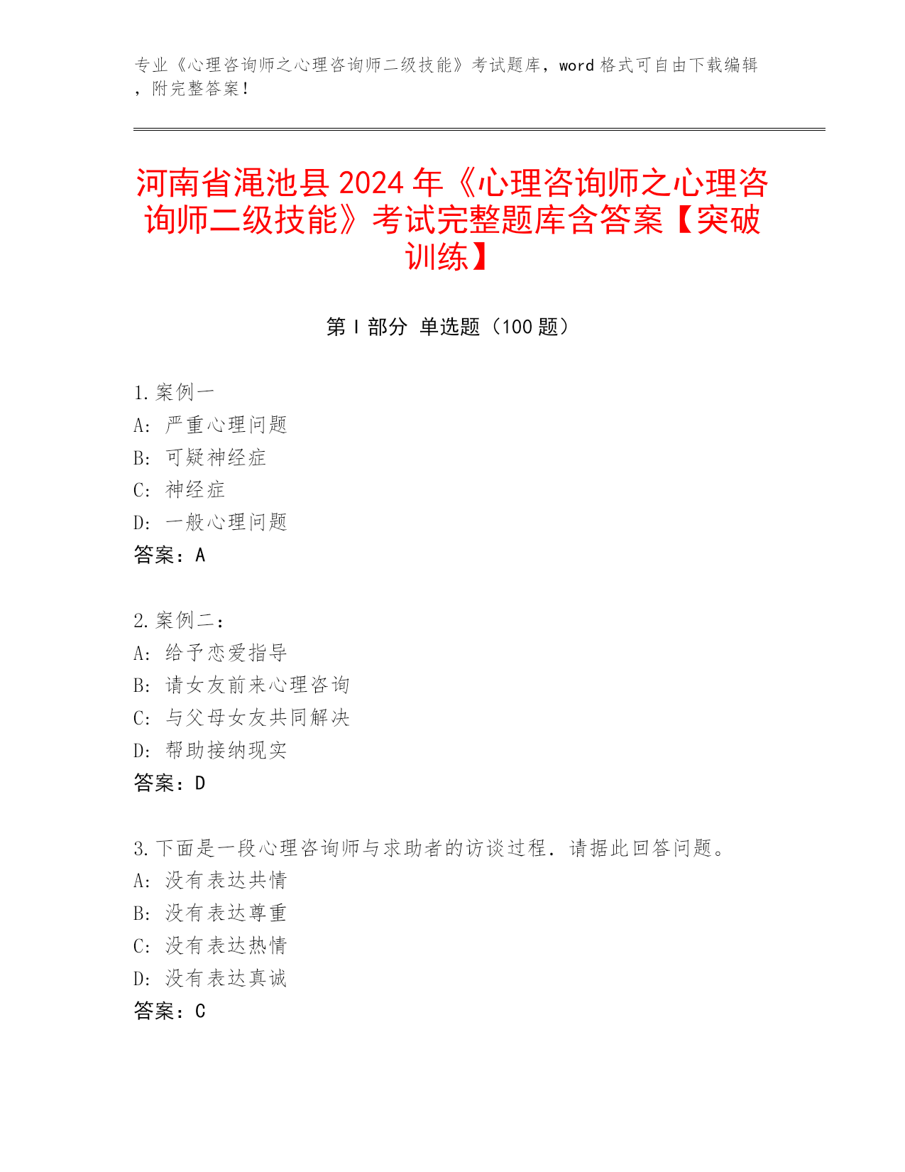 河南省渑池县2024年《心理咨询师之心理咨询师二级技能》考试完整题库含答案【突破训练】