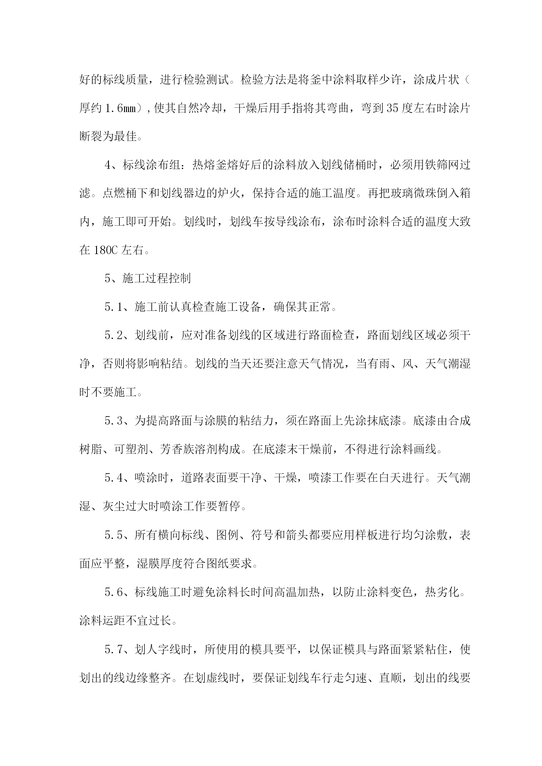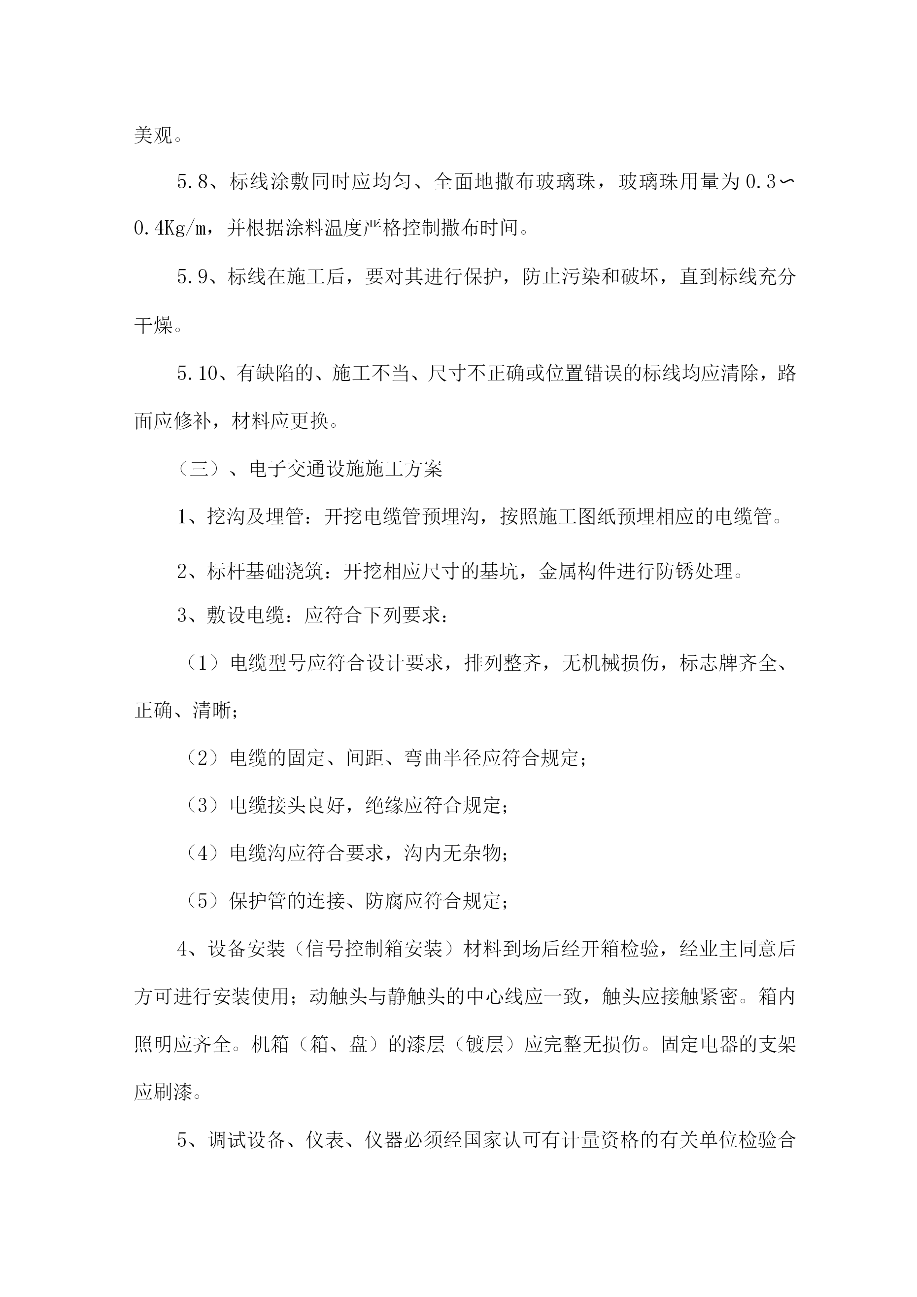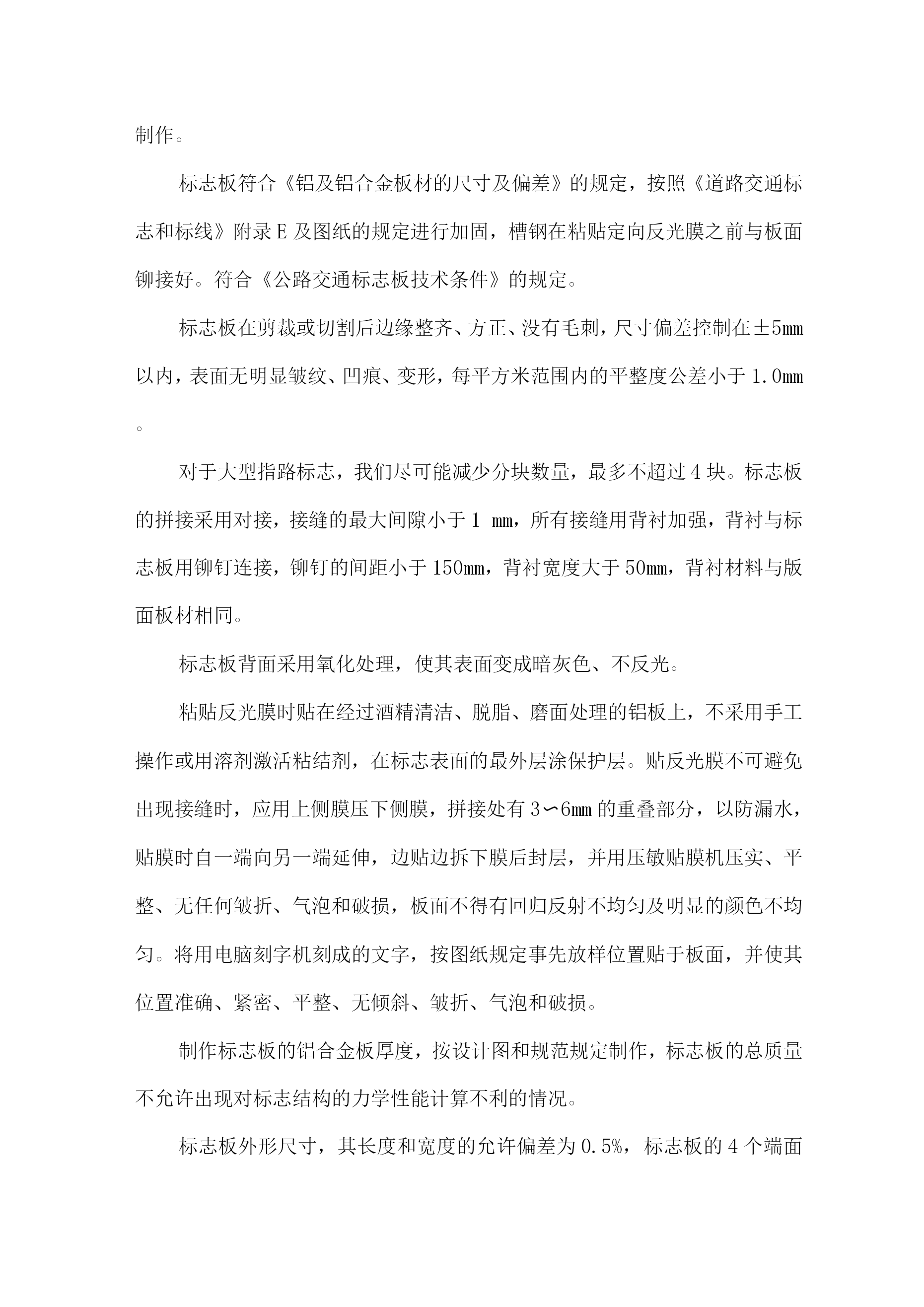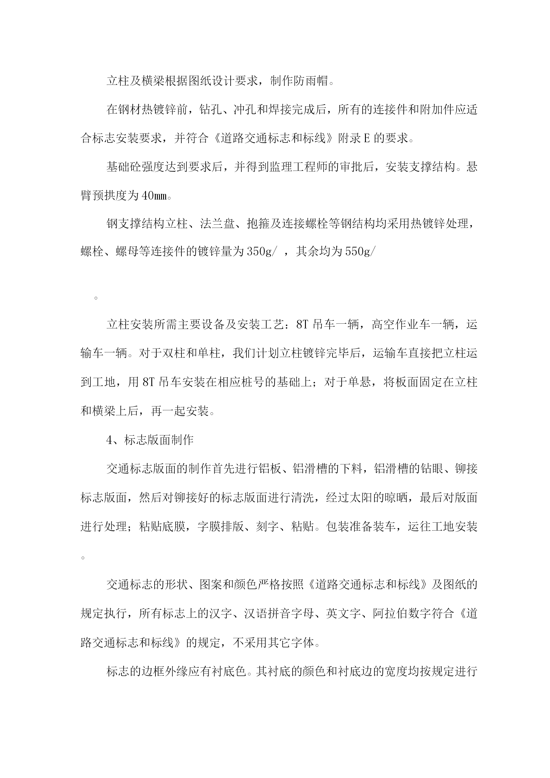交通工程施工方案(一)、标志牌施工方法1、标志定位与设置在标志施工中经常会出现基础与立柱的安装角度难以一致的情况,按照施工图纸要求定位和设置,安装的标志与交通流向成直角,在曲线路段,标志的设置角度由交通流的行进方向来确定。悬臂、标志沿垂直轴向后倾斜2°。对于路侧标志,标志板内缘距路缘石边缘不得小于250mm。2、基础施工根据设计图纸用全站仪定位放样,定出基坑位置。按设计图纸放出基坑大样,开挖后应达到图纸所示的大小和深度,如有扰动的开挖面,加大开挖量,达到设计规定要求。基坑验收合格后,开始浇筑相应标号和厚度的砼垫层,然后支外露部分及基坑顶以下15cm模板,安放、绑扎构造钢筋,绑扎定位地脚螺栓。模板、钢筋经监理工程师验收合格后,开始浇注砼,浇注时分层捣实,并要振捣均匀,基座顶部抹平,砼达到85%强度后拆模。派专人养护砼基础。回填土分层夯实,并与四周地面齐平。3、标志牌立柱施工在标志牌标志立柱施工时,对于设在绿化带上的标志,根据所在位置的实际地形确定,路侧单、双柱标志,其板面底边与路缘石外缘高差不小于20mm,板面内边缘距路缘石外缘不小于25mm;悬臂式标志,其板面底边距路面高度不小于5.5m。立柱及横梁根据图纸设计要求,制作防雨帽。在钢材热镀锌前,钻孔、冲孔和焊接完成后,所有的连接件和附加件应适合标志安装要求,并符合《道路交通标志和标线》附录E的要求。基础砼强度达到要求后,并得到监理工程师的审批后,安装支撑结构。悬臂预拱度为40mm。钢支撑结构立柱、法兰盘、抱箍及连接螺栓等钢结构均采用热镀锌处理,螺栓、螺母等连接件的镀锌量为350g/,其余均为550g/。立柱安装所需主要设备及安装工艺:8T吊车一辆,高空作业车一辆,运输车一辆。对于双柱和单柱,我们计划立柱镀锌完毕后,运输车直接把立柱运到工地,用8T吊车安装在相应桩号的基础上;对于单悬,将板面固定在立柱和横梁上后,再一起安装。4、标志版面制作交通标志版面的制作首先进行铝板、铝滑槽的下料,铝滑槽的钻眼、铆接标志版面,然后对铆接好的标志版面进行清洗,经过太阳的晾晒,最后对版面进行处理;粘贴底膜,字膜排版、刻字、粘贴。包装准备装车,运往工地安装。交通标志的形状、图案和颜色严格按照《道路交通标志和标线》及图纸的规定执行,所有标志上的汉字、汉语拼音字母、英文字、阿拉伯数字符合《道路交通标志和标线》的规定,不采用其它字体。标志的边框外缘应有衬底色。其衬底的颜色和衬底边的宽度均按规定进行制作。标志板符合《铝及铝合金板材的尺寸及偏差》的规定,按照《道路交通标志和标线》附录E及图纸的规定进行加固,槽钢在粘贴定向反光膜之前与板面铆接好。符合《公路交通标志板技术条件》的规定。标志板在剪裁或切割后边缘整齐、方正、没有毛刺,尺寸偏差控制在±5mm以内,表面无明显皱纹、凹痕、变形,每平方米范围内的平整度公差小于1.0mm。对于大型指路标志,我们尽可能减少分块数量,最多不超过4块。标志板的拼接采用对接,接缝的最大间隙小于1mm,所有接缝用背衬加强,背衬与标志板用铆钉连接,铆钉的间距小于150mm,背衬宽度大于50mm,背衬材料与版面板材相同。标志板背面采用氧化处理,使其表面变成暗灰色、不反光。粘贴反光膜时贴在经过酒精清洁、脱脂、磨面处理的铝板上,不采用手工操作或用溶剂激活粘结剂,在标志表面的最外层涂保护层。贴反光膜不可避免出现接缝时,应用上侧膜压下侧膜,拼接处有3〜6mm的重叠部分,以防漏水,贴膜时自一端向另一端延伸,边贴边拆下膜后封层,并用压敏贴膜机压实、平整、无任何皱折、气泡和破损,板面不得有回归反射不均匀及明显的颜色不均匀。将用电脑刻字机刻成的文字,按图纸规定事先放样位置贴于板面,并使其位置准确、紧密、平整、无倾斜、皱折、气泡和破损。制作标志板的铝合金板厚度,按设计图和规范规定制作,标志板的总质量不允许出现对标志结构的力学性能计算不利的情况。标志板外形尺寸,其长度和宽度的允许偏差为0.5%,标志板的4个端面应互相垂直,其不垂直度不应大于±2°。5、储存和运输标志牌板面制作完毕后,采用包装纸包严,塑料纸隔离,毛毡捆好,装车时采用竖放塞紧,避免在运输过程中板面破损,扭曲。大型指路标志由于在制造、运输过程中困难较大,在图纸要求和监理工程师的指示下,根据板面设计的具体情况,采用适当分割的办法来制造,分别贴反光膜,分别运输、安装。6、安装标志安装位置、结构、板面应与设计相符。只有当基础混凝土经7天养护后,方可在其上面进行架设支柱和标志。各种半成品运到现场,全面自检合格,并经监理工程师验收合格后进行安装。将底座法兰盘调整符合要求后,将立柱安装就位。立柱竖直度误差不超过±3mm/m,利用吊车将标志牌安装就位,并使其满足设计要求。路侧式标志应尽量减少标志