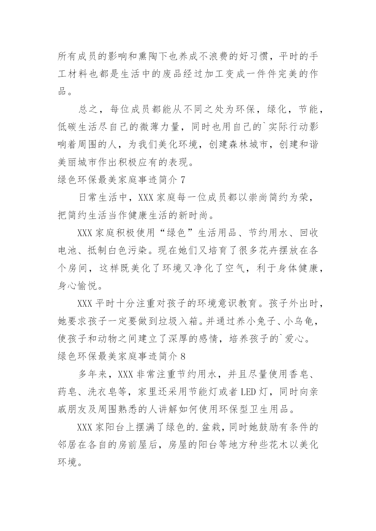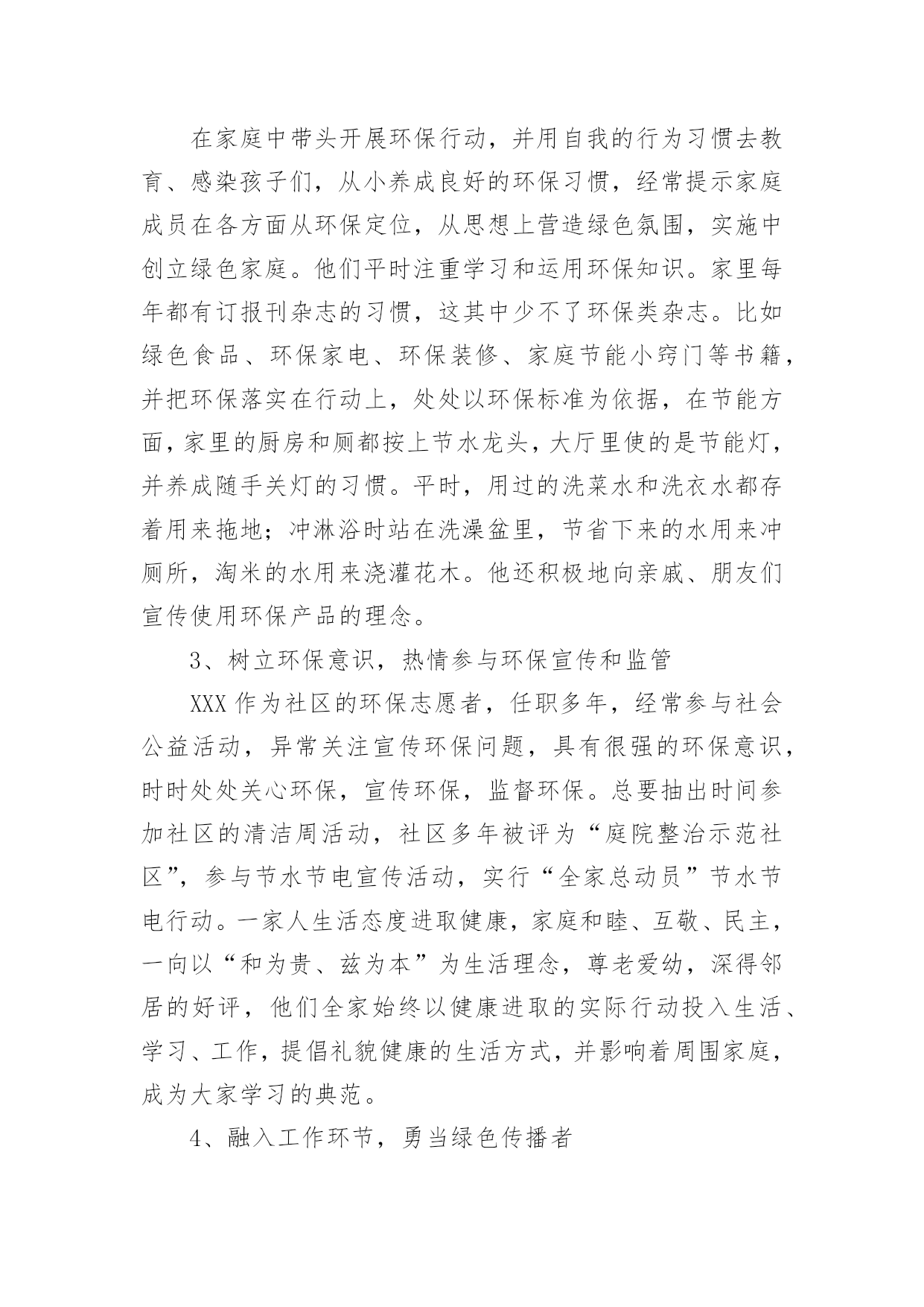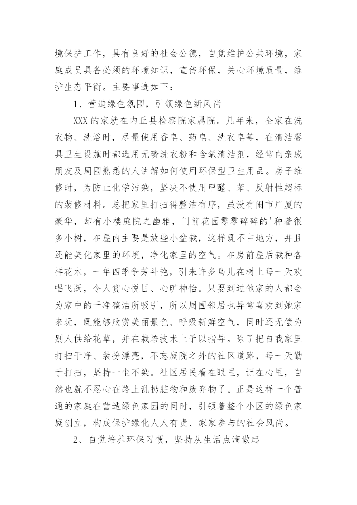 绿色环保最美家庭事迹简介(实用)绿色环保最美家庭事迹简介10篇无论是在学校还是在社会中,大家都有写事迹的经历,对事迹很是熟悉吧,事迹具有触发力大、感染力强的特点。什么样的事迹才是规范的呢?以下是小编为大家收集的绿色环保最美家庭事迹简介,希望能够帮助到大家。绿色环保最美家庭事迹简介1“绿色环保,从我做起”这是XX家的口号。平时在家里,她会把烂掉的`纯棉床单和被罩做成漂亮的拖把、她还会用塑料饮料瓶把上部剪成丝状编成好看的花瓶等。丈夫熊新革多年来始终坚持践行“低碳环保”理念,出门购物,经常他自己带环保袋。在父母的言传身教下,女儿也养成了勤俭节约、崇尚环保的好习惯,打印作业采用打印纸双面打印等。这就是XX的三口家庭,虽然他们做得微不足道,但他们崇尚环保、节能、绿色消费,他们为绿色环保事业尽了绵薄之力。绿色环保最美家庭事迹简介2XXX是内丘县纪委监委的一名普通职工,几年来,他们一家人把营建“绿色家庭”作为家庭建设的主要目标并收到了很好的效果,在保护生态环境和促进人与自然和谐发展方面做出了进取贡献。全家具有很强的环保意识,积极参与环境保护工作,具有良好的社会公德,自觉维护公共环境,家庭成员具备必须的环境知识,宣传环保,关心环境质量,维护生态平衡。主要事迹如下:1、营造绿色氛围,引领绿色新风尚XXX的家就在内丘县检察院家属院。几年来,全家在洗衣物、洗浴时,尽量使用香皂、药皂、洗衣皂等,在清洁餐具卫生设施时都选用无磷洗衣粉和含氧清洁剂,经常向亲戚朋友及周围熟悉的人讲解如何使用环保型卫生用品。房子维修时,为防止化学污染,坚决不使用甲醛、苯、反射性超标的装修材料。总把家里打扫得整洁有序,虽没有闹市广厦的豪华,却有小楼庭院之幽雅,门前花园零零碎碎的'种着很多小树,在屋内主要是放些小盆栽,这样既不占地方,并且还能美化家里的环境,净化家里的空气。在房前屋后栽种各样花木,一年四季争芳斗艳,引来许多鸟儿在树上每一天欢唱飞跃,令人赏心悦目、心旷神怡。只要到过他家的人都会为家中的干净整洁所吸引,所以周围邻居也异常喜欢到她家来玩,既能够欣赏美丽景色、呼吸新鲜空气,同时还无偿为别人供给花草,并在栽培技术上予以指导。除了把自我家里打扫干净、装扮漂亮,不忘庭院之外的社区道路,每一天勤于打扫,坚持一尘不染。社区居民看在眼里,记在心里,自然也就不忍心在路上乱扔脏物和废弃物了。正是这样一个普通的家庭在营造绿色家园的同时,引领着整个小区的绿色家庭创立,构成保护绿化人人有责、家家参与的社会风尚。2、自觉培养环保习惯,坚持从生活点滴做起在家庭中带头开展环保行动,并用自我的行为习惯去教育、感染孩子们,从小养成良好的环保习惯,经常提示家庭成员在各方面从环保定位,从思想上营造绿色氛围,实施中创立绿色家庭。他们平时注重学习和运用环保知识。家里每年都有订报刊杂志的习惯,这其中少不了环保类杂志。比如绿色食品、环保家电、环保装修、家庭节能小窍门等书籍,并把环保落实在行动上,处处以环保标准为依据,在节能方面,家里的厨房和厕都按上节水龙头,大厅里使的是节能灯,并养成随手关灯的习惯。平时,用过的洗菜水和洗衣水都存着用来拖地;冲淋浴时站在洗澡盆里,节省下来的水用来冲厕所,淘米的水用来浇灌花木。他还积极地向亲戚、朋友们宣传使用环保产品的理念。3、树立环保意识,热情参与环保宣传和监管XXX作为社区的环保志愿者,任职多年,经常参与社会公益活动,异常关注宣传环保问题,具有很强的环保意识,时时处处关心环保,宣传环保,监督环保。总要抽出时间参加社区的清洁周活动,社区多年被评为“庭院整治示范社区”,参与节水节电宣传活动,实行“全家总动员”节水节电行动。一家人生活态度进取健康,家庭和睦、互敬、民主,一向以“和为贵、兹为本”为生活理念,尊老爱幼,深得邻居的好评,他们全家始终以健康进取的实际行动投入生活、学习、工作,提倡礼貌健康的生活方式,并影响着周围家庭,成为大家学习的典范。4、融入工作环节,勇当绿色传播者同时他们一家人也是社区的环保义务监督员,他说:“一花独放不是春,万紫千红春满园”,仅仅我一家创立成绿色家庭是远远不够的,只有全社会成员都拥有了绿色观念,那么,整个社会才会更友好、更和谐。如何做一名绿色使者,把“绿”的种子播撒到每一个角落?身为环保监督员,他对社区及居民家庭节能减排工作进行有效监督,及时改变不符合节能减排要求的做法,从而保证了节能减排工作的有效开展。“虽然,我的力量微不足道,我们一家的力量微不足道,但努力的过程是欢乐的”,我们相信,一家的一言一行、一举一动必然会影响周围更多的人。只要人人都来参与绿色行动,我们社区环境建设必须会越来越美,我们的社会必然更加美丽、和谐。绿色环保最美家庭事迹简介3XXX家庭是一个普通的三口之家,XXX是一个残疾人,妻子是无业人员,有一个懂事可爱的女儿,这家人夫妻和睦、尊老