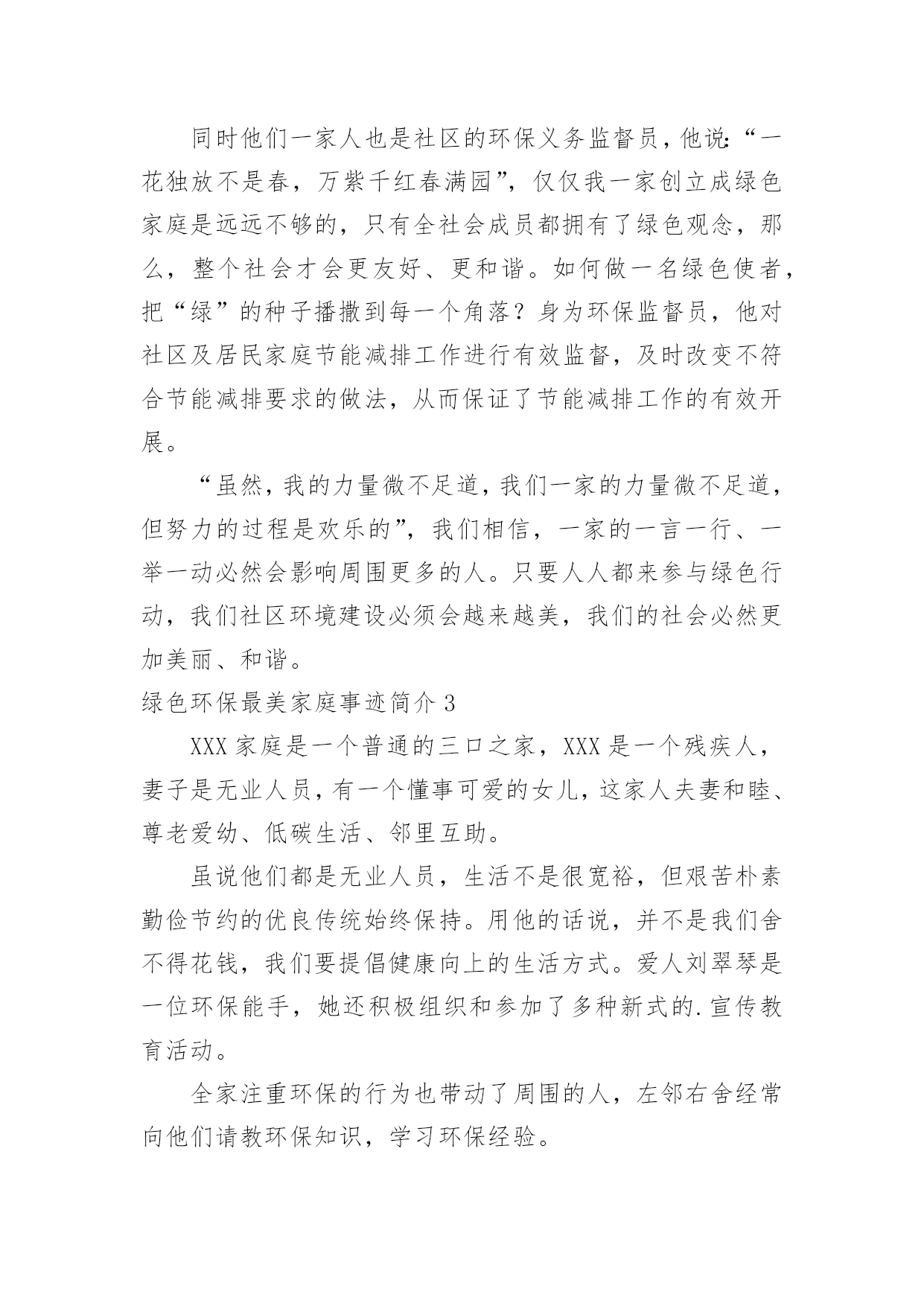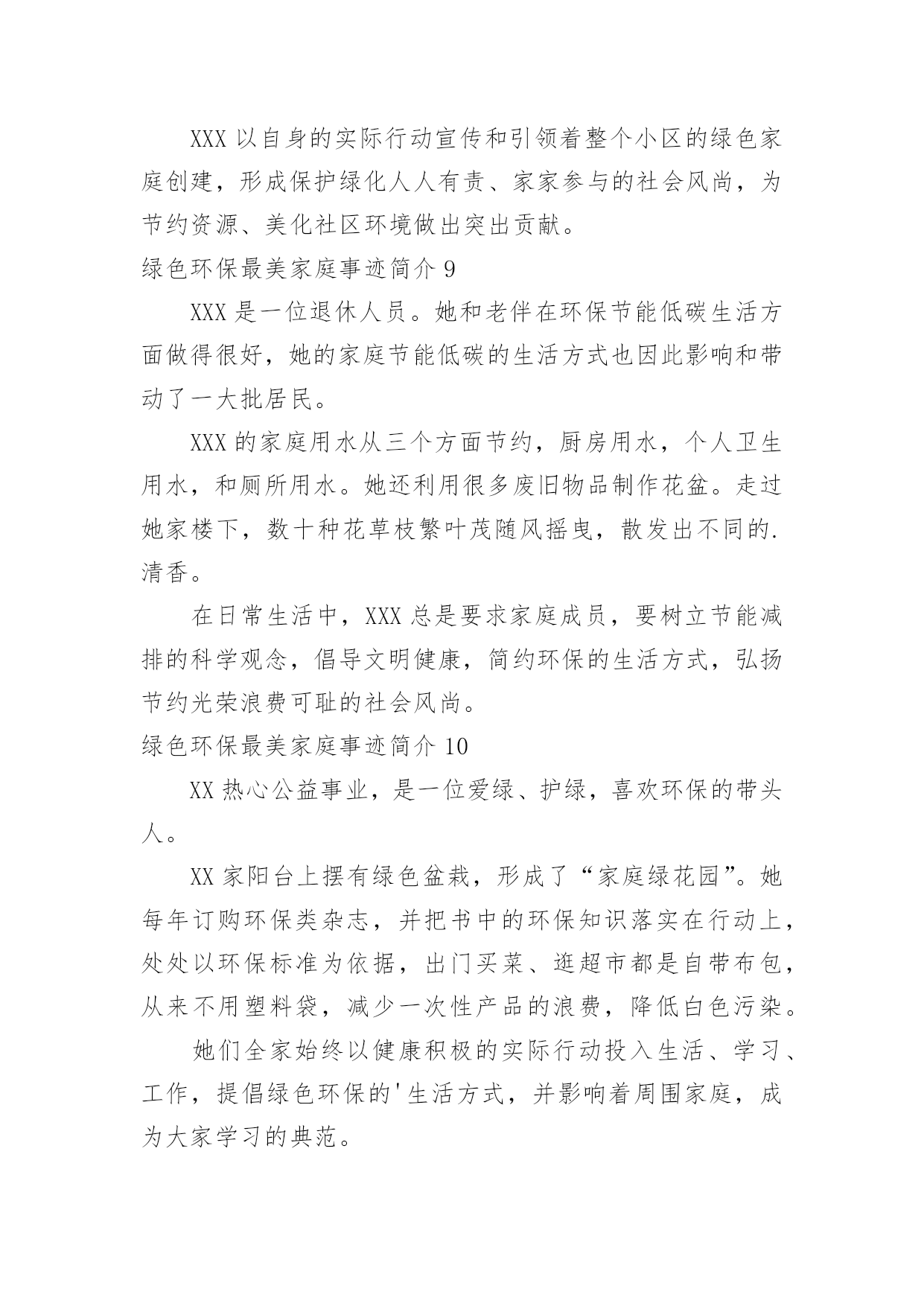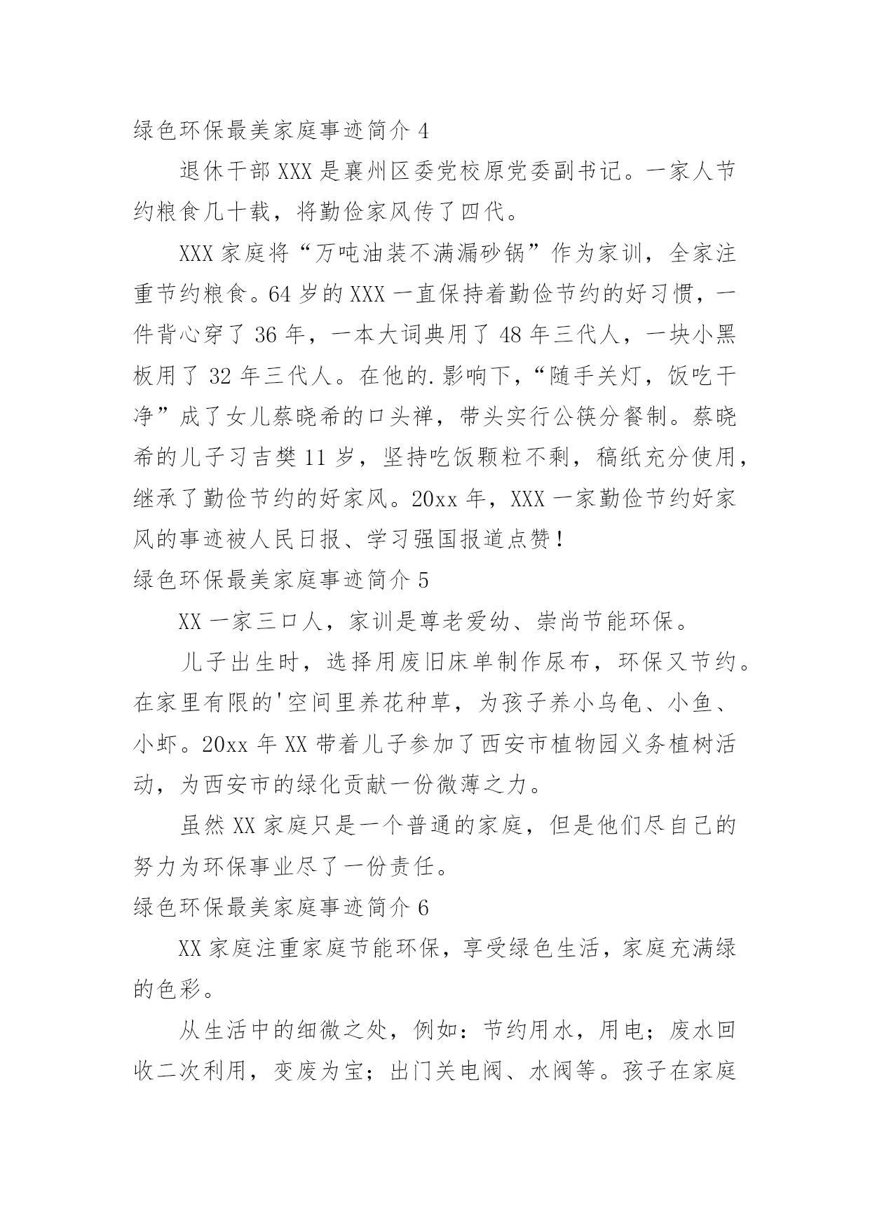 绿色环保最美家庭事迹简介(实用)绿色环保最美家庭事迹简介10篇无论是在学校还是在社会中,大家都有写事迹的经历,对事迹很是熟悉吧,事迹具有触发力大、感染力强的特点。什么样的事迹才是规范的呢?以下是小编为大家收集的绿色环保最美家庭事迹简介,希望能够帮助到大家。绿色环保最美家庭事迹简介1“绿色环保,从我做起”这是XX家的口号。平时在家里,她会把烂掉的`纯棉床单和被罩做成漂亮的拖把、她还会用塑料饮料瓶把上部剪成丝状编成好看的花瓶等。丈夫熊新革多年来始终坚持践行“低碳环保”理念,出门购物,经常他自己带环保袋。在父母的言传身教下,女儿也养成了勤俭节约、崇尚环保的好习惯,打印作业采用打印纸双面打印等。这就是XX的三口家庭,虽然他们做得微不足道,但他们崇尚环保、节能、绿色消费,他们为绿色环保事业尽了绵薄之力。绿色环保最美家庭事迹简介2XXX是内丘县纪委监委的一名普通职工,几年来,他们一家人把营建“绿色家庭”作为家庭建设的主要目标并收到了很好的效果,在保护生态环境和促进人与自然和谐发展方面做出了进取贡献。全家具有很强的环保意识,积极参与环境保护工作,具有良好的社会公德,自觉维护公共环境,家庭成员具备必须的环境知识,宣传环保,关心环境质量,维护生态平衡。主要事迹如下:1、营造绿色氛围,引领绿色新风尚XXX的家就在内丘县检察院家属院。几年来,全家在洗衣物、洗浴时,尽量使用香皂、药皂、洗衣皂等,在清洁餐具卫生设施时都选用无磷洗衣粉和含氧清洁剂,经常向亲戚朋友及周围熟悉的人讲解如何使用环保型卫生用品。房子维修时,为防止化学污染,坚决不使用甲醛、苯、反射性超标的装修材料。总把家里打扫得整洁有序,虽没有闹市广厦的豪华,却有小楼庭院之幽雅,门前花园零零碎碎的'种着很多小树,在屋内主要是放些小盆栽,这样既不占地方,并且还能美化家里的环境,净化家里的空气。在房前屋后栽种各样花木,一年四季争芳斗艳,引来许多鸟儿在树上每一天欢唱飞跃,令人赏心悦目、心旷神怡。只要到过他家的人都会为家中的干净整洁所吸引,所以周围邻居也异常喜欢到她家来玩,既能够欣赏美丽景色、呼吸新鲜空气,同时还无偿为别人供给花草,并在栽培技术上予以指导。除了把自我家里打扫干净、装扮漂亮,不忘庭院之外的社区道路,每一天勤于打扫,坚持一尘不染。社区居民看在眼里,记在心里,自然也就不忍心在路上乱扔脏物和废弃物了。正是这样一个普通的家庭在营造绿色家园的同时,引领着整个小区的绿色家庭创立,构成保护绿化人人有责、家家参与的社会风尚。2、自觉培养环保习惯,坚持从生活点滴做起在家庭中带头开展环保行动,并用自我的行为习惯去教育、感染孩子们,从小养成良好的环保习惯,经常提示家庭成员在各方面从环保定位,从思想上营造绿色氛围,实施中创立绿色家庭。他们平时注重学习和运用环保知识。家里每年都有订报刊杂志的习惯,这其中少不了环保类杂志。比如绿色食品、环保家电、环保装修、家庭节能小窍门等书籍,并把环保落实在行动上,处处以环保标准为依据,在节能方面,家里的厨房和厕都按上节水龙头,大厅里使的是节能灯,并养成随手关灯的习惯。平时,用过的洗菜水和洗衣水都存着用来拖地;冲淋浴时站在洗澡盆里,节省下来的水用来冲厕所,淘米的水用来浇灌花木。他还积极地向亲戚、朋友们宣传使用环保产品的理念。3、树立环保意识,热情参与环保宣传和监管XXX作为社区的环保志愿者,任职多年,经常参与社会公益活动,异常关注宣传环保问题,具有很强的环保意识,时时处处关心环保,宣传环保,监督环保。总要抽出时间参加社区的清洁周活动,社区多年被评为“庭院整治示范社区”,参与节水节电宣传活动,实行“全家总动员”节水节电行动。一家人生活态度进取健康,家庭和睦、互敬、民主,一向以“和为贵、兹为本”为生活理念,尊老爱幼,深得邻居的好评,他们全家始终以健康进取的实际行动投入生活、学习、工作,提倡礼貌健康的生活方式,并影响着周围家庭,成为大家学习的典范。4、融入工作环节,勇当绿色传播者同时他们一家人也是社区的环保义务监督员,他说:“一花独放不是春,万紫千红春满园”,仅仅我一家创立成绿色家庭是远远不够的,只有全社会成员都拥有了绿色观念,那么,整个社会才会更友好、更和谐。如何做一名绿色使者,把“绿”的种子播撒到每一个角落?身为环保监督员,他对社区及居民家庭节能减排工作进行有效监督,及时改变不符合节能减排要求的做法,从而保证了节能减排工作的有效开展。“虽然,我的力量微不足道,我们一家的力量微不足道,但努力的过程是欢乐的”,我们相信,一家的一言一行、一举一动必然会影响周围更多的人。只要人人都来参与绿色行动,我们社区环境建设必须会越来越美,我们的社会必然更加美丽、和谐。绿色环保最美家庭事迹简介3XXX家庭是一个普通的三口之家,XXX是一个残疾人,妻子是无业人员,有一个懂事可爱的女儿,这家人夫妻和睦、尊老