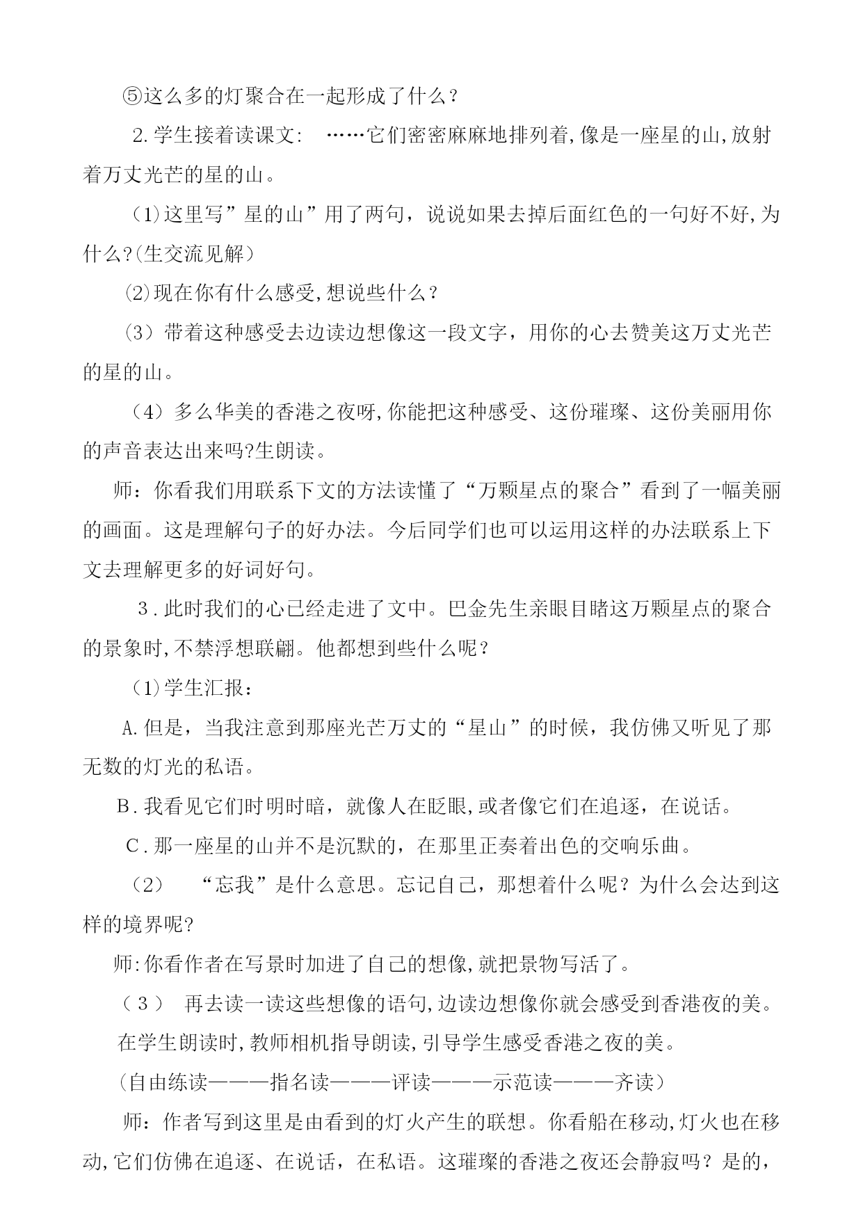 《香港之夜》教案教学目标:1.学会本课的12个生字,认识7个生字,理解“幻景”等词。2.学习理解语文,一边读一边展开想象,感受香港之夜的景色和作者的语言美。3.正确、流利、有感情地朗读课文,体会作者的思想感情。4.在学习中了解掌握由作者的观察顺序和“实写与想象互相结合”的写作方法,及联系上下文和生活实际理解词语做到学习致用。教学重点、难点:1.一边读一边展开想象,感受香港之夜的美和作者的语言美。2.正确、流利、有感情朗读课文。教学策略:1.夯实基础,重视预习,检查反馈。充分重视课前准备活动,有计划地安排以下内容:(1)查阅作家巴金的资料,充分了解作者的相关作品及创作风格等。(2)利用工具书,自主学习生字,扫清阅读的障碍。2.学生带着基本的见解朗读课文,适时播放片段加强视听刺激,调动学生享受美景的欲望。3.听说读想写结合,并引导学生适时补充生活“空白”,发挥想象,体现课堂教学的灵活性和开放性,依据教材,超越教材,拓展教材。教学准备:多媒体课件教学过程:一、了解作者,图片导入1.交流作者资料。2.多媒体出示香港全景。这是一个大家都非常熟悉的城市。你知道它是哪吗?香港是东方的一颗璀璨的明珠,是一座美丽的城市。你们看:这里高楼林立,向世界展示着风彩,繁华的街市上车水马龙,阳光下的香港是迷人的。这节课我们就随同语言大师巴金先生去领略那迷人的香港之夜。(板书课题,同时指导“港”字的写法,齐读)二、检查预习,读准字音屏幕出示下列词语。舱外栏杆私语眨眼混合愈来遮住渺茫凉爽嘈杂疑惑三、初读课文,整体感知1.请同学们大声地自由读课文,注意读准字音,读通句子,想一想哪句话能够概括出课文的主要内容,把它画下来。2.学生自由读文后,指名读画出的句子。3.从朋友的这句话中,我们知道了香港之夜的特点,就是“美”(板书),美到了不可不看的程度。那香港之夜到底美在哪?作者又是如何为我们描绘这不可不看的美景的呢?接下来,就让我们带着向往之情再次回到文中,把这些美景找一找、读一读、画一画、品一品。四、细读文章,品味意境。学生默读课文,画出有关语句;一边读一边想象香港之夜的美,教师巡视。(一)指导学习第四、五、六自然段1.随着船的移动,作者倚栏而望,看到的是渐行渐远的香港夜景。你能把巴老看到的对面的香港的美景和大家分享一下吗?(1)指名读。(2)师生配合分角色来读文,说说对面的香港美在哪?①“万颗星点的聚合”是怎样的景象呢?②为什么别的地方都是黑,单单香港就成了万颗星点的聚合了呢?(师补充讲解)③山上有灯、街上有灯、建筑物上有灯。(链接图片)这说明了什么?④除了这三个“有灯”让我们知道了香港灯多、密、亮,这段里还有哪些词也写出了灯多?⑤这么多的灯聚合在一起形成了什么?2.学生接着读课文:……它们密密麻麻地排列着,像是一座星的山,放射着万丈光芒的星的山。(1)这里写”星的山”用了两句,说说如果去掉后面红色的一句好不好,为什么?(生交流见解)(2)现在你有什么感受,想说些什么?(3)带着这种感受去边读边想像这一段文字,用你的心去赞美这万丈光芒的星的山。(4)多么华美的香港之夜呀,你能把这种感受、这份璀璨、这份美丽用你的声音表达出来吗?生朗读。师:你看我们用联系下文的方法读懂了“万颗星点的聚合”看到了一幅美丽的画面。这是理解句子的好办法。今后同学们也可以运用这样的办法联系上下文去理解更多的好词好句。3.此时我们的心已经走进了文中。巴金先生亲眼目睹这万颗星点的聚合的景象时,不禁浮想联翩。他都想到些什么呢?(1)学生汇报:A.但是,当我注意到那座光芒万丈的“星山”的时候,我仿佛又听见了那无数的灯光的私语。B.我看见它们时明时暗,就像人在眨眼,或者像它们在追逐,在说话。C.那一座星的山并不是沉默的,在那里正奏着出色的交响乐曲。(2)“忘我”是什么意思。忘记自己,那想着什么呢?为什么会达到这样的境界呢?师:你看作者在写景时加进了自己的想像,就把景物写活了。(3)再去读一读这些想像的语句,边读边想像你就会感受到香港夜的美。在学生朗读时,教师相机指导朗读,引导学生感受香港之夜的美。(自由练读———指名读———评读———示范读———齐读)师:作者写到这里是由看到的灯火产生的联想。你看船在移动,灯火也在移动,它们仿佛在追逐、在说话,在私语。这璀璨的香港之夜还会静寂吗?是的,它一如白天时充满了繁华、生机和活力!师:香港的夜色已随着船的远离而渐行渐远,但它的光影迷离和生机勃勃却久久让“我”沉醉,印在了“我”的眼里和心里。4.我们今天虽不能象作者一样亲身去体会一番香港的夜景,但老师为同学们制作了一段香港夜景的小片子,请同学们一饱眼福。(出示香港夜景的视频。)(1)欣赏香港夜