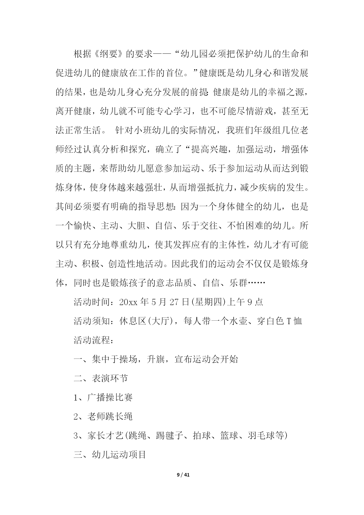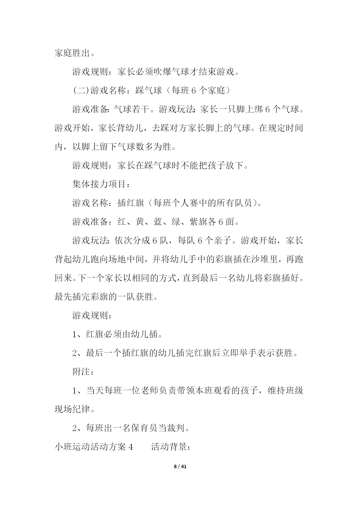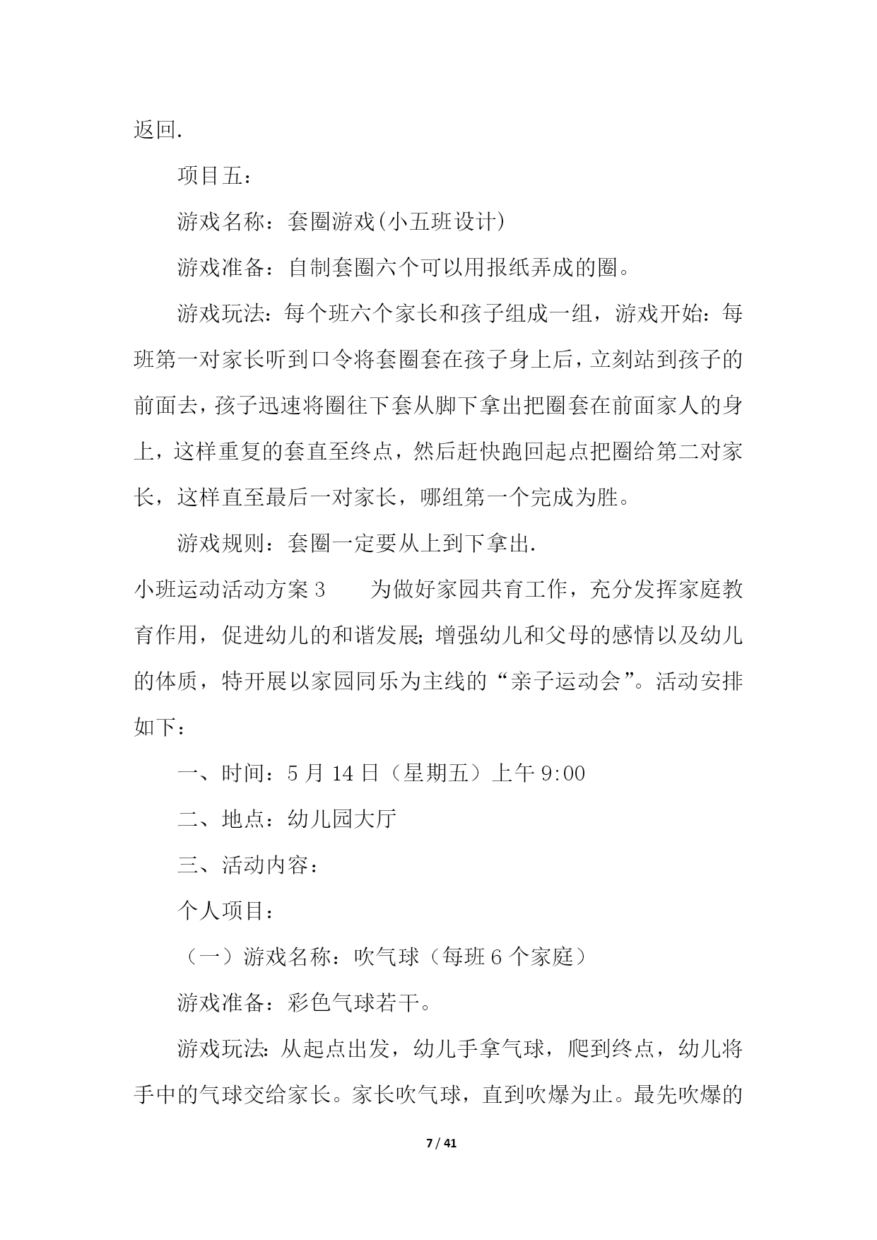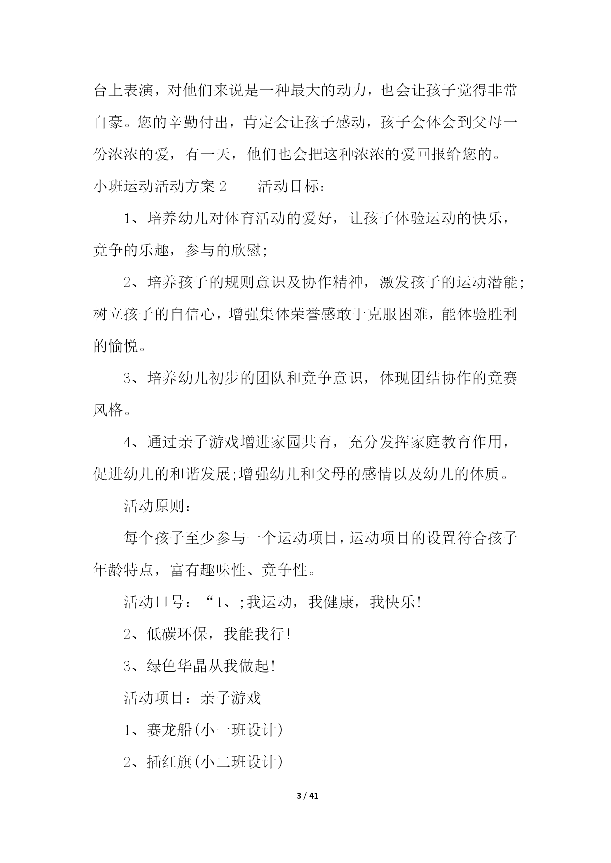 PAGE41/NUMPAGES41小班运动活动方案15篇小班运动活动方案1一、活动意图:为了促进幼儿身体动作的发展,根据《3———6岁儿童学习与发展指南》幼儿健康领域发展目标,老师们根据孩子的年龄特点精心制定各年级的比赛项目。我们旨在通过运动会来提高孩子参与体育锻炼的兴趣,使孩子的动作得到相应的发展,增强孩子的体质,让孩子爱上运动,积极参加运动,从而也培养不怕苦不怕累的精神。二、活动重点:1、通过这次运动会让幼儿进一步提高跑、跳、投、拍球,爬等动作发展能力。2、加强幼儿的体育锻炼,让孩子爱上运动,喜欢运动。3、培养幼儿之间团结友爱,努力拼搏的精神。三、活动对象:大、中、小班级的全体幼儿及家长四、活动时间:暂定:12月25、26、27号,遇天气原因可能会有变动。五、活动地点:本园操场六、活动流程:第一天:开幕式及大班级孩子比赛1、运动员入场,入场方式:各班伴随《运动员进行曲》并高喊各班口号入场2、运动员宣誓、园长讲话3、小班孩子早操表演。4、小班级家长表演。5、中班级孩子早操表演6、中班级家长表演。7、大班级孩子早操表演。8、大班级家长表演。9、大班级孩子运动项目比赛。第二天:1、上午中班级孩子运动项目比赛。2、下午小班级孩子运动项目比赛。第三天:闭幕式1、颁奖仪式。2、亲子活动:由亚太体能老师负责组织。注:请家长开幕式和闭幕式务必要参加,另:本孩子参加比赛时也希望家长能来为孩子加油和打气。家长可根据孩子的实际情况为孩子选报2至3个项目参加比赛(也可以咨询本班老师为孩子选报比赛项目)。本次幼儿园设置了家长表演的节目,就是想让家长给孩子作一个好的榜样,特别是自己孩子胆子比较小的家长,更要积极报名参加到家长节目表演中来,当孩子看到自己的爸爸、妈妈能在台上表演,对他们来说是一种最大的动力,也会让孩子觉得非常自豪。您的辛勤付出,肯定会让孩子感动,孩子会体会到父母一份浓浓的爱,有一天,他们也会把这种浓浓的爱回报给您的。小班运动活动方案2活动目标:1、培养幼儿对体育活动的爱好,让孩子体验运动的快乐,竞争的乐趣,参与的欣慰;2、培养孩子的规则意识及协作精神,激发孩子的运动潜能;树立孩子的自信心,增强集体荣誉感敢于克服困难,能体验胜利的愉悦。3、培养幼儿初步的团队和竞争意识,体现团结协作的竞赛风格。4、通过亲子游戏增进家园共育,充分发挥家庭教育作用,促进幼儿的和谐发展;增强幼儿和父母的感情以及幼儿的体质。活动原则:每个孩子至少参与一个运动项目,运动项目的设置符合孩子年龄特点,富有趣味性、竞争性。活动口号:“1、;我运动,我健康,我快乐!2、低碳环保,我能我行!3、绿色华晶从我做起!活动项目:亲子游戏1、赛龙船(小一班设计)2、插红旗(小二班设计)3、小老鼠运蛋(小三班设计)4、赶小猪(小四班设计)5、套圈游戏(小五班设计)活动准备:每个项目的准备工作都有设计项目的班级负责。总负责协调:年级组长每班协调:班主任主持解说项目规则:陈瑜敏每班选一个家长拍照裁判:每个项目的裁判有每个班的家委会委员和一名老师担任,班主任负责起点的裁判,家长委员会负责终点的裁判。1、赛龙船张海燕沈丽2、插红旗家委会委员顾红风3、小老鼠运蛋家委会委员4、赶小猪家委会委员詹国丽5、套圈游戏家委会委员刘萍每个项目活动细则:项目一:游戏名称:赛龙船(小一班设计)游戏准备:场地划好五条一样长的跑道。三十双手套。游戏玩法:每班有六个家长和孩子组成一只龙船。游戏开始:每班六对家长坐在起跑场地上组成五条龙船,家长双手撑地孩子面对面坐在大人的腿上双手抱住大人的腰,听信号五条龙船同时出发,有家长用双手蹲地同时身体向前挪动,直至终点,那队先到那队为胜者。游戏规则:1、每队向前划时一定要一个一个接牢注意协调前进。2、一点要碰终点线才算完成游戏。集体接力项目二游戏名称:插红旗(小二班设计)游戏准备:各班准备小红旗各6面,插小旗的沙盘六个。游戏玩法:以班级为组分成5队,每队6个亲子。游戏开始,孩子和家长将靠近的那只脚结在一起组成三足向场地终点沙盘协调走去,并将幼儿手中的红旗插在沙堆里,再返回起点,将脚上的绳解下给第二对家庭以相同的方式把小旗送往终点再返回,直到最后一对家庭将彩旗插好。最先插完彩旗的一队获胜。游戏规则:1.红旗必须由幼儿插。2.最后一个插红旗的幼儿插完红旗后立即举手表示获胜。项目三:游戏名称:小老鼠运蛋(小三班设计)目的:1、幼儿练习双手向目标投球的技能,培养幼儿手臂肌肉的发展。2、增进亲子间的感情。准备:每班六名小朋友和家长组成一队,六名幼儿站在起跑线后准备。六名妈妈距宝宝十五米处排队等候,5个框子、、五个纸球,场地安排:起跑线距球门的控制圈13米,控制圈距球门一米,由家长拿着的框子作为球门。玩法:每队第一名幼儿抱球跑13米,至球门一米远处的控制圈里,双手将球投入