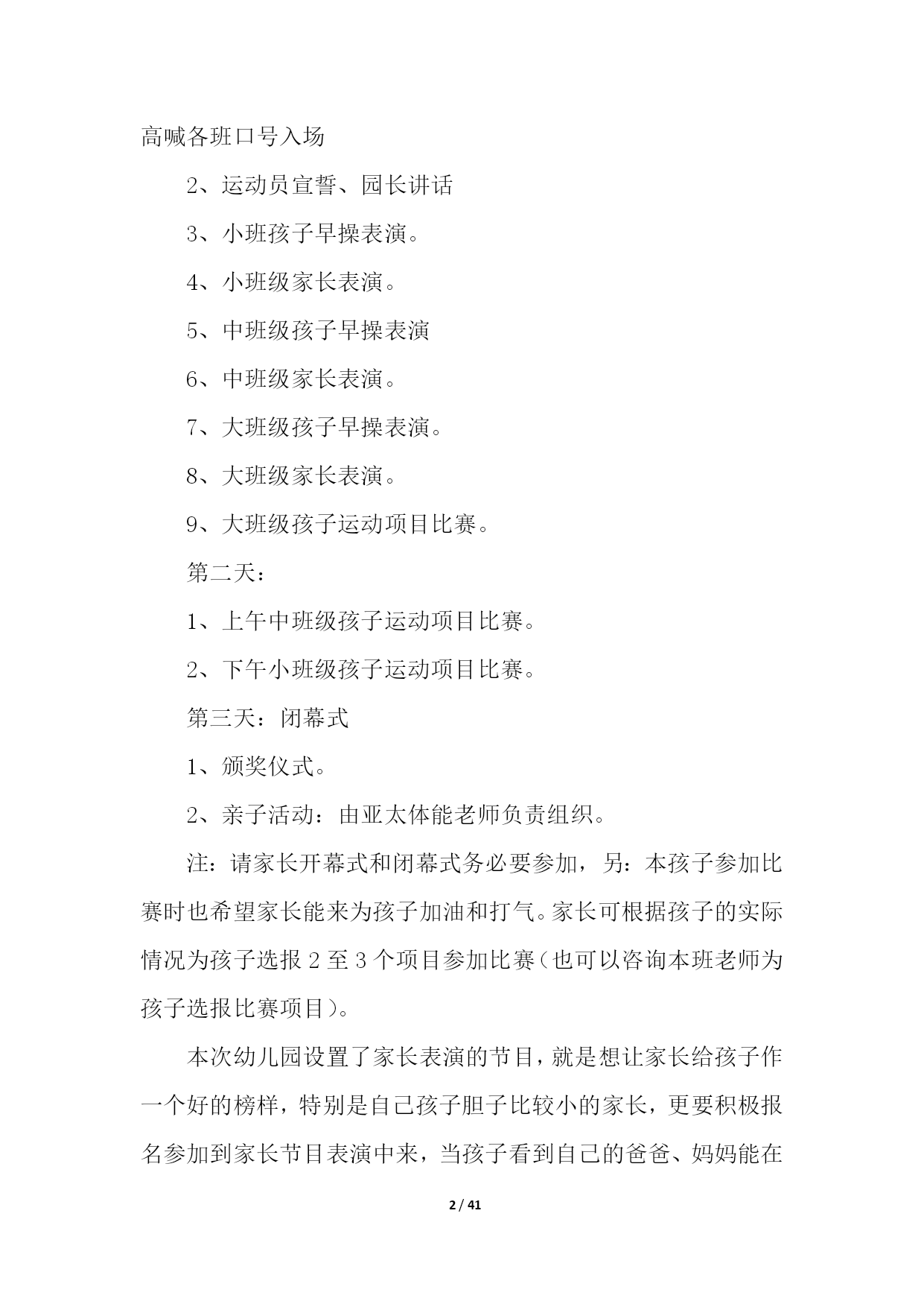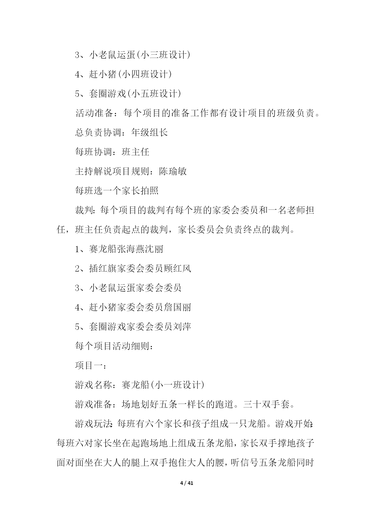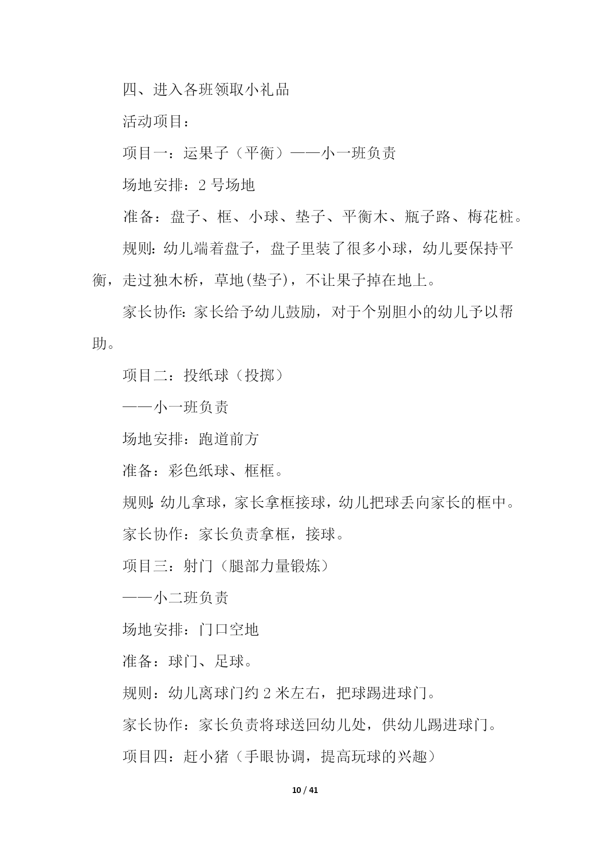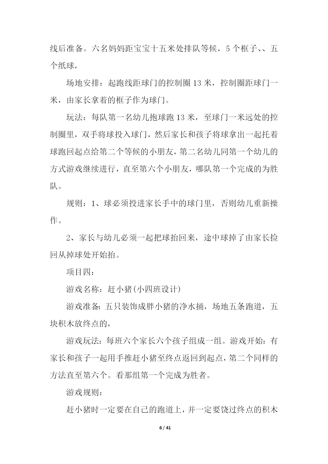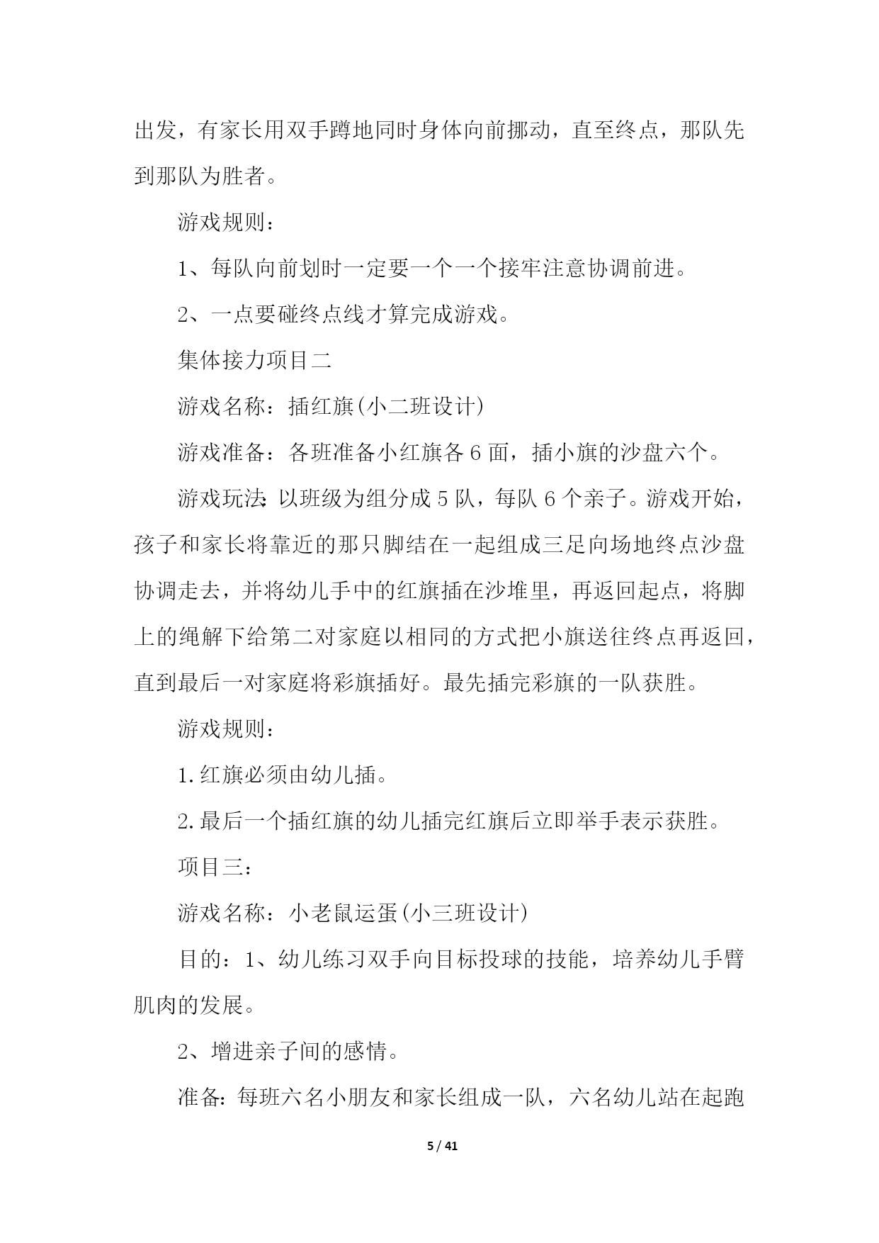 PAGE41/NUMPAGES41小班运动活动方案15篇小班运动活动方案1一、活动意图:为了促进幼儿身体动作的发展,根据《3———6岁儿童学习与发展指南》幼儿健康领域发展目标,老师们根据孩子的年龄特点精心制定各年级的比赛项目。我们旨在通过运动会来提高孩子参与体育锻炼的兴趣,使孩子的动作得到相应的发展,增强孩子的体质,让孩子爱上运动,积极参加运动,从而也培养不怕苦不怕累的精神。二、活动重点:1、通过这次运动会让幼儿进一步提高跑、跳、投、拍球,爬等动作发展能力。2、加强幼儿的体育锻炼,让孩子爱上运动,喜欢运动。3、培养幼儿之间团结友爱,努力拼搏的精神。三、活动对象:大、中、小班级的全体幼儿及家长四、活动时间:暂定:12月25、26、27号,遇天气原因可能会有变动。五、活动地点:本园操场六、活动流程:第一天:开幕式及大班级孩子比赛1、运动员入场,入场方式:各班伴随《运动员进行曲》并高喊各班口号入场2、运动员宣誓、园长讲话3、小班孩子早操表演。4、小班级家长表演。5、中班级孩子早操表演6、中班级家长表演。7、大班级孩子早操表演。8、大班级家长表演。9、大班级孩子运动项目比赛。第二天:1、上午中班级孩子运动项目比赛。2、下午小班级孩子运动项目比赛。第三天:闭幕式1、颁奖仪式。2、亲子活动:由亚太体能老师负责组织。注:请家长开幕式和闭幕式务必要参加,另:本孩子参加比赛时也希望家长能来为孩子加油和打气。家长可根据孩子的实际情况为孩子选报2至3个项目参加比赛(也可以咨询本班老师为孩子选报比赛项目)。本次幼儿园设置了家长表演的节目,就是想让家长给孩子作一个好的榜样,特别是自己孩子胆子比较小的家长,更要积极报名参加到家长节目表演中来,当孩子看到自己的爸爸、妈妈能在台上表演,对他们来说是一种最大的动力,也会让孩子觉得非常自豪。您的辛勤付出,肯定会让孩子感动,孩子会体会到父母一份浓浓的爱,有一天,他们也会把这种浓浓的爱回报给您的。小班运动活动方案2活动目标:1、培养幼儿对体育活动的爱好,让孩子体验运动的快乐,竞争的乐趣,参与的欣慰;2、培养孩子的规则意识及协作精神,激发孩子的运动潜能;树立孩子的自信心,增强集体荣誉感敢于克服困难,能体验胜利的愉悦。3、培养幼儿初步的团队和竞争意识,体现团结协作的竞赛风格。4、通过亲子游戏增进家园共育,充分发挥家庭教育作用,促进幼儿的和谐发展;增强幼儿和父母的感情以及幼儿的体质。活动原则:每个孩子至少参与一个运动项目,运动项目的设置符合孩子年龄特点,富有趣味性、竞争性。活动口号:“1、;我运动,我健康,我快乐!2、低碳环保,我能我行!3、绿色华晶从我做起!活动项目:亲子游戏1、赛龙船(小一班设计)2、插红旗(小二班设计)3、小老鼠运蛋(小三班设计)4、赶小猪(小四班设计)5、套圈游戏(小五班设计)活动准备:每个项目的准备工作都有设计项目的班级负责。总负责协调:年级组长每班协调:班主任主持解说项目规则:陈瑜敏每班选一个家长拍照裁判:每个项目的裁判有每个班的家委会委员和一名老师担任,班主任负责起点的裁判,家长委员会负责终点的裁判。1、赛龙船张海燕沈丽2、插红旗家委会委员顾红风3、小老鼠运蛋家委会委员4、赶小猪家委会委员詹国丽5、套圈游戏家委会委员刘萍每个项目活动细则:项目一:游戏名称:赛龙船(小一班设计)游戏准备:场地划好五条一样长的跑道。三十双手套。游戏玩法:每班有六个家长和孩子组成一只龙船。游戏开始:每班六对家长坐在起跑场地上组成五条龙船,家长双手撑地孩子面对面坐在大人的腿上双手抱住大人的腰,听信号五条龙船同时出发,有家长用双手蹲地同时身体向前挪动,直至终点,那队先到那队为胜者。游戏规则:1、每队向前划时一定要一个一个接牢注意协调前进。2、一点要碰终点线才算完成游戏。集体接力项目二游戏名称:插红旗(小二班设计)游戏准备:各班准备小红旗各6面,插小旗的沙盘六个。游戏玩法:以班级为组分成5队,每队6个亲子。游戏开始,孩子和家长将靠近的那只脚结在一起组成三足向场地终点沙盘协调走去,并将幼儿手中的红旗插在沙堆里,再返回起点,将脚上的绳解下给第二对家庭以相同的方式把小旗送往终点再返回,直到最后一对家庭将彩旗插好。最先插完彩旗的一队获胜。游戏规则:1.红旗必须由幼儿插。2.最后一个插红旗的幼儿插完红旗后立即举手表示获胜。项目三:游戏名称:小老鼠运蛋(小三班设计)目的:1、幼儿练习双手向目标投球的技能,培养幼儿手臂肌肉的发展。2、增进亲子间的感情。准备:每班六名小朋友和家长组成一队,六名幼儿站在起跑线后准备。六名妈妈距宝宝十五米处排队等候,5个框子、、五个纸球,场地安排:起跑线距球门的控制圈13米,控制圈距球门一米,由家长拿着的框子作为球门。玩法:每队第一名幼儿抱球跑13米,至球门一米远处的控制圈里,双手将球投入