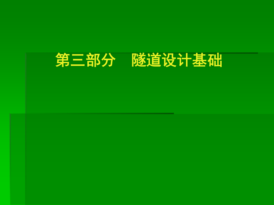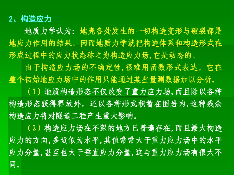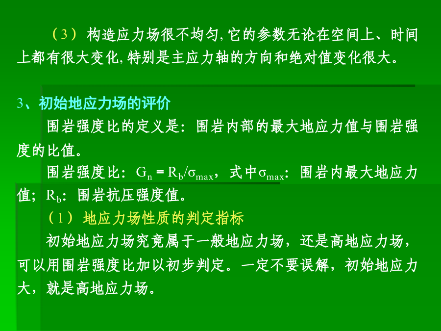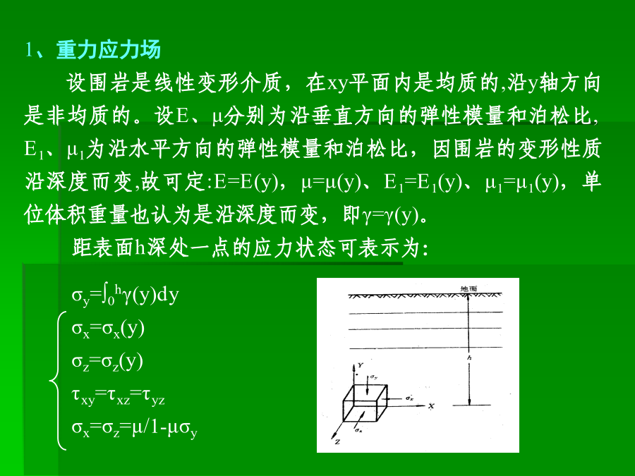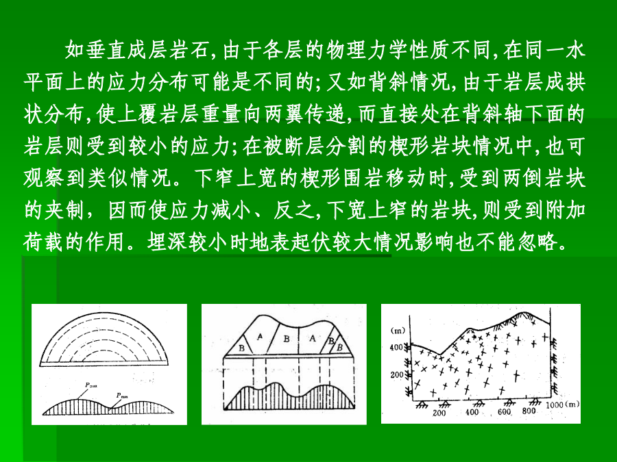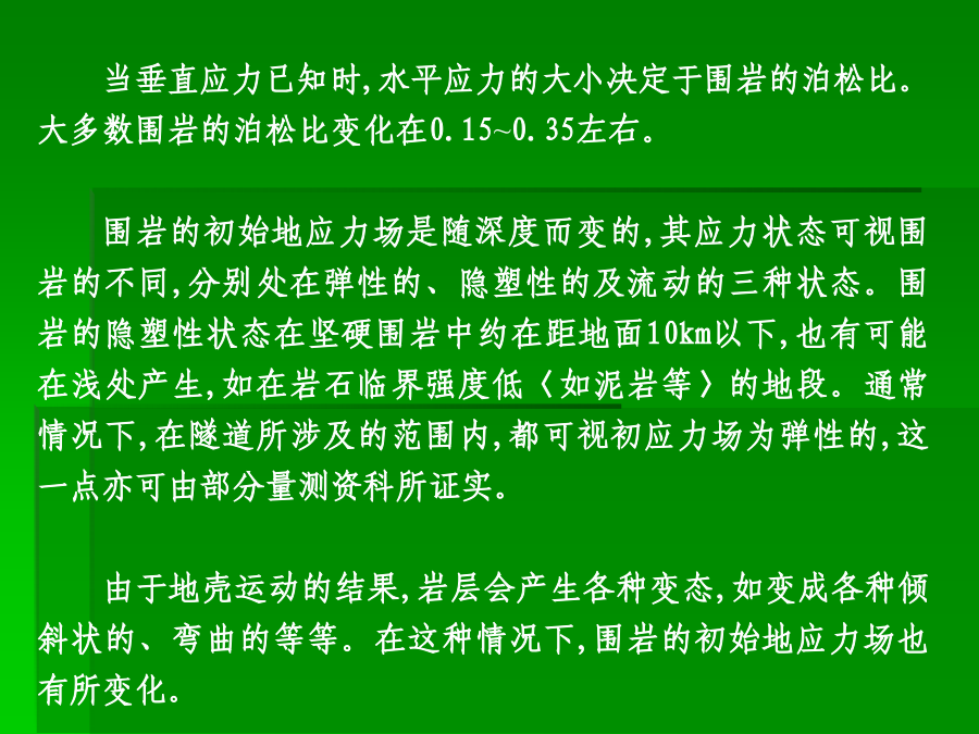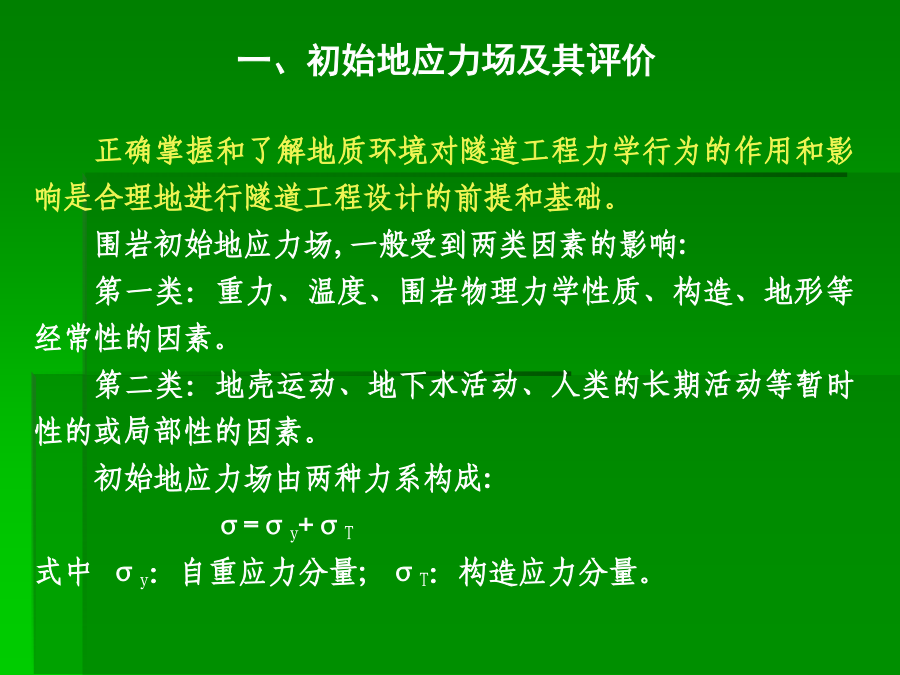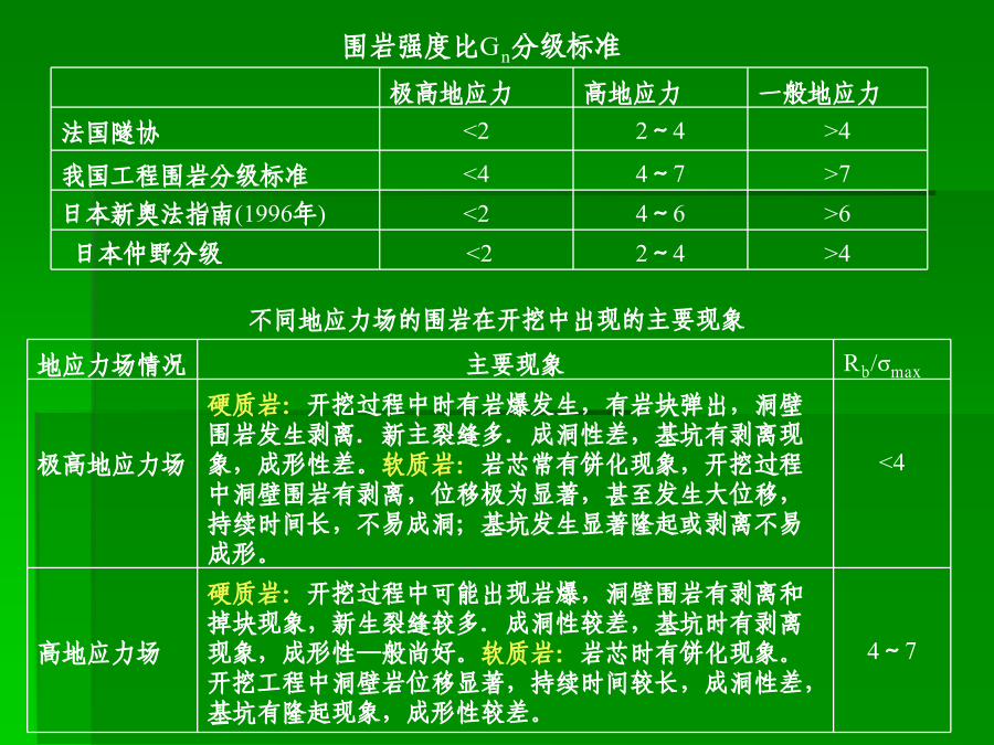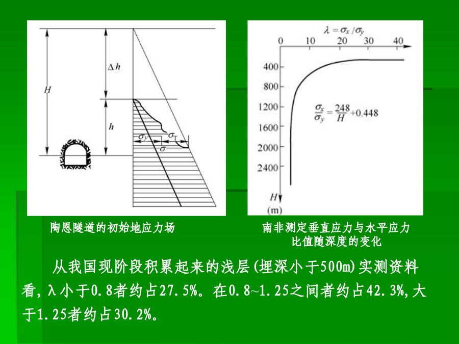 主讲:谭忠盛王秀英第三部分隧道设计基础一、初始地应力场及其评价1、重力应力场设围岩是线性变形介质,在xy平面内是均质的,沿y轴方向是非均质的。设E、μ分别为沿垂直方向的弹性模量和泊松比,E1、μ1为沿水平方向的弹性模量和泊松比,因围岩的变形性质沿深度而变,故可定:E=E(y),μ=μ(y)、E1=E1(y)、μ1=μ1(y),单位体积重量也认为是沿深度而变,即γ=γ(y)。距表面h深处一点的应力状态可表示为:σy=∫0hγ(y)dyσx=σx(y)σz=σz(y)τxy=τxz=τyzσx=σz=μ/1-μσy当垂直应力已知时,水平应力的大小决定于围岩的泊松比。大多数围岩的泊松比变化在0.15~0.35左右。围岩的初始地应力场是随深度而变的,其应力状态可视围岩的不同,分别处在弹性的、隐塑性的及流动的三种状态。围岩的隐塑性状态在坚硬围岩中约在距地面10km以下,也有可能在浅处产生,如在岩石临界强度低〈如泥岩等〉的地段。通常情况下,在隧道所涉及的范围内,都可视初应力场为弹性的,这一点亦可由部分量测资科所证实。由于地壳运动的结果,岩层会产生各种变态,如变成各种倾斜状的、弯曲的等等。在这种情况下,围岩的初始地应力场也有所变化。如垂直成层岩石,由于各层的物理力学性质不同,在同一水平面上的应力分布可能是不同的;又如背斜情况,由于岩层成拱状分布,使上覆岩层重量向两翼传递,而直接处在背斜轴下面的岩层则受到较小的应力;在被断层分割的楔形岩块情况中,也可观察到类似情况。下窄上宽的楔形围岩移动时,受到两倒岩块的夹制,因而使应力减小、反之,下宽上窄的岩块,则受到附加荷载的作用。埋深较小时地表起伏较大情况影响也不能忽略。2、构造应力地质力学认为:地壳各处发生的一切构造变形与破裂都是地应力作用的结果。因而地质力学就把构造体系和构造形式在形成过程中的应力状态称之为构造应力场,它是动态的。由于构造应力场的不确定性,很难用函数形式表达。它在整个初始地应力场中的作用只能通过某些量测数据加以分析。(1)地质构造形态不仅改变了重力应力场,而且除以各种构造形态获得释放外,还以各种形式积蓄在围岩内,这种残余构造应力将对隧道工程产生重大影响。(2)构造应力场在不深的地方已普遍存在,而且最大构造应力的方向,多近似为水平,其值常常大于重力应力场中的水平应力分量,甚至也大于垂直应力分量,这与重力应力场有很大不同。陶恩隧道的初始地应力场南非测定垂直应力与水平应力比值随深度的变化(3)构造应力场很不均匀,它的参数无论在空间上、时间上都有很大变化,特别是主应力轴的方向和绝对值变化很大。3、初始地应力场的评价围岩强度比的定义是:围岩内部的最大地应力值与围岩强度的比值。围岩强度比:Gn=Rb/σmax,式中σmax:围岩内最大地应力值;Rb:围岩抗压强度值。(1)地应力场性质的判定指标初始地应力场究竟属于一般地应力场,还是高地应力场,可以用围岩强度比加以初步判定。一定不要误解,初始地应力大,就是高地应力场。围岩强度比Gn分级标准(2)判定土压性质的指标日本仲野采用围岩强度比作为是否产生塑性地压的指标。Barton的围岩强度比分级日本围岩分级中的围岩强度比基准我国初始地应力场的修正二、毛洞的围岩力学状态σr=σy/2[(1-α2)(1+λ)+(1-4α2+3α4)(1-λ)cos2φ]σt=σy/2[(1+α2)(1+λ)-(1+3α4)(1-λ)cos2φ]τrt=σy/2(1-λ)(1+2α2-3α4)sin2φ式中α=a/r,当r=a时,表示在坑道周边上。(1)坑道周边应力状态的规律:当r=a时,上式变成:σr=0σt=σy〔(1-2cosφ)+(1+2cos2φ)〕认识到以下几点对设计随极为重要:1)λ=0,即只有初始垂直应力时,拱顶出现最大切向拉应力,并分布在拱顶一定范围内。拱顶处的最大拉应力σt等于σt=-σy,相当于初始垂直应力值。拱顶受拉范围约出现在与垂直轴左右各30°的范围内,这说明拱顶范围可能产生掉块。2)随着λ的增加,拱顶切向拉应力值及其范围逐渐减少。当λ=1/3时,拱顶切向拉应力等于0。大于1/3后,整个坑道周边的切向应力皆为压应力。这说明,λ在0~1/3之间时,坑道拱顶〈拱底〉范围是受拉的。由于岩石的抗拉强度较弱,当切向拉应力超过其抗拉强度时,拱顶可能发生局部掉块和落石,但不会造成整个坑道的破坏。3)在侧壁范围内,λ值变化在0~1.0之间时,周边切向应力总是压应力,而且总比拱顶范围的应力值大。这说明,侧璧处在较大的应力状态下。例如当λ=0时,侧璧中点(φ=90°)的最大压力等于3σy。随着λ值的增大,侧壁中点的压应力逐渐减小,当λ=1时,其值变成σt=2σy。侧壁处在较大的压应力作用下是造成侧壁