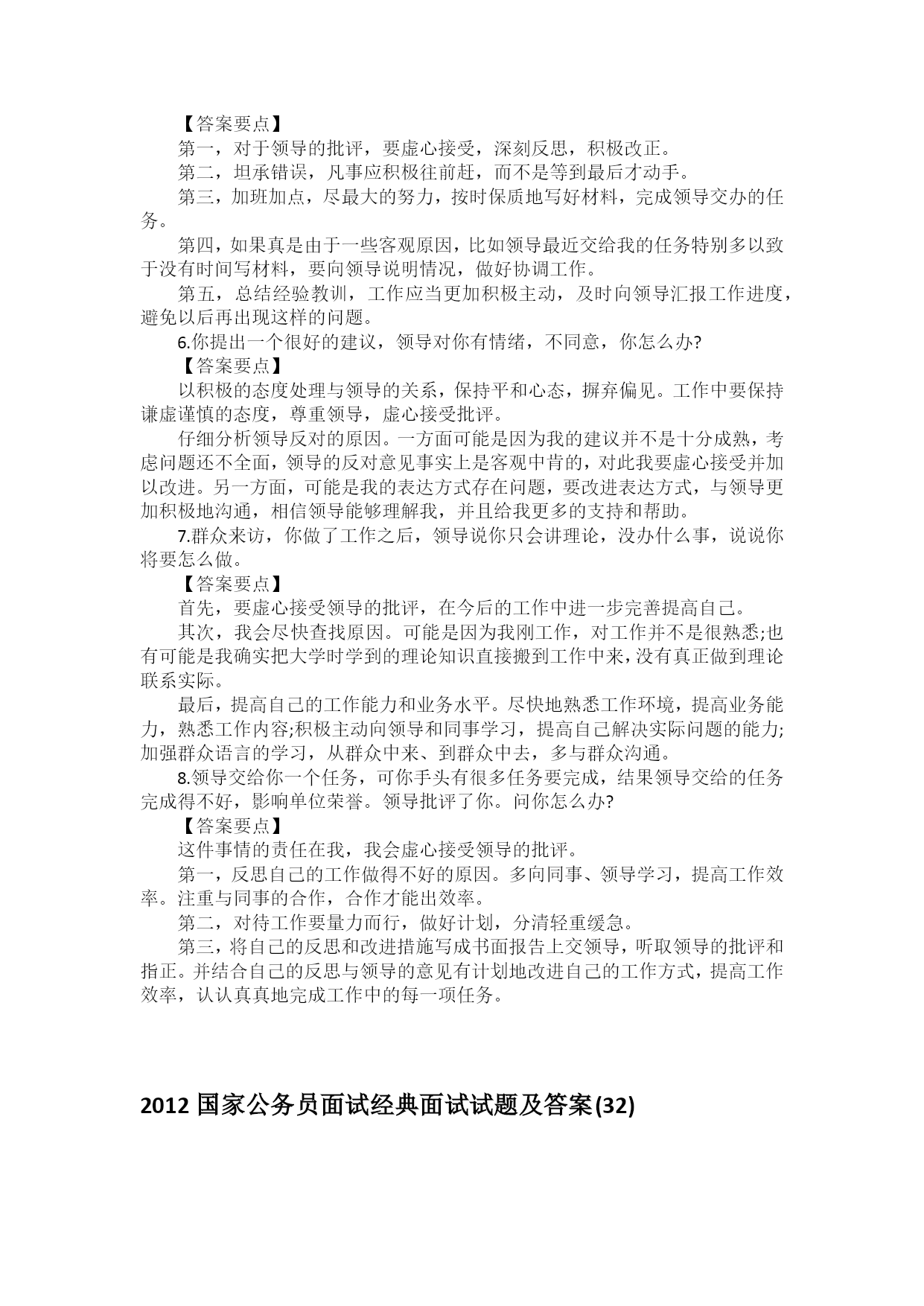 2012国家公务员面试经典真题:人际交往题型1.你单位事多人少,领导不断给你加任务,你不堪重负,加班加点也无法完成,被领导多次批评,你该怎么办?【答案要点】首先,面对领导的批评我会虚心接受。领导批评我,是我存在不足,是对我严格要求。我会加强和领导的沟通交流,找出问题并努力改正。其次,认真反思、检查自己过去的工作。自己的工作效率低,那么要提高自己的工作能力和业务素质,在工作中不断充实自己。通过努力,仍不能按时完成,主动跟领导沟通,重新安排分配任务,或找其他同事帮我分担一些,保证工作的完成。今后的工作中,不断总结,不断学习,提高能力,更好地工作。2.如果你被录用,你除了自己的工作,领导还交给你其他的工作,有点超负荷,你如何与领导沟通?【答案要点】我要认真分析本职工作与领导额外加的工作是否发生冲突,分清轻重,妥善处理。若无冲突,则尽力而为,做好额外工作;若能力不及,工作重要,与领导沟通交流,保证工作质量;若有冲突,向领导说明实际情况,征求领导的建议。注意沟通方式,争取理解与支持。在以后的工作中,我一定会努力提高自身能力,丰富自己的经验,提高工作效率,同时积极认真地配合领导的工作。3.你新到一个单位,发现食堂的粮食浪费现象很严重,你和领导提这个问题,领导没有明确表态,你怎么办?【答案要点】我反映的问题,领导却没有表态,可能是因为我表达方式不恰当,没有让领导意识到问题的严重性;或是问题由来已久,难以解决;或是领导的工作繁忙,没来得及作出表态。我会根据原因去解决问题。如果我的话无说服力,我会先调查,分析粮食浪费原因,附上数据及书面报告,提出意见、建议。如果暂时没有很好的办法,耐心等待。如果我反映问题的方式方法不对,找合适时间与领导沟通,解释清楚,争取领导支持,解决问题。今后,身体力行,带动同事,从小范围到大范围突现节约的目标。4.某次你查阅案卷的时候,发现有个判决适用法律错误,而当时的主审法官现在是你领导,你怎么办?【答案要点】首先,从多角度论证此案件的情况,再次确认是否失误。其次,如果确实发现是领导审理的时候适用法律错误,我要仔细研究看这个错误对判决是否具有严重的或者决定性的影响,并根据情况选择在合适的时间、场合用合适的方式向领导说明这一情况。最后,我相信领导会理解我的做法,也会本着公平公正、为人民群众服好务的原则妥善处理此事。5.领导让你写一份会议材料,说是三个星期后用,但才过两个星期领导就向你要材料,而你没有写,领导批评了你,你怎么做?【答案要点】第一,对于领导的批评,要虚心接受,深刻反思,积极改正。第二,坦承错误,凡事应积极往前赶,而不是等到最后才动手。第三,加班加点,尽最大的努力,按时保质地写好材料,完成领导交办的任务。第四,如果真是由于一些客观原因,比如领导最近交给我的任务特别多以致于没有时间写材料,要向领导说明情况,做好协调工作。第五,总结经验教训,工作应当更加积极主动,及时向领导汇报工作进度,避免以后再出现这样的问题。6.你提出一个很好的建议,领导对你有情绪,不同意,你怎么办?【答案要点】以积极的态度处理与领导的关系,保持平和心态,摒弃偏见。工作中要保持谦虚谨慎的态度,尊重领导,虚心接受批评。仔细分析领导反对的原因。一方面可能是因为我的建议并不是十分成熟,考虑问题还不全面,领导的反对意见事实上是客观中肯的,对此我要虚心接受并加以改进。另一方面,可能是我的表达方式存在问题,要改进表达方式,与领导更加积极地沟通,相信领导能够理解我,并且给我更多的支持和帮助。7.群众来访,你做了工作之后,领导说你只会讲理论,没办什么事,说说你将要怎么做。【答案要点】首先,要虚心接受领导的批评,在今后的工作中进一步完善提高自己。其次,我会尽快查找原因。可能是因为我刚工作,对工作并不是很熟悉;也有可能是我确实把大学时学到的理论知识直接搬到工作中来,没有真正做到理论联系实际。最后,提高自己的工作能力和业务水平。尽快地熟悉工作环境,提高业务能力,熟悉工作内容;积极主动向领导和同事学习,提高自己解决实际问题的能力;加强群众语言的学习,从群众中来、到群众中去,多与群众沟通。8.领导交给你一个任务,可你手头有很多任务要完成,结果领导交给的任务完成得不好,影响单位荣誉。领导批评了你。问你怎么办?【答案要点】这件事情的责任在我,我会虚心接受领导的批评。第一,反思自己的工作做得不好的原因。多向同事、领导学习,提高工作效率。注重与同事的合作,合作才能出效率。第二,对待工作要量力而行,做好计划,分清轻重缓急。第三,将自己的反思和改进措施写成书面报告上交领导,听取领导的批评和指正。并结合自己的反思与领导的意见有计划地改进自己的工作方式,提高工作效率,认认真真地完成工作中的每一项任务。