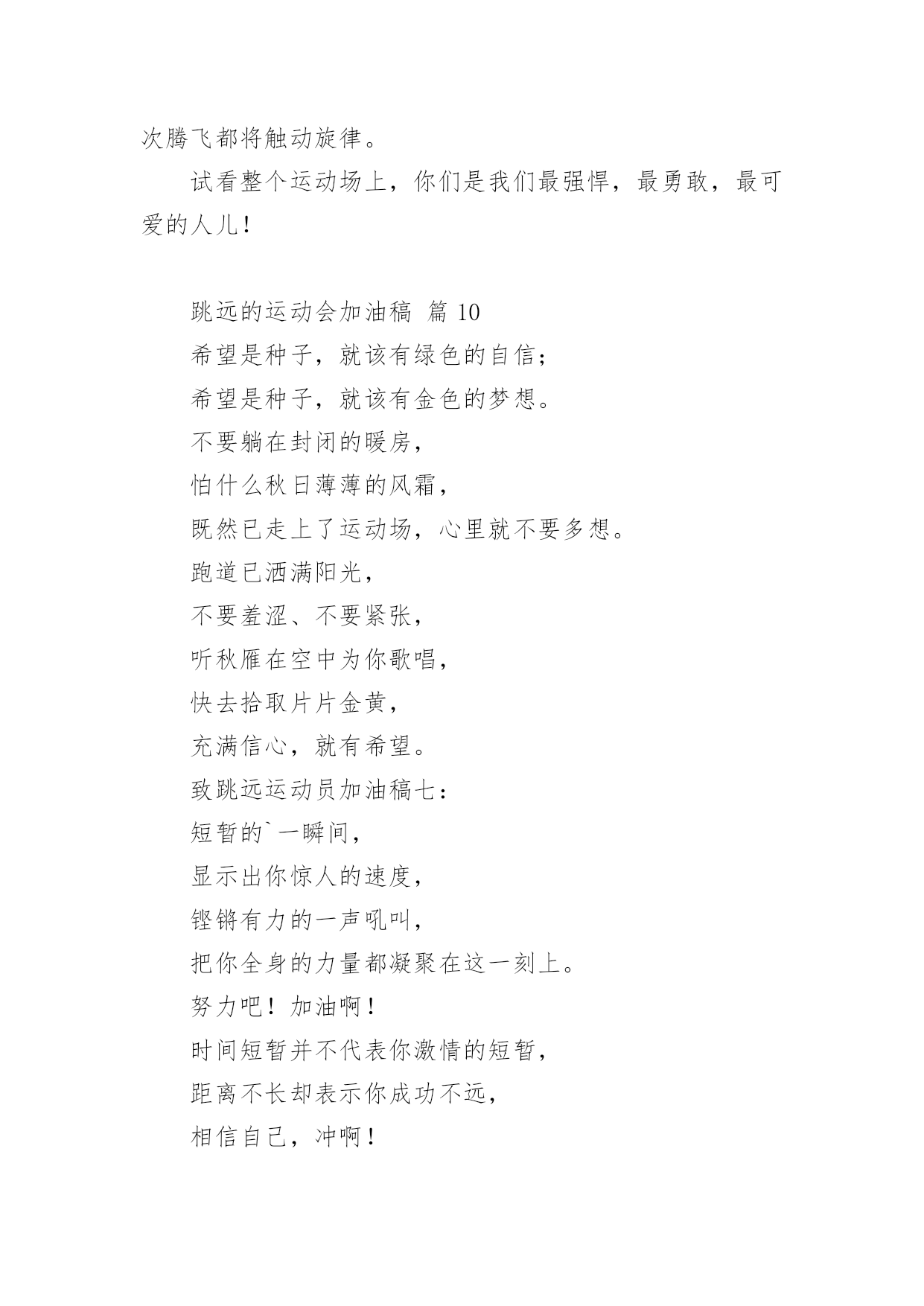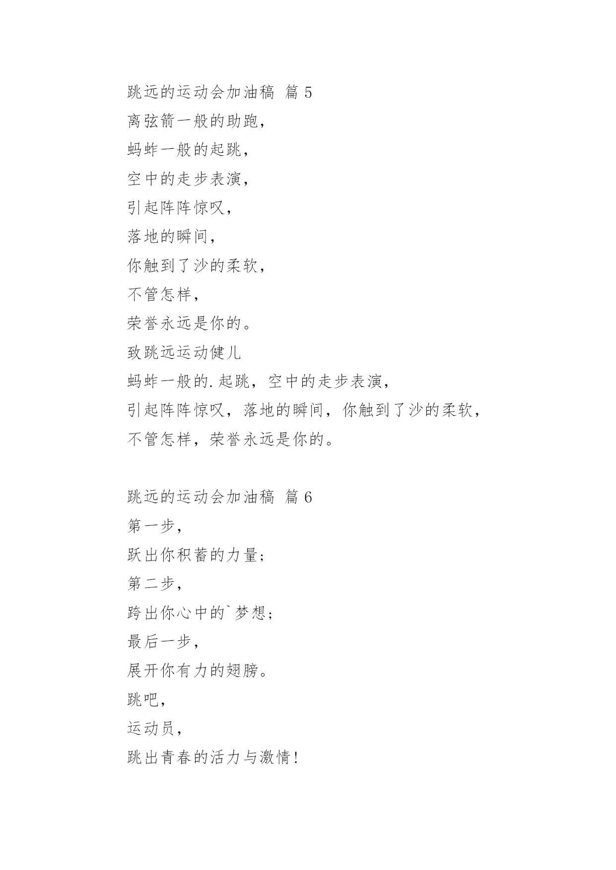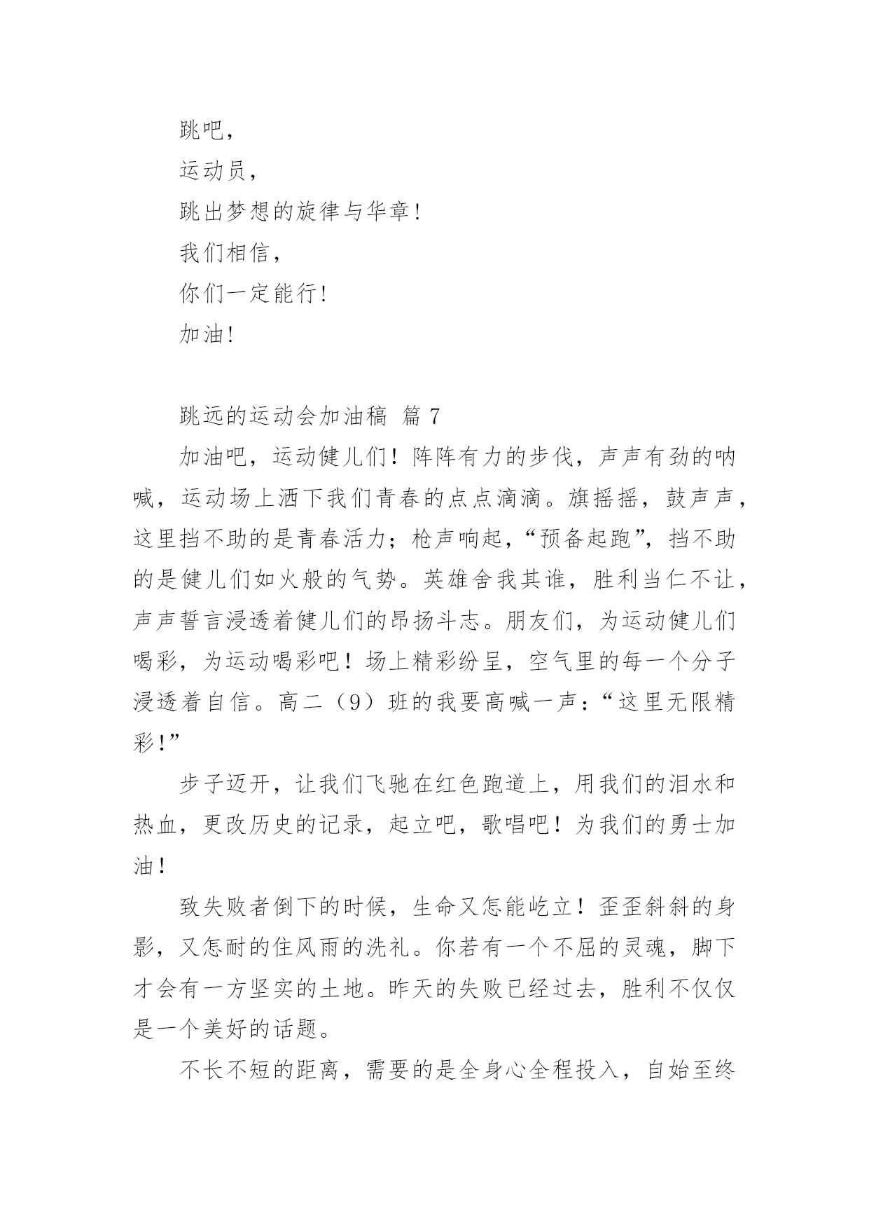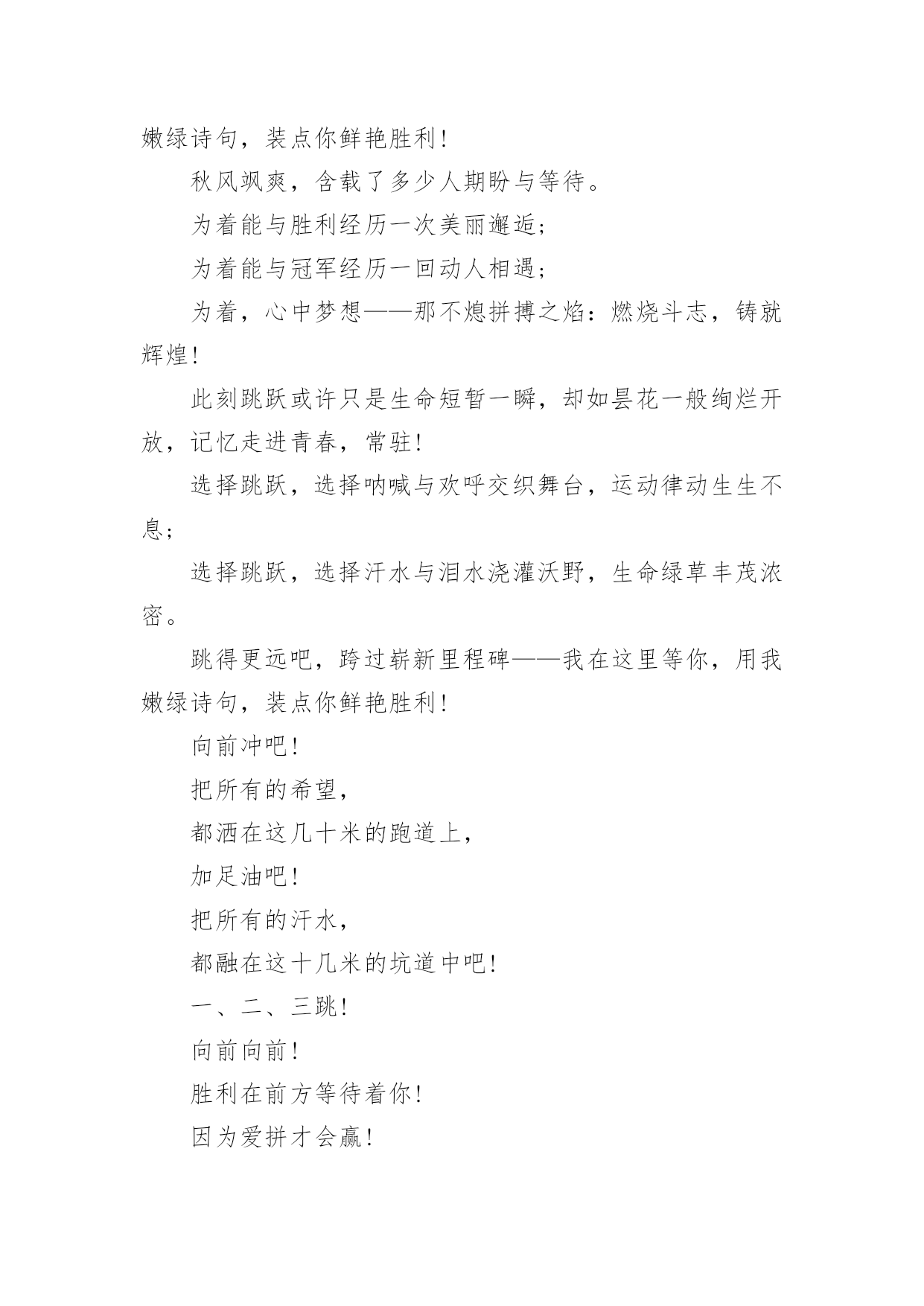 跳远的运动会加油稿关于跳远的运动会加油稿(精选14篇)随着社会不断地进步,越来越多地方需要用到加油稿,加油稿是一种对他人有正向激励作用的文稿。你所见过的加油稿是什么样的呢?下面是小编为大家收集的关于跳远的运动会加油稿,欢迎大家分享。跳远的运动会加油稿篇1当沙坑就要等你去征服的那一瞬间;时间停止,空气凝固,每一个人的嘴里、心里,都在竭力呐喊。这呐喊,成为这瞬间,最激动人心的呼声,最振奋人心的感动,相信自己,星光照耀下的是成功的喜悦,黯然退却的.是失败的痛楚,挥之不去的是自责的泪水,垂首洒落的是一点一滴的心酸,就让一切在风中熏干,褪去的是灰暗的记忆,回复的依然是——灿烂的理想。相信自己,天空中飞翔仍旧是无法挥去的期盼,健步腾飞,冲向终点之路不再遥远;英姿飒爽,诚挚欢呼之声因你嘹亮;奋勇冲刺,宽阔天空之美更加湛蓝。运动健儿们,我们为你欢呼,脚下红色的跑道是你驰骋的战场。每一个健美操步都倾泻激情,每一滴汗水都凝聚硕果,每一个动作都孕育完美。啊!激情澎湃,血液沸腾。释放心中积蓄的豪情,敞开钦慕的心扉,我们尽情欢呼。运动健将们,终点就在眼前,加油,加油!成功就在脚下。跳远的运动会加油稿篇2向前冲吧把所有的希望都洒在这几十米的跑道上加足油吧把所有的汗水都融在这十几米的`坑道中吧一二三跳!跳一阵有力的助跑后你腾空跃起顿时——然后——就会有个属于你的距离无论远近都是青春的风采无论胜负都是动人的旋律曲线——致跳高运动员你纵身一跃留下一条美丽的彩虹那七彩的色泽就是你灿烂的笑容也许那是一条完美的抛物线那均匀的尺度尽在你的把握之中或许,那是一条盘旋的DNA生命存在的意义被你细细描述跳远的运动会加油稿篇3第一步,跃出你积蓄的力量;第二步,跨出你心中的梦想;最后一步,展开你有力的翅膀。跳吧,运动员,跳出青春的活力与激情!跳吧,运动员,跳出梦想的.旋律与华章!我们相信,你们一定能行!加油!跳远的运动会加油稿篇4每一次腾空,都迸发出力量。每一次腾空,都孕育着成长。每一次腾空,都书写着激昂。让花季的心情挥洒一片绮丽的彩霞,让青春的理想谱写出一段美妙的'乐章。我们知道,你一直在拼搏,请你相信,撒一路汗水,将收获无尽希望。加油吧,运动员!!跳远的运动会加油稿篇5离弦箭一般的助跑,蚂蚱一般的起跳,空中的走步表演,引起阵阵惊叹,落地的瞬间,你触到了沙的柔软,不管怎样,荣誉永远是你的。致跳远运动健儿蚂蚱一般的.起跳,空中的走步表演,引起阵阵惊叹,落地的瞬间,你触到了沙的柔软,不管怎样,荣誉永远是你的。跳远的运动会加油稿篇6第一步,跃出你积蓄的力量;第二步,跨出你心中的`梦想;最后一步,展开你有力的翅膀。跳吧,运动员,跳出青春的活力与激情!跳吧,运动员,跳出梦想的旋律与华章!我们相信,你们一定能行!加油!跳远的运动会加油稿篇7加油吧,运动健儿们!阵阵有力的步伐,声声有劲的呐喊,运动场上洒下我们青春的点点滴滴。旗摇摇,鼓声声,这里挡不助的是青春活力;枪声响起,“预备起跑”,挡不助的是健儿们如火般的气势。英雄舍我其谁,胜利当仁不让,声声誓言浸透着健儿们的昂扬斗志。朋友们,为运动健儿们喝彩,为运动喝彩吧!场上精彩纷呈,空气里的每一个分子浸透着自信。高二(9)班的我要高喊一声:“这里无限精彩!”步子迈开,让我们飞驰在红色跑道上,用我们的泪水和热血,更改历史的记录,起立吧,歌唱吧!为我们的勇士加油!致失败者倒下的时候,生命又怎能屹立!歪歪斜斜的身影,又怎耐的住风雨的洗礼。你若有一个不屈的灵魂,脚下才会有一方坚实的土地。昨天的失败已经过去,胜利不仅仅是一个美好的话题。不长不短的距离,需要的是全身心全程投入,自始至终你们都在拼全力此时此刻,你们处在最风光的一刻,无论第几坚持胜利的信心,只要跑下来,你们就是英雄。青春的脚步,青春的速度,青春的活力,青春的激情,将会在你们的身上尽情体现。迎接自我,挑战自我,战胜自我!我们相信你们一定能行,加油吧,运动员!终点就在眼前!汗水,泪水;笑声,歌声;我们尽情挥洒。开幕式上,运动场上,我们尽情展现,多少艰辛,多少困苦,我们勇敢承担。因为年轻,因为张扬,因为我们知道:用今天的汗水换来明天的'微笑。每一次腾空,都迸发出力量。每一次腾空,都孕育着成长。每一次腾空,都书写着激昂。让花季的心情挥洒一片绮丽的彩霞,让青春的理想谱写出一段美妙的乐章。我们知道,你一直在拼搏,请你相信,撒一路汗水,将收获无尽希望。加油吧,运动员!!第一步,跃出你积蓄的力量;第二步,跨出你心中的梦想;最后一步,展开你有力的翅膀。跳吧,运动员,跳出青春的活力与激情!跳吧,运动员,跳出梦想的旋律与华章!我们相信,你们一定能行!!加油!!跳远的运动会加油稿篇8跳远,选择跳跃,选择汗水与泪水浇灌沃野,生命绿草丰茂浓密。跳得更远吧,跨过崭新里程碑——我在这里等你,用我嫩绿诗句,装点你鲜艳胜利!