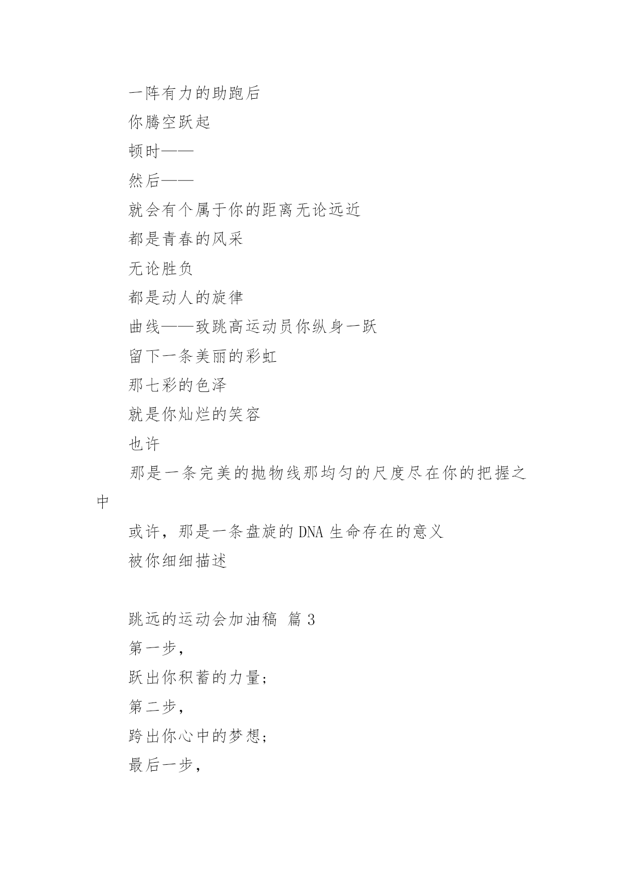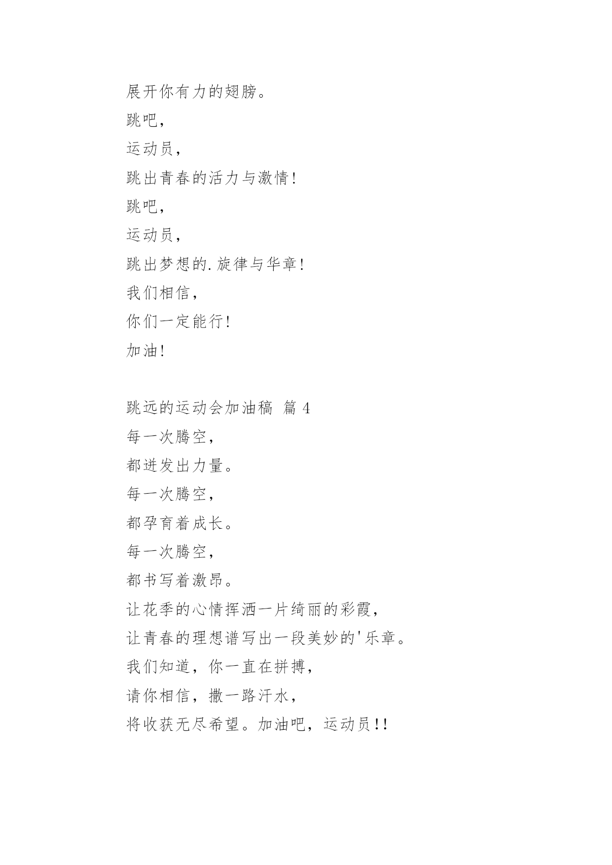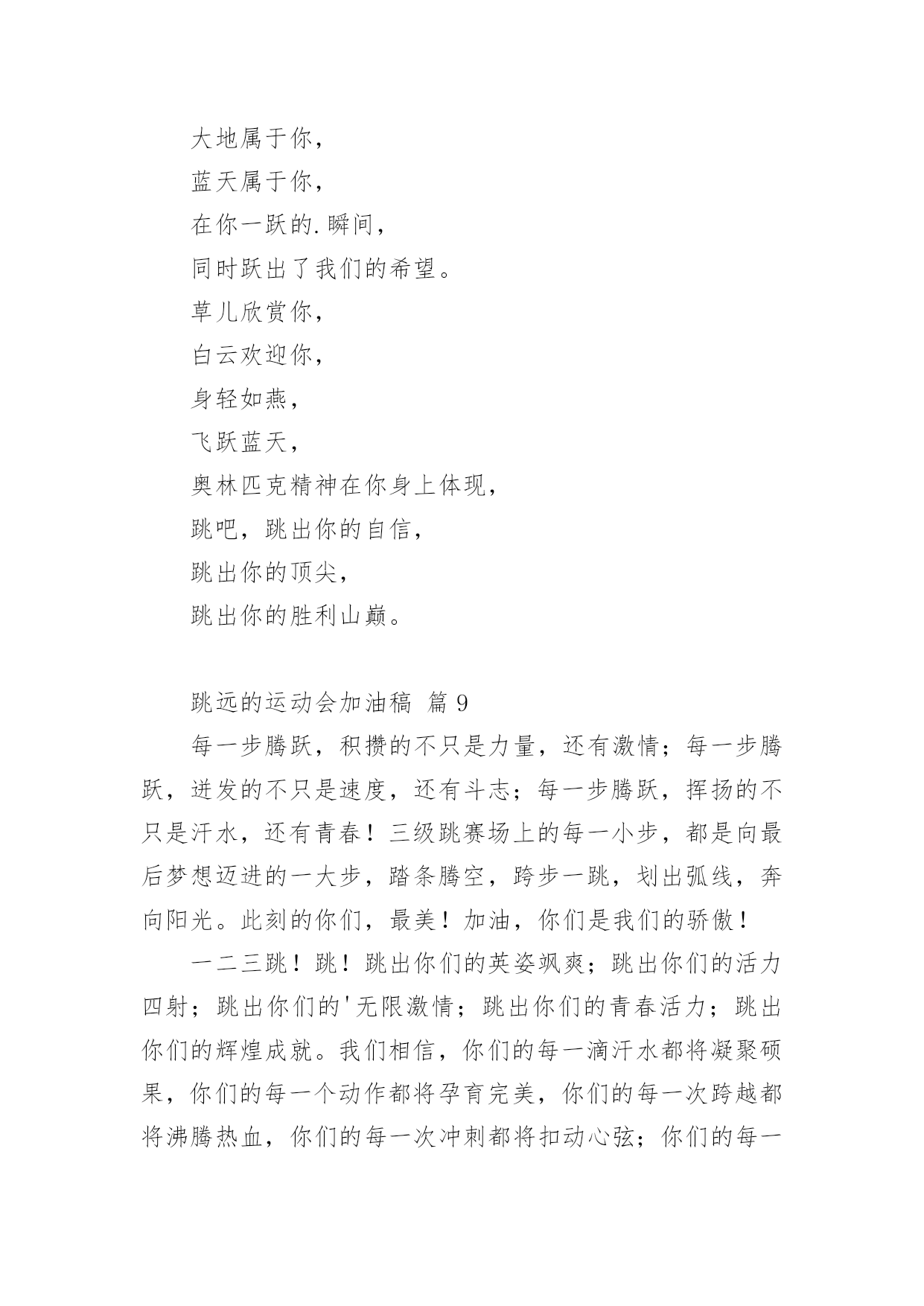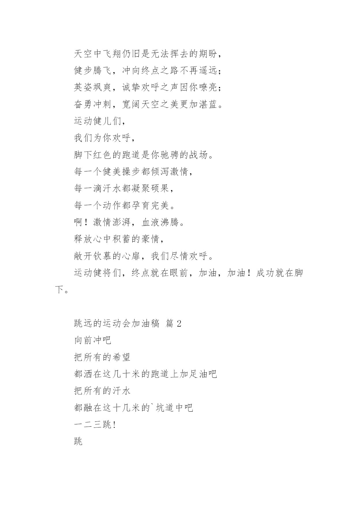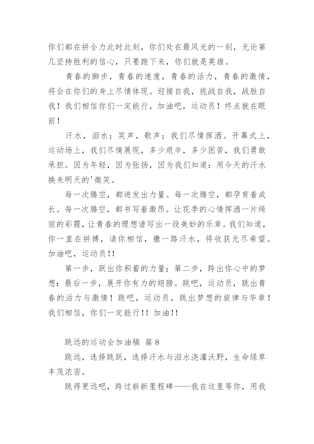 跳远的运动会加油稿关于跳远的运动会加油稿(精选14篇)随着社会不断地进步,越来越多地方需要用到加油稿,加油稿是一种对他人有正向激励作用的文稿。你所见过的加油稿是什么样的呢?下面是小编为大家收集的关于跳远的运动会加油稿,欢迎大家分享。跳远的运动会加油稿篇1当沙坑就要等你去征服的那一瞬间;时间停止,空气凝固,每一个人的嘴里、心里,都在竭力呐喊。这呐喊,成为这瞬间,最激动人心的呼声,最振奋人心的感动,相信自己,星光照耀下的是成功的喜悦,黯然退却的.是失败的痛楚,挥之不去的是自责的泪水,垂首洒落的是一点一滴的心酸,就让一切在风中熏干,褪去的是灰暗的记忆,回复的依然是——灿烂的理想。相信自己,天空中飞翔仍旧是无法挥去的期盼,健步腾飞,冲向终点之路不再遥远;英姿飒爽,诚挚欢呼之声因你嘹亮;奋勇冲刺,宽阔天空之美更加湛蓝。运动健儿们,我们为你欢呼,脚下红色的跑道是你驰骋的战场。每一个健美操步都倾泻激情,每一滴汗水都凝聚硕果,每一个动作都孕育完美。啊!激情澎湃,血液沸腾。释放心中积蓄的豪情,敞开钦慕的心扉,我们尽情欢呼。运动健将们,终点就在眼前,加油,加油!成功就在脚下。跳远的运动会加油稿篇2向前冲吧把所有的希望都洒在这几十米的跑道上加足油吧把所有的汗水都融在这十几米的`坑道中吧一二三跳!跳一阵有力的助跑后你腾空跃起顿时——然后——就会有个属于你的距离无论远近都是青春的风采无论胜负都是动人的旋律曲线——致跳高运动员你纵身一跃留下一条美丽的彩虹那七彩的色泽就是你灿烂的笑容也许那是一条完美的抛物线那均匀的尺度尽在你的把握之中或许,那是一条盘旋的DNA生命存在的意义被你细细描述跳远的运动会加油稿篇3第一步,跃出你积蓄的力量;第二步,跨出你心中的梦想;最后一步,展开你有力的翅膀。跳吧,运动员,跳出青春的活力与激情!跳吧,运动员,跳出梦想的.旋律与华章!我们相信,你们一定能行!加油!跳远的运动会加油稿篇4每一次腾空,都迸发出力量。每一次腾空,都孕育着成长。每一次腾空,都书写着激昂。让花季的心情挥洒一片绮丽的彩霞,让青春的理想谱写出一段美妙的'乐章。我们知道,你一直在拼搏,请你相信,撒一路汗水,将收获无尽希望。加油吧,运动员!!跳远的运动会加油稿篇5离弦箭一般的助跑,蚂蚱一般的起跳,空中的走步表演,引起阵阵惊叹,落地的瞬间,你触到了沙的柔软,不管怎样,荣誉永远是你的。致跳远运动健儿蚂蚱一般的.起跳,空中的走步表演,引起阵阵惊叹,落地的瞬间,你触到了沙的柔软,不管怎样,荣誉永远是你的。跳远的运动会加油稿篇6第一步,跃出你积蓄的力量;第二步,跨出你心中的`梦想;最后一步,展开你有力的翅膀。跳吧,运动员,跳出青春的活力与激情!跳吧,运动员,跳出梦想的旋律与华章!我们相信,你们一定能行!加油!跳远的运动会加油稿篇7加油吧,运动健儿们!阵阵有力的步伐,声声有劲的呐喊,运动场上洒下我们青春的点点滴滴。旗摇摇,鼓声声,这里挡不助的是青春活力;枪声响起,“预备起跑”,挡不助的是健儿们如火般的气势。英雄舍我其谁,胜利当仁不让,声声誓言浸透着健儿们的昂扬斗志。朋友们,为运动健儿们喝彩,为运动喝彩吧!场上精彩纷呈,空气里的每一个分子浸透着自信。高二(9)班的我要高喊一声:“这里无限精彩!”步子迈开,让我们飞驰在红色跑道上,用我们的泪水和热血,更改历史的记录,起立吧,歌唱吧!为我们的勇士加油!致失败者倒下的时候,生命又怎能屹立!歪歪斜斜的身影,又怎耐的住风雨的洗礼。你若有一个不屈的灵魂,脚下才会有一方坚实的土地。昨天的失败已经过去,胜利不仅仅是一个美好的话题。不长不短的距离,需要的是全身心全程投入,自始至终你们都在拼全力此时此刻,你们处在最风光的一刻,无论第几坚持胜利的信心,只要跑下来,你们就是英雄。青春的脚步,青春的速度,青春的活力,青春的激情,将会在你们的身上尽情体现。迎接自我,挑战自我,战胜自我!我们相信你们一定能行,加油吧,运动员!终点就在眼前!汗水,泪水;笑声,歌声;我们尽情挥洒。开幕式上,运动场上,我们尽情展现,多少艰辛,多少困苦,我们勇敢承担。因为年轻,因为张扬,因为我们知道:用今天的汗水换来明天的'微笑。每一次腾空,都迸发出力量。每一次腾空,都孕育着成长。每一次腾空,都书写着激昂。让花季的心情挥洒一片绮丽的彩霞,让青春的理想谱写出一段美妙的乐章。我们知道,你一直在拼搏,请你相信,撒一路汗水,将收获无尽希望。加油吧,运动员!!第一步,跃出你积蓄的力量;第二步,跨出你心中的梦想;最后一步,展开你有力的翅膀。跳吧,运动员,跳出青春的活力与激情!跳吧,运动员,跳出梦想的旋律与华章!我们相信,你们一定能行!!加油!!跳远的运动会加油稿篇8跳远,选择跳跃,选择汗水与泪水浇灌沃野,生命绿草丰茂浓密。跳得更远吧,跨过崭新里程碑——我在这里等你,用我嫩绿诗句,装点你鲜艳胜利!