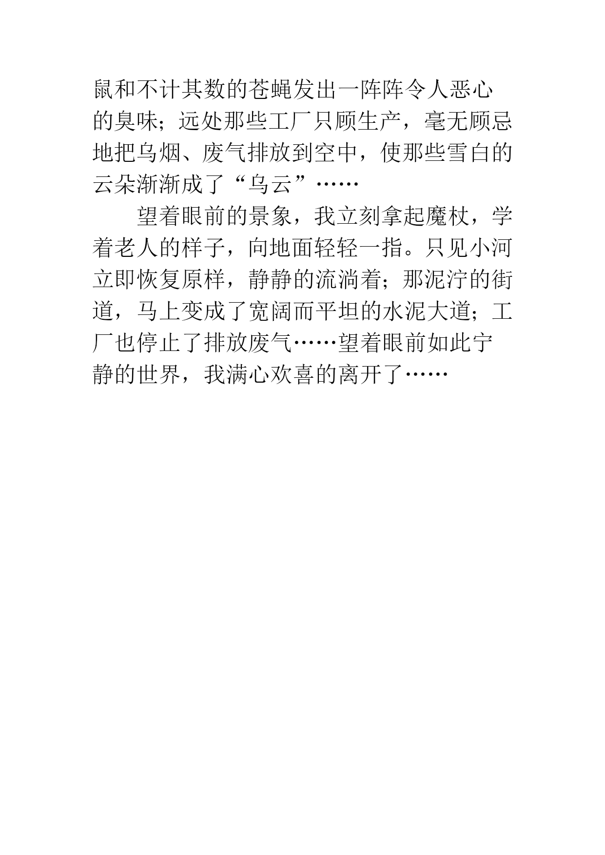 【环保作文】我想有只魔杖一个晴空万里的早晨,我还在同周爷爷谈天说地。忽然,一位老人出现在我面前,语重心长的对我说:“可可,你是未来的希望。我告诉你,地球已经遭到到严重破坏,你得尽快地救救他,不然后果不堪设想!”说完,便把他手中的拐杖转了一圈,嘴里念这谁也听不懂的咒语,然后轻轻地想我一指。霎时,我身上奇迹般的穿上了一件金衣,手里也出现了一只魔杖。平时总梦想着当巾帼英雄的我终于如愿以偿,觉得自己神气极了、帅极了。“好,老爷爷,我一定不辜负您的期望。”我胸有成竹的对老人说。老人听后,面带微笑的消失了。我飞到地球上空,俯视着被严重破坏了的地球,目瞪口呆:只见那“母亲河”以北废物堵塞的水泄不通,原来那清澈见底的河水不知被谁“下了毒药”,斯鱼成群;闹喧闹的街道成了泥泞小路;那一袋袋垃圾引来了一群群老鼠和不计其数的苍蝇发出一阵阵令人恶心的臭味;远处那些工厂只顾生产,毫无顾忌地把乌烟、废气排放到空中,使那些雪白的云朵渐渐成了“乌云”……望着眼前的景象,我立刻拿起魔杖,学着老人的样子,向地面轻轻一指。只见小河立即恢复原样,静静的流淌着;那泥泞的街道,马上变成了宽阔而平坦的水泥大道;工厂也停止了排放废气……望着眼前如此宁静的世界,我满心欢喜的离开了……