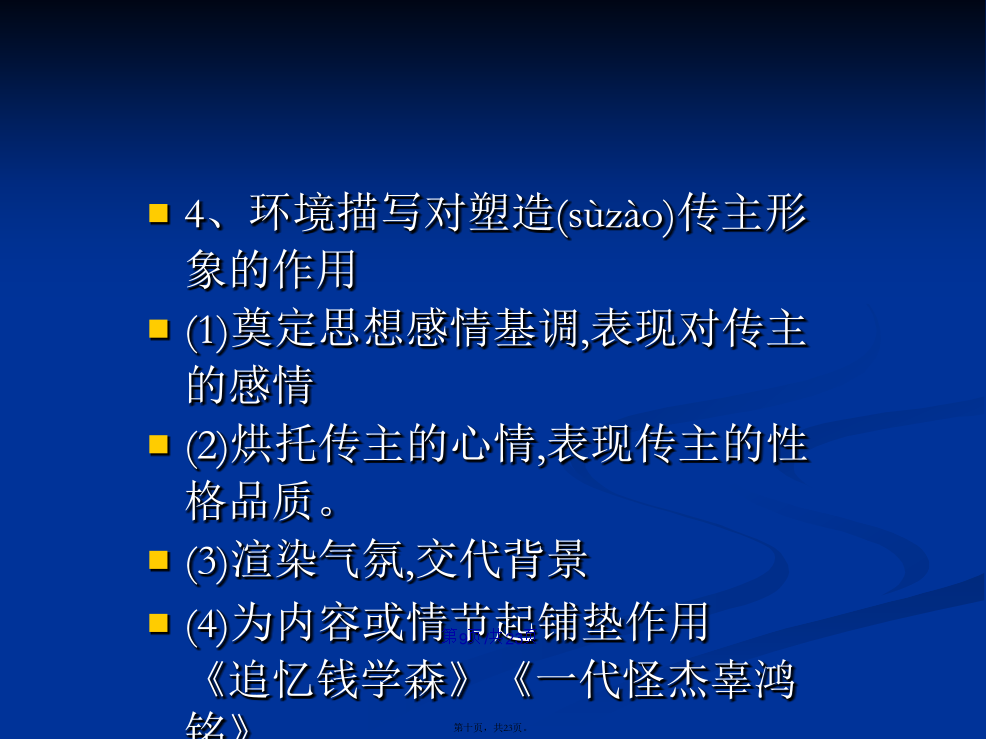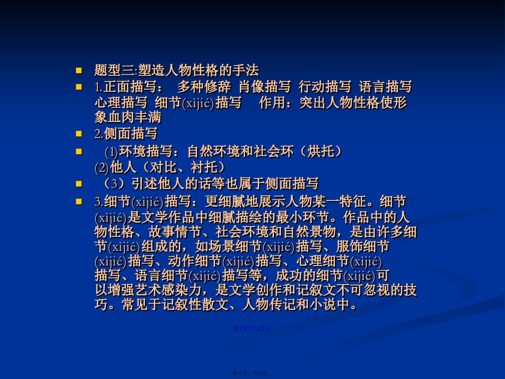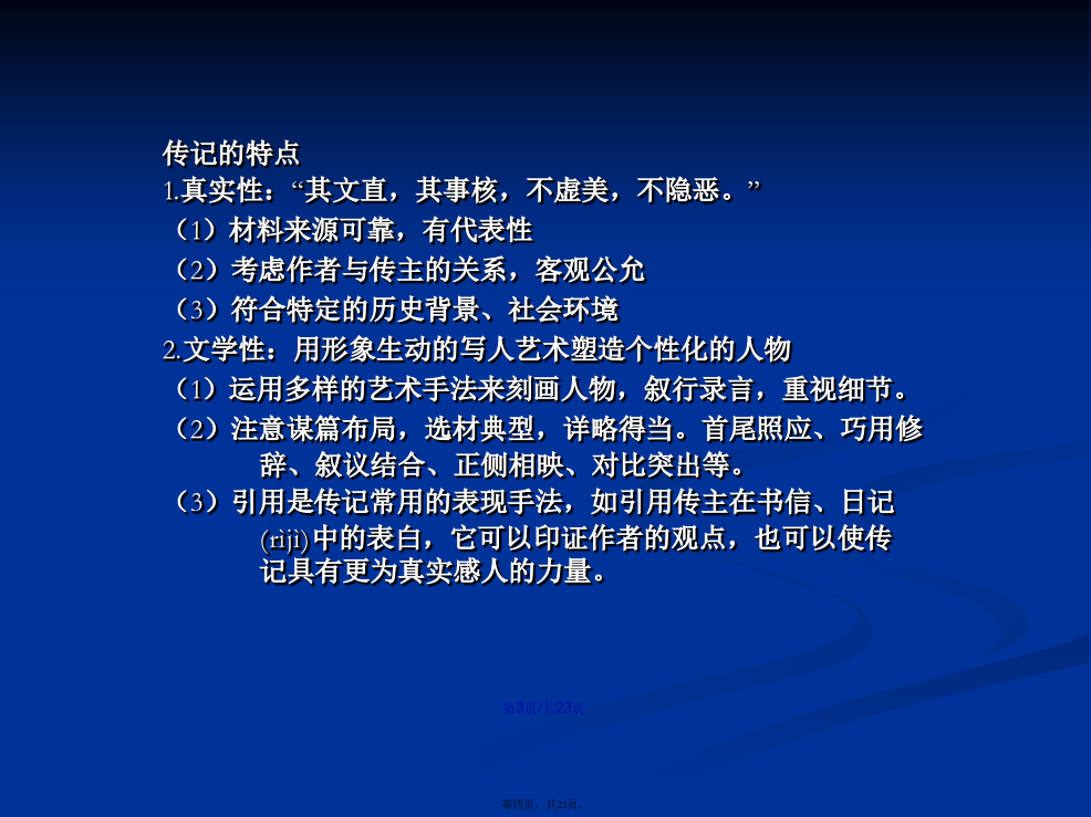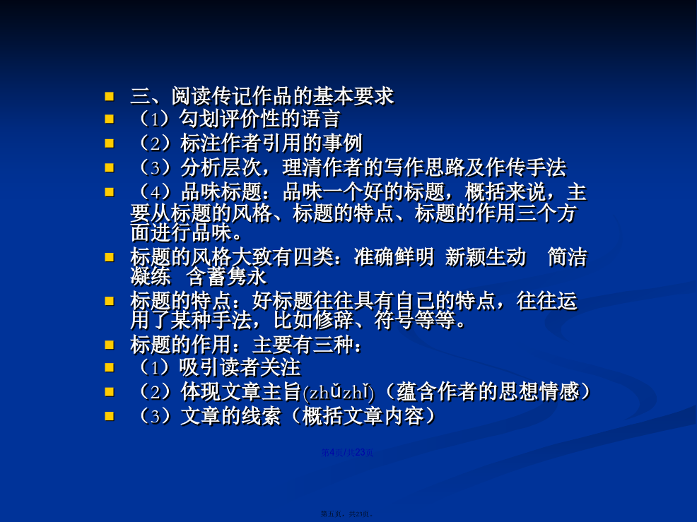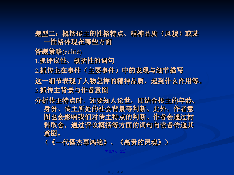 会计学《课程标准》对传记阅读的要求阅读古今中外的人物传记、回忆录等作品,能把握基本事实,了解传主的人生轨迹,从中获得有益的人生启示,并形成有一定(yīdìng)深度的思考和判断。传记种类及特征1.自传——自述人生经历,抒写人生感悟。语言或亲切自然或幽默调侃,以记叙为主,兼有描写、抒情。自传的特点——第一人称①作者即传主。②展现自我心智历练过程、人生历程、成败得失。2.他传——塑造人物形象,表现人物性格,评论人物思想、作用、地位。语言或朴实自然或文采斐然。他传的特点——第三人称。展现他人的思想性格、人生历程、成败得失。3.评传——记叙与议论(yìlùn)各半,注意整合评价议论(yìlùn)的文字。评传特点——第三人称①“传”思想轨迹、人生历程,“评”人品高下、成败得失。②传中有评,评中有传。不溢美,不隐恶,客观公正。传记的特点1.真实性:“其文直,其事核,不虚美,不隐恶。”(1)材料来源可靠,有代表性(2)考虑作者与传主的关系,客观公允(3)符合特定的历史背景、社会环境2.文学性:用形象生动的写人艺术塑造个性化的人物(1)运用多样的艺术手法来刻画人物,叙行录言,重视细节。(2)注意谋篇布局,选材典型,详略得当。首尾照应、巧用修辞、叙议结合、正侧相映、对比突出等。(3)引用是传记常用的表现手法,如引用传主在书信、日记(rìjì)中的表白,它可以印证作者的观点,也可以使传记具有更为真实感人的力量。三、阅读传记作品的基本要求(1)勾划评价性的语言(2)标注作者引用的事例(3)分析层次,理清作者的写作思路及作传手法(4)品味标题:品味一个好的标题,概括来说,主要从标题的风格、标题的特点、标题的作用三个方面进行品味。标题的风格大致有四类:准确鲜明新颖生动简洁凝练含蓄隽永标题的特点:好标题往往具有自己的特点,往往运用了某种手法,比如修辞、符号等等。标题的作用:主要有三种:(1)吸引读者关注(2)体现文章主旨(zhǔzhǐ)(蕴含作者的思想情感)(3)文章的线索(概括文章内容)四、积累人物传记的具体命题形式及应对策略题型一:概括传主人生阶段(人生经历),多侧重于筛选并整合文中的信息。答题策略:紧扣传主身份特点,留主删次切分人生阶段进行作答。答案(dáàn)可以用原文原句作答或在原文原句基础上整合而成。(《追忆钱学森:此生三事最关情》)题型二:概括传主的性格特点、精神品质(风貌)或某一性格体现在哪些方面答题策略(cèlüè)1.抓评议性、概括性的词句2.抓传主在事件(主要事件)中的表现与细节描写这一细节表现了人物怎样的精神品质,起到什么作用等。3.抓传主背景与作者意图分析传主特点时,还要知人论世,即结合传主的年龄、身份、传主所处的社会背景等判断。此外,作者意图也会影响我们对传主特点的判断。作者会通过材料取舍,通过评议概括等方面的词句向读者传递其意图。(《一代怪杰辜鸿铭》、《高贵的灵魂》)题型三:塑造人物性格的手法1.正面描写:多种修辞肖像描写行动描写语言描写心理描写细节(xìjié)描写作用:突出人物性格使形象血肉丰满2.侧面描写(1)环境描写:自然环境和社会环(烘托)(2)他人(对比、衬托)(3)引述他人的话等也属于侧面描写3.细节(xìjié)描写:更细腻地展示人物某一特征。细节(xìjié)是文学作品中细腻描绘的最小环节。作品中的人物性格、故事情节、社会环境和自然景物,是由许多细节(xìjié)组成的,如场景细节(xìjié)描写、服饰细节(xìjié)描写、动作细节(xìjié)描写、心理细节(xìjié)描写、语言细节(xìjié)描写等,成功的细节(xìjié)可以增强艺术感染力,是文学创作和记叙文不可忽视的技巧。常见于记叙性散文、人物传记和小说中。细节描写作用(1)突出人物的性格。生动的细节描写,使人物个性丰满、鲜明。(传记、小说等都适用)(2)深化主题,有力地表达中心。(传记、小说等都适用)(3)推动(tuīdòng)故事情节的发展。(小说适用)(4)真实性。(传记适用)(5)自然景物、环境的细节描写除了营造典型环境之外,还起到象征社会环境、烘托人物心情作用。(散文、传记、小说、诗歌等适用)4、环境描写对塑造(sùzào)传主形象的作用(1)奠定思想感情基调,表现对传主的感情(2)烘托传主的心情,表现传主的性格品质。(3)渲染气氛,交代背景(4)为内容或情节起铺垫作用《追忆钱学森》《一代怪杰辜鸿铭》5、运用选材(详略得当、以小见大、点面结合、虚实结合等)来塑造(sùzào)传主形象题型四:概括传主在某方面作为的原因注意:可从内因、外因,主要原因、次要(cìyào)原因等角度作答。《追忆钱学森》《下不觉师造化》题型五:传