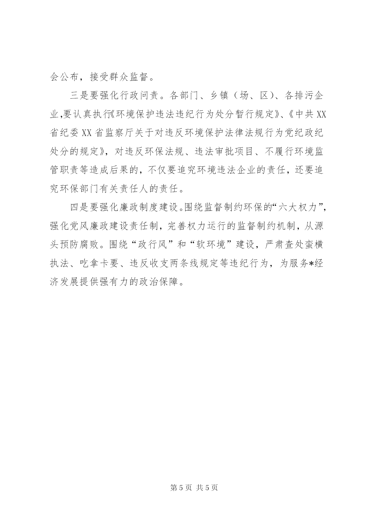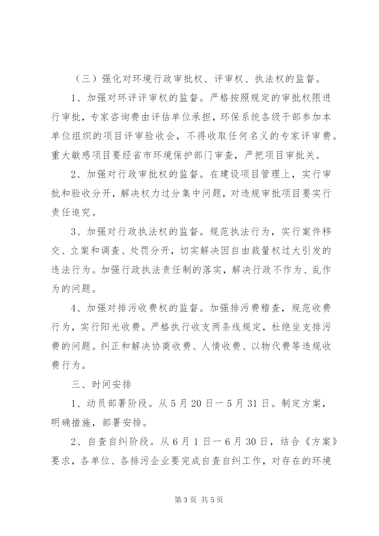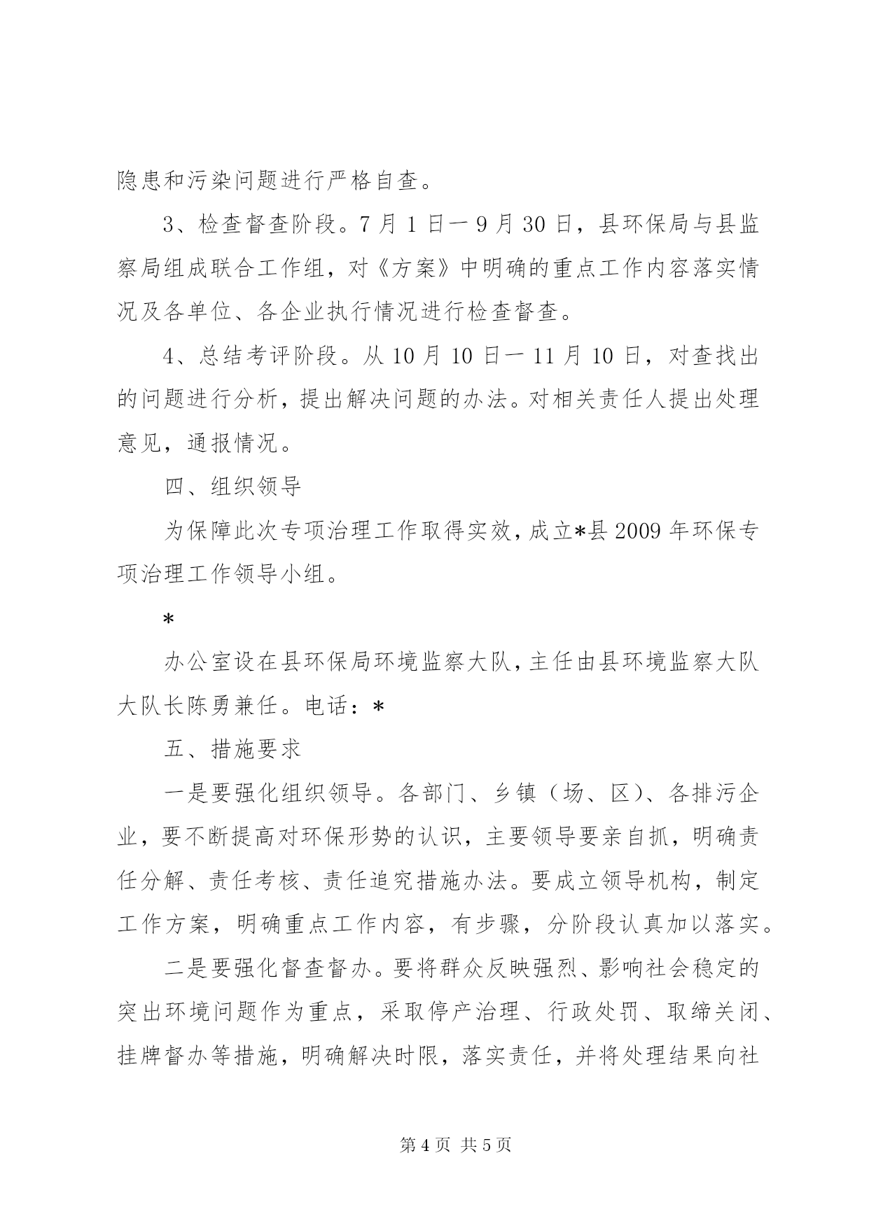 第PAGE\*Arabic\*MERGEFORMAT5页共NUMPAGES\*MERGEFORMAT5页环保专项治理工作方案一、指导思想以科学发展观为统领,按照省纪委九届四次全会的部署和要求,以污染防治为中心,以污染防治为主线,严格建设项目审批,积极推进环境保护工作的落实,突出抓好党风廉政建设责任制落实情况的检查考核,促进省委省政府《关于加强环境保护促进科学发展的意见》全面贯彻落实,为完成环境保护各项任务提供有力的政治保障。二、主要任务(一)开展对环境保护政策落实情况的检查,严肃查处违反国家环境保护法律法规的行为,集中整治饮用水源地环境违法违规等突出问题。一是加大对违法排污企业的打击力度。加强对造纸、酿造、制药、印染、化工、规模化畜禽养殖等重点污染行业污染治理设施运行的监管,加强对市控重点污染源的监管。通过采取行政处罚、停产治理、挂牌督办等手段,严厉查处偷排和超标排放等行为,集中解决群众反映强烈的突出环境违法问题。二是对饮用水源地环境违法开展集中整治。重点对饮用水源保护区排污口的取缔情况以及2000年以来新(改、扩)建项目情况进行回头看,防止死灰复燃。确保保护区内无新(改、扩)建排放污染物的项目。三是开展建设项目环评审批执法检查。着力查处2008年以来环保部门在建设项目环评审批中是否存在违法审批、越权审批和错误审批等问题。四是组织开展自然保护区执法检查。主要是对我县腰井子羊草草原省级自然保护区,在项目审批、资源开发、保护区管理等方面是否存在环境违法行为进行检查。(二)加强对污染减排工作的监督检查。全面落实政府污染减排责任书有关任务要求,明确2009年污染减排的目标任务、管理机制、措施落实,对全县污染减排项目全过程跟踪掌握。一是积极推进结构减排。加强各相关部门的协调配合,严格执行国家的产业政策,将关停淘汰工作切实落实到位。二是积极推进工程减排。加快推进城市污水处理垃圾管网、垃圾处理场、医疗废物处理等环境基础设施建设,尽快形成减排能力,为减排提供支持。三是积极推进管理减排。加强对重点减排工程、重点污染源及在线监测设备运行的管理,对超标排污企业采取限产限排、停产整治直至关闭等强制措施,确保治污设施稳定运行,达标排放,切实发挥减排效益。对全县扩大内需、促进经济增长项目执行减排政策情况进行检查,防止和纠正违规审批,特别是借机上高能耗、高污染项目的问题。对各重点企业减排年度任务完成情况进行检查,强化目标责任,督促整改落实。要加大环保案件查处力度,健全举报投诉处理和环保案件移送制度,严肃查处违反国家环境保护法律法规的案件。(三)强化对环境行政审批权、评审权、执法权的监督。1、加强对环评评审权的监督。严格按照规定的审批权限进行审批,专家咨询费由评估单位承担,环保系统各级干部参加本单位组织的项目评审验收会,不得收取任何名义的专家评审费。重大敏感项目要经省市环境保护部门审查,严把项目审批关。2、加强对行政审批权的监督。在建设项目管理上,实行审批和验收分开,解决权力过分集中问题,对违规审批项目要实行责任追究。3、加强对行政执法权的监督。规范执法行为,实行案件移交、立案和调查、处罚分开,切实解决因自由裁量权过大引发的违法行为。加强行政执法责任制的落实,解决行政不作为、乱作为的问题。4、加强对排污收费权的监督。加强排污费稽查,规范收费行为,实行阳光收费。严格执行收支两条线规定,杜绝坐支排污费的问题。纠正和解决协商收费、人情收费、以物代费等违规收费行为。三、时间安排1、动员部署阶段。从5月20日一5月31日。制定方案,明确措施,部署安排。2、自查自纠阶段。从6月1日一6月30日,结合《方案》要求,各单位、各排污企业要完成自查自纠工作,对存在的环境隐患和污染问题进行严格自查。3、检查督查阶段。7月1日一9月30日,县环保局与县监察局组成联合工作组,对《方案》中明确的重点工作内容落实情况及各单位、各企业执行情况进行检查督查。4、总结考评阶段。从10月10日一11月10日,对查找出的问题进行分析,提出解决问题的办法。对相关责任人提出处理意见,通报情况。四、组织领导为保障此次专项治理工作取得实效,成立*县2009年环保专项治理工作领导小组。*办公室设在县环保局环境监察大队,主任由县环境监察大队大队长陈勇兼任。电话:*五、措施要求一是要强化组织领导。各部门、乡镇(场、区)、各排污企业,要不断提高对环保形势的认识,主要领导要亲自抓,明确责任分解、责任考核、责任追究措施办法。要成立领导机构,制定工作方案,明确重点工作内容,有步骤,分阶段认真加以落实。二是要强化督查督办。要将群众反映强烈、影响社会稳定的突出环境问题作为重点,采取停产治理、行政处罚、取缔关闭、挂牌督办等措施,明确解决时限,落实责任,并将处理结果向社会公布,接受群众监督。三是要强化