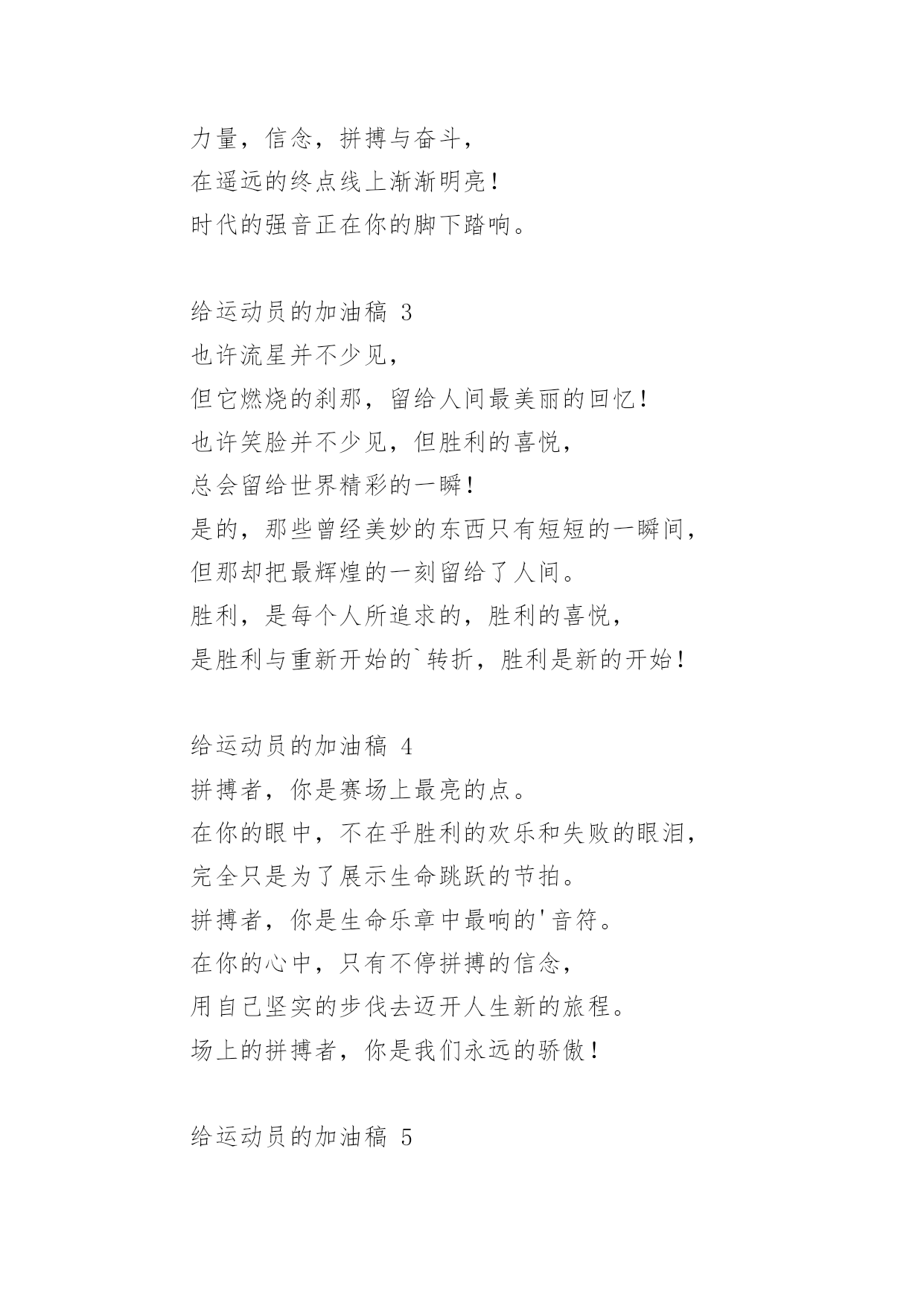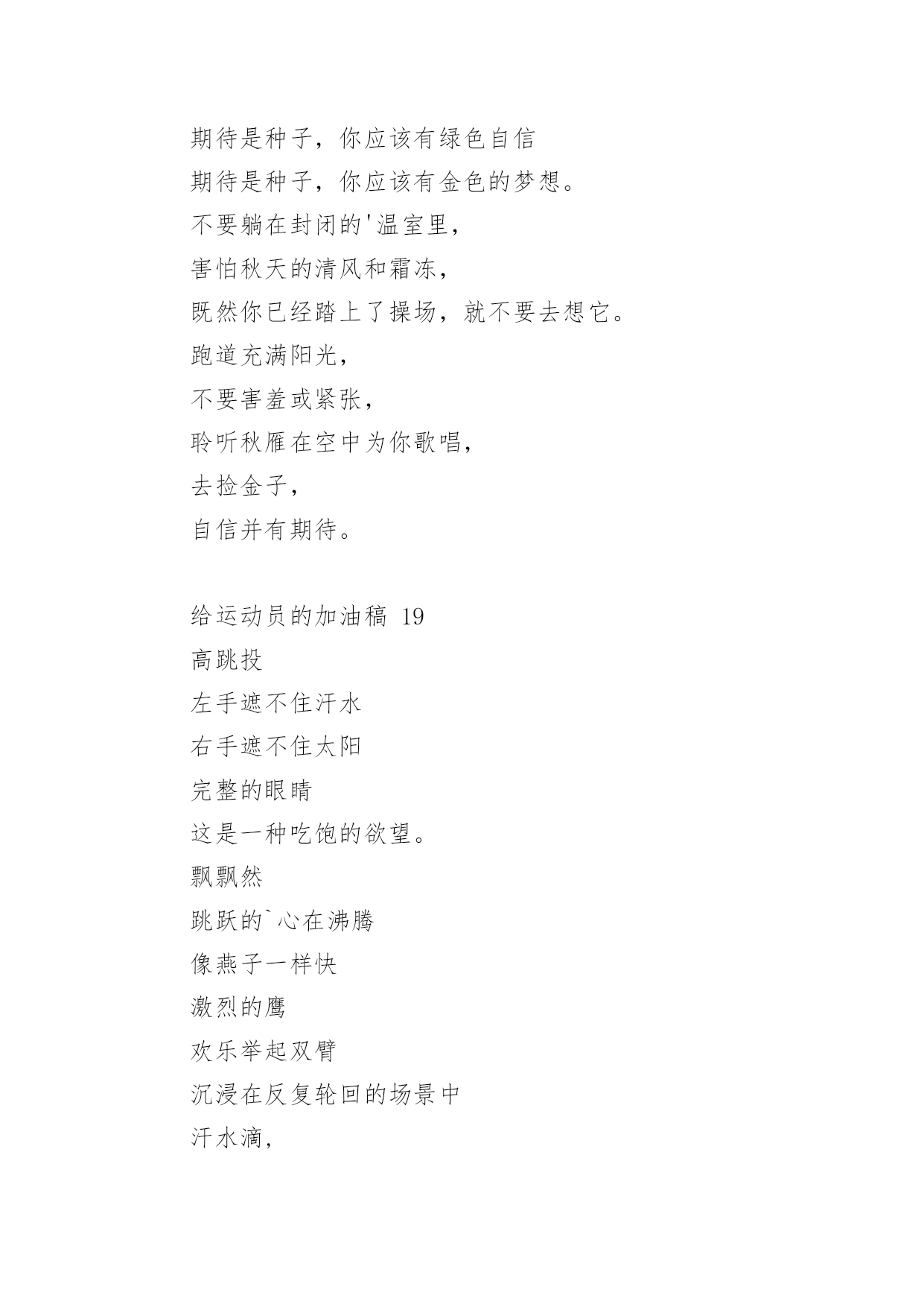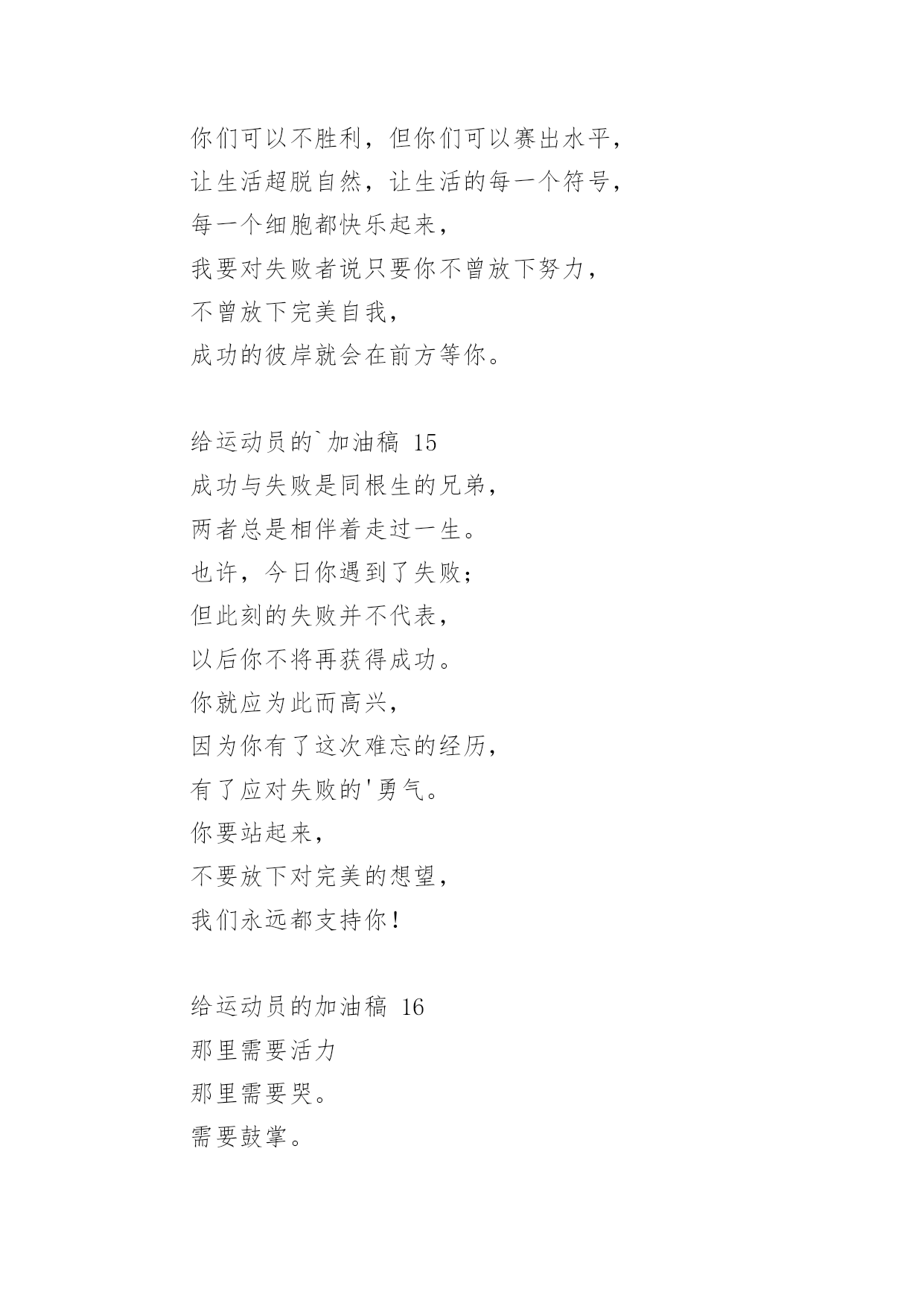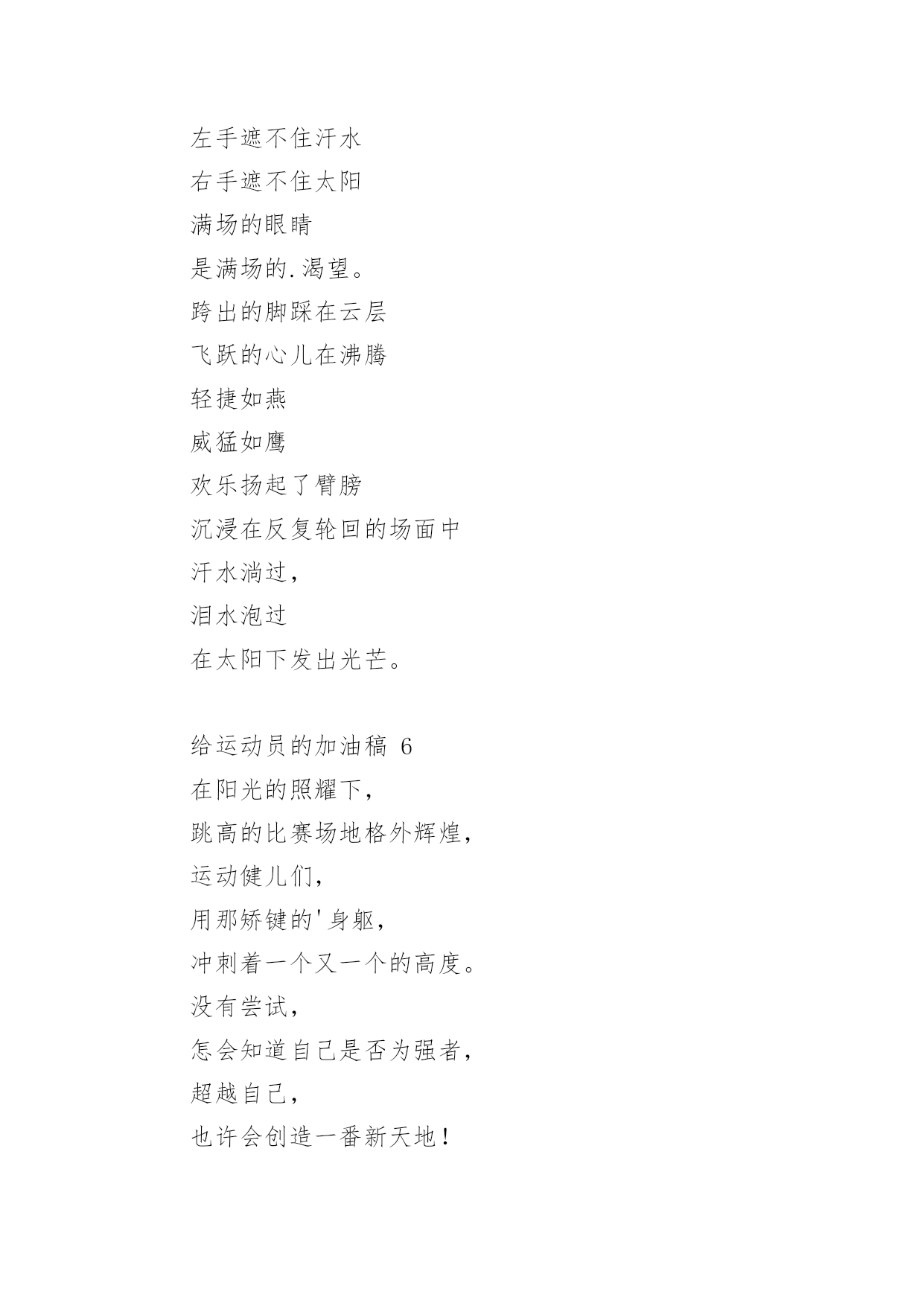 给运动员的加油稿给运动员的加油稿(通用21篇)在快速变化和不断变革的今天,很多情况下我们需要用到加油稿,加油稿是鼓励激励对方的文稿。怎么写加油稿才能避免踩雷呢?以下是小编精心整理的给运动员的加油稿,仅供参考,欢迎大家阅读。给运动员的加油稿1站在跳远板处,你突然发力向前跳出,啊,那动作教人快乐无比,无法自控随着双脚着地,一道美丽的“彩虹”产生了这是成功后的嬉乐这是爱的奉献给运动员的`加油稿2你是运动场的心脏,跳动梦想;你是漫长路的.精神,激励辉煌;你们是将上下求索的人!风为你加油,云为你助兴,坚定,执着,耐力与希望,在延伸的白色跑道中点点凝聚!力量,信念,拼搏与奋斗,在遥远的终点线上渐渐明亮!时代的强音正在你的脚下踏响。给运动员的加油稿3也许流星并不少见,但它燃烧的刹那,留给人间最美丽的回忆!也许笑脸并不少见,但胜利的喜悦,总会留给世界精彩的一瞬!是的,那些曾经美妙的东西只有短短的一瞬间,但那却把最辉煌的一刻留给了人间。胜利,是每个人所追求的,胜利的喜悦,是胜利与重新开始的`转折,胜利是新的开始!给运动员的加油稿4拼搏者,你是赛场上最亮的点。在你的眼中,不在乎胜利的欢乐和失败的眼泪,完全只是为了展示生命跳跃的节拍。拼搏者,你是生命乐章中最响的'音符。在你的心中,只有不停拼搏的信念,用自己坚实的步伐去迈开人生新的旅程。场上的拼搏者,你是我们永远的骄傲!给运动员的加油稿5左手遮不住汗水右手遮不住太阳满场的眼睛是满场的.渴望。跨出的脚踩在云层飞跃的心儿在沸腾轻捷如燕威猛如鹰欢乐扬起了臂膀沉浸在反复轮回的场面中汗水淌过,泪水泡过在太阳下发出光芒。给运动员的加油稿6在阳光的照耀下,跳高的比赛场地格外辉煌,运动健儿们,用那矫键的'身躯,冲刺着一个又一个的高度。没有尝试,怎会知道自己是否为强者,超越自己,也许会创造一番新天地!运动健儿们加油吧,去创造一份份奇奇迹,去创造一份份惊喜!给运动员的加油稿7你纵身一跃留下一条美丽的彩虹那七彩的色泽就是你灿烂的笑容也许那是一条完美的抛物线那均匀的尺度尽在你的把握之中或许,那是一条盘旋的.DNA生命存在的意义被你细细描述给运动员的加油稿8左手遮不住汗水右手遮不住太阳满场的眼睛是满场的渴望。跨出的脚踩在云层飞跃的心儿在沸腾轻捷如燕,威猛如鹰,欢乐扬起了臂膀沉浸在反复轮回的.场面中汗水淌过,泪水泡过,在太阳下发出光芒。给运动员的加油稿9在步伐优美的助跑后,一跃,身体在空中划出一道弧线,迅速沉身,收脚。过。真是优美的`跳高姿势。每一次,都是挑战,是超越。为了每一次超越喝彩。给运动员的加油稿10不管怎样,荣誉永远属于你。大地属于你,蓝天属于你,在你一跃的瞬间,同时跃出了我们的'希望。草儿欣赏你,白云欢迎你,身轻如燕,飞跃蓝天,奥林匹克精神在你身上体现,跳吧,跳出你的自信,跳出你的顶尖,跳出你的胜利山颠。给运动员的加油稿11你是运动场的心脏,跳动梦想;你是漫长路的精神,激励辉煌;你们是将上下求索的人!风为你加油,云为你助兴,坚定,执着,耐力与希望,在延伸的白色跑道中点点凝聚!力量,信念,拼搏与奋斗,在遥远的'终点线上渐渐明亮!时代的强音正在你的脚下踏响。给运动员的加油稿12在阳光下,跳高比赛场地非常精彩。体育运动员,有了那个校正键的.身体,冲刺一个又一个高度。没有尝试。你怎么知道你是一个坚强的人?超越自己,也许它会创造一个新世界。加油,运动员。创造奇迹,创造惊喜!给运动员的加油稿13短暂的一瞬间,显示出你惊人的速度,铿锵有力的`一声吼叫,把你全身的力量都凝聚在这一刻。努力吧!加油啊!时间短暂并不代表你激情的短暂,距离不长表示你离成功不远了,相信自己,冲啊!胜利就在眼前,失去不会再现!给运动员的加油稿14你们可以不美丽,但你们可以健康;你们可以不伟大,但你们可以庄重,你们可以不永恒,但你们可以真诚,你们可以不胜利,但你们可以赛出水平,让生活超脱自然,让生活的每一个符号,每一个细胞都快乐起来,我要对失败者说只要你不曾放下努力,不曾放下完美自我,成功的彼岸就会在前方等你。给运动员的`加油稿15成功与失败是同根生的兄弟,两者总是相伴着走过一生。也许,今日你遇到了失败;但此刻的失败并不代表,以后你不将再获得成功。你就应为此而高兴,因为你有了这次难忘的经历,有了应对失败的'勇气。你要站起来,不要放下对完美的想望,我们永远都支持你!给运动员的加油稿16那里需要活力那里需要哭。需要鼓掌。在升空的时候,我们为你鼓掌,祝贺你。当你失败的时候,我们也为你鼓掌,为你骄傲。当我再次想起掌声的时候,你们已经站在起跑线上了。朋友,往前冲!我们在为你鼓掌。给运动员的'加油稿17对掌声的诠释,不是故意征服,只有辛勤的汗水变成了追求的脚步,心中坚定的信念。脚下平静的步伐,你用行动诉说着不变的真理,没有比脚更长的路,没有比人更高的`山,希望在终点向