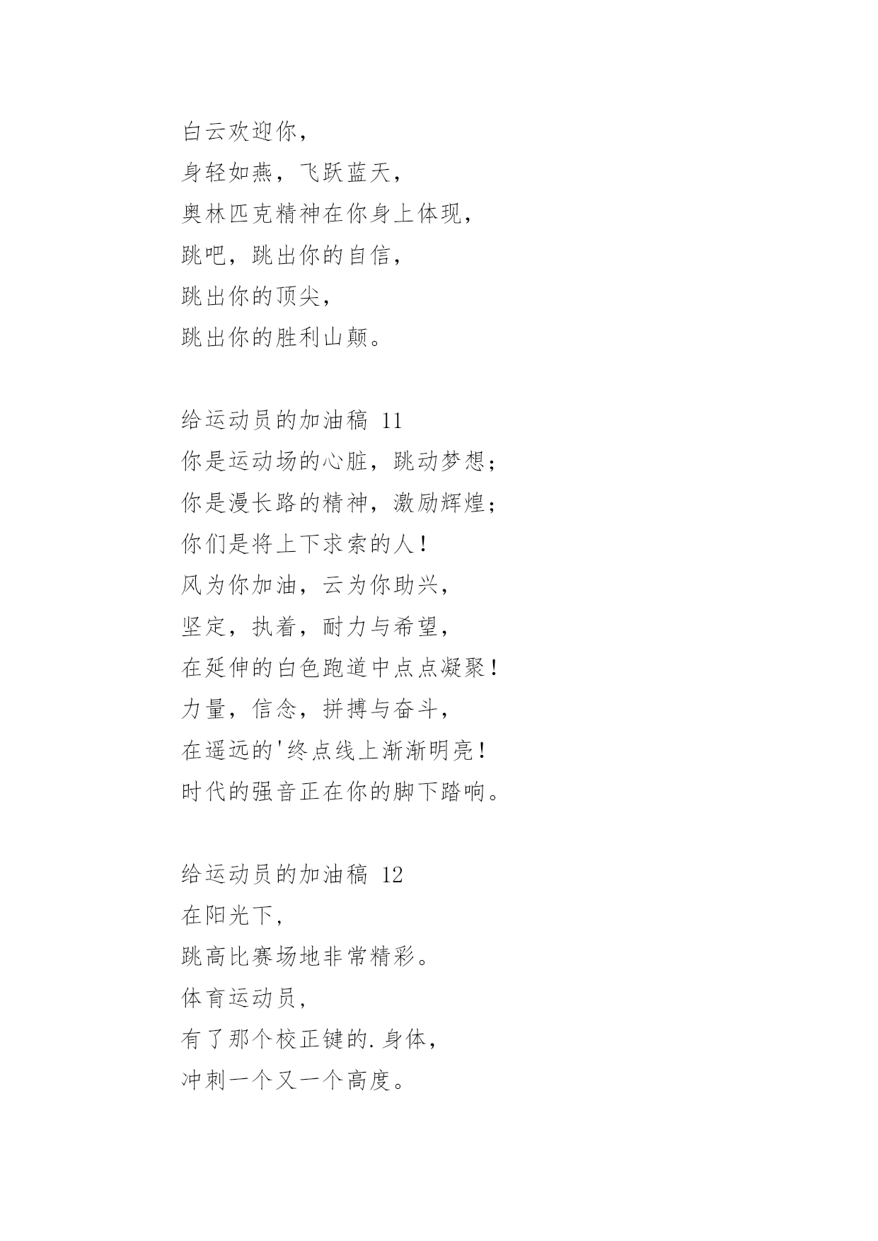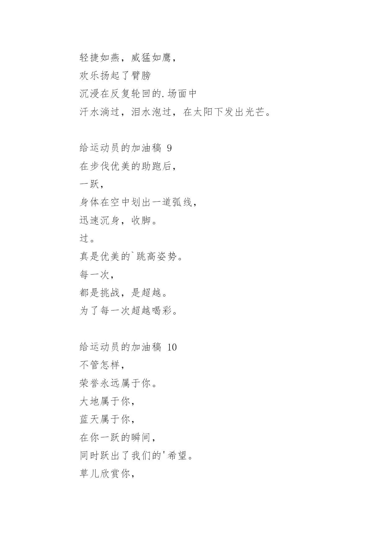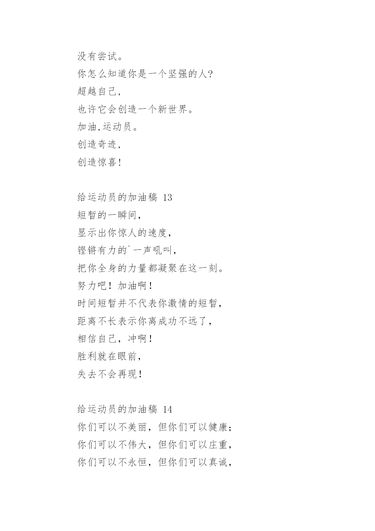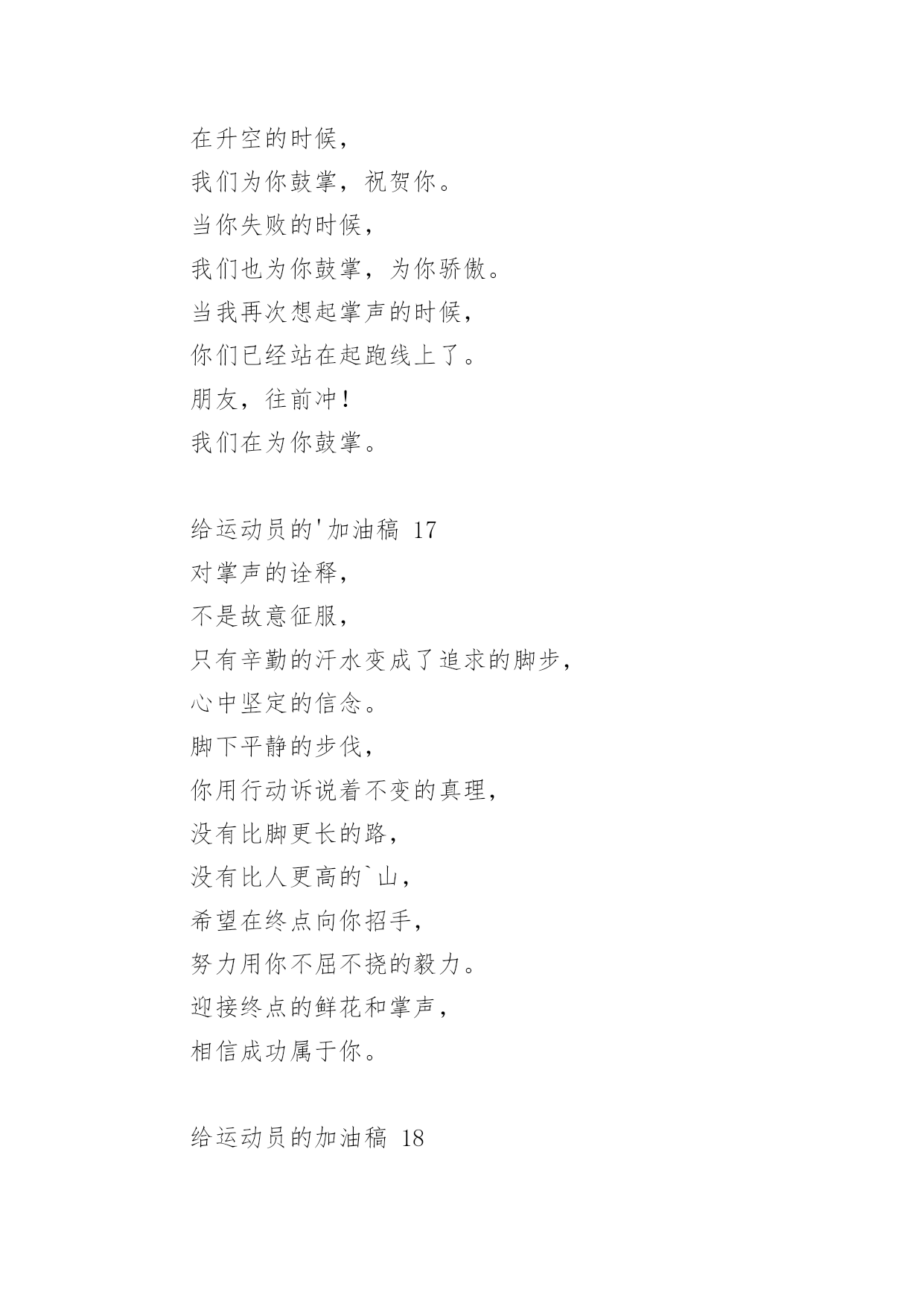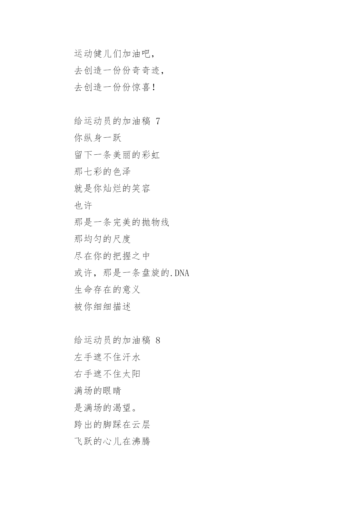 给运动员的加油稿给运动员的加油稿(通用21篇)在快速变化和不断变革的今天,很多情况下我们需要用到加油稿,加油稿是鼓励激励对方的文稿。怎么写加油稿才能避免踩雷呢?以下是小编精心整理的给运动员的加油稿,仅供参考,欢迎大家阅读。给运动员的加油稿1站在跳远板处,你突然发力向前跳出,啊,那动作教人快乐无比,无法自控随着双脚着地,一道美丽的“彩虹”产生了这是成功后的嬉乐这是爱的奉献给运动员的`加油稿2你是运动场的心脏,跳动梦想;你是漫长路的.精神,激励辉煌;你们是将上下求索的人!风为你加油,云为你助兴,坚定,执着,耐力与希望,在延伸的白色跑道中点点凝聚!力量,信念,拼搏与奋斗,在遥远的终点线上渐渐明亮!时代的强音正在你的脚下踏响。给运动员的加油稿3也许流星并不少见,但它燃烧的刹那,留给人间最美丽的回忆!也许笑脸并不少见,但胜利的喜悦,总会留给世界精彩的一瞬!是的,那些曾经美妙的东西只有短短的一瞬间,但那却把最辉煌的一刻留给了人间。胜利,是每个人所追求的,胜利的喜悦,是胜利与重新开始的`转折,胜利是新的开始!给运动员的加油稿4拼搏者,你是赛场上最亮的点。在你的眼中,不在乎胜利的欢乐和失败的眼泪,完全只是为了展示生命跳跃的节拍。拼搏者,你是生命乐章中最响的'音符。在你的心中,只有不停拼搏的信念,用自己坚实的步伐去迈开人生新的旅程。场上的拼搏者,你是我们永远的骄傲!给运动员的加油稿5左手遮不住汗水右手遮不住太阳满场的眼睛是满场的.渴望。跨出的脚踩在云层飞跃的心儿在沸腾轻捷如燕威猛如鹰欢乐扬起了臂膀沉浸在反复轮回的场面中汗水淌过,泪水泡过在太阳下发出光芒。给运动员的加油稿6在阳光的照耀下,跳高的比赛场地格外辉煌,运动健儿们,用那矫键的'身躯,冲刺着一个又一个的高度。没有尝试,怎会知道自己是否为强者,超越自己,也许会创造一番新天地!运动健儿们加油吧,去创造一份份奇奇迹,去创造一份份惊喜!给运动员的加油稿7你纵身一跃留下一条美丽的彩虹那七彩的色泽就是你灿烂的笑容也许那是一条完美的抛物线那均匀的尺度尽在你的把握之中或许,那是一条盘旋的.DNA生命存在的意义被你细细描述给运动员的加油稿8左手遮不住汗水右手遮不住太阳满场的眼睛是满场的渴望。跨出的脚踩在云层飞跃的心儿在沸腾轻捷如燕,威猛如鹰,欢乐扬起了臂膀沉浸在反复轮回的.场面中汗水淌过,泪水泡过,在太阳下发出光芒。给运动员的加油稿9在步伐优美的助跑后,一跃,身体在空中划出一道弧线,迅速沉身,收脚。过。真是优美的`跳高姿势。每一次,都是挑战,是超越。为了每一次超越喝彩。给运动员的加油稿10不管怎样,荣誉永远属于你。大地属于你,蓝天属于你,在你一跃的瞬间,同时跃出了我们的'希望。草儿欣赏你,白云欢迎你,身轻如燕,飞跃蓝天,奥林匹克精神在你身上体现,跳吧,跳出你的自信,跳出你的顶尖,跳出你的胜利山颠。给运动员的加油稿11你是运动场的心脏,跳动梦想;你是漫长路的精神,激励辉煌;你们是将上下求索的人!风为你加油,云为你助兴,坚定,执着,耐力与希望,在延伸的白色跑道中点点凝聚!力量,信念,拼搏与奋斗,在遥远的'终点线上渐渐明亮!时代的强音正在你的脚下踏响。给运动员的加油稿12在阳光下,跳高比赛场地非常精彩。体育运动员,有了那个校正键的.身体,冲刺一个又一个高度。没有尝试。你怎么知道你是一个坚强的人?超越自己,也许它会创造一个新世界。加油,运动员。创造奇迹,创造惊喜!给运动员的加油稿13短暂的一瞬间,显示出你惊人的速度,铿锵有力的`一声吼叫,把你全身的力量都凝聚在这一刻。努力吧!加油啊!时间短暂并不代表你激情的短暂,距离不长表示你离成功不远了,相信自己,冲啊!胜利就在眼前,失去不会再现!给运动员的加油稿14你们可以不美丽,但你们可以健康;你们可以不伟大,但你们可以庄重,你们可以不永恒,但你们可以真诚,你们可以不胜利,但你们可以赛出水平,让生活超脱自然,让生活的每一个符号,每一个细胞都快乐起来,我要对失败者说只要你不曾放下努力,不曾放下完美自我,成功的彼岸就会在前方等你。给运动员的`加油稿15成功与失败是同根生的兄弟,两者总是相伴着走过一生。也许,今日你遇到了失败;但此刻的失败并不代表,以后你不将再获得成功。你就应为此而高兴,因为你有了这次难忘的经历,有了应对失败的'勇气。你要站起来,不要放下对完美的想望,我们永远都支持你!给运动员的加油稿16那里需要活力那里需要哭。需要鼓掌。在升空的时候,我们为你鼓掌,祝贺你。当你失败的时候,我们也为你鼓掌,为你骄傲。当我再次想起掌声的时候,你们已经站在起跑线上了。朋友,往前冲!我们在为你鼓掌。给运动员的'加油稿17对掌声的诠释,不是故意征服,只有辛勤的汗水变成了追求的脚步,心中坚定的信念。脚下平静的步伐,你用行动诉说着不变的真理,没有比脚更长的路,没有比人更高的`山,希望在终点向