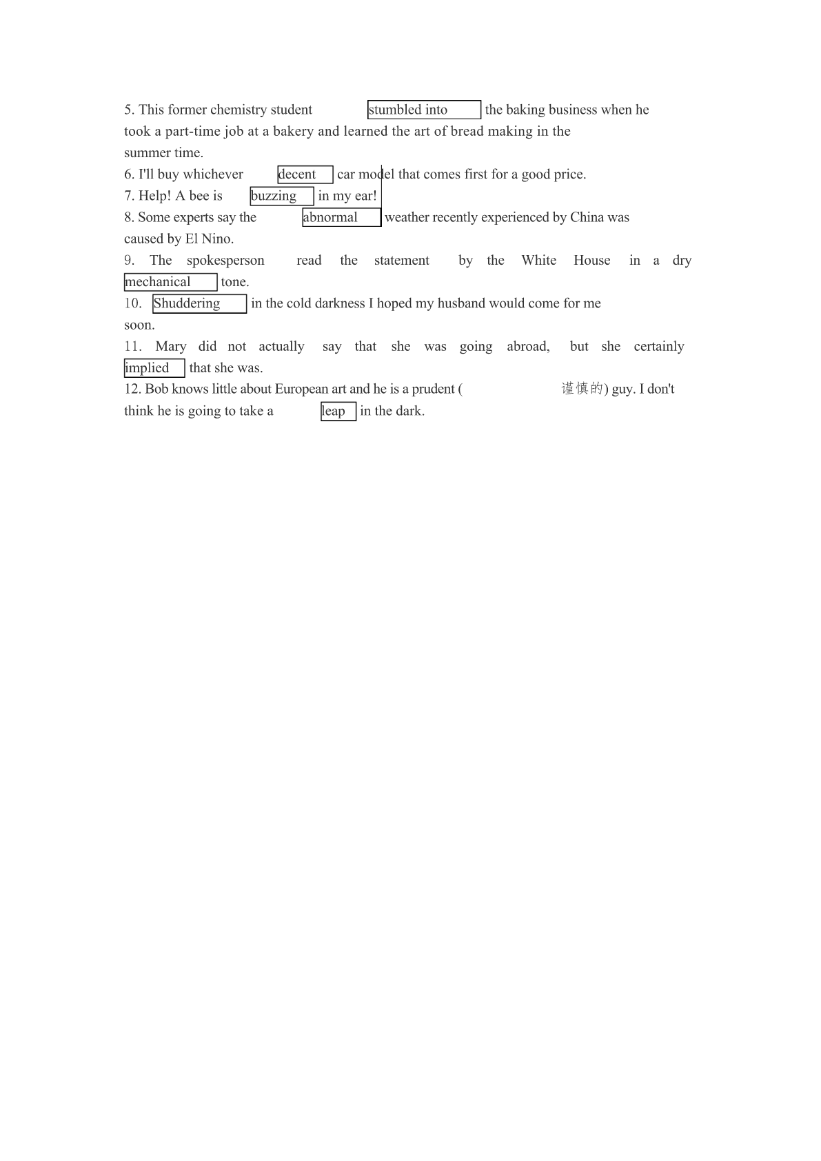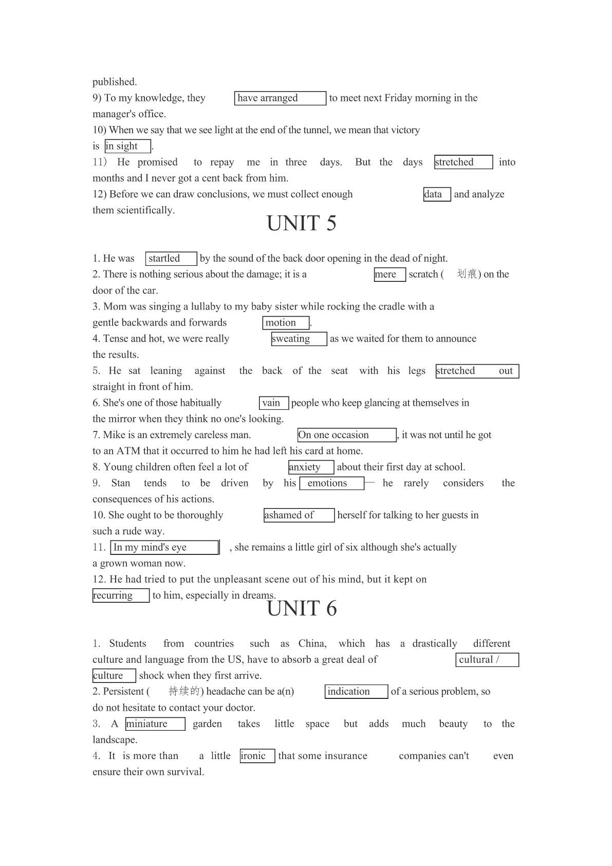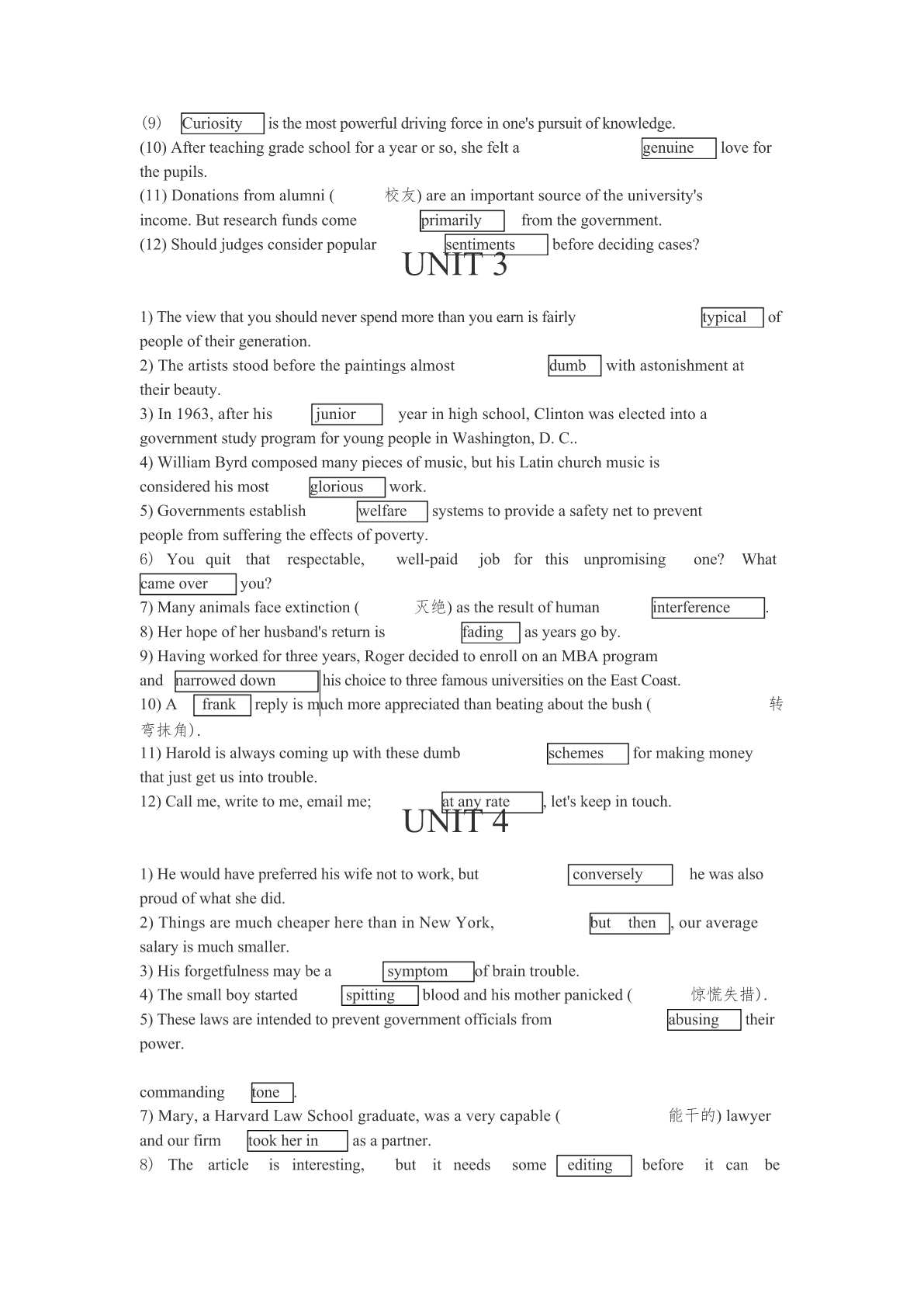 UNIT11.Tousethemachine,firstinsertthecorrectcoins,thenselect(挑选)thedrinkyouwantandpressthebutton.2.ProfessorSmithtranslatednotonlyfromtheFrenchbutalso,onoccasionfromthePolish.3.Foodchemistswillinvestigatethehealthfood(保健食品)onsaletoseeifitreallydoesgivethebenefitsclaimed.4.Inretrospect,itwasthewrongtimetoopenanewdataprocessing(数据处理)centerinthiscity.5.Myinitialreactiontothenewswasrelief,butasIthoughtmoreaboutitIbegantofeelangry.6.Afullunderstandingofmathematicsissufficienttoexplainawidevarietyofnaturalphenomena.7.Makesurethelabel(标签)isfirmlyattachedtotheparcel(包裹)beforeyoumailit.8.Myboyfriendboughtmedinnertomakeupforbeinglatethedaybefore.9.Thecommitteeisawaitingadecisionfromtheheadofficebeforeittakesanyaction.10.Thelittlegirldidnotseemtobeintheleastfrightenedofbeingleftbyherselfinthehouse.11.TheWTO(=WorldTradeOrganization世界贸易组织)isintendedtopromotetradeamongitsmemberstates.12.WhenthemoonemergedfrombehindthecloudsImadeoutafiguremovinginthedistance.UNIT2(1)Prof.Williamssaysthatmycompositionisgoodexceptfortheendingwhichseemstooabrupt.(2)Sufferingfrominsomnia(失眠)forseveraldays,Annwenttoseeherdoctorandwastoldthattheproblemwasmoreemotionalthanphysical.prayingthatGodwillblessthosewhohavegivensogenerouslyforthepoor(4)Theinsurancepolicydoesnotcoverdamagetothegoodscausedbynormalwearandtear.(5)Theoldeconomicbeliefsarewidelyregardedastoodatedtobeusefulinsolvingtheproblemsnowemerginginoureconomy.(6)Youarefreetosaywhatyouthink,butasaresponsibleindividualyoushouldalsobepreparedtofacetheconsequencesofwhatyousay.(7)Pricesaregoingdown.Howeverthisseeminglywelcomechangemaybringaboutotherproblemsintheeconomy.(8)John'sviewonthetraincrashstandsincontrasttothoseofalmostallofhiscolleagues.(9)Curiosityisthemostpowerfuldrivingforceinone'spursuitofknowledge.(10)Afterteachinggradeschoolforayearorso,shefeltagenuineloveforthepupils.(11)Donationsfromalumni(校友)areanimportantsourceoftheuniversity'sincome.Butresearchfundscomeprimarilyfromthegovernment.(1