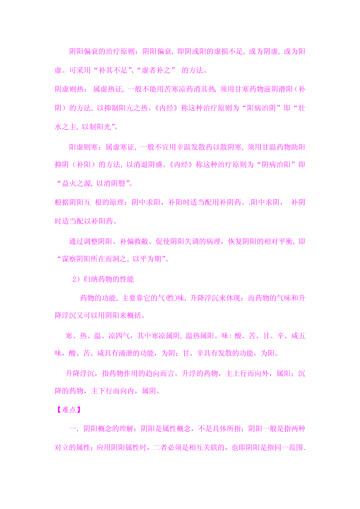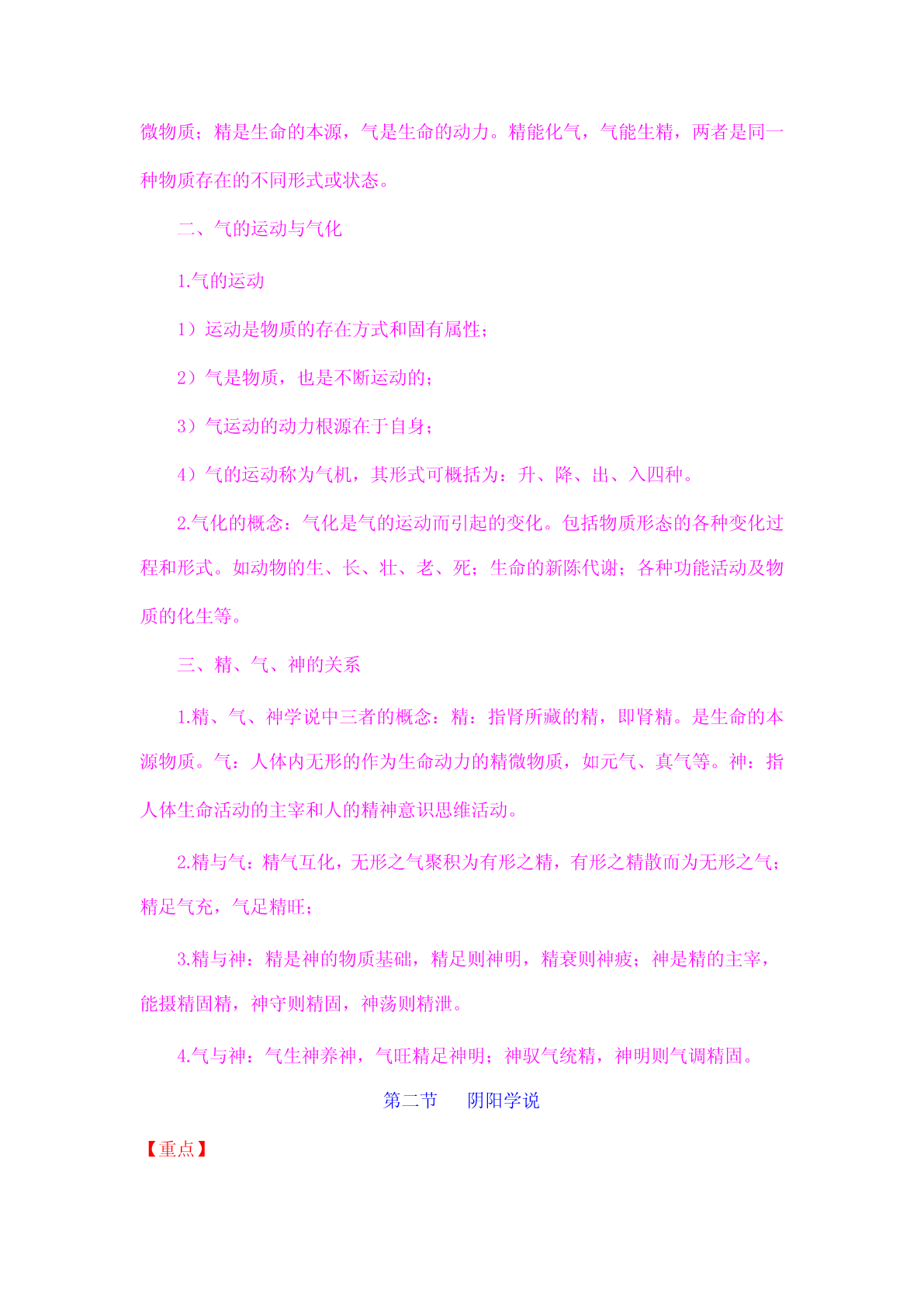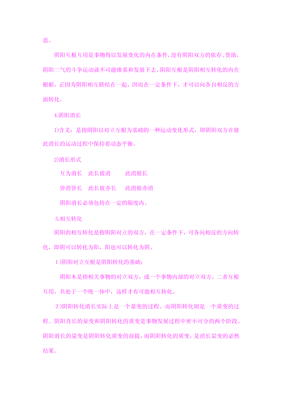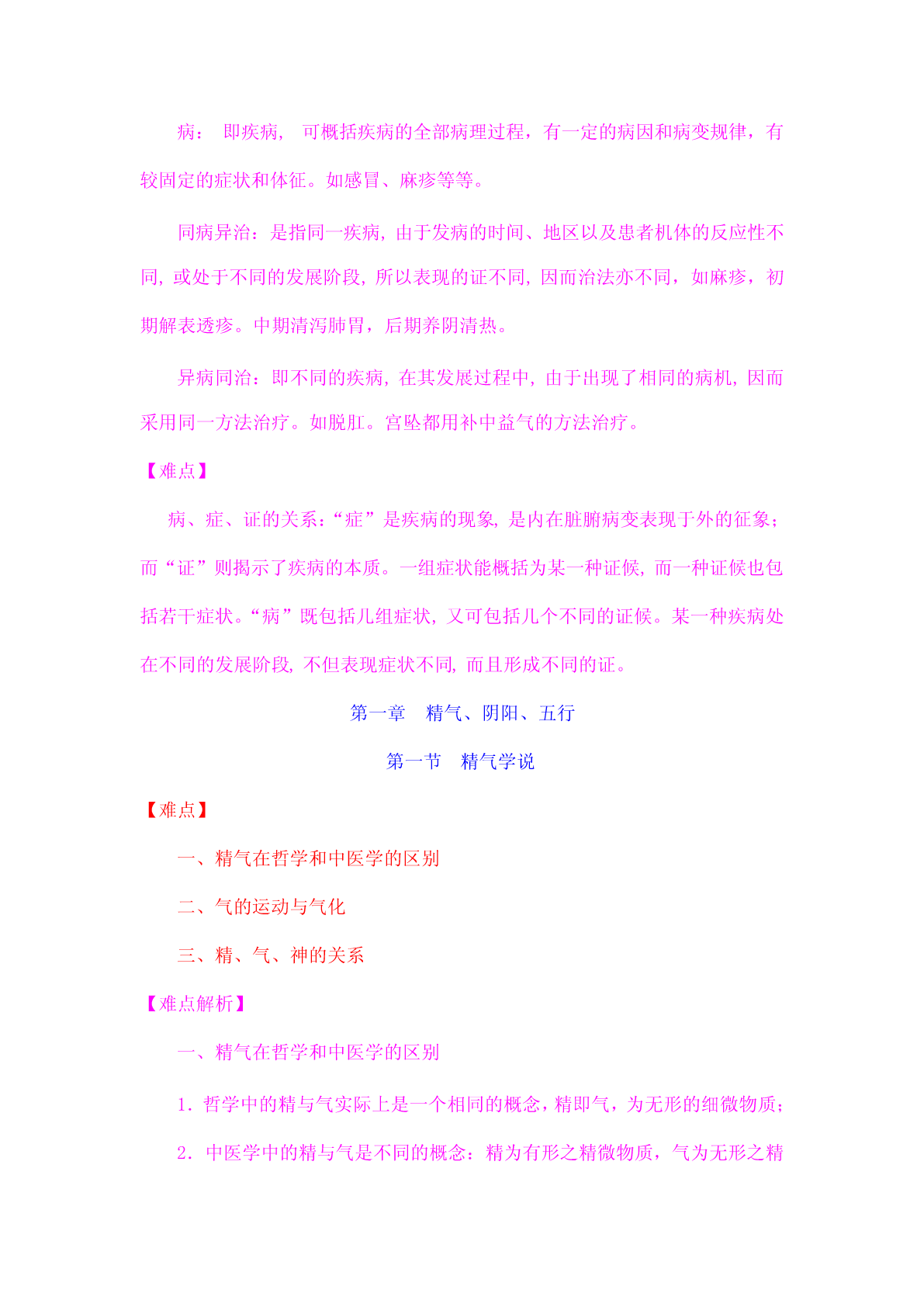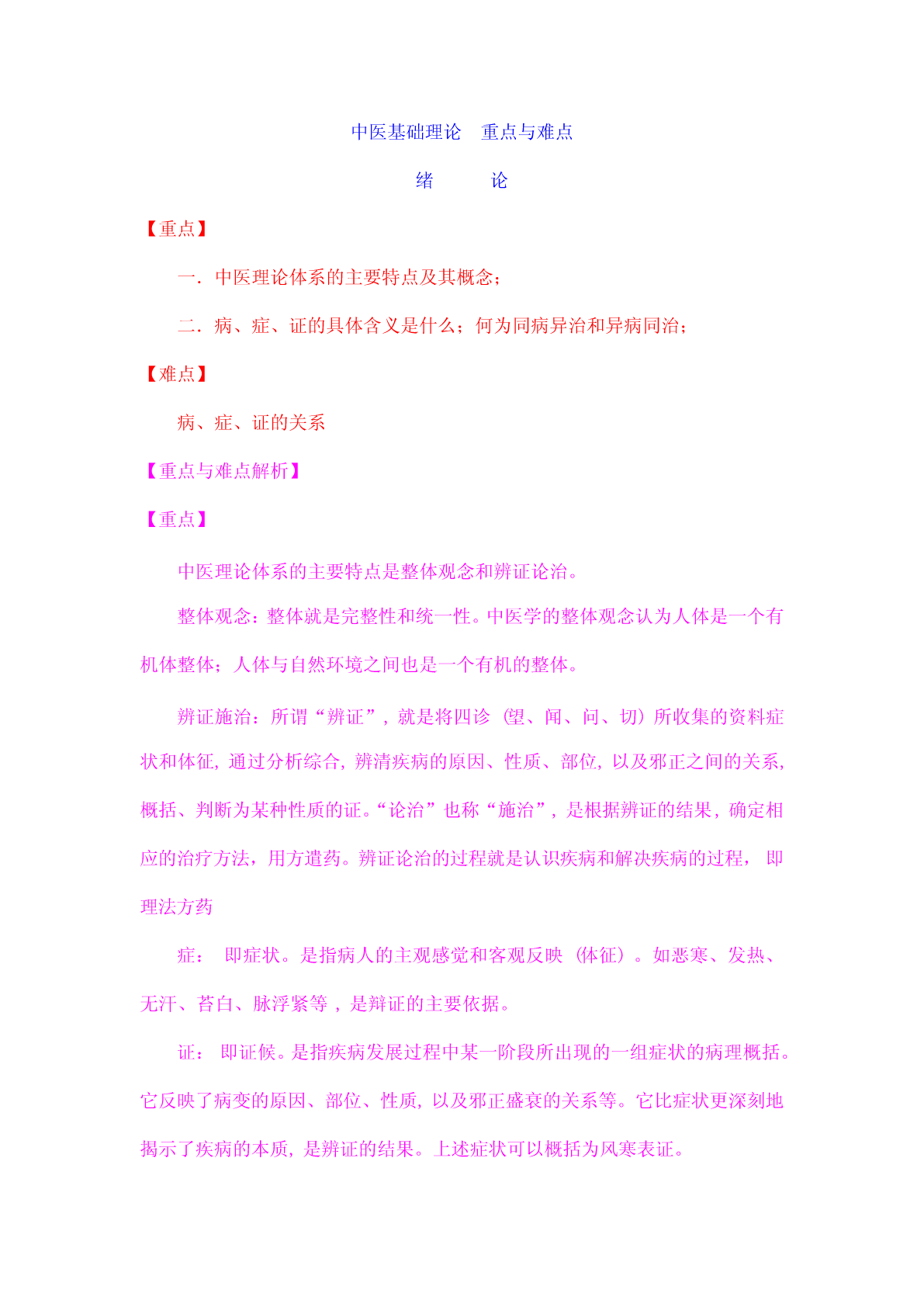 中医基础理论重点与难点绪论【重点】一.中医理论体系的主要特点及其概念;二.病、症、证的具体含义是什么;何为同病异治和异病同治;【难点】病、症、证的关系【重点与难点解析】【重点】中医理论体系的主要特点是整体观念和辨证论治。整体观念:整体就是完整性和统一性。中医学的整体观念认为人体是一个有机体整体;人体与自然环境之间也是一个有机的整体。辨证施治:所谓“辨证”,就是将四诊(望、闻、问、切)所收集的资料症状和体征,通过分析综合,辨清疾病的原因、性质、部位,以及邪正之间的关系,概括、判断为某种性质的证。“论治”也称“施治”,是根据辨证的结果,确定相应的治疗方法,用方遣药。辨证论治的过程就是认识疾病和解决疾病的过程,即理法方药症:即症状。是指病人的主观感觉和客观反映(体征)。如恶寒、发热、无汗、苔白、脉浮紧等,是辩证的主要依据。证:即证候。是指疾病发展过程中某一阶段所出现的一组症状的病理概括。它反映了病变的原因、部位、性质,以及邪正盛衰的关系等。它比症状更深刻地揭示了疾病的本质,是辨证的结果。上述症状可以概括为风寒表证。病:即疾病,可概括疾病的全部病理过程,有一定的病因和病变规律,有较固定的症状和体征。如感冒、麻疹等等。同病异治:是指同一疾病,由于发病的时间、地区以及患者机体的反应性不同,或处于不同的发展阶段,所以表现的证不同,因而治法亦不同,如麻疹,初期解表透疹。中期清泻肺胃,后期养阴清热。异病同治:即不同的疾病,在其发展过程中,由于出现了相同的病机,因而采用同一方法治疗。如脱肛。宫坠都用补中益气的方法治疗。【难点】病、症、证的关系:“症”是疾病的现象,是内在脏腑病变表现于外的征象;而“证”则揭示了疾病的本质。一组症状能概括为某一种证候,而一种证候也包括若干症状。“病”既包括几组症状,又可包括几个不同的证候。某一种疾病处在不同的发展阶段,不但表现症状不同,而且形成不同的证。第一章精气、阴阳、五行第一节精气学说【难点】一、精气在哲学和中医学的区别二、气的运动与气化三、精、气、神的关系【难点解析】一、精气在哲学和中医学的区别1.哲学中的精与气实际上是一个相同的概念,精即气,为无形的细微物质;2.中医学中的精与气是不同的概念:精为有形之精微物质,气为无形之精微物质;精是生命的本源,气是生命的动力。精能化气,气能生精,两者是同一种物质存在的不同形式或状态。二、气的运动与气化1.气的运动1)运动是物质的存在方式和固有属性;2)气是物质,也是不断运动的;3)气运动的动力根源在于自身;4)气的运动称为气机,其形式可概括为:升、降、出、入四种。2.气化的概念:气化是气的运动而引起的变化。包括物质形态的各种变化过程和形式。如动物的生、长、壮、老、死;生命的新陈代谢;各种功能活动及物质的化生等。三、精、气、神的关系1.精、气、神学说中三者的概念:精:指肾所藏的精,即肾精。是生命的本源物质。气:人体内无形的作为生命动力的精微物质,如元气、真气等。神:指人体生命活动的主宰和人的精神意识思维活动。2.精与气:精气互化,无形之气聚积为有形之精,有形之精散而为无形之气;精足气充,气足精旺;3.精与神:精是神的物质基础,精足则神明,精衰则神疲;神是精的主宰,能摄精固精,神守则精固,神荡则精泄。4.气与神:气生神养神,气旺精足神明;神驭气统精,神明则气调精固。第二节阴阳学说【重点】一.阴阳的概念、阴阳学说的概念及内容;二.阴阳学说在中医学中的具体应用中的相关概念;【难点】一.阴阳概念的理解;二.阴阳消长与平衡的关系三.阴阳互损【重点与难点解析】【重点】一.阴阳的基本概念:阴阳,是中国古代哲学中的一对范畴。是对自然界相互关联的某些事物或现象对立双方属性的概括。阴阳属性是根据其性质、位置、趋势、状态等按一定原则所规定,凡是向上的、向外的、温热的、无形的、明亮的、运动的、功能的、兴奋的……都属于阳;凡是与此相对的另一方面如向下的、向内的、寒冷的、有形的、黑暗的、静止的、物质的、抑制的……都属于阴。引入医学领域,凡是具有推动、温热、兴奋等作用的功能和物质属于阳;凡是具有凝聚、滋润、抑制等作用的功能和物质属于阴。阴阳学说的概念:阴阳学说认为世界是物质性的整体,是由阴阳二气对立统一的结果,存在于事物内部的阴阳两个方面不断对立的矛盾运动是宇宙间一切事物发生、发展、变化和消亡的根源。这一种理论称为阴阳学说。阴阳学说的基本内容1.交感与互藏阴阳交感是