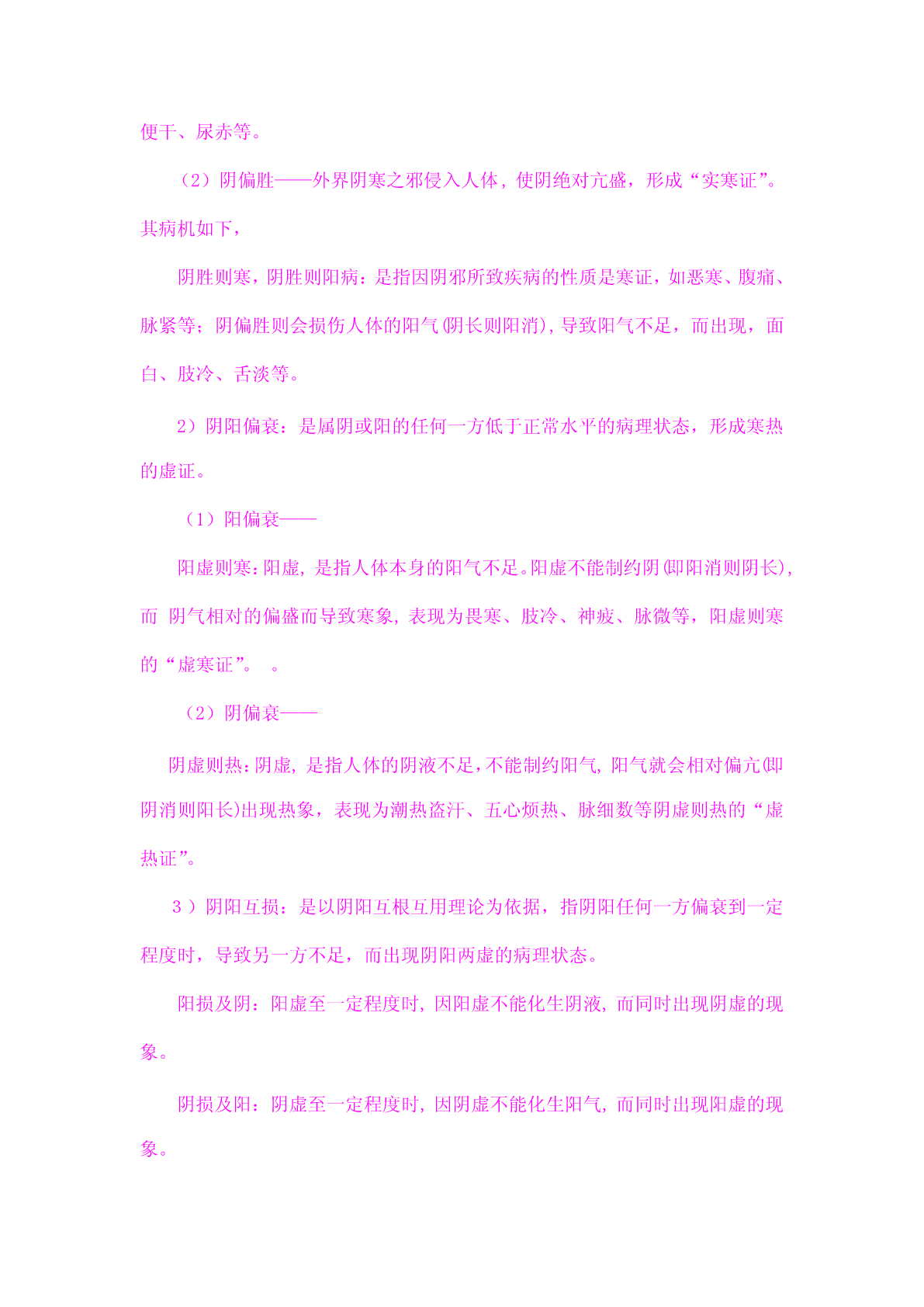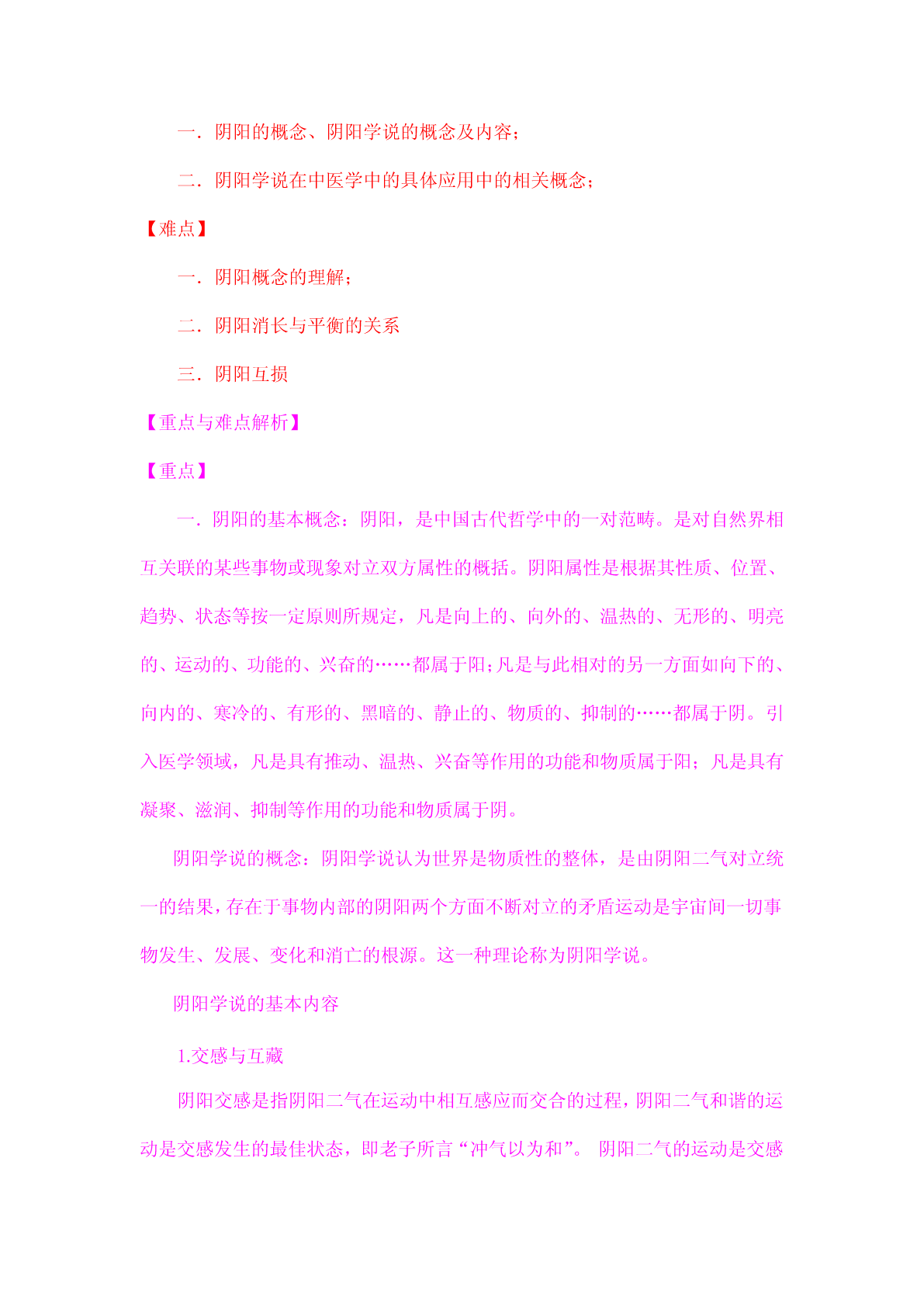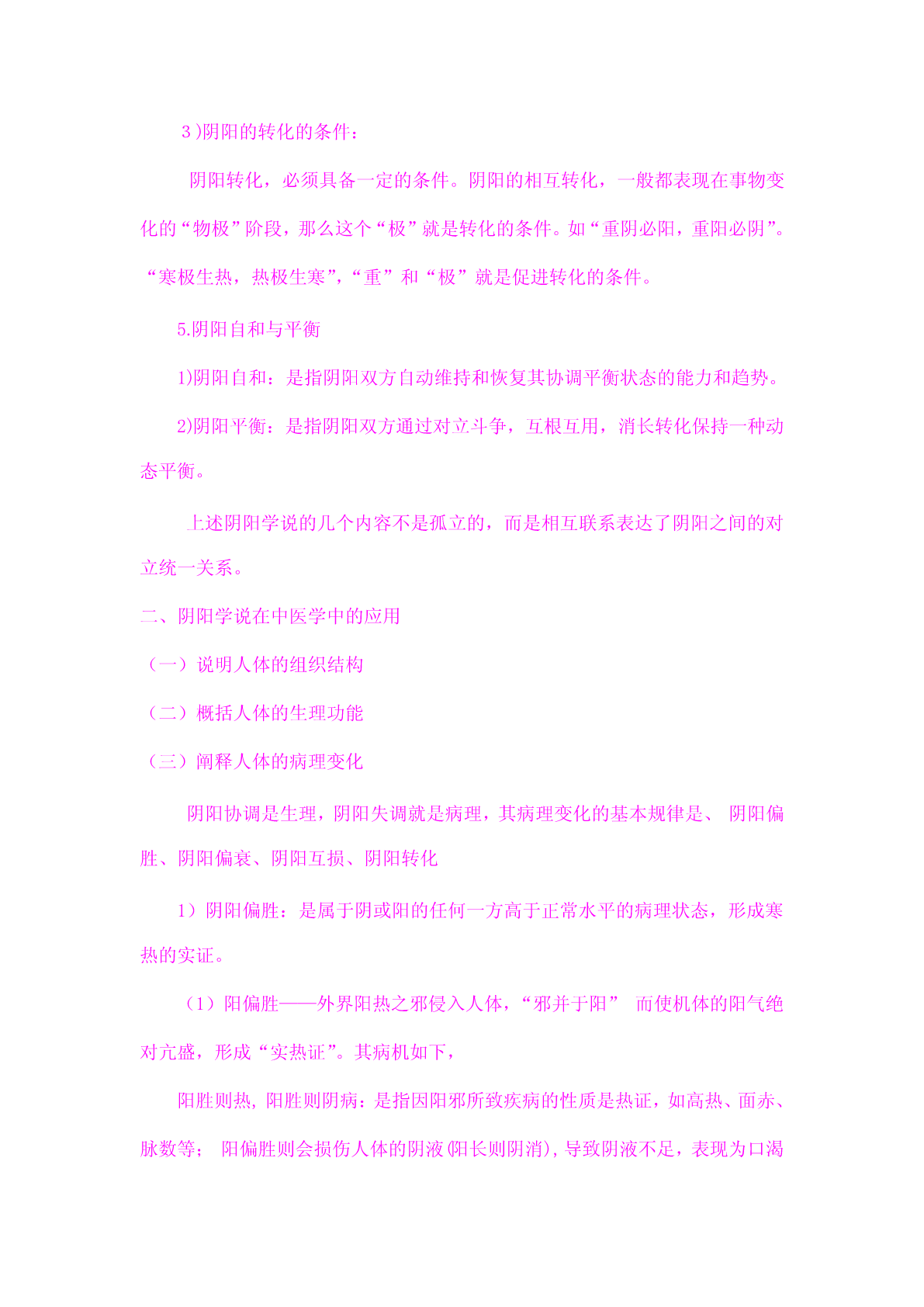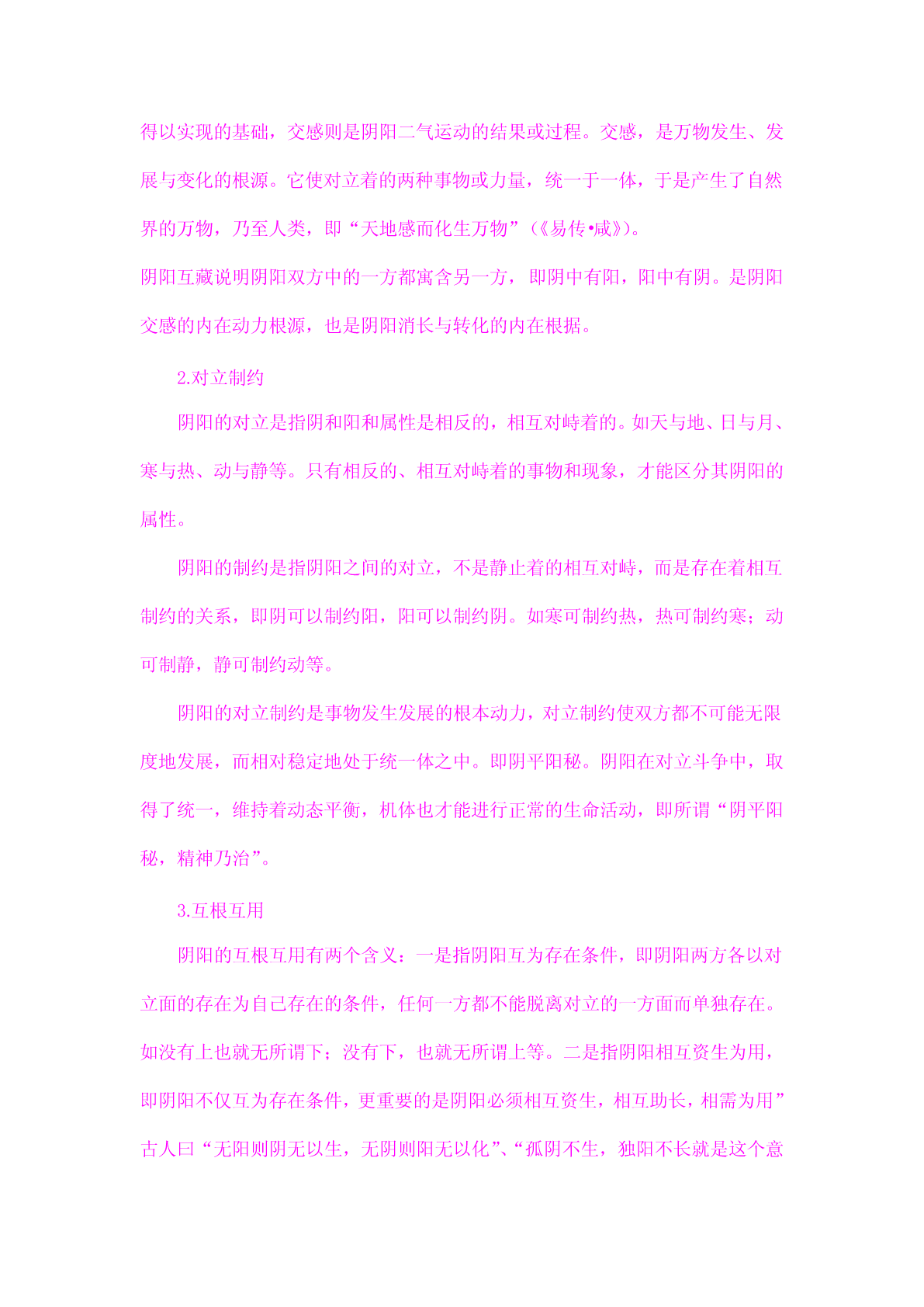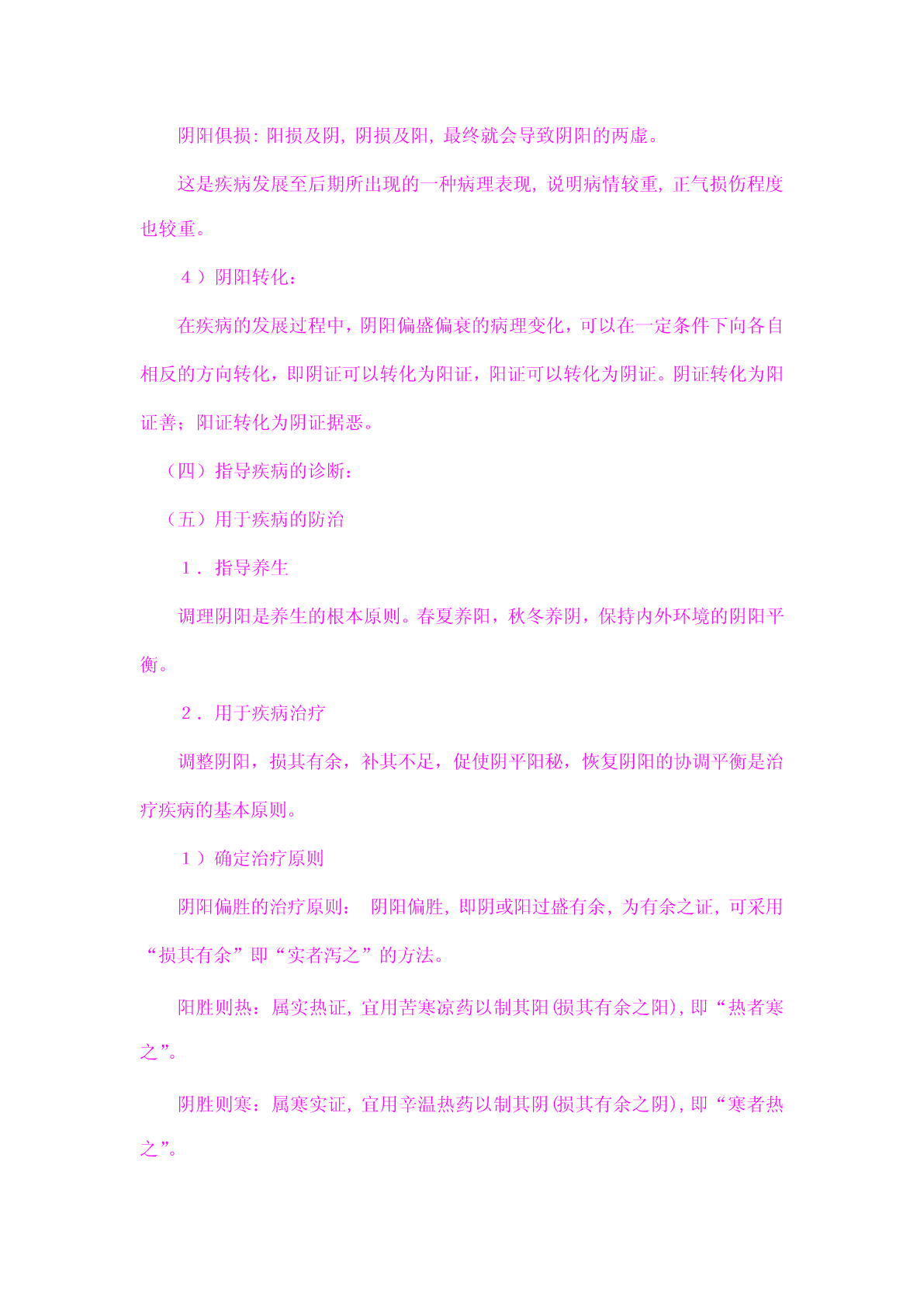 中医基础理论重点与难点绪论【重点】一.中医理论体系的主要特点及其概念;二.病、症、证的具体含义是什么;何为同病异治和异病同治;【难点】病、症、证的关系【重点与难点解析】【重点】中医理论体系的主要特点是整体观念和辨证论治。整体观念:整体就是完整性和统一性。中医学的整体观念认为人体是一个有机体整体;人体与自然环境之间也是一个有机的整体。辨证施治:所谓“辨证”,就是将四诊(望、闻、问、切)所收集的资料症状和体征,通过分析综合,辨清疾病的原因、性质、部位,以及邪正之间的关系,概括、判断为某种性质的证。“论治”也称“施治”,是根据辨证的结果,确定相应的治疗方法,用方遣药。辨证论治的过程就是认识疾病和解决疾病的过程,即理法方药症:即症状。是指病人的主观感觉和客观反映(体征)。如恶寒、发热、无汗、苔白、脉浮紧等,是辩证的主要依据。证:即证候。是指疾病发展过程中某一阶段所出现的一组症状的病理概括。它反映了病变的原因、部位、性质,以及邪正盛衰的关系等。它比症状更深刻地揭示了疾病的本质,是辨证的结果。上述症状可以概括为风寒表证。病:即疾病,可概括疾病的全部病理过程,有一定的病因和病变规律,有较固定的症状和体征。如感冒、麻疹等等。同病异治:是指同一疾病,由于发病的时间、地区以及患者机体的反应性不同,或处于不同的发展阶段,所以表现的证不同,因而治法亦不同,如麻疹,初期解表透疹。中期清泻肺胃,后期养阴清热。异病同治:即不同的疾病,在其发展过程中,由于出现了相同的病机,因而采用同一方法治疗。如脱肛。宫坠都用补中益气的方法治疗。【难点】病、症、证的关系:“症”是疾病的现象,是内在脏腑病变表现于外的征象;而“证”则揭示了疾病的本质。一组症状能概括为某一种证候,而一种证候也包括若干症状。“病”既包括几组症状,又可包括几个不同的证候。某一种疾病处在不同的发展阶段,不但表现症状不同,而且形成不同的证。第一章精气、阴阳、五行第一节精气学说【难点】一、精气在哲学和中医学的区别二、气的运动与气化三、精、气、神的关系【难点解析】一、精气在哲学和中医学的区别1.哲学中的精与气实际上是一个相同的概念,精即气,为无形的细微物质;2.中医学中的精与气是不同的概念:精为有形之精微物质,气为无形之精微物质;精是生命的本源,气是生命的动力。精能化气,气能生精,两者是同一种物质存在的不同形式或状态。二、气的运动与气化1.气的运动1)运动是物质的存在方式和固有属性;2)气是物质,也是不断运动的;3)气运动的动力根源在于自身;4)气的运动称为气机,其形式可概括为:升、降、出、入四种。2.气化的概念:气化是气的运动而引起的变化。包括物质形态的各种变化过程和形式。如动物的生、长、壮、老、死;生命的新陈代谢;各种功能活动及物质的化生等。三、精、气、神的关系1.精、气、神学说中三者的概念:精:指肾所藏的精,即肾精。是生命的本源物质。气:人体内无形的作为生命动力的精微物质,如元气、真气等。神:指人体生命活动的主宰和人的精神意识思维活动。2.精与气:精气互化,无形之气聚积为有形之精,有形之精散而为无形之气;精足气充,气足精旺;3.精与神:精是神的物质基础,精足则神明,精衰则神疲;神是精的主宰,能摄精固精,神守则精固,神荡则精泄。4.气与神:气生神养神,气旺精足神明;神驭气统精,神明则气调精固。第二节阴阳学说【重点】一.阴阳的概念、阴阳学说的概念及内容;二.阴阳学说在中医学中的具体应用中的相关概念;【难点】一.阴阳概念的理解;二.阴阳消长与平衡的关系三.阴阳互损【重点与难点解析】【重点】一.阴阳的基本概念:阴阳,是中国古代哲学中的一对范畴。是对自然界相互关联的某些事物或现象对立双方属性的概括。阴阳属性是根据其性质、位置、趋势、状态等按一定原则所规定,凡是向上的、向外的、温热的、无形的、明亮的、运动的、功能的、兴奋的……都属于阳;凡是与此相对的另一方面如向下的、向内的、寒冷的、有形的、黑暗的、静止的、物质的、抑制的……都属于阴。引入医学领域,凡是具有推动、温热、兴奋等作用的功能和物质属于阳;凡是具有凝聚、滋润、抑制等作用的功能和物质属于阴。阴阳学说的概念:阴阳学说认为世界是物质性的整体,是由阴阳二气对立统一的结果,存在于事物内部的阴阳两个方面不断对立的矛盾运动是宇宙间一切事物发生、发展、变化和消亡的根源。这一种理论称为阴阳学说。阴阳学说的基本内容1.交感与互藏阴阳交感是