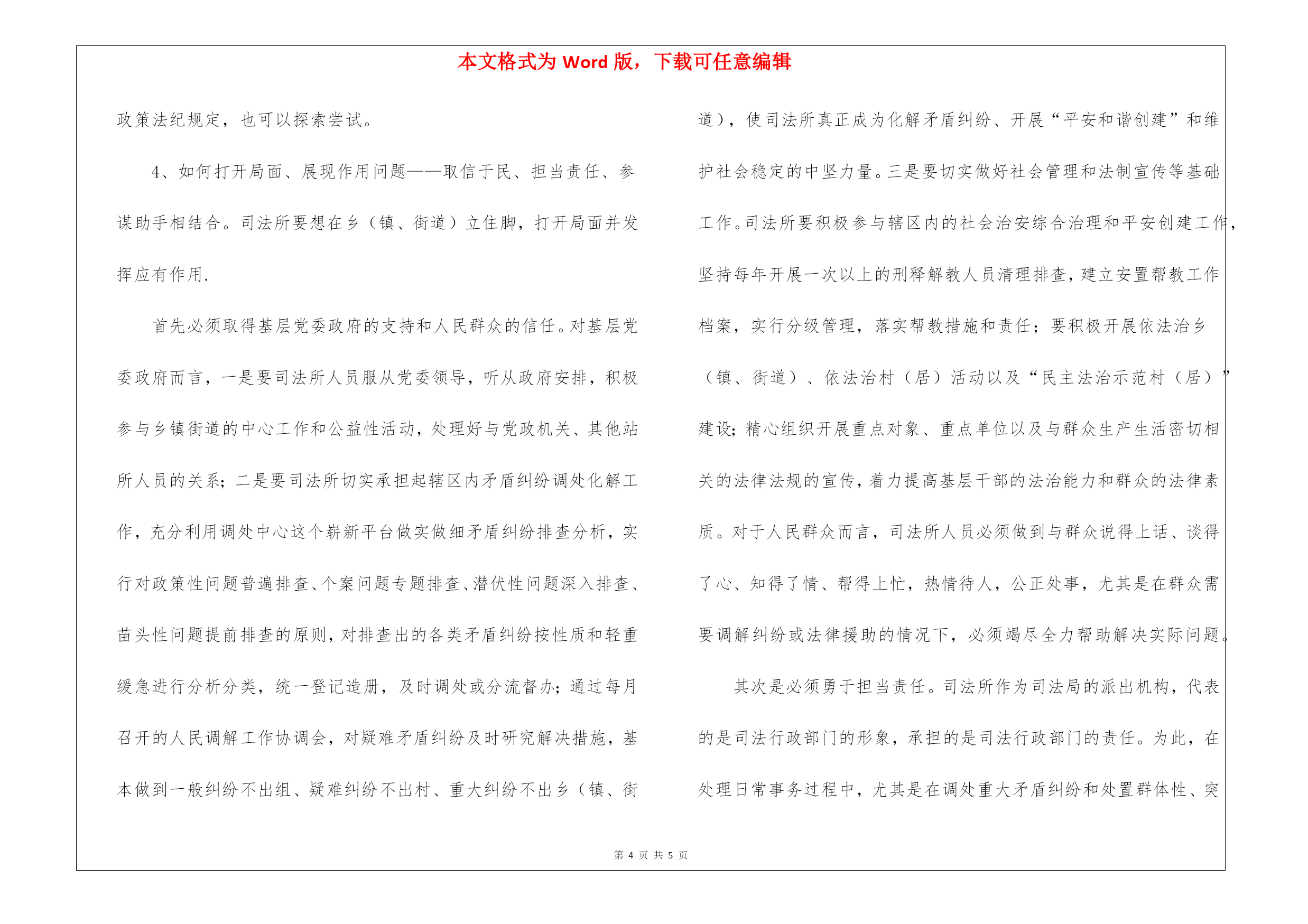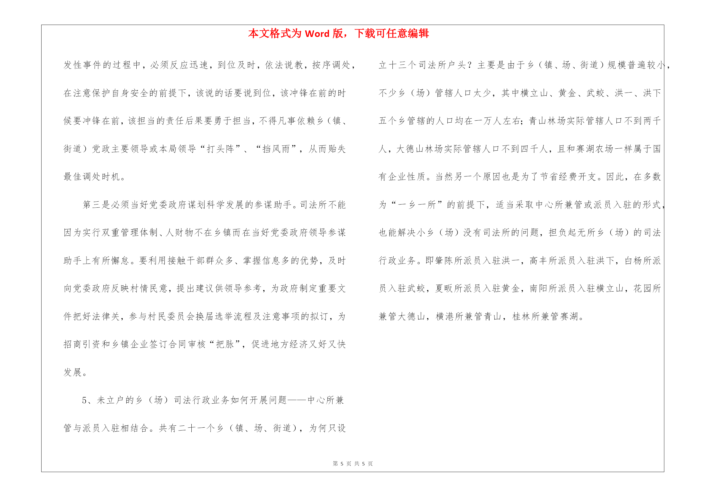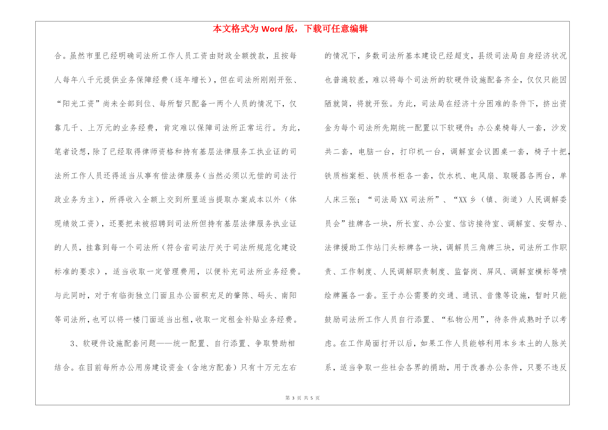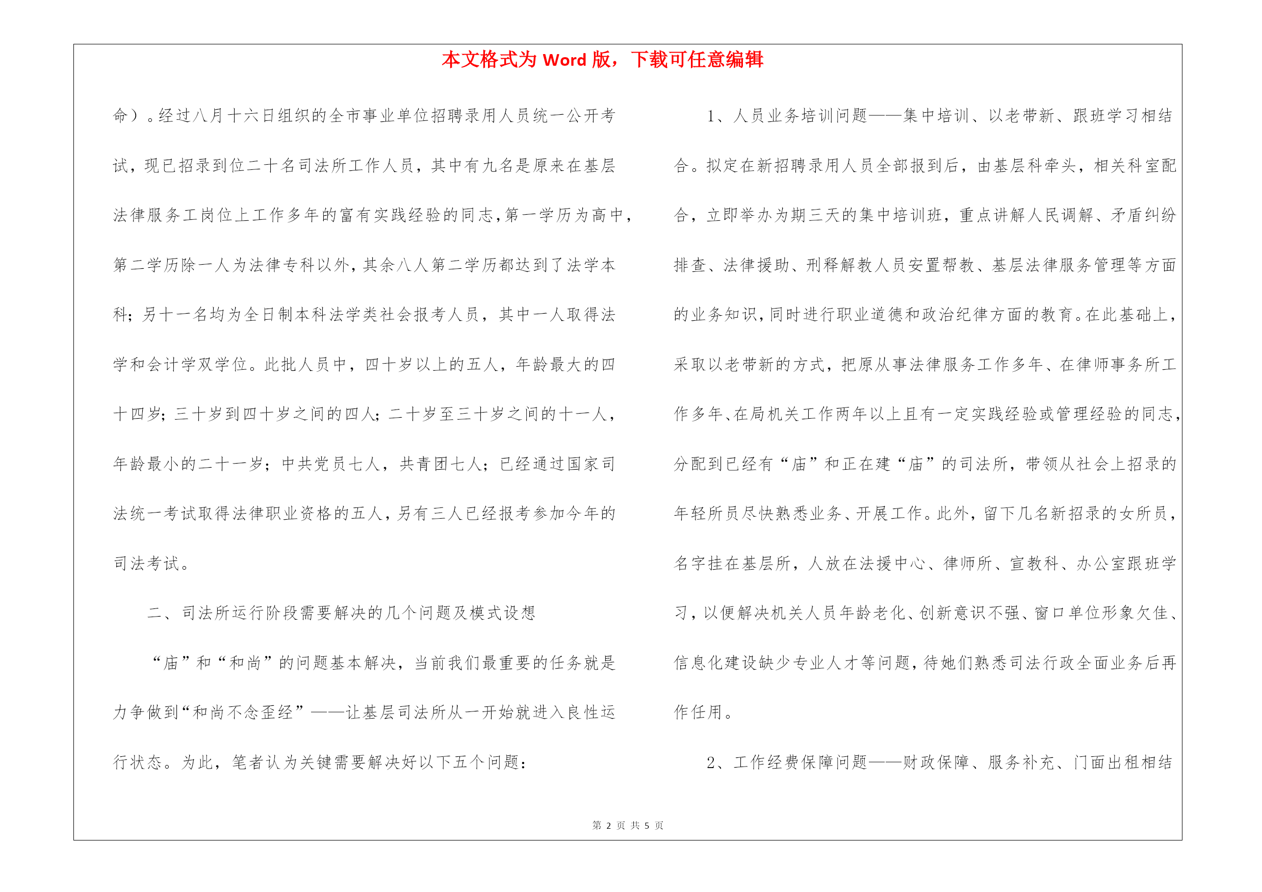 本文格式为Word版,下载可任意编辑第PAGE\*MERGEFORMAT5页共NUMPAGES\*MERGEFORMAT5页司法所运行模式考察材料今年以来,通过多方面的努力,进一步加快了司法所办公用房建设步伐,落实了司法所人员编制和职级待遇问题,公开招聘录用了一批司法所工作人员。目前,基层司法所各项工作即将正式运行。为了确保新组建的司法所开得了门、运得了行、干得了事,直至走得上规范化建设步伐,很有必要对司法所运作模式及发展前景进行一番理性化思考。一、司法所办公用房建设及人员配备现状地处江西北部、长江中下游南岸,北与湖北省武穴市隔江相望,西邻湖北省阳新县和本省武宁县,南与本省德安县、九江县交界,东连九江县和九江市区,总面积1442平方公里,总人口43万,辖21个乡(镇、场、街道),其中与外省、外县交界的乡镇高达十四个,且多为山区、丘陵地带。正是由于所处地理位置的特殊性,因此我们认为在乡镇设立司法所非常必要,市委、市政府对此项工作也相当重视,借中央支持中西部地区司法所办公用房建设的东风,我市已经基本上按照“一乡一所”的要求落实了基层司法所办公用房问题。目前,在前四批十四个司法所办公用房建设任务中,除了两个正在新建,其他十二个均已落实“庙”的问题;第五批四个司法所办公用房问题也有两个基本落实,只有城区两个街道的司法所办公用房正在积极想办法落实。因此,建“庙”问题已经不是我们的首要任务(两个林场、一个农场未进入前五批司法所办公用房建设立项)。关于“和尚”(人员编制)问题,今年年初市委常委(扩大)会议已经确定,在原有十一个司法所立户的基础上,新增两个司法所户头,共设立十三个司法所,为市司法局派出机构,财政全额拨款,均定为相当副科级事业单位。在此基础上,市编委决定给十三个司法所共核定编制四十八人。后经市政府常务会研究,决定今年首批招聘录用二十名司法所工作人员(所长因属副科级干部,待组织部考察任命)。经过八月十六日组织的全市事业单位招聘录用人员统一公开考试,现已招录到位二十名司法所工作人员,其中有九名是原来在基层法律服务工岗位上工作多年的富有实践经验的同志,第一学历为高中,第二学历除一人为法律专科以外,其余八人第二学历都达到了法学本科;另十一名均为全日制本科法学类社会报考人员,其中一人取得法学和会计学双学位。此批人员中,四十岁以上的五人,年龄最大的四十四岁;三十岁到四十岁之间的四人;二十岁至三十岁之间的十一人,年龄最小的二十一岁;中共党员七人,共青团七人;已经通过国家司法统一考试取得法律职业资格的五人,另有三人已经报考参加今年的司法考试。二、司法所运行阶段需要解决的几个问题及模式设想“庙”和“和尚”的问题基本解决,当前我们最重要的任务就是力争做到“和尚不念歪经”——让基层司法所从一开始就进入良性运行状态。为此,笔者认为关键需要解决好以下五个问题:1、人员业务培训问题——集中培训、以老带新、跟班学习相结合。拟定在新招聘录用人员全部报到后,由基层科牵头,相关科室配合,立即举办为期三天的集中培训班,重点讲解人民调解、矛盾纠纷排查、法律援助、刑释解教人员安置帮教、基层法律服务管理等方面的业务知识,同时进行职业道德和政治纪律方面的教育。在此基础上,采取以老带新的方式,把原从事法律服务工作多年、在律师事务所工作多年、在局机关工作两年以上且有一定实践经验或管理经验的同志,分配到已经有“庙”和正在建“庙”的司法所,带领从社会上招录的年轻所员尽快熟悉业务、开展工作。此外,留下几名新招录的女所员,名字挂在基层所,人放在法援中心、律师所、宣教科、办公室跟班学习,以便解决机关人员年龄老化、创新意识不强、窗口单位形象欠佳、信息化建设缺少专业人才等问题,待她们熟悉司法行政全面业务后再作任用。2、工作经费保障问题——财政保障、服务补充、门面出租相结合。虽然市里已经明确司法所工作人员工资由财政全额拨款,且按每人每年八千元提供业务保障经费(逐年增长),但在司法所刚刚开张、“阳光工资”尚未全部到位、每所暂只配备一两个人员的情况下,仅靠几千、上万元的业务经费,肯定难以保障司法所正常运行。为此,笔者设想,除了已经取得律师资格和持有基层法律服务工执业证的司法所工作人员还得适当从事有偿法律服务(当然必须以无偿的司法行政业务为主),所得收入全额上交到所里适当提取办案成本以外(体现绩效工资),还要把未被招聘到司法所但持有基层法律服务执业证的人员,挂靠到每一个司法所(符合省司法厅关于司法所规范化建设标准的要求),适当收取一定管理费用,以便补充司法所业务经费。与此同时,对于有临街独立门面且办公面积充足的肇陈、码头、南阳等司法所,也可以将一楼门面适当出租,收取一定租金补贴业务经费。3、软硬件设施配套问题——统一配置、自行添置、争取赞助相结合。在目前每所办公用房建设资金(含地