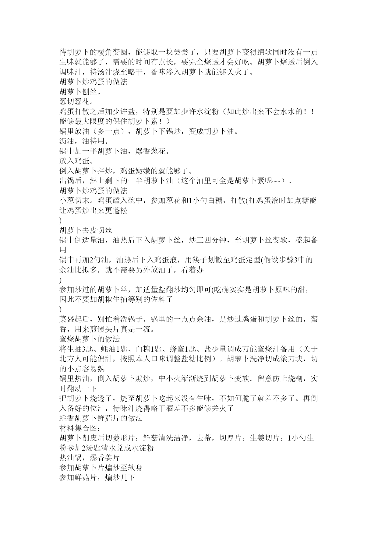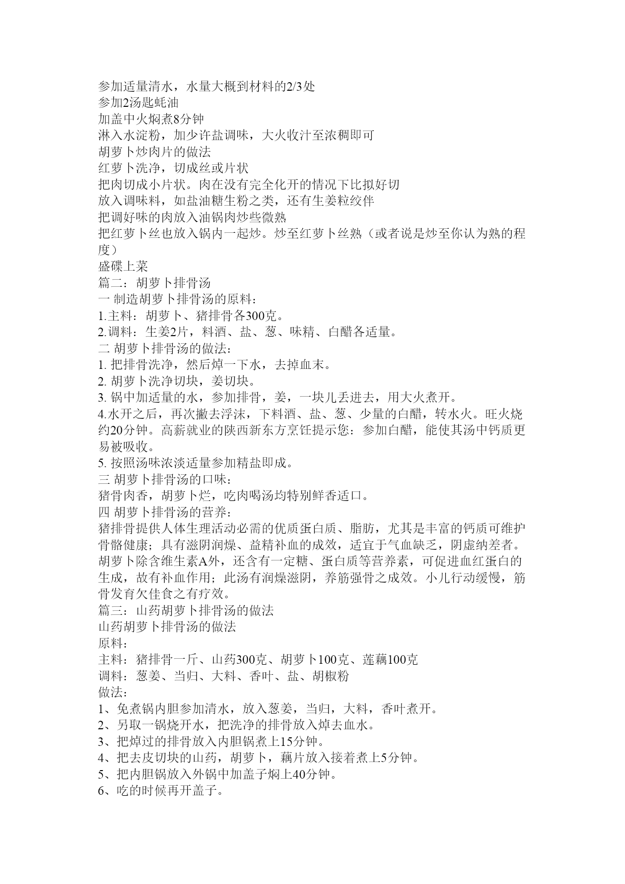 胡萝卜骨头汤的做法教程篇一:胡萝卜汤的做法胡萝卜汤的做法一根胡萝卜洗净,切丝备用热锅,放油,炒胡萝卜炒软后加鸡汤,大火煮开10分钟鸡蛋搅匀打入锅内,加盐,胡椒粉调味关火,最后撒入葱花???????加强抵抗力降糖降脂明目利膈宽肠健脑益智保护肝脏防治动脉硬化预防癌症延缓衰老美容护肤癌症、高血压、夜盲症、皮肤粗糙者适宜一般人群均可食用肾病、胆固醇过高患者忌食在没有鸡汤的情况下,还有另一种做法:1.葱花姜备用。2.胡萝卜一根切丝。3.取一汤匙半至两汤匙面粉放到萝卜丝里拌匀。4.热锅,放油,葱花姜放入其中,葱花泛黄倒入萝卜丝,翻炒。泛金黄色,加水,小火煮开,小心汤淤出。5.放盐味精鸡精香菜等辅料。6.鸡蛋打花,均匀洒在汤里。关火,出锅即可。加点香油味更好。胡萝卜炒蛋的做法胡萝卜去皮洗净后,切成细长条,放在大碗内,加一小搓盐,用清水泡10分钟鸡蛋打散后加料酒,盐,搅拌均匀待用锅内倒油,油烧制八成热倒入蛋液,煸炒成型后盛出待用锅内再次倒少许油,放葱花,出味后放胡萝卜条翻炒,加五香粉,放入之前炒好的鸡蛋,装盘出锅即可1、胡萝卜中含有大量的胡萝卜素,当进入人体被吸收后,可转化成维生素A,又叫维生素A。经常食用胡萝卜,完全能够满足人体对维生素A的需要。2、胡萝卜中含有大量的木质素,能提高人肌体抗病才能的作用,还有抗癌防病的作用。最主要的是养眼、养粘膜,不容易得夜盲症。3、胡萝卜也是美容纤身菜,是维持人体上皮组织的正常机能,使其分泌出糖蛋白,用以保持肌肤潮湿细嫩,因此经常食用胡萝卜,可保持荣耀照人的年轻形象。另外,胡萝卜含有芥子油和淀粉酶,能促进脂肪的新陈代谢,防止过多的脂肪在皮下堆积而发胖,保持体态健美。香烧胡萝卜的做法胡萝卜去皮,切滚刀块,不宜太大,切得薄一点小一点更容易熟两小勺生抽,一小勺老抽,两小勺白糖,少许的盐,混合调成汁。糖略多一点更好吃。勺子确实是常见的白瓷汤勺平底锅倒油烧热,下入胡萝卜块,中小火渐渐的烧,中间不加水,也不用盖锅盖,只需要一点耐心将胡萝卜渐渐烧软待胡萝卜的棱角变圆,能够取一块尝尝了,只要胡萝卜变得绵软同时没有一点生味就能够了,需要的时间有点长,要完全烧透才会好吃。胡萝卜烧透后倒入调味汁,待汤汁烧至略干,香味渗入胡萝卜就能够关火了。胡萝卜炒鸡蛋的做法胡萝卜刨丝。葱切葱花。鸡蛋打散之后加少许盐,特别是要加少许水淀粉(如此炒出来不会水水的!!能够最大限度的保住胡萝卜素!)锅里放油(多一点),胡萝卜下锅炒,变成胡萝卜油。沥油,油待用。锅中加一半胡萝卜油,爆香葱花。放入鸡蛋。倒入胡萝卜拌炒,鸡蛋嫩嫩的就能够了。出锅后,淋上剩下的一半胡萝卜油(这个油里可全是胡萝卜素呢~~)。胡萝卜炒鸡蛋的做法小葱切末。鸡蛋磕入碗中,参加葱花和1小勺白糖,打散(打鸡蛋液时加点糖能让鸡蛋炒出来更蓬松)胡萝卜去皮切丝锅中倒适量油,油热后下入胡萝卜丝,炒三四分钟,至胡萝卜丝变软,盛起备用锅中再加2勺油,油热后下入鸡蛋液,用筷子划散至鸡蛋定型(假设步骤3中的余油比拟多,就不需要另外放油了,看着办)参加炒过的胡萝卜丝,加适量盐翻炒均匀即可(吃确实实是胡萝卜原味的甜,因此不要加胡椒生抽等别的佐料了)菜盛起后,别忙着洗锅子。锅里的一点点余油,是炒过鸡蛋和胡萝卜丝的,蛮香,用来煎馒头片真是一流。蜜烧胡萝卜的做法将生抽3匙、蚝油1匙、白糖1匙、蜂蜜1匙、盐少量调成万能蜜烧汁备用(关于北方人可能偏甜,按照本人口味调整盐糖比例)。胡萝卜洗净切成滚刀块,切的小点容易熟锅里热油,倒入胡萝卜煽炒,中小火渐渐烧到胡萝卜变软。留意防止烧糊,实时翻动一下把胡萝卜烧透了,烧至胡萝卜吃起来没有生味,不如何脆了就差不多了。再倒入备好的位汁,待味汁烧得略干酒差不多能够关火了蚝香胡萝卜鲜菇片的做法材料集合图:胡萝卜削皮后切菱形片;鲜菇清洗洁净,去蒂,切厚片;生姜切片;1小勺生粉参加2汤匙清水兑成水淀粉热油锅,爆香姜片参加胡萝卜片煸炒至软身参加鲜菇片,煸炒几下参加适量清水,水量大概到材料的2/3处参加2汤匙蚝油加盖中火焖煮8分钟淋入水淀粉,加少许盐调味,大火收汁至浓稠即可胡萝卜炒肉片的做法红萝卜洗净,切成丝或片状把肉切成小片状。肉在没有完全化开的情况下比拟好切放入调味料,如盐油糖生粉之类,还有生姜粒绞伴把调好味的肉放入油锅肉炒些微熟把红萝卜丝也放入锅内一起炒。炒至红萝卜丝熟(或者说是炒至你认为熟的程度)盛碟上菜篇二:胡萝卜排骨汤一制造胡萝卜排骨汤的原料:1.主料:胡萝卜、猪排骨各300克。2.调料:生姜2片,料酒、盐、葱、味精、白醋各适量。二胡萝卜排骨汤的做法:1.把排骨洗净,然后焯一下水,去掉血末。2.胡萝卜洗净切块,姜切块。3.锅中加适量的