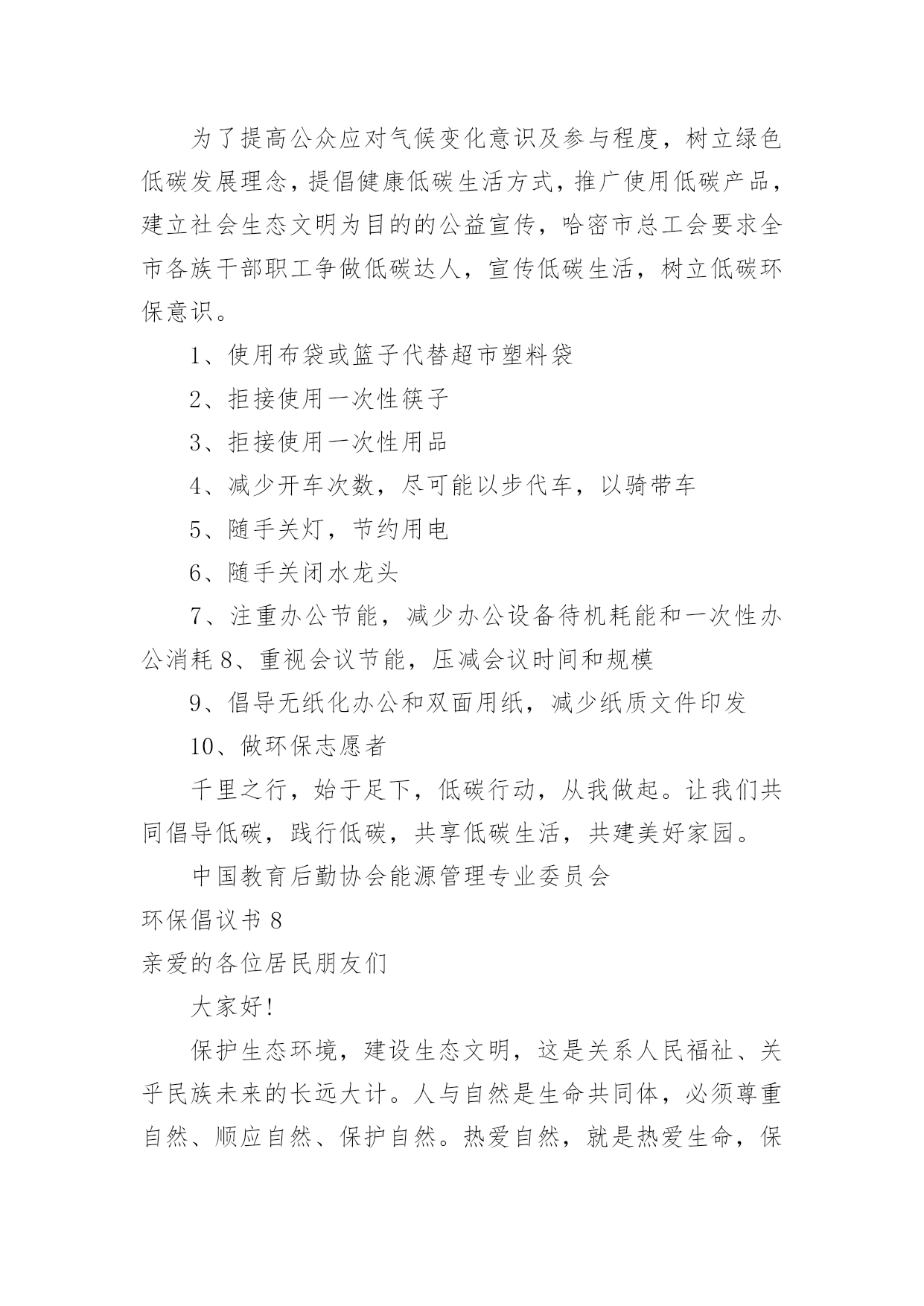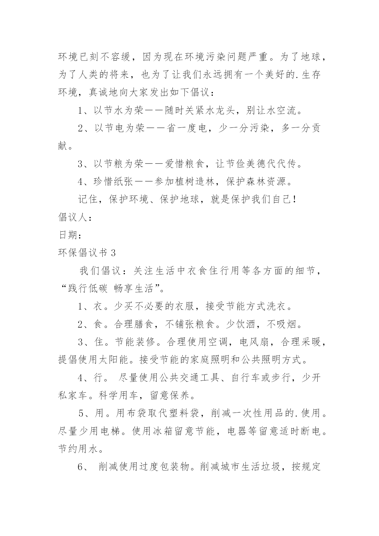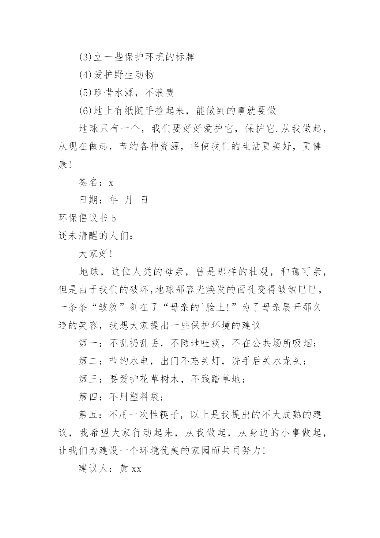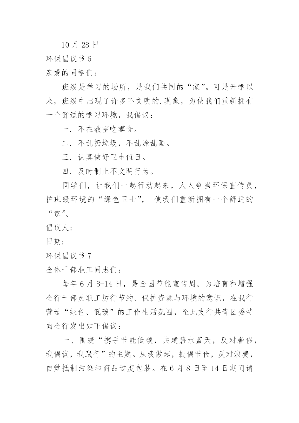 环保倡议书环保倡议书(优选)在现在的社会生活中,我们都跟倡议书有着直接或间接的联系,倡议书作为一种公开提议性的专用书信,其在写作上有一定的规范。相信很多朋友都对写倡议书感到非常苦恼吧,下面是小编精心整理的环保倡议书,仅供参考,希望能够帮助到大家。环保倡议书1各位老师,同学们:大家好,我是学生会秘书处秘书长高二四班赵##。今天我代表学生会全体成员向全体师生发出倡议,主题是“绿色生活,从我做起。”地球孕育万物,是所有生命的起源。然而近百年来,由于人类采取了乱砍滥伐、竭泽而渔等不科学的发展方式,地球生态系统正滑向不可恢复的临界点:酸雨肆虐,森林锐减,土地荒漠化,臭氧层损耗,越境转移的危险废物,堆积如山的一次性饭盒……联合国规划署相关人员表示:“如果我们仍旧保持当前的.消费习惯和生产模式,人口增长速度也保持不变,那么到20xx年时全球人口数量将会达到96亿,届时将需要3颗地球才能继续人类的生活。”这些数据触目惊心,这些现实令人心痛。面对严峻的形势,联合国积极应对,在1972年召开的第27届联合国大会上,通过了《人类环境宣言》,将每年的6月5日确定为“世界环境日”,并要求各国政府、团体均需在该日前后举行保护环境、反对公害的各类社会活动。中国政府积极响应联合国的号召,自1985年起,每年都会举办纪念世界环境日的相关活动,并于xxxx年在《环境保护法》中明确规定:每年6月5日为环境日。今年是第四十三个“世界环境日”,联合国确定的宣传主题为“可持续消费和生产”,日前公布的我国“环境日”的主题为“践行绿色生活”,旨在增强全民环境意识、节约意识、生态意识,形成人人、事事、时时崇尚生态文明的社会新风尚。我们二中学子,作为祖国未来的栋梁,更应作出表率,以自身行动践行绿色生活。从自身做起,从身边小事做起,节约一杯水、一度电,绿色出行,多使用再生材料产品,少用一次性物品,支持垃圾分类和资源再利用,拒绝过度包装,争创资源节约型、环境友好型学校,共建美丽中国!倡议书宣读完毕,谢谢大家。倡议人:20xx年xx月xx日环保倡议书2同学们:你们好!今天我来向大家介绍保护环境的重要性。保护环境已刻不容缓,因为现在环境污染问题严重。为了地球,为了人类的将来,也为了让我们永远拥有一个美好的.生存环境,真诚地向大家发出如下倡议:1、以节水为荣――随时关紧水龙头,别让水空流。2、以节电为荣――省一度电,少一分污染,多一分贡献。3、以节粮为荣――爱惜粮食,让节俭美德代代传。4、珍惜纸张――参加植树造林,保护森林资源。记住,保护环境、保护地球,就是保护我们自己!倡议人:日期:环保倡议书3我们倡议:关注生活中衣食住行用等各方面的细节,“践行低碳畅享生活”。1、衣。少买不必要的衣服,接受节能方式洗衣。2、食。合理膳食,不铺张粮食。少饮酒,不吸烟。3、住。节能装修。合理使用空调,电风扇,合理采暖,提倡使用太阳能。接受节能的家庭照明和公共照明方式。4、行。尽量使用公共交通工具、自行车或步行,少开私家车。科学用车,留意保养。5、用。用布袋取代塑料袋,削减一次性用品的.使用。尽量少用电梯。使用冰箱留意节能,电器等留意适时断电。节约用水。6、削减使用过度包装物。削减城市生活垃圾,按规定进行垃圾分类。乐观参加全民植树。让绿色与我们同行,从我做起,从小事做起,用实际行动践行低碳生活,参与节能减排。将绿色作为我们生活的主旋律,共同建设绿色文明家园。xx科技周组委会xxx年x月xx日环保倡议书4还未清醒的人们:大家好!地球,这位人类的母亲,曾是那样的壮观,和蔼可亲。但是由于我们的破坏,地球那容光焕发的面孔变得皱皱巴巴,一条条“皱纹”刻在了“母亲的`脸上!”为了母亲展开那久违的笑容,我想大家提出一些保护环境的建议,第一:不乱扔乱丢,不随地吐痰,不在公共场所吸烟;第二:节约水电,出门不忘关灯,洗手后关水龙头;第三:要爱护花草树木,不践踏草地;第四:不用塑料袋;第五:不用一次性筷子。以上是我提出的不大成熟的建议,我希望大家行动起来,从我做起,从身边的小事做起,让我们为建设一个环境优美的家园而共同努力!另外,学习了《只有一个地球》和《宇宙生命之迷》,相信大家都和我一样,一定很有感触.在此,我向大家提出以下几条建议:(1)多种树,不乱砍伐树木,不踩踏草坪.(2)不用化学药品(3)立一些保护环境的标牌(4)爱护野生动物(5)珍惜水源,不浪费(6)地上有纸随手捡起来,能做到的事就要做地球只有一个,我们要好好爱护它,保护它.从我做起,从现在做起,节约各种资源,将使我们的生活更美好,更健康!签名:x日期:年月日环保倡议书5还未清醒的人们:大家好!地球,这位人类的母亲,曾是那样的壮观,和蔼可亲,但是由于我们的破坏,地球那容光焕发的面孔变得皱皱巴巴,一条条“皱纹”刻在了“母亲的`脸上!”为了母亲展开那久违的笑容,我想