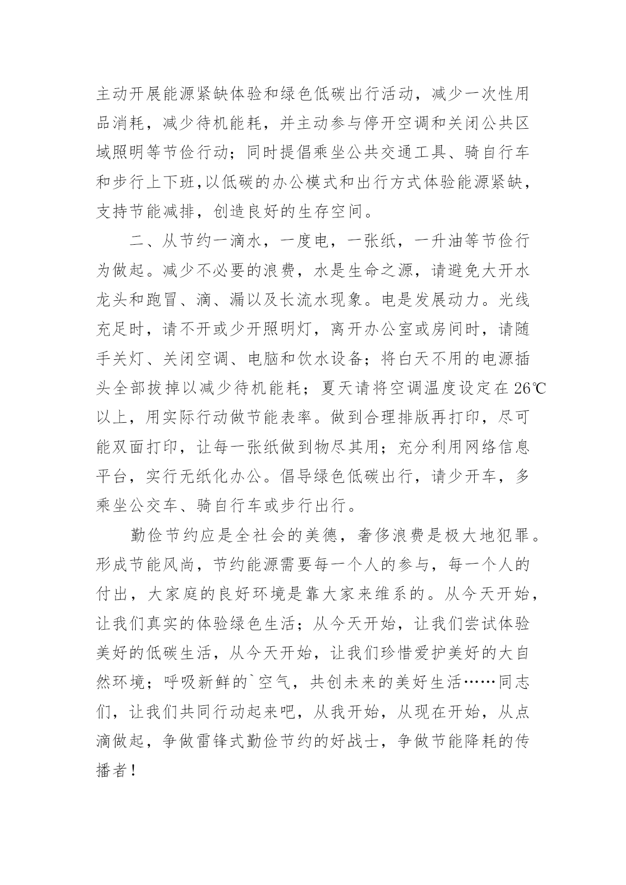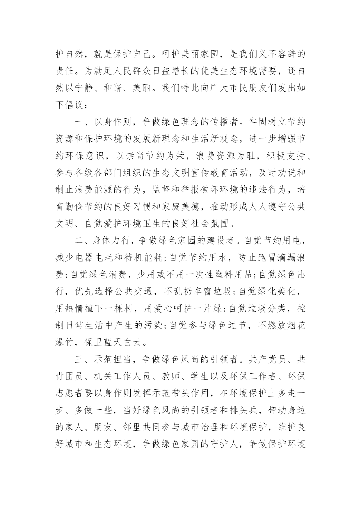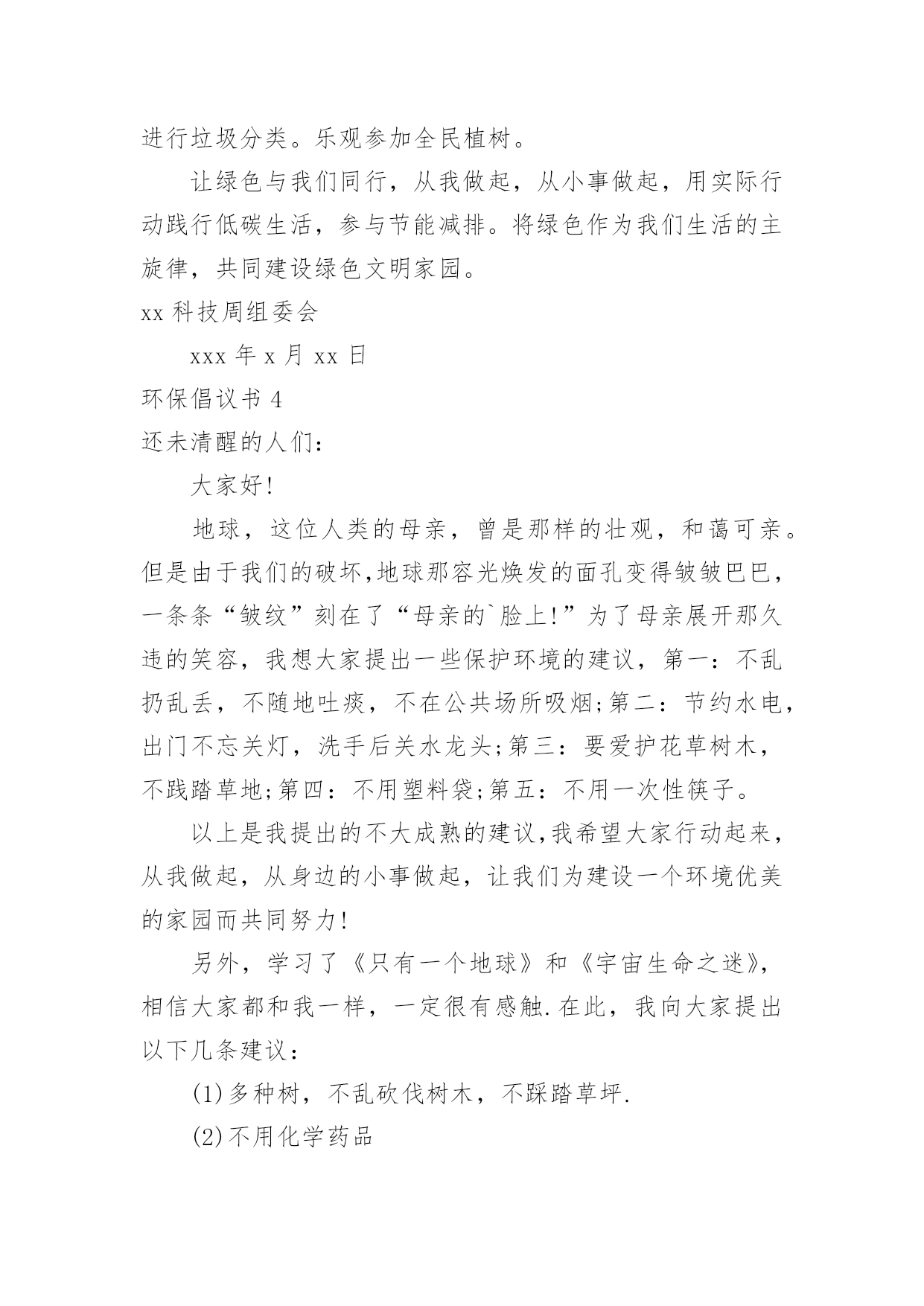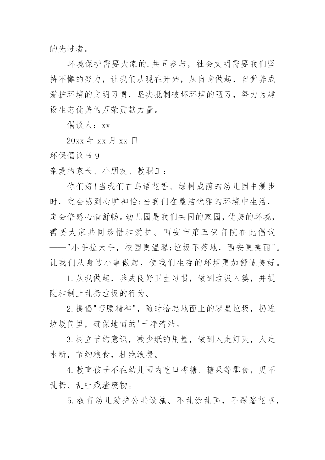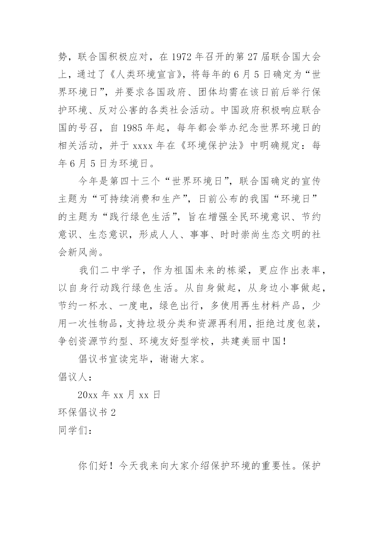 环保倡议书环保倡议书(优选)在现在的社会生活中,我们都跟倡议书有着直接或间接的联系,倡议书作为一种公开提议性的专用书信,其在写作上有一定的规范。相信很多朋友都对写倡议书感到非常苦恼吧,下面是小编精心整理的环保倡议书,仅供参考,希望能够帮助到大家。环保倡议书1各位老师,同学们:大家好,我是学生会秘书处秘书长高二四班赵##。今天我代表学生会全体成员向全体师生发出倡议,主题是“绿色生活,从我做起。”地球孕育万物,是所有生命的起源。然而近百年来,由于人类采取了乱砍滥伐、竭泽而渔等不科学的发展方式,地球生态系统正滑向不可恢复的临界点:酸雨肆虐,森林锐减,土地荒漠化,臭氧层损耗,越境转移的危险废物,堆积如山的一次性饭盒……联合国规划署相关人员表示:“如果我们仍旧保持当前的.消费习惯和生产模式,人口增长速度也保持不变,那么到20xx年时全球人口数量将会达到96亿,届时将需要3颗地球才能继续人类的生活。”这些数据触目惊心,这些现实令人心痛。面对严峻的形势,联合国积极应对,在1972年召开的第27届联合国大会上,通过了《人类环境宣言》,将每年的6月5日确定为“世界环境日”,并要求各国政府、团体均需在该日前后举行保护环境、反对公害的各类社会活动。中国政府积极响应联合国的号召,自1985年起,每年都会举办纪念世界环境日的相关活动,并于xxxx年在《环境保护法》中明确规定:每年6月5日为环境日。今年是第四十三个“世界环境日”,联合国确定的宣传主题为“可持续消费和生产”,日前公布的我国“环境日”的主题为“践行绿色生活”,旨在增强全民环境意识、节约意识、生态意识,形成人人、事事、时时崇尚生态文明的社会新风尚。我们二中学子,作为祖国未来的栋梁,更应作出表率,以自身行动践行绿色生活。从自身做起,从身边小事做起,节约一杯水、一度电,绿色出行,多使用再生材料产品,少用一次性物品,支持垃圾分类和资源再利用,拒绝过度包装,争创资源节约型、环境友好型学校,共建美丽中国!倡议书宣读完毕,谢谢大家。倡议人:20xx年xx月xx日环保倡议书2同学们:你们好!今天我来向大家介绍保护环境的重要性。保护环境已刻不容缓,因为现在环境污染问题严重。为了地球,为了人类的将来,也为了让我们永远拥有一个美好的.生存环境,真诚地向大家发出如下倡议:1、以节水为荣――随时关紧水龙头,别让水空流。2、以节电为荣――省一度电,少一分污染,多一分贡献。3、以节粮为荣――爱惜粮食,让节俭美德代代传。4、珍惜纸张――参加植树造林,保护森林资源。记住,保护环境、保护地球,就是保护我们自己!倡议人:日期:环保倡议书3我们倡议:关注生活中衣食住行用等各方面的细节,“践行低碳畅享生活”。1、衣。少买不必要的衣服,接受节能方式洗衣。2、食。合理膳食,不铺张粮食。少饮酒,不吸烟。3、住。节能装修。合理使用空调,电风扇,合理采暖,提倡使用太阳能。接受节能的家庭照明和公共照明方式。4、行。尽量使用公共交通工具、自行车或步行,少开私家车。科学用车,留意保养。5、用。用布袋取代塑料袋,削减一次性用品的.使用。尽量少用电梯。使用冰箱留意节能,电器等留意适时断电。节约用水。6、削减使用过度包装物。削减城市生活垃圾,按规定进行垃圾分类。乐观参加全民植树。让绿色与我们同行,从我做起,从小事做起,用实际行动践行低碳生活,参与节能减排。将绿色作为我们生活的主旋律,共同建设绿色文明家园。xx科技周组委会xxx年x月xx日环保倡议书4还未清醒的人们:大家好!地球,这位人类的母亲,曾是那样的壮观,和蔼可亲。但是由于我们的破坏,地球那容光焕发的面孔变得皱皱巴巴,一条条“皱纹”刻在了“母亲的`脸上!”为了母亲展开那久违的笑容,我想大家提出一些保护环境的建议,第一:不乱扔乱丢,不随地吐痰,不在公共场所吸烟;第二:节约水电,出门不忘关灯,洗手后关水龙头;第三:要爱护花草树木,不践踏草地;第四:不用塑料袋;第五:不用一次性筷子。以上是我提出的不大成熟的建议,我希望大家行动起来,从我做起,从身边的小事做起,让我们为建设一个环境优美的家园而共同努力!另外,学习了《只有一个地球》和《宇宙生命之迷》,相信大家都和我一样,一定很有感触.在此,我向大家提出以下几条建议:(1)多种树,不乱砍伐树木,不踩踏草坪.(2)不用化学药品(3)立一些保护环境的标牌(4)爱护野生动物(5)珍惜水源,不浪费(6)地上有纸随手捡起来,能做到的事就要做地球只有一个,我们要好好爱护它,保护它.从我做起,从现在做起,节约各种资源,将使我们的生活更美好,更健康!签名:x日期:年月日环保倡议书5还未清醒的人们:大家好!地球,这位人类的母亲,曾是那样的壮观,和蔼可亲,但是由于我们的破坏,地球那容光焕发的面孔变得皱皱巴巴,一条条“皱纹”刻在了“母亲的`脸上!”为了母亲展开那久违的笑容,我想