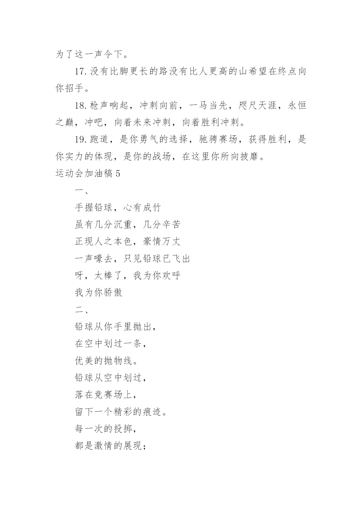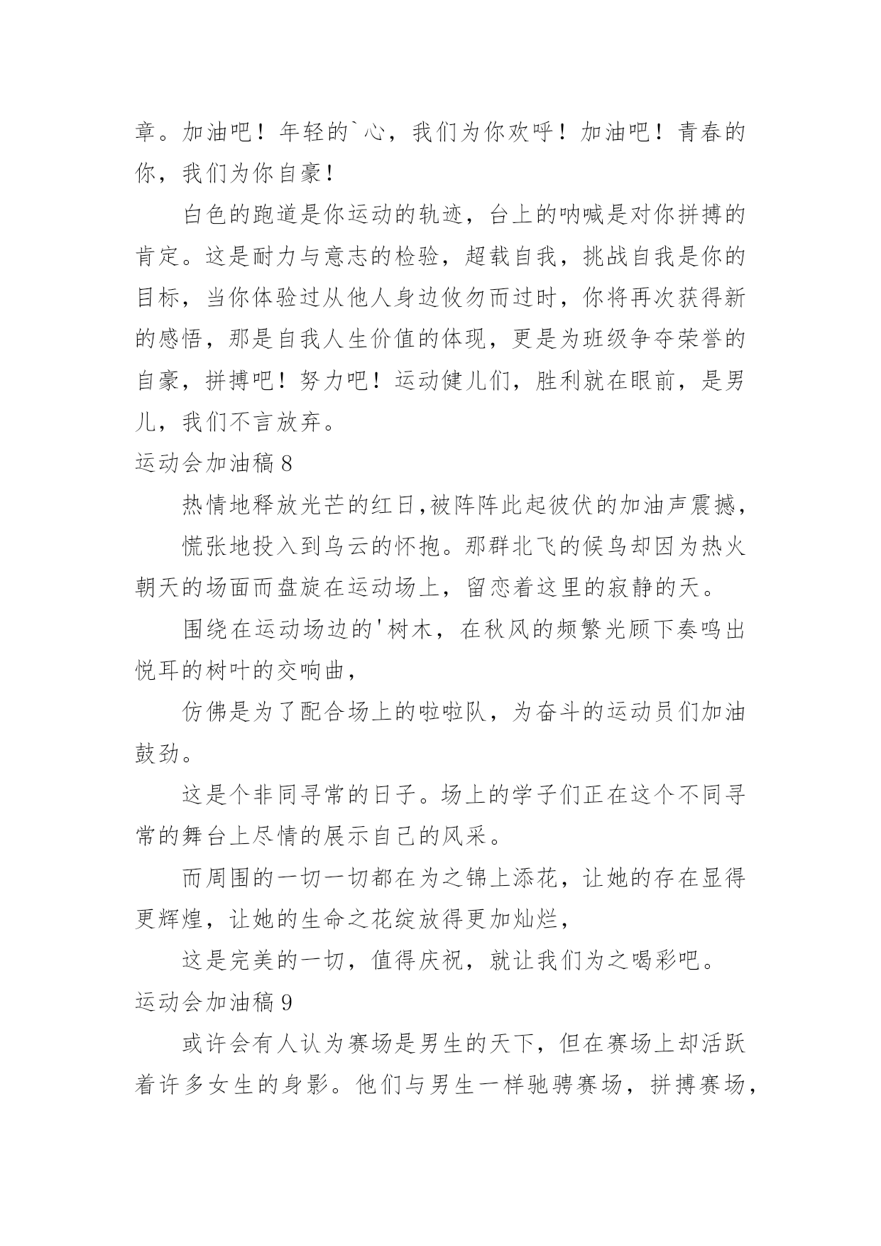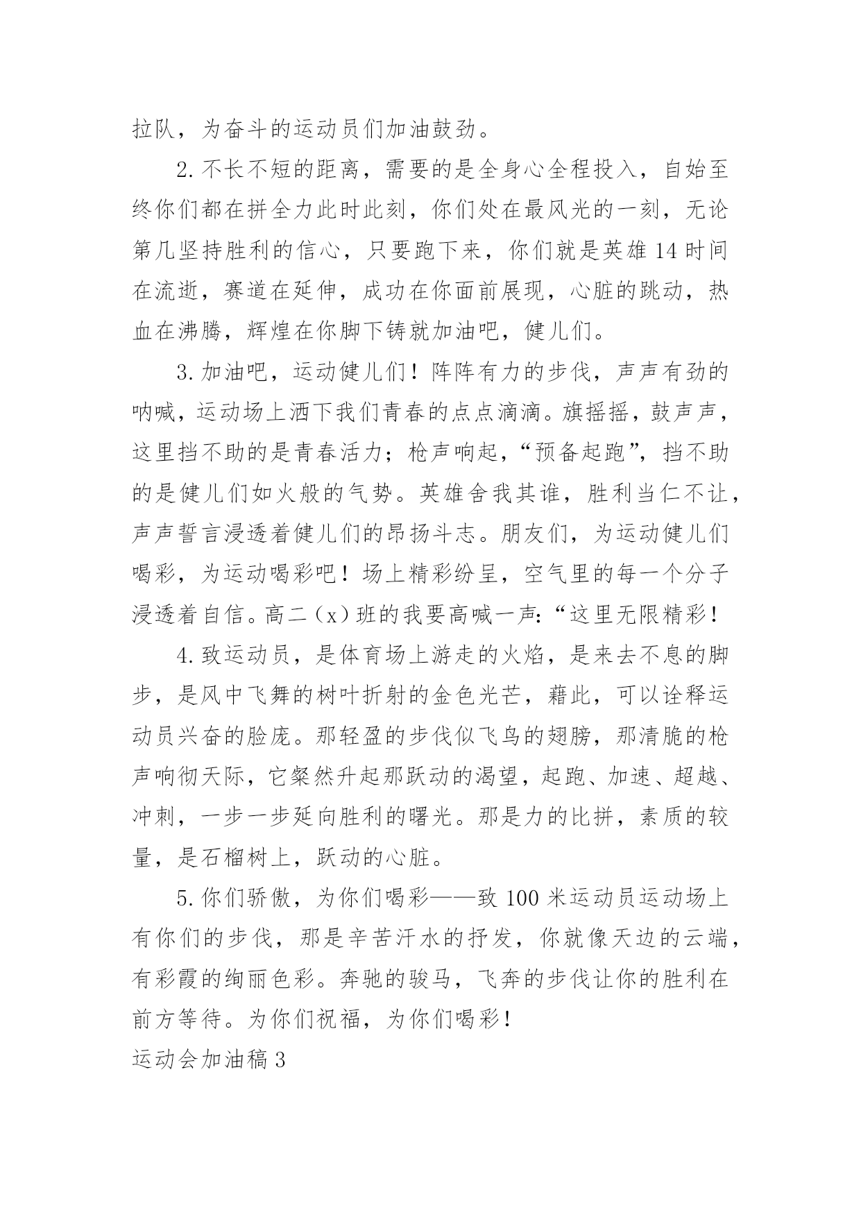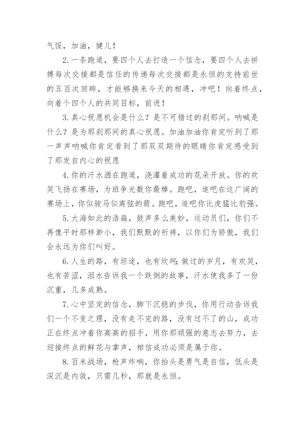 运动会加油稿运动会加油稿集锦15篇在现实社会中,接触并使用加油稿的人越来越多,加油稿可以起到鼓励场上的人、增添其信心的作用。那要怎么写好加油稿呢?以下是小编整理的运动会加油稿,欢迎大家分享。运动会加油稿1跳远,又名急行跳远,田径运动跳跃项目。由助跑、起跳、腾空和落地等动作组合而成。运动员沿直线助跑,在起跳板前沿线后用单足起跳,经腾空阶段,然后用双足在沙坑落下,比赛时以跳的远度决定名次。生活中,我们每天都在尝试尝试中,我们走向成功品味失败,走过心灵的阴雨晴空运动员们,不要放弃尝试无论失败与否重要的是你勇于参与的精神,付出的`背后是胜利无论是否成功,你那优美的身姿一直都在,我们永远赞美。运动会加油稿21.热情地释放光芒的红日,被阵阵此起彼伏的加油声震撼,慌张地投入到乌云的怀抱。那群北飞的候鸟却因为热火朝天的场面而盘旋在运动场上,留恋着这里与寂静的天空截然不同的热闹。围绕在运动场边的树木,在秋风的频繁光顾下奏鸣出悦耳的.树叶的交响曲,仿佛是为了配合场上的拉拉队,为奋斗的运动员们加油鼓劲。2.不长不短的距离,需要的是全身心全程投入,自始至终你们都在拼全力此时此刻,你们处在最风光的一刻,无论第几坚持胜利的信心,只要跑下来,你们就是英雄14时间在流逝,赛道在延伸,成功在你面前展现,心脏的跳动,热血在沸腾,辉煌在你脚下铸就加油吧,健儿们。3.加油吧,运动健儿们!阵阵有力的步伐,声声有劲的呐喊,运动场上洒下我们青春的点点滴滴。旗摇摇,鼓声声,这里挡不助的是青春活力;枪声响起,“预备起跑”,挡不助的是健儿们如火般的气势。英雄舍我其谁,胜利当仁不让,声声誓言浸透着健儿们的昂扬斗志。朋友们,为运动健儿们喝彩,为运动喝彩吧!场上精彩纷呈,空气里的每一个分子浸透着自信。高二(x)班的我要高喊一声:“这里无限精彩!4.致运动员,是体育场上游走的火焰,是来去不息的脚步,是风中飞舞的树叶折射的金色光芒,藉此,可以诠释运动员兴奋的脸庞。那轻盈的步伐似飞鸟的翅膀,那清脆的枪声响彻天际,它粲然升起那跃动的渴望,起跑、加速、超越、冲刺,一步一步延向胜利的曙光。那是力的比拼,素质的较量,是石榴树上,跃动的心脏。5.你们骄傲,为你们喝彩——致100米运动员运动场上有你们的步伐,那是辛苦汗水的抒发,你就像天边的云端,有彩霞的绚丽色彩。奔驰的骏马,飞奔的步伐让你的胜利在前方等待。为你们祝福,为你们喝彩!运动会加油稿3放飞理想,放飞激情,勇往直前,永不言败!xx班正踏着朝阳,激情豪迈地走过来;这,是一个奋发向上,充满朝气的班级,他们步伐矫健,精神抖擞,在向你我庄严的宣告:xx班,本届运动会上最亮丽的风景线!我们同欢乐,我们共追求,我们驰骋赛场,挥洒豪迈,让我们的热血无悔的沸腾吧!加油吧!运动健儿们!胜利,将与我们xx班同在!不长不短的.距离,需要的是全身心全程投入,自始至终你们都在拼尽全力,此时此刻,你们处在最风光的一刻,无论第几坚持胜利的信心,只要跑下来,你们就是英雄。时间在流逝,赛道在延伸,成功在你面前展现,心脏在跳动,热血在沸腾,辉煌在你脚下铸就。加油吧,健儿们。运动会加油稿41.坚定而又有力量,眼睛看着的不是眼前的跑道,而是那最终的目标,不管汗洒如雨,步伐迟缓到后,不退缩,不气馁,加油,健儿!2.一条跑道,要四个人去打造一个信念,要四个人去拼搏每次交接都是信任的传递每次交接都是永恒的支持前世的五百次回眸,才能够换来今天的相遇,冲吧!向着终点,向着个四个人的共同目标,前进!3.真心祝愿机会是什么?是不可错过的刹那间。呐喊是什么?是为那刹那间的真心祝愿。加油加油你肯定听到了那一声声呐喊你肯定看到了那双双期待的眼睛你肯定感受到了那发自内心的祝愿4.你的汗水洒在跑道,浇灌着成功的花朵开放。你的欢笑飞扬在赛场,为班争光数你最棒。跑吧,追吧在这广阔的赛场上,你似骏马似离弦的箭。跑吧,追吧你比虎猛比豹强。5.大海如此的浩淼,鼓声多么美妙,运动员们,你们不再像平时那样渺小,我们默默的祈祷,以你们为骄傲,我们会永远为你们叫好。6.人生的路,有坦途,也有坎坷;做过的岁月,有欢笑,也有苦涩,泪水告诉我一个跌倒的故事,汗水使我多了一份沉重,几多成熟。7.心中坚定的信念,脚下沉稳的步伐,你用行动告诉我们一个不变之理,没有走不完的路,没有过不了的山,成功正在终点冲着你高高的招手,用你那顽强的意志去努力,去迎接终点的鲜花与掌声,相信成功必须是属于你。8.百米战场,枪声炸响,你抬头是勇气是自信,低头是深沉是内敛,只需几秒,那就是永恒。9.100只是一道过场,几秒钟转瞬即逝,但是这背后承载的是多少成败,加油吧,少年。10.你的风姿,你的呼吸还有你呼啸而过的飓风,今天注定是属于你的日子,今天你注定将要创造辉煌。11.你的汗水洒在跑道,浇灌着成功的花朵开放;你的欢笑飞扬在赛场,为班争光数你最棒;跑吧,