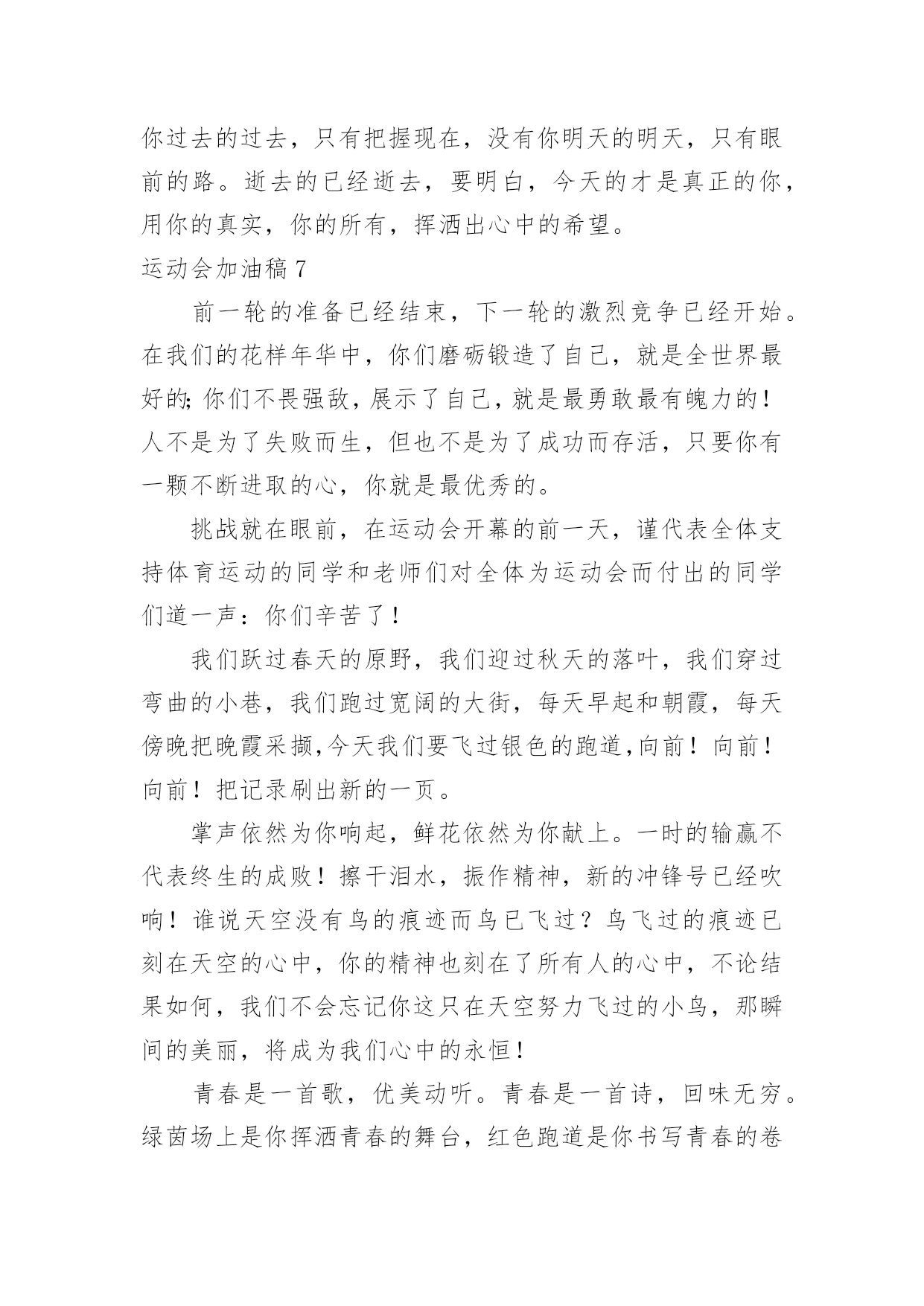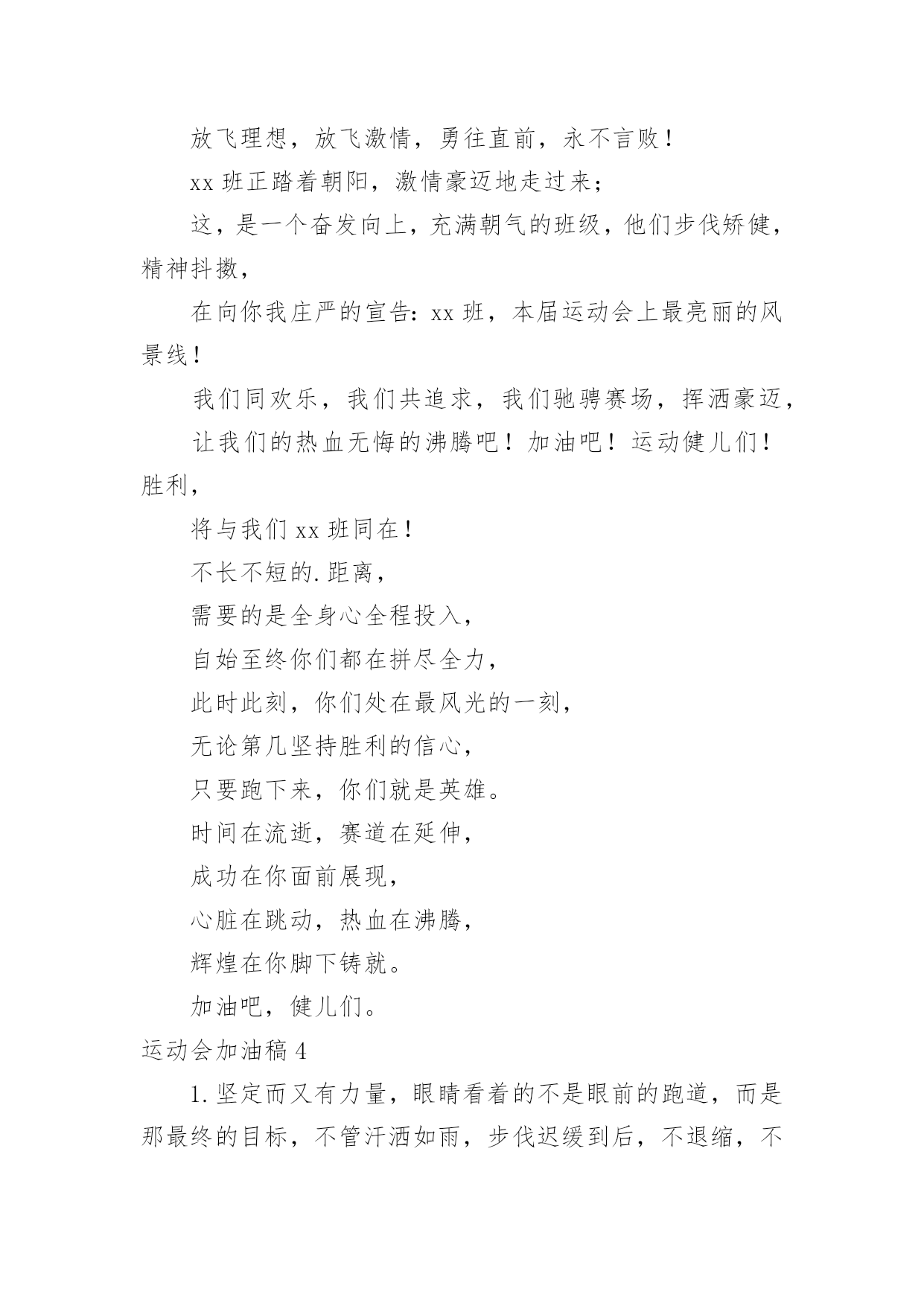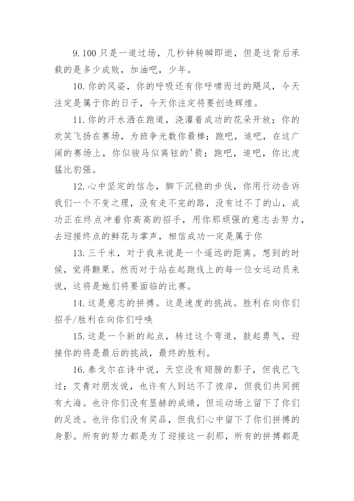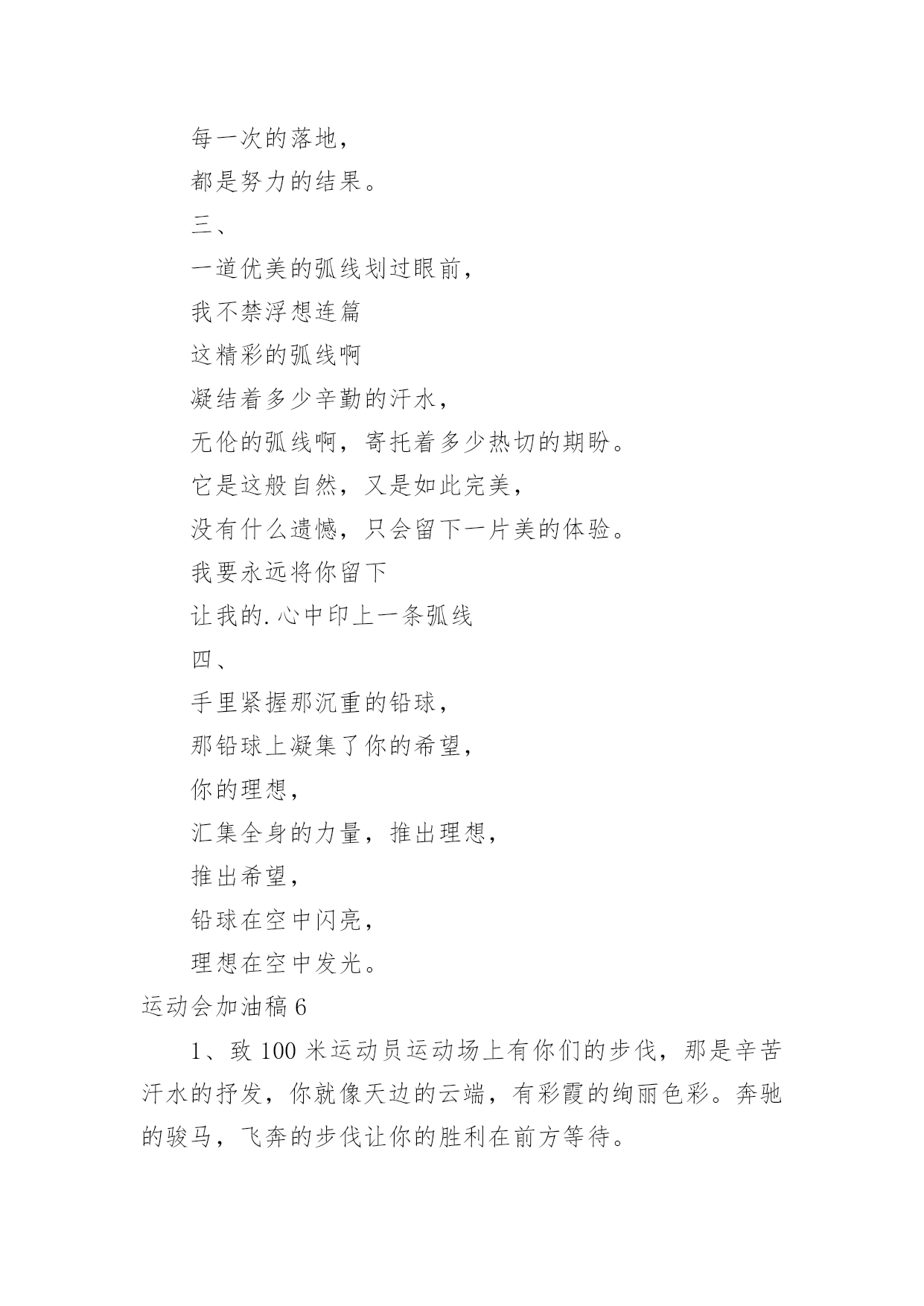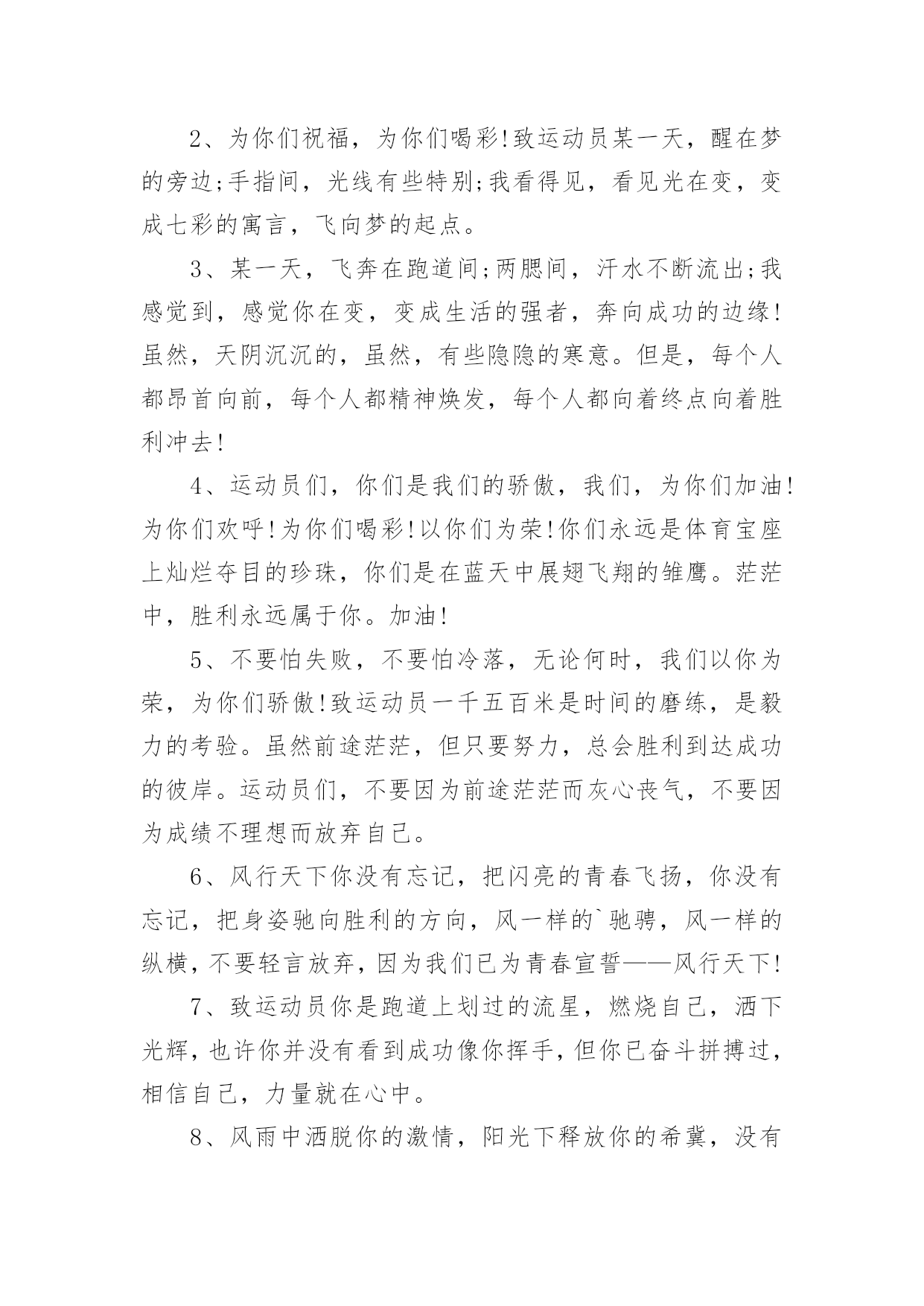 运动会加油稿运动会加油稿集锦15篇在现实社会中,接触并使用加油稿的人越来越多,加油稿可以起到鼓励场上的人、增添其信心的作用。那要怎么写好加油稿呢?以下是小编整理的运动会加油稿,欢迎大家分享。运动会加油稿1跳远,又名急行跳远,田径运动跳跃项目。由助跑、起跳、腾空和落地等动作组合而成。运动员沿直线助跑,在起跳板前沿线后用单足起跳,经腾空阶段,然后用双足在沙坑落下,比赛时以跳的远度决定名次。生活中,我们每天都在尝试尝试中,我们走向成功品味失败,走过心灵的阴雨晴空运动员们,不要放弃尝试无论失败与否重要的是你勇于参与的精神,付出的`背后是胜利无论是否成功,你那优美的身姿一直都在,我们永远赞美。运动会加油稿21.热情地释放光芒的红日,被阵阵此起彼伏的加油声震撼,慌张地投入到乌云的怀抱。那群北飞的候鸟却因为热火朝天的场面而盘旋在运动场上,留恋着这里与寂静的天空截然不同的热闹。围绕在运动场边的树木,在秋风的频繁光顾下奏鸣出悦耳的.树叶的交响曲,仿佛是为了配合场上的拉拉队,为奋斗的运动员们加油鼓劲。2.不长不短的距离,需要的是全身心全程投入,自始至终你们都在拼全力此时此刻,你们处在最风光的一刻,无论第几坚持胜利的信心,只要跑下来,你们就是英雄14时间在流逝,赛道在延伸,成功在你面前展现,心脏的跳动,热血在沸腾,辉煌在你脚下铸就加油吧,健儿们。3.加油吧,运动健儿们!阵阵有力的步伐,声声有劲的呐喊,运动场上洒下我们青春的点点滴滴。旗摇摇,鼓声声,这里挡不助的是青春活力;枪声响起,“预备起跑”,挡不助的是健儿们如火般的气势。英雄舍我其谁,胜利当仁不让,声声誓言浸透着健儿们的昂扬斗志。朋友们,为运动健儿们喝彩,为运动喝彩吧!场上精彩纷呈,空气里的每一个分子浸透着自信。高二(x)班的我要高喊一声:“这里无限精彩!4.致运动员,是体育场上游走的火焰,是来去不息的脚步,是风中飞舞的树叶折射的金色光芒,藉此,可以诠释运动员兴奋的脸庞。那轻盈的步伐似飞鸟的翅膀,那清脆的枪声响彻天际,它粲然升起那跃动的渴望,起跑、加速、超越、冲刺,一步一步延向胜利的曙光。那是力的比拼,素质的较量,是石榴树上,跃动的心脏。5.你们骄傲,为你们喝彩——致100米运动员运动场上有你们的步伐,那是辛苦汗水的抒发,你就像天边的云端,有彩霞的绚丽色彩。奔驰的骏马,飞奔的步伐让你的胜利在前方等待。为你们祝福,为你们喝彩!运动会加油稿3放飞理想,放飞激情,勇往直前,永不言败!xx班正踏着朝阳,激情豪迈地走过来;这,是一个奋发向上,充满朝气的班级,他们步伐矫健,精神抖擞,在向你我庄严的宣告:xx班,本届运动会上最亮丽的风景线!我们同欢乐,我们共追求,我们驰骋赛场,挥洒豪迈,让我们的热血无悔的沸腾吧!加油吧!运动健儿们!胜利,将与我们xx班同在!不长不短的.距离,需要的是全身心全程投入,自始至终你们都在拼尽全力,此时此刻,你们处在最风光的一刻,无论第几坚持胜利的信心,只要跑下来,你们就是英雄。时间在流逝,赛道在延伸,成功在你面前展现,心脏在跳动,热血在沸腾,辉煌在你脚下铸就。加油吧,健儿们。运动会加油稿41.坚定而又有力量,眼睛看着的不是眼前的跑道,而是那最终的目标,不管汗洒如雨,步伐迟缓到后,不退缩,不气馁,加油,健儿!2.一条跑道,要四个人去打造一个信念,要四个人去拼搏每次交接都是信任的传递每次交接都是永恒的支持前世的五百次回眸,才能够换来今天的相遇,冲吧!向着终点,向着个四个人的共同目标,前进!3.真心祝愿机会是什么?是不可错过的刹那间。呐喊是什么?是为那刹那间的真心祝愿。加油加油你肯定听到了那一声声呐喊你肯定看到了那双双期待的眼睛你肯定感受到了那发自内心的祝愿4.你的汗水洒在跑道,浇灌着成功的花朵开放。你的欢笑飞扬在赛场,为班争光数你最棒。跑吧,追吧在这广阔的赛场上,你似骏马似离弦的箭。跑吧,追吧你比虎猛比豹强。5.大海如此的浩淼,鼓声多么美妙,运动员们,你们不再像平时那样渺小,我们默默的祈祷,以你们为骄傲,我们会永远为你们叫好。6.人生的路,有坦途,也有坎坷;做过的岁月,有欢笑,也有苦涩,泪水告诉我一个跌倒的故事,汗水使我多了一份沉重,几多成熟。7.心中坚定的信念,脚下沉稳的步伐,你用行动告诉我们一个不变之理,没有走不完的路,没有过不了的山,成功正在终点冲着你高高的招手,用你那顽强的意志去努力,去迎接终点的鲜花与掌声,相信成功必须是属于你。8.百米战场,枪声炸响,你抬头是勇气是自信,低头是深沉是内敛,只需几秒,那就是永恒。9.100只是一道过场,几秒钟转瞬即逝,但是这背后承载的是多少成败,加油吧,少年。10.你的风姿,你的呼吸还有你呼啸而过的飓风,今天注定是属于你的日子,今天你注定将要创造辉煌。11.你的汗水洒在跑道,浇灌着成功的花朵开放;你的欢笑飞扬在赛场,为班争光数你最棒;跑吧,