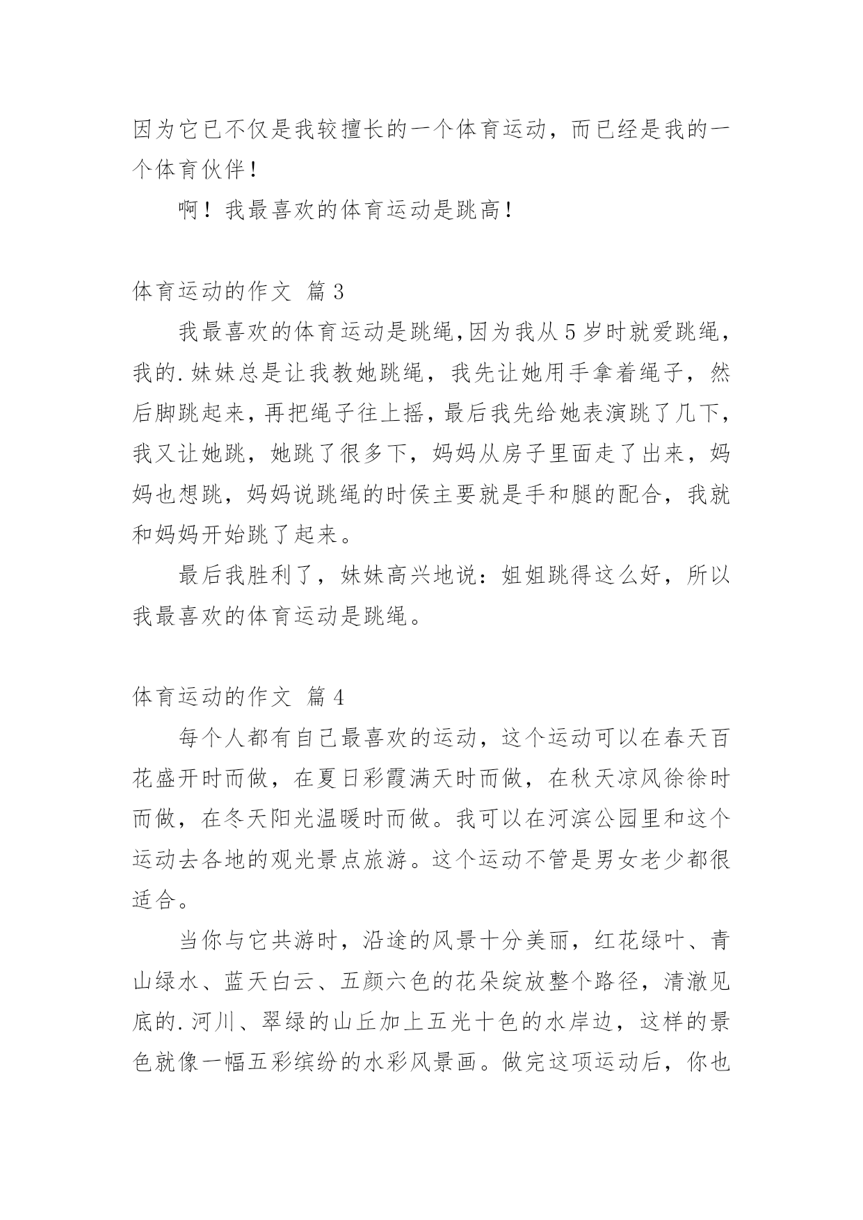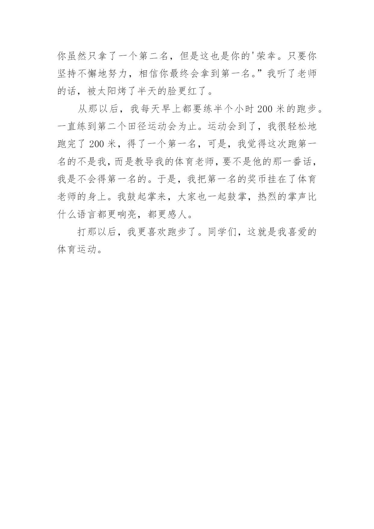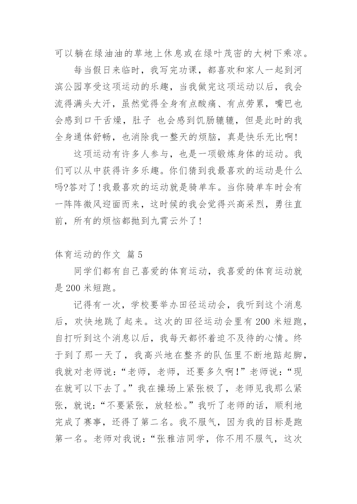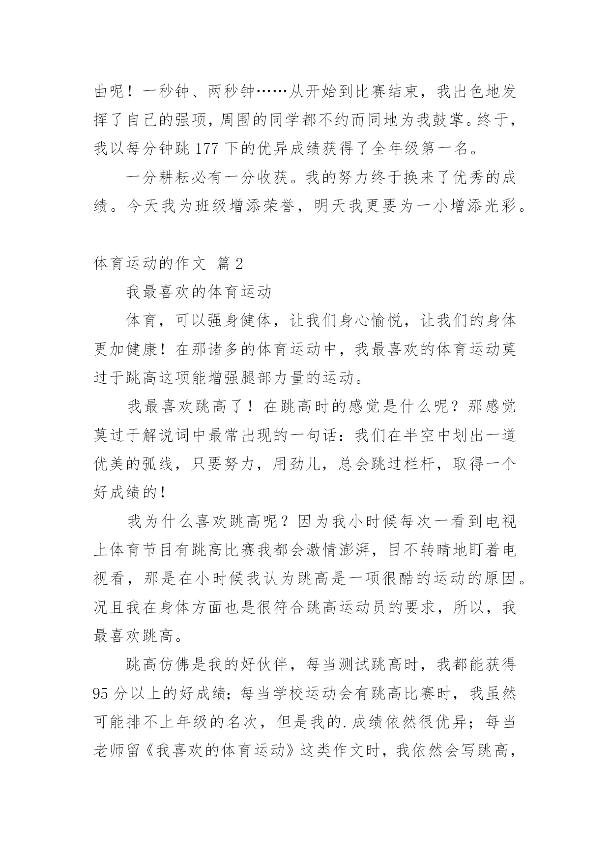 体育运动的作文在学习、工作、生活中,许多人都写过作文吧,写作文是培养人们的观察力、联想力、想象力、思考力和记忆力的重要手段。那么一般作文是怎么写的呢?以下是小编为大家整理的体育运动的作文6篇,希望对大家有所帮助。体育运动的作文篇1我喜欢运动,运动可以使我减轻学习的压力,使我拥有一个强健的身体,锻炼我的意志和耐力。我喜欢的运动很多,其中最喜欢的就是跳绳。记得读小学二年级时,我还在一小的分校区就读。当学校举行运动会时,我很幸运地被选上,成为一名跳绳运动员。由于在幼儿园时我已经学会了跳绳,所以我现在的主要任务就是如何加快自己的跳绳速度。为了班级的荣誉,我每天回家就苦练跳绳的基本功及技巧要领。每当练习遇到了挫折,我就暗暗在内心给自己鼓励,妈妈也不断为我鼓气。经过一次次的练习,功夫不负有心人,我的跳绳水平终于有了质的飞跃。比赛那天,我来到赛场,心里就像怀揣着一只小兔子,咚咚直跳。很快轮到我上场了,我首先稳定好情绪,然后做了几次深呼吸,双手紧紧握住绳子。“砰”,随着发令枪一声令下,我的.双手一上一下飞快地摆动,双脚也不停地有节奏地跳动,顿时响起了“啪啪”的声音,就像乐队在演奏乐曲呢!一秒钟、两秒钟……从开始到比赛结束,我出色地发挥了自己的强项,周围的同学都不约而同地为我鼓掌。终于,我以每分钟跳177下的优异成绩获得了全年级第一名。一分耕耘必有一分收获。我的努力终于换来了优秀的成绩。今天我为班级增添荣誉,明天我更要为一小增添光彩。体育运动的作文篇2我最喜欢的体育运动体育,可以强身健体,让我们身心愉悦,让我们的身体更加健康!在那诸多的体育运动中,我最喜欢的体育运动莫过于跳高这项能增强腿部力量的运动。我最喜欢跳高了!在跳高时的感觉是什么呢?那感觉莫过于解说词中最常出现的一句话:我们在半空中划出一道优美的弧线,只要努力,用劲儿,总会跳过栏杆,取得一个好成绩的!我为什么喜欢跳高呢?因为我小时候每次一看到电视上体育节目有跳高比赛我都会激情澎湃,目不转睛地盯着电视看,那是在小时候我认为跳高是一项很酷的运动的原因。况且我在身体方面也是很符合跳高运动员的要求,所以,我最喜欢跳高。跳高仿佛是我的好伙伴,每当测试跳高时,我都能获得95分以上的好成绩;每当学校运动会有跳高比赛时,我虽然可能排不上年级的名次,但是我的.成绩依然很优异;每当老师留《我喜欢的体育运动》这类作文时,我依然会写跳高,因为它已不仅是我较擅长的一个体育运动,而已经是我的一个体育伙伴!啊!我最喜欢的体育运动是跳高!体育运动的作文篇3我最喜欢的体育运动是跳绳,因为我从5岁时就爱跳绳,我的.妹妹总是让我教她跳绳,我先让她用手拿着绳子,然后脚跳起来,再把绳子往上摇,最后我先给她表演跳了几下,我又让她跳,她跳了很多下,妈妈从房子里面走了出来,妈妈也想跳,妈妈说跳绳的时侯主要就是手和腿的配合,我就和妈妈开始跳了起来。最后我胜利了,妹妹高兴地说:姐姐跳得这么好,所以我最喜欢的体育运动是跳绳。体育运动的作文篇4每个人都有自己最喜欢的运动,这个运动可以在春天百花盛开时而做,在夏日彩霞满天时而做,在秋天凉风徐徐时而做,在冬天阳光温暖时而做。我可以在河滨公园里和这个运动去各地的观光景点旅游。这个运动不管是男女老少都很适合。当你与它共游时,沿途的风景十分美丽,红花绿叶、青山绿水、蓝天白云、五颜六色的花朵绽放整个路径,清澈见底的.河川、翠绿的山丘加上五光十色的水岸边,这样的景色就像一幅五彩缤纷的水彩风景画。做完这项运动后,你也可以躺在绿油油的草地上休息或在绿叶茂密的大树下乘凉。每当假日来临时,我写完功课,都喜欢和家人一起到河滨公园享受这项运动的乐趣,当我做完这项运动以后,我会流得满头大汗,虽然觉得全身有点酸痛、有点劳累,嘴巴也会感到口干舌燥,肚子也会感到饥肠辘辘,但是此时的我全身通体舒畅,也消除我一整天的烦脑,真是快乐无比啊!这项运动有许多人参与,也是一项锻炼身体的运动。我们可以从中获得许多乐趣。你们猜到我最喜欢的运动是什么吗?答对了!我最喜欢的运动就是骑单车。当你骑单车时会有一阵阵微风迎面而来,这时候的我会觉得兴高采烈,勇往直前,所有的烦恼都抛到九霄云外了!体育运动的作文篇5同学们都有自己喜爱的体育运动,我喜爱的体育运动就是200米短跑。记得有一次,学校要举办田径运动会,我听到这个消息后,欢快地跳了起来。这次的田径运动会里有200米短跑,自打听到这个消息以后,我每天都怀着迫不及待的心情。终于到了那一天了,我高兴地在整齐的队伍里不断地踮起脚,我就对老师说:“老师,老师,还要多久啊!”老师说:“现在就可以下去了。”我在操场上紧张极了,老师见我那么紧张,就说:“不要紧张,放轻松。”我听了老师的话,顺利地完成了赛事,还得了第二名。我不服气,因为我的目标是跑第一名。老师对我说:“张雅洁同学,你不用不服气,这次你虽然只拿了一