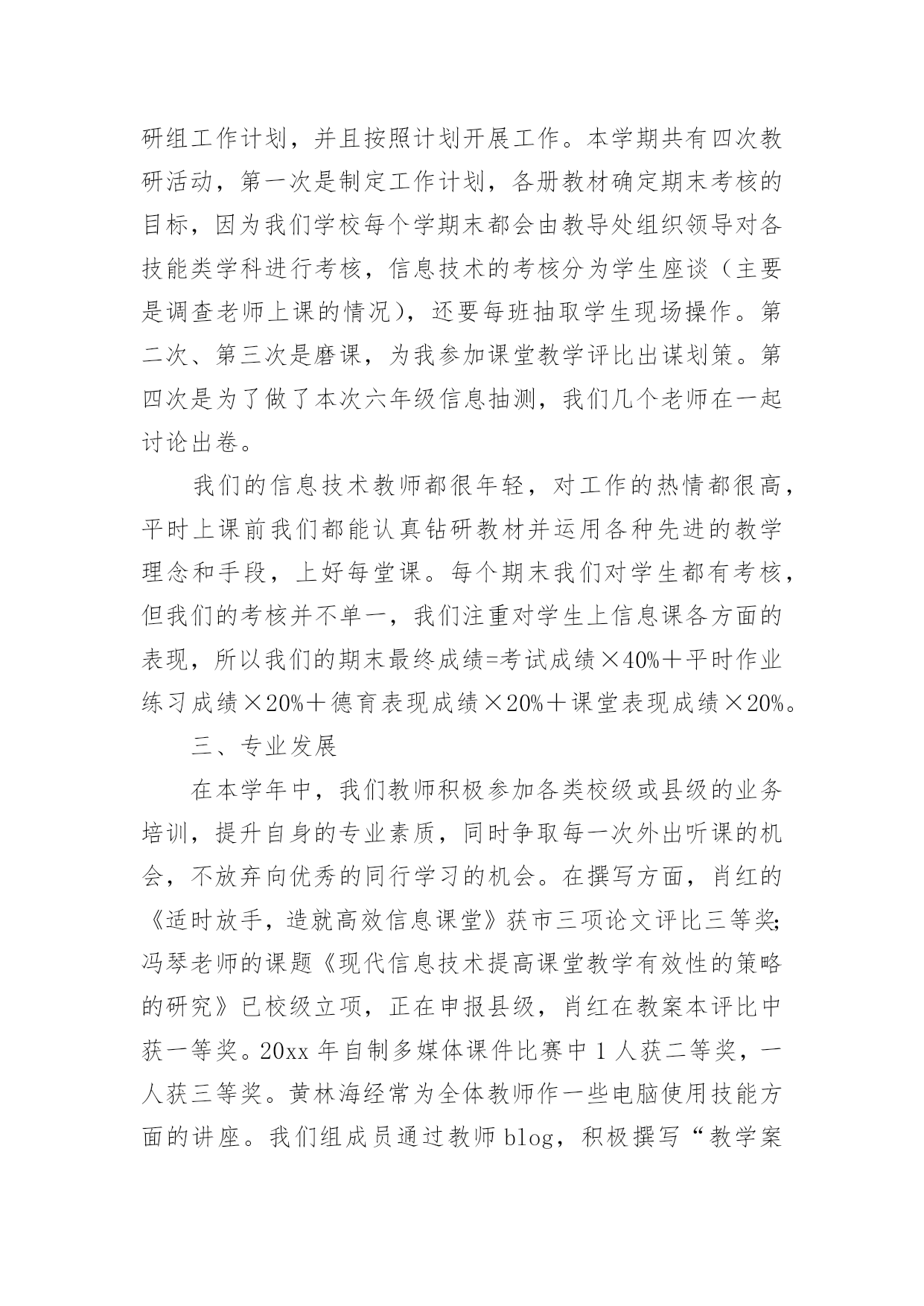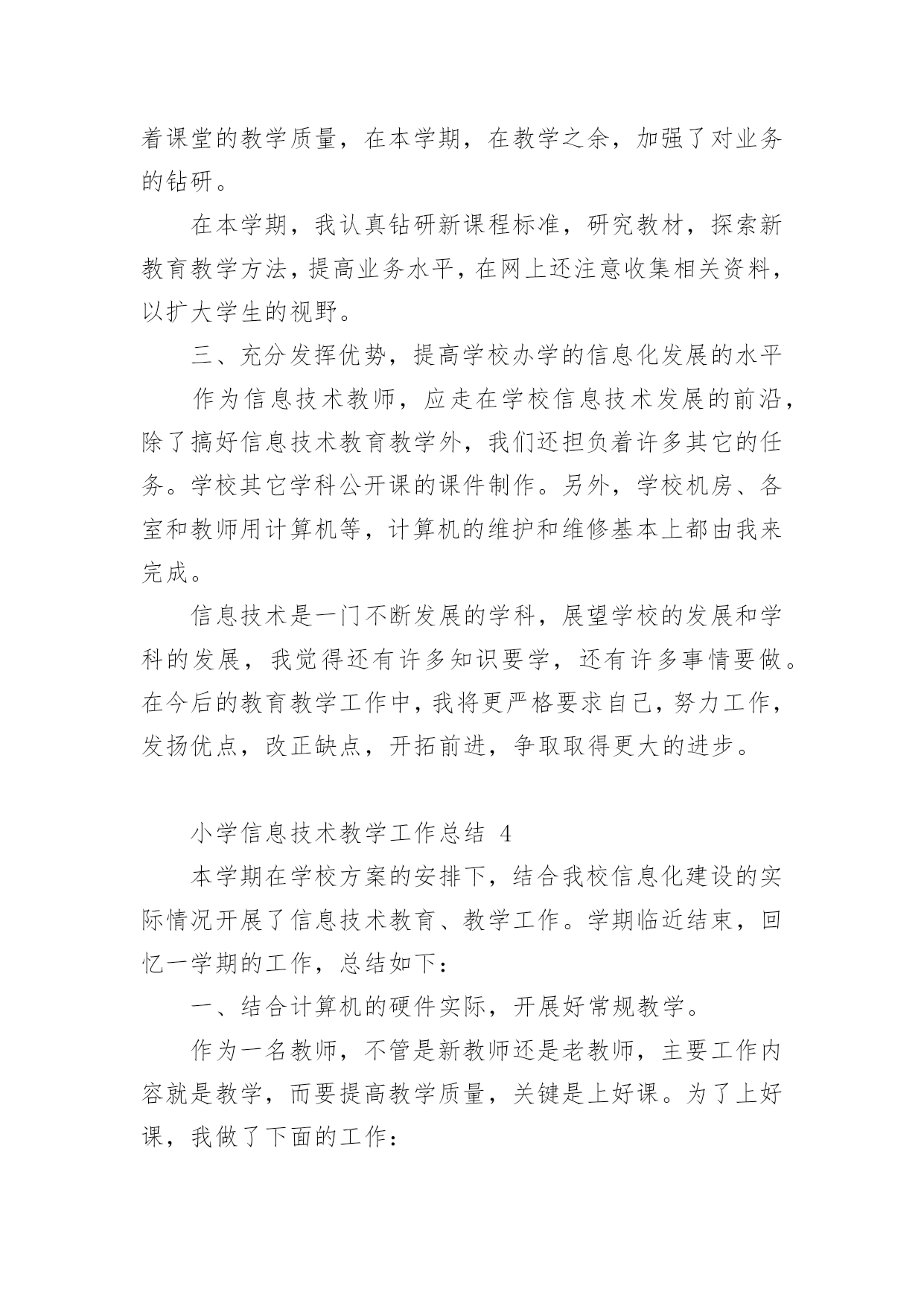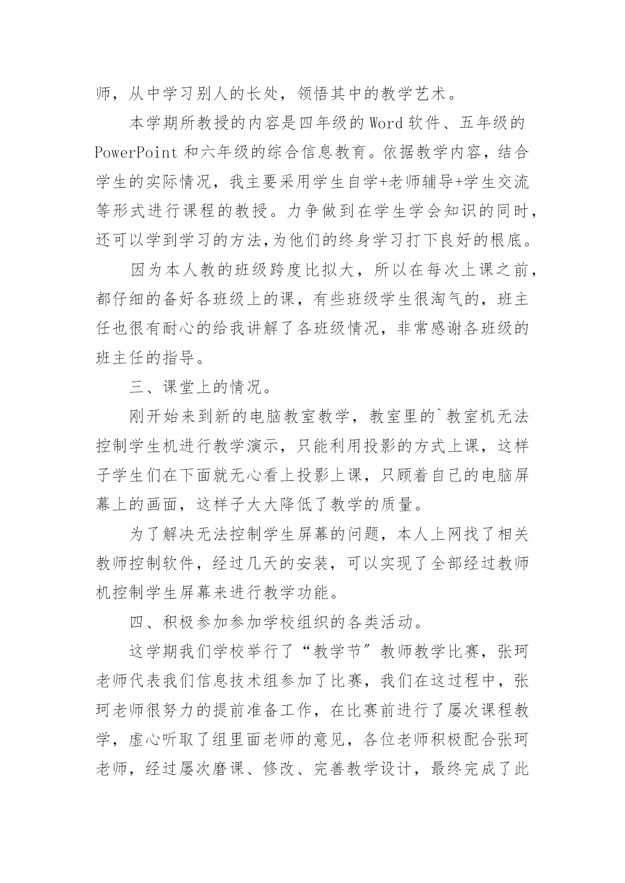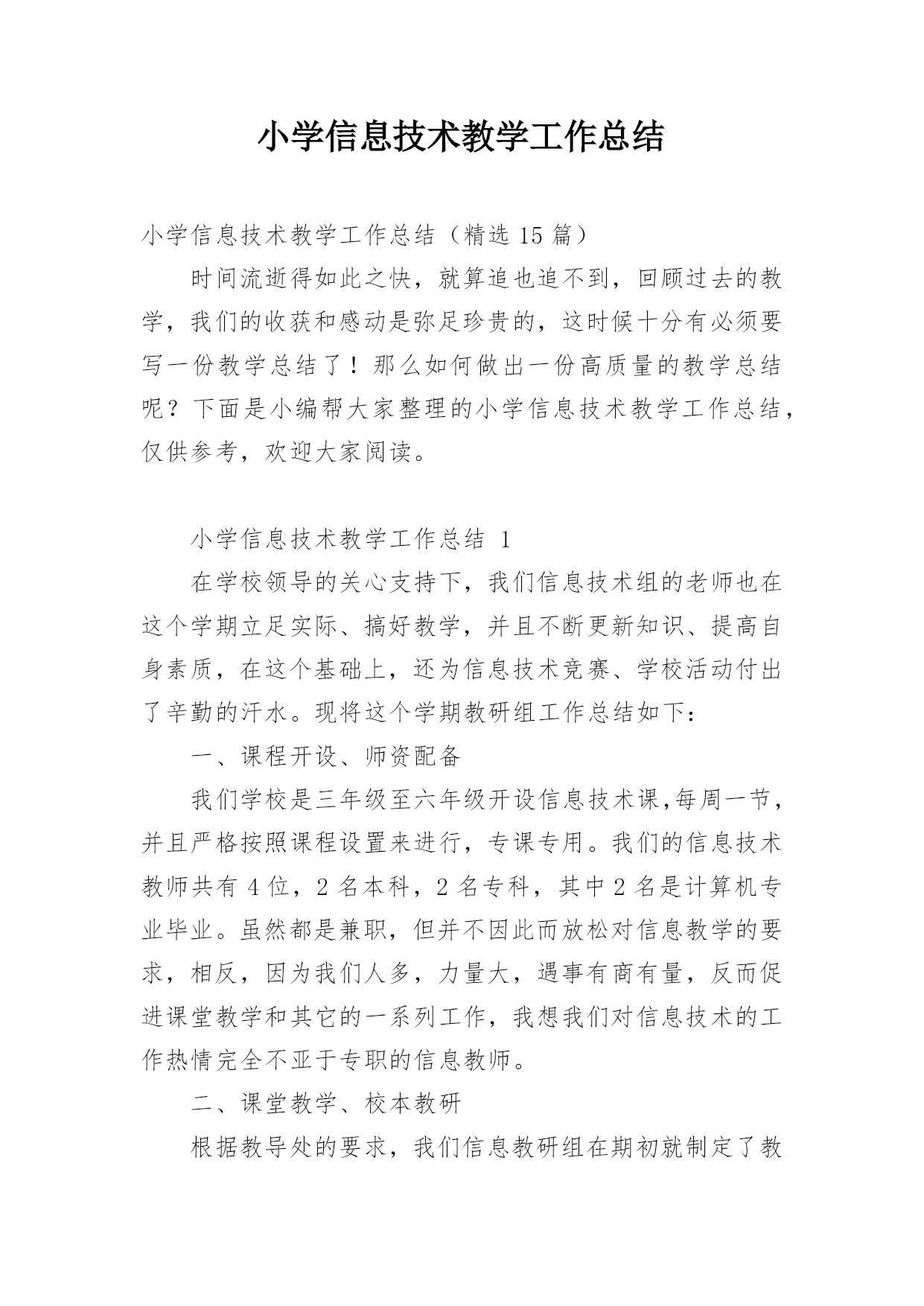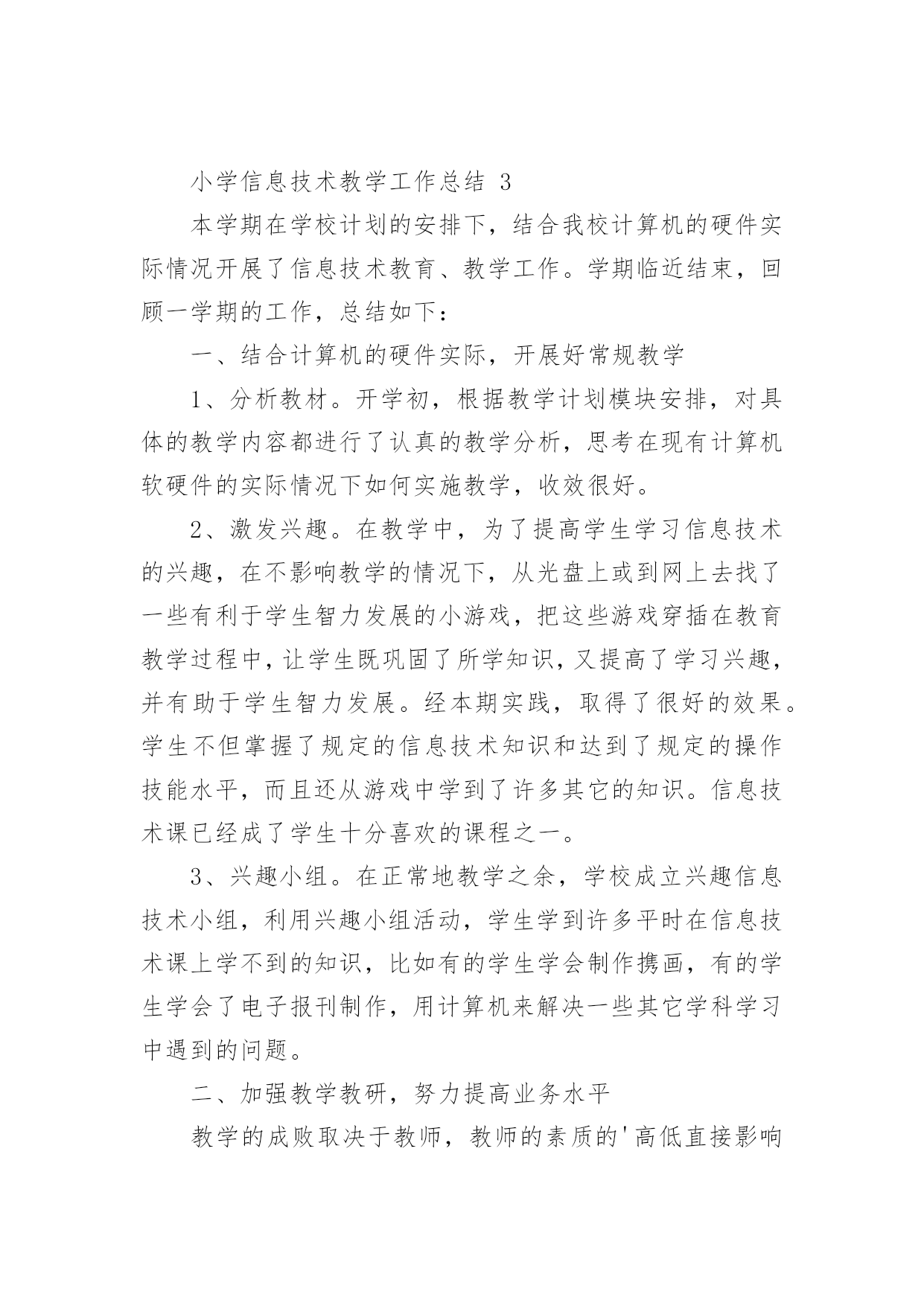 小学信息技术教学工作总结小学信息技术教学工作总结(精选15篇)时间流逝得如此之快,就算追也追不到,回顾过去的教学,我们的收获和感动是弥足珍贵的,这时候十分有必须要写一份教学总结了!那么如何做出一份高质量的教学总结呢?下面是小编帮大家整理的小学信息技术教学工作总结,仅供参考,欢迎大家阅读。小学信息技术教学工作总结1在学校领导的关心支持下,我们信息技术组的老师也在这个学期立足实际、搞好教学,并且不断更新知识、提高自身素质,在这个基础上,还为信息技术竞赛、学校活动付出了辛勤的汗水。现将这个学期教研组工作总结如下:一、课程开设、师资配备我们学校是三年级至六年级开设信息技术课,每周一节,并且严格按照课程设置来进行,专课专用。我们的信息技术教师共有4位,2名本科,2名专科,其中2名是计算机专业毕业。虽然都是兼职,但并不因此而放松对信息教学的要求,相反,因为我们人多,力量大,遇事有商有量,反而促进课堂教学和其它的一系列工作,我想我们对信息技术的工作热情完全不亚于专职的信息教师。二、课堂教学、校本教研根据教导处的要求,我们信息教研组在期初就制定了教研组工作计划,并且按照计划开展工作。本学期共有四次教研活动,第一次是制定工作计划,各册教材确定期末考核的目标,因为我们学校每个学期末都会由教导处组织领导对各技能类学科进行考核,信息技术的考核分为学生座谈(主要是调查老师上课的情况),还要每班抽取学生现场操作。第二次、第三次是磨课,为我参加课堂教学评比出谋划策。第四次是为了做了本次六年级信息抽测,我们几个老师在一起讨论出卷。我们的信息技术教师都很年轻,对工作的热情都很高,平时上课前我们都能认真钻研教材并运用各种先进的教学理念和手段,上好每堂课。每个期末我们对学生都有考核,但我们的考核并不单一,我们注重对学生上信息课各方面的表现,所以我们的期末最终成绩=考试成绩×40%+平时作业练习成绩×20%+德育表现成绩×20%+课堂表现成绩×20%。三、专业发展在本学年中,我们教师积极参加各类校级或县级的业务培训,提升自身的专业素质,同时争取每一次外出听课的机会,不放弃向优秀的同行学习的机会。在撰写方面,肖红的《适时放手,造就高效信息课堂》获市三项论文评比三等奖;冯琴老师的课题《现代信息技术提高课堂教学有效性的策略的研究》已校级立项,正在申报县级,肖红在教案本评比中获一等奖。20xx年自制多媒体课件比赛中1人获二等奖,一人获三等奖。黄林海经常为全体教师作一些电脑使用技能方面的讲座。我们组成员通过教师blog,积极撰写“教学案例”、“教学反思”和“教育叙事”等等,不断提高自己的教学水平。四、亮点方面我们教研组成员积极承担公开课,在今年3月份县课堂教学评比中,肖红老师获二等奖。学校积级开展信息技术第二课堂活动,由冯琴老师带的信息社团每周活动两次,时间保证,(因为每天值日教师会检查记录)每次活动有计划有目标,期末有考核,取得良好效果。要县第六届中小学信息技术现场作品赛中两名学生获二等奖。学校成立了由我们信息技术教师为主的现代技术服务小组,对学校的网络、多媒体设备日常维护与管理、校园网的建设等进行分工,责任到人,对于出现故障的'设备,得到及时维修,保证了教学使用,受到学校领导和教师的好评。黄林海还评为20xx年度教育装备管理与应用先进个人。五、存在问题今后思考1、我们学校有一个机房,共48台电脑,但最多的班级人数有56人,无法做到一人一机。2、作为我们教研组的成员,我们都有过一些收获,但是我们应该清醒的看到还存在不少有待提高的方面:如创新意识还要加强;计算机的维护技术有待于提高;对病毒的预见能力还要进一步加强,对工作的总结还不够及时,有些工作还不够主动。在接下来的工作中,我们信息教研组的全体老师会更加努力,力争在平凡的工作中体现人身价值,力争使我们的教研组做得更好。小学信息技术教学工作总结2回顾本学期,本人努力工作,认真学习新课标的教学体系和教学模式,转变教育思想和观念,以促进教学内容、教学方法的实施、全面提高教学质量和效益,根据实际制定各项计划,备好课,写好教案,并能够根据学生的年龄特点来设计上课的形式和内容,难易结合,使不同年龄段的学生都学得愉快、学得好。下面就结合自己的实际教学对这个学期的工作进行总结:一、注重培养学生学习电脑的兴趣、提高动手能力在讲课中要善于使用“启发式”和“探索式”的教学方法,形式应灵活多样,切忌“呆板”、“枯燥”。“练习”是一节课中学生掌握知识和巩固知识的主要渠道,练习的时间要充足,练习的内容要能充分体现本节课的教学内容,练习的形式要做到多样化,最终达到提高学生动手能力的目的。“用”是教学的最终目的,所谓“学以致用”。它可以是对某一节课所学知识的运用,也可以是对几节课,一个单元所学知识的综合运用。它可以穿插在“练习”之中,但又是在“练习”基