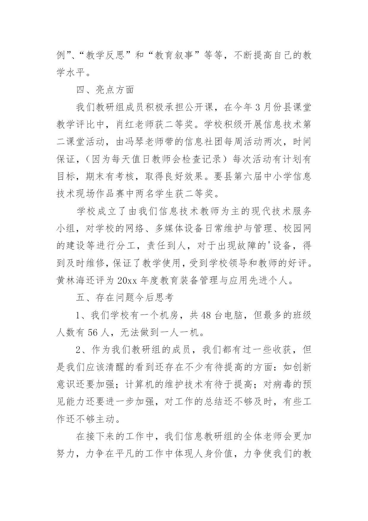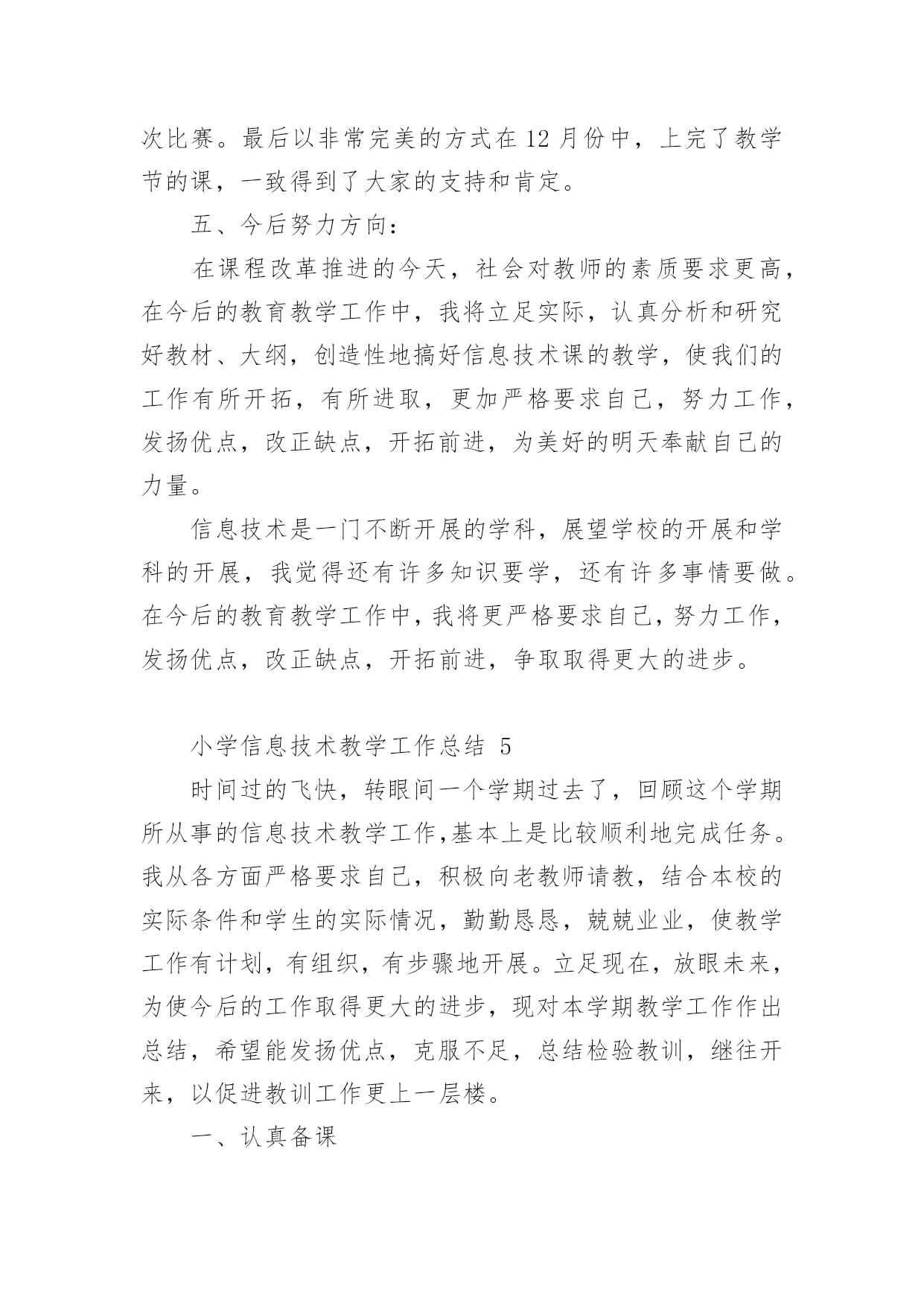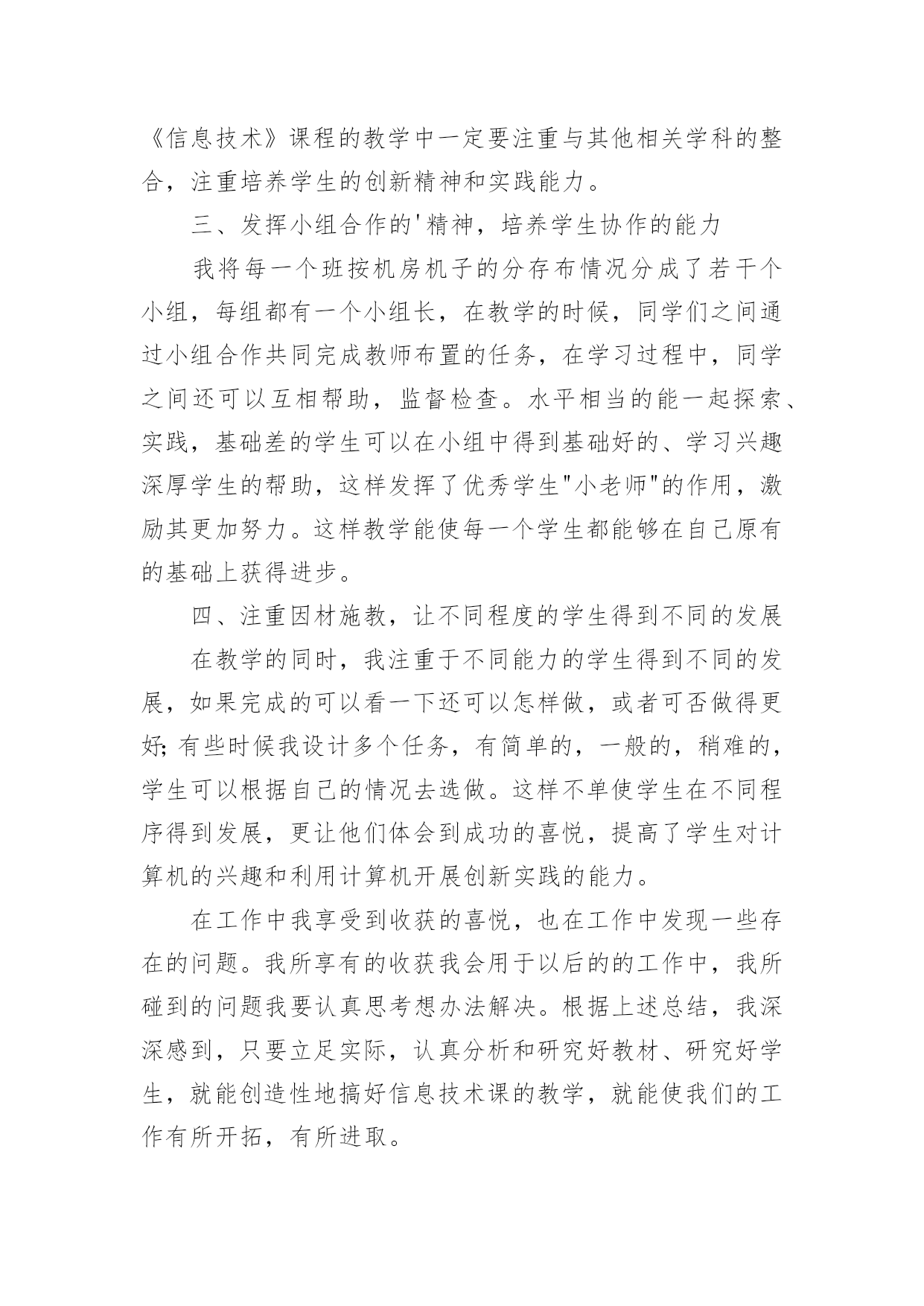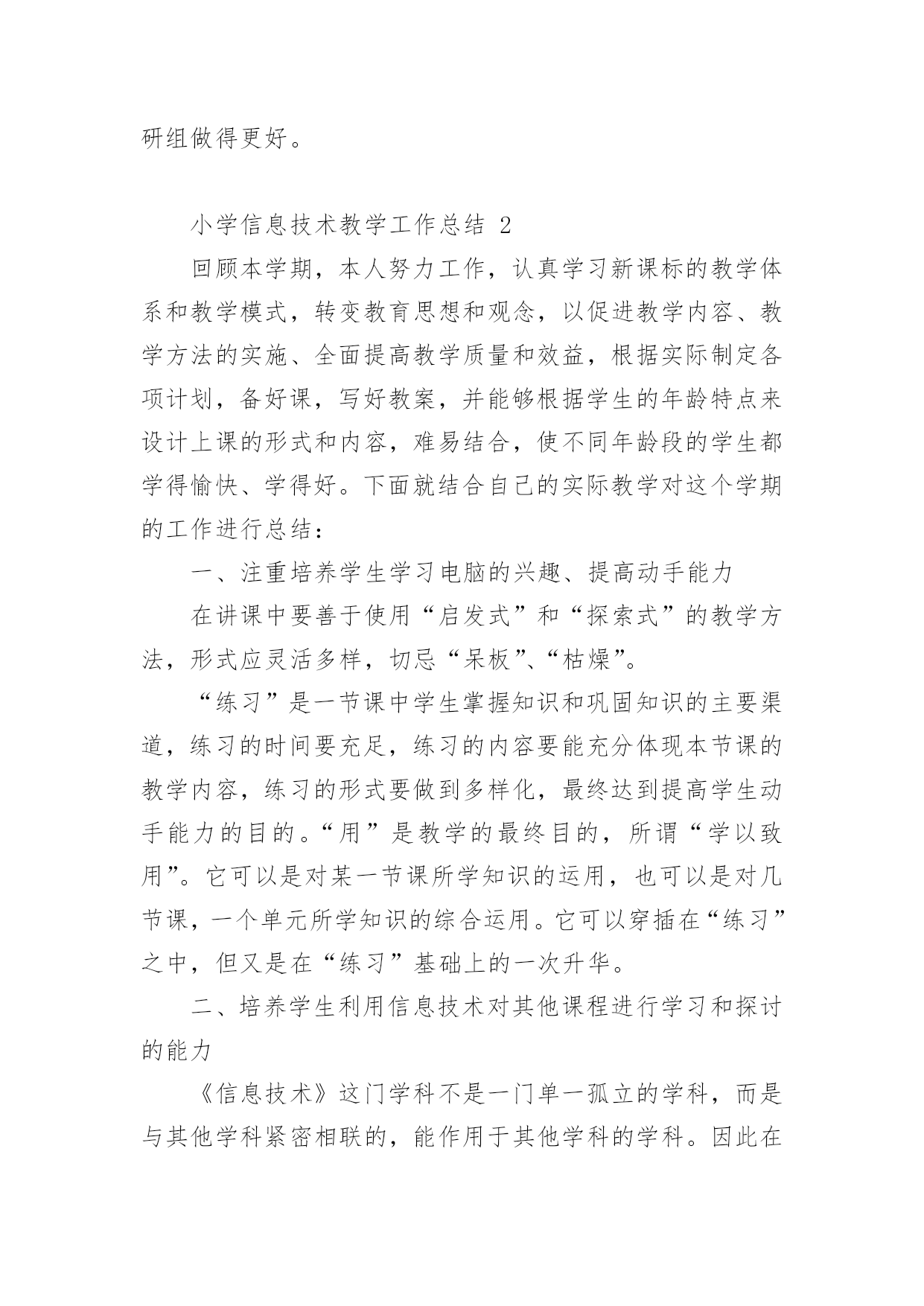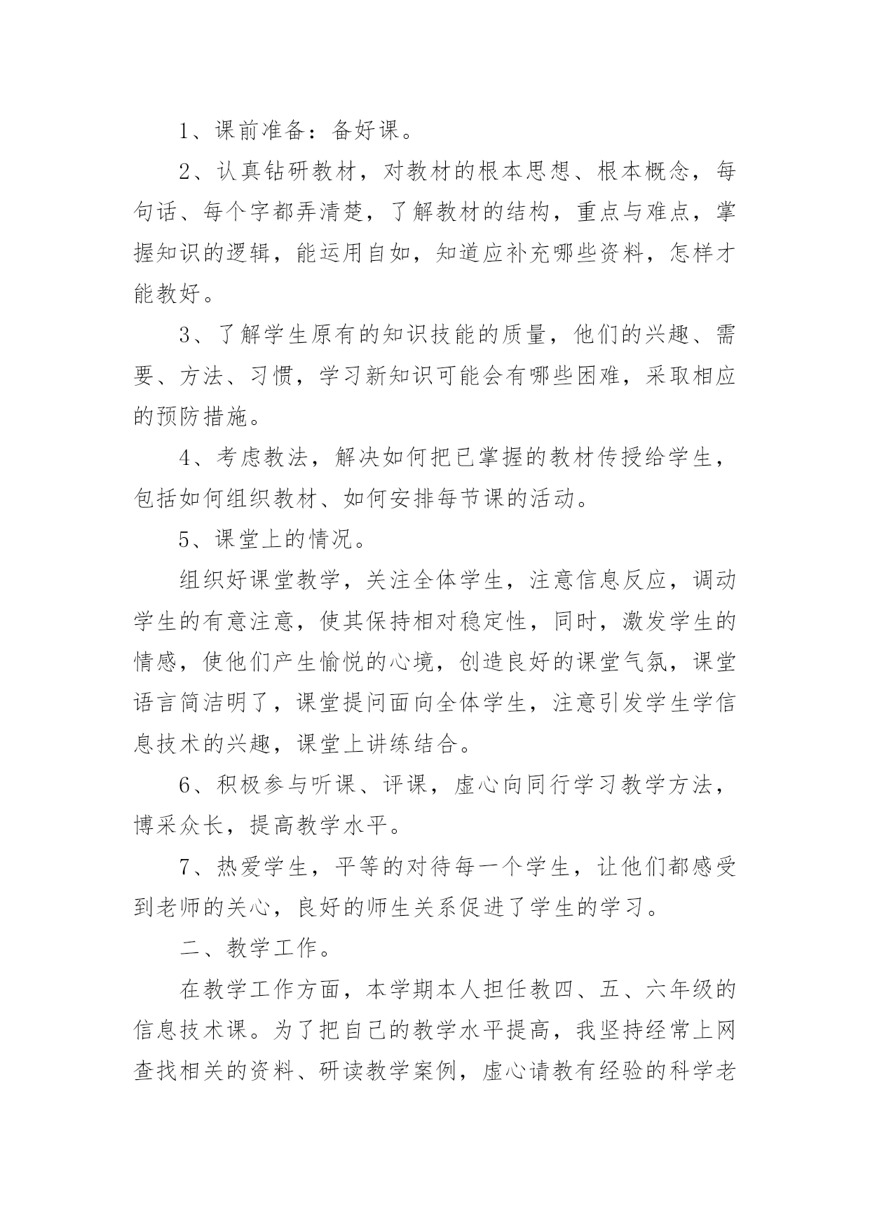 小学信息技术教学工作总结小学信息技术教学工作总结(精选15篇)时间流逝得如此之快,就算追也追不到,回顾过去的教学,我们的收获和感动是弥足珍贵的,这时候十分有必须要写一份教学总结了!那么如何做出一份高质量的教学总结呢?下面是小编帮大家整理的小学信息技术教学工作总结,仅供参考,欢迎大家阅读。小学信息技术教学工作总结1在学校领导的关心支持下,我们信息技术组的老师也在这个学期立足实际、搞好教学,并且不断更新知识、提高自身素质,在这个基础上,还为信息技术竞赛、学校活动付出了辛勤的汗水。现将这个学期教研组工作总结如下:一、课程开设、师资配备我们学校是三年级至六年级开设信息技术课,每周一节,并且严格按照课程设置来进行,专课专用。我们的信息技术教师共有4位,2名本科,2名专科,其中2名是计算机专业毕业。虽然都是兼职,但并不因此而放松对信息教学的要求,相反,因为我们人多,力量大,遇事有商有量,反而促进课堂教学和其它的一系列工作,我想我们对信息技术的工作热情完全不亚于专职的信息教师。二、课堂教学、校本教研根据教导处的要求,我们信息教研组在期初就制定了教研组工作计划,并且按照计划开展工作。本学期共有四次教研活动,第一次是制定工作计划,各册教材确定期末考核的目标,因为我们学校每个学期末都会由教导处组织领导对各技能类学科进行考核,信息技术的考核分为学生座谈(主要是调查老师上课的情况),还要每班抽取学生现场操作。第二次、第三次是磨课,为我参加课堂教学评比出谋划策。第四次是为了做了本次六年级信息抽测,我们几个老师在一起讨论出卷。我们的信息技术教师都很年轻,对工作的热情都很高,平时上课前我们都能认真钻研教材并运用各种先进的教学理念和手段,上好每堂课。每个期末我们对学生都有考核,但我们的考核并不单一,我们注重对学生上信息课各方面的表现,所以我们的期末最终成绩=考试成绩×40%+平时作业练习成绩×20%+德育表现成绩×20%+课堂表现成绩×20%。三、专业发展在本学年中,我们教师积极参加各类校级或县级的业务培训,提升自身的专业素质,同时争取每一次外出听课的机会,不放弃向优秀的同行学习的机会。在撰写方面,肖红的《适时放手,造就高效信息课堂》获市三项论文评比三等奖;冯琴老师的课题《现代信息技术提高课堂教学有效性的策略的研究》已校级立项,正在申报县级,肖红在教案本评比中获一等奖。20xx年自制多媒体课件比赛中1人获二等奖,一人获三等奖。黄林海经常为全体教师作一些电脑使用技能方面的讲座。我们组成员通过教师blog,积极撰写“教学案例”、“教学反思”和“教育叙事”等等,不断提高自己的教学水平。四、亮点方面我们教研组成员积极承担公开课,在今年3月份县课堂教学评比中,肖红老师获二等奖。学校积级开展信息技术第二课堂活动,由冯琴老师带的信息社团每周活动两次,时间保证,(因为每天值日教师会检查记录)每次活动有计划有目标,期末有考核,取得良好效果。要县第六届中小学信息技术现场作品赛中两名学生获二等奖。学校成立了由我们信息技术教师为主的现代技术服务小组,对学校的网络、多媒体设备日常维护与管理、校园网的建设等进行分工,责任到人,对于出现故障的'设备,得到及时维修,保证了教学使用,受到学校领导和教师的好评。黄林海还评为20xx年度教育装备管理与应用先进个人。五、存在问题今后思考1、我们学校有一个机房,共48台电脑,但最多的班级人数有56人,无法做到一人一机。2、作为我们教研组的成员,我们都有过一些收获,但是我们应该清醒的看到还存在不少有待提高的方面:如创新意识还要加强;计算机的维护技术有待于提高;对病毒的预见能力还要进一步加强,对工作的总结还不够及时,有些工作还不够主动。在接下来的工作中,我们信息教研组的全体老师会更加努力,力争在平凡的工作中体现人身价值,力争使我们的教研组做得更好。小学信息技术教学工作总结2回顾本学期,本人努力工作,认真学习新课标的教学体系和教学模式,转变教育思想和观念,以促进教学内容、教学方法的实施、全面提高教学质量和效益,根据实际制定各项计划,备好课,写好教案,并能够根据学生的年龄特点来设计上课的形式和内容,难易结合,使不同年龄段的学生都学得愉快、学得好。下面就结合自己的实际教学对这个学期的工作进行总结:一、注重培养学生学习电脑的兴趣、提高动手能力在讲课中要善于使用“启发式”和“探索式”的教学方法,形式应灵活多样,切忌“呆板”、“枯燥”。“练习”是一节课中学生掌握知识和巩固知识的主要渠道,练习的时间要充足,练习的内容要能充分体现本节课的教学内容,练习的形式要做到多样化,最终达到提高学生动手能力的目的。“用”是教学的最终目的,所谓“学以致用”。它可以是对某一节课所学知识的运用,也可以是对几节课,一个单元所学知识的综合运用。它可以穿插在“练习”之中,但又是在“练习”基