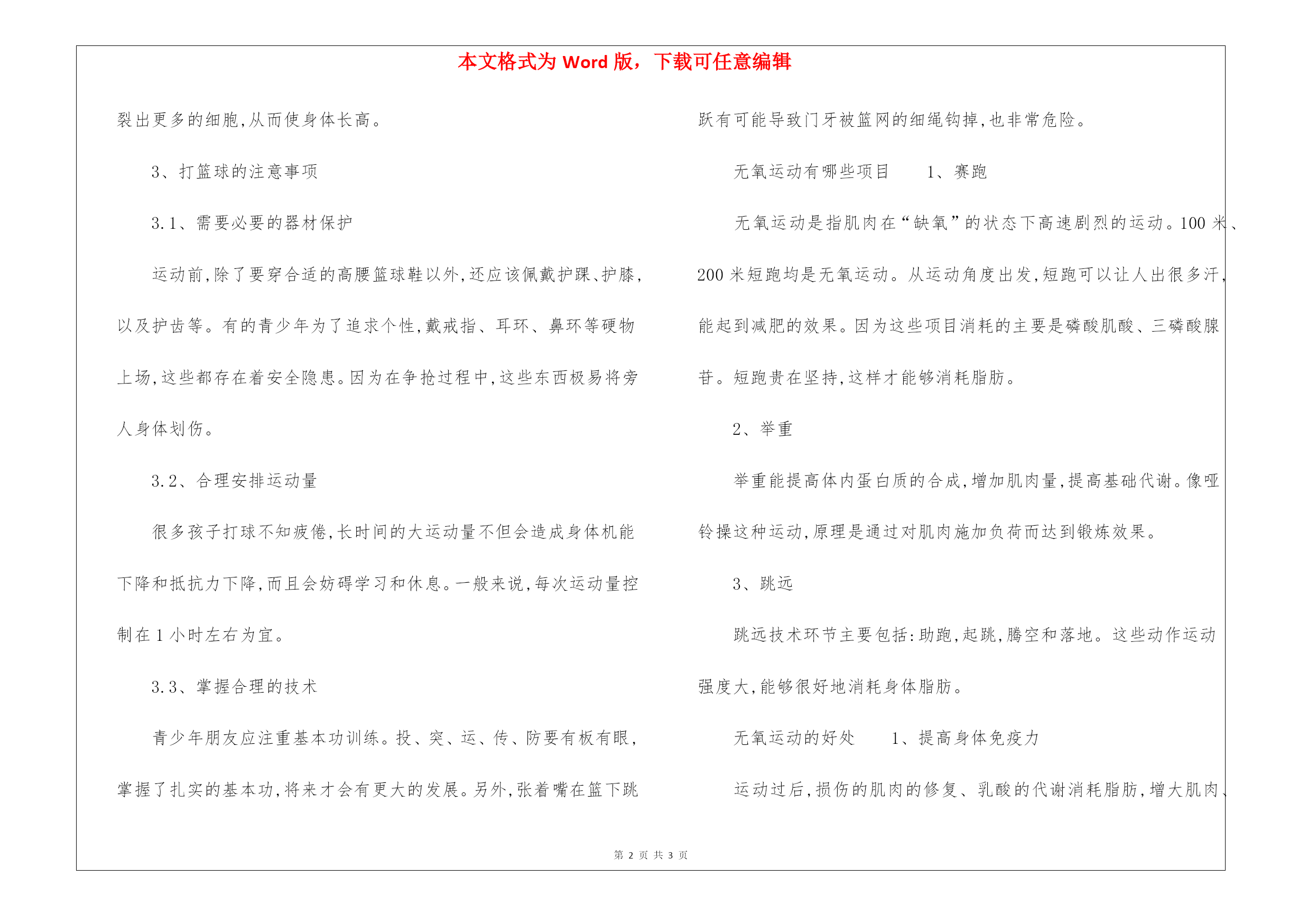 本文格式为Word版,下载可任意编辑第PAGE\*MERGEFORMAT3页共NUMPAGES\*MERGEFORMAT3页篮球属于无氧运动吗篮球属于无氧运动吗篮球是无氧运动吗1、篮球是无氧运动吗篮球不是无氧运动,而是有氧运动,有氧运动是一种有氧代谢运动,运动时氧气的吸入量与耗氧量可以保持平衡,而无氧运动则是在氧气供应不充分的前提下,各个器官和肌肉进行高强度的运动。虽然打篮球过程中,会有高速度、大强度、强对抗的过程,也会有短时间的跑、跳等运动,感觉像是无氧运动;但是打篮球是可以在运动过程中,促进身体的血液循环,提高新陈代谢和心肺功能的。篮球运动也比较符合有氧运动的特点,强度在中等、有节奏、持续时间长,在运动过程中能消耗体内多余热量,使得篮球运动中的吸入氧气与身体需求相等,从而达到生理上的平静状态,所以总的来说打篮球还是可以说是有氧运动的。2、打篮球的好处2.1、提升体力和耐力一般来说,打篮球需要消耗的体力也是很大的,而且时间也是较长,在这个过程中是需要在球场上不断的奔跑的,经常参加篮球运动,体力和耐力都能从中能到提升。2.2、锻炼反应能力篮球不仅仅是需要体力,还需要很灵敏的反应的,是需要你在短短时间内就能判断出怎么去运球,怎么能进球。而且这是一个团队运动,也需要进行快速地策划和部署。所以在篮球赛中你的反应能力能够得到锻炼。2.3、有助于长高打篮球是有很多的'跳跃动作的,对各个关节也有持续的影响,对于长高是有利的。而且可以促进大脑中分泌出大量成长激素,而这些成长激素又可以促进膝盖、脚腕、臀部等部位骨骼末端的软骨组织分裂出更多的细胞,从而使身体长高。3、打篮球的注意事项3.1、需要必要的器材保护运动前,除了要穿合适的高腰篮球鞋以外,还应该佩戴护踝、护膝,以及护齿等。有的青少年为了追求个性,戴戒指、耳环、鼻环等硬物上场,这些都存在着安全隐患。因为在争抢过程中,这些东西极易将旁人身体划伤。3.2、合理安排运动量很多孩子打球不知疲倦,长时间的大运动量不但会造成身体机能下降和抵抗力下降,而且会妨碍学习和休息。一般来说,每次运动量控制在1小时左右为宜。3.3、掌握合理的技术青少年朋友应注重基本功训练。投、突、运、传、防要有板有眼,掌握了扎实的基本功,将来才会有更大的发展。另外,张着嘴在篮下跳跃有可能导致门牙被篮网的细绳钩掉,也非常危险。无氧运动有哪些项目1、赛跑无氧运动是指肌肉在“缺氧”的状态下高速剧烈的运动。100米、200米短跑均是无氧运动。从运动角度出发,短跑可以让人出很多汗,能起到减肥的效果。因为这些项目消耗的主要是磷酸肌酸、三磷酸腺苷。短跑贵在坚持,这样才能够消耗脂肪。2、举重举重能提高体内蛋白质的合成,增加肌肉量,提高基础代谢。像哑铃操这种运动,原理是通过对肌肉施加负荷而达到锻炼效果。3、跳远跳远技术环节主要包括:助跑,起跳,腾空和落地。这些动作运动强度大,能够很好地消耗身体脂肪。无氧运动的好处1、提高身体免疫力运动过后,损伤的肌肉的修复、乳酸的代谢消耗脂肪,增大肌肉、脂肪的比率,增加肌肉新陈代谢率,提高身体免疫力。锻炼肌肉,无氧运动速度过快、爆发力过猛,人体内的糖分来不及经过氧气分解,这种运动会在体内产生过多的乳酸,导致肌肉疲劳不能持久,运动后感到肌肉酸痛,呼吸急促。无氧运动是一种锻炼肌肉让身体变得更强壮的运动方式。2、降低了疾病死亡的风险无氧运动的运动量比较大,对力量的要求比较高,在做无氧运动的时候使肌肉收缩速度、力量均能提高,有效降低了疾病死亡的风险。降低骨质疏松的风险无氧运动对增加肌肉的耐力、速度方面的提高贡献很大有氧训练对骨密度增大效果不大,而属于无氧运动的力量训连增加骨密度效果更好,更能有效降低骨质疏松的风险。