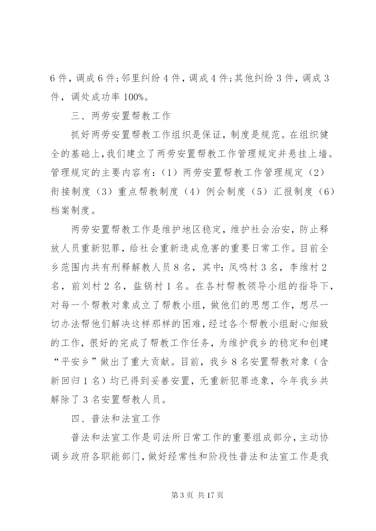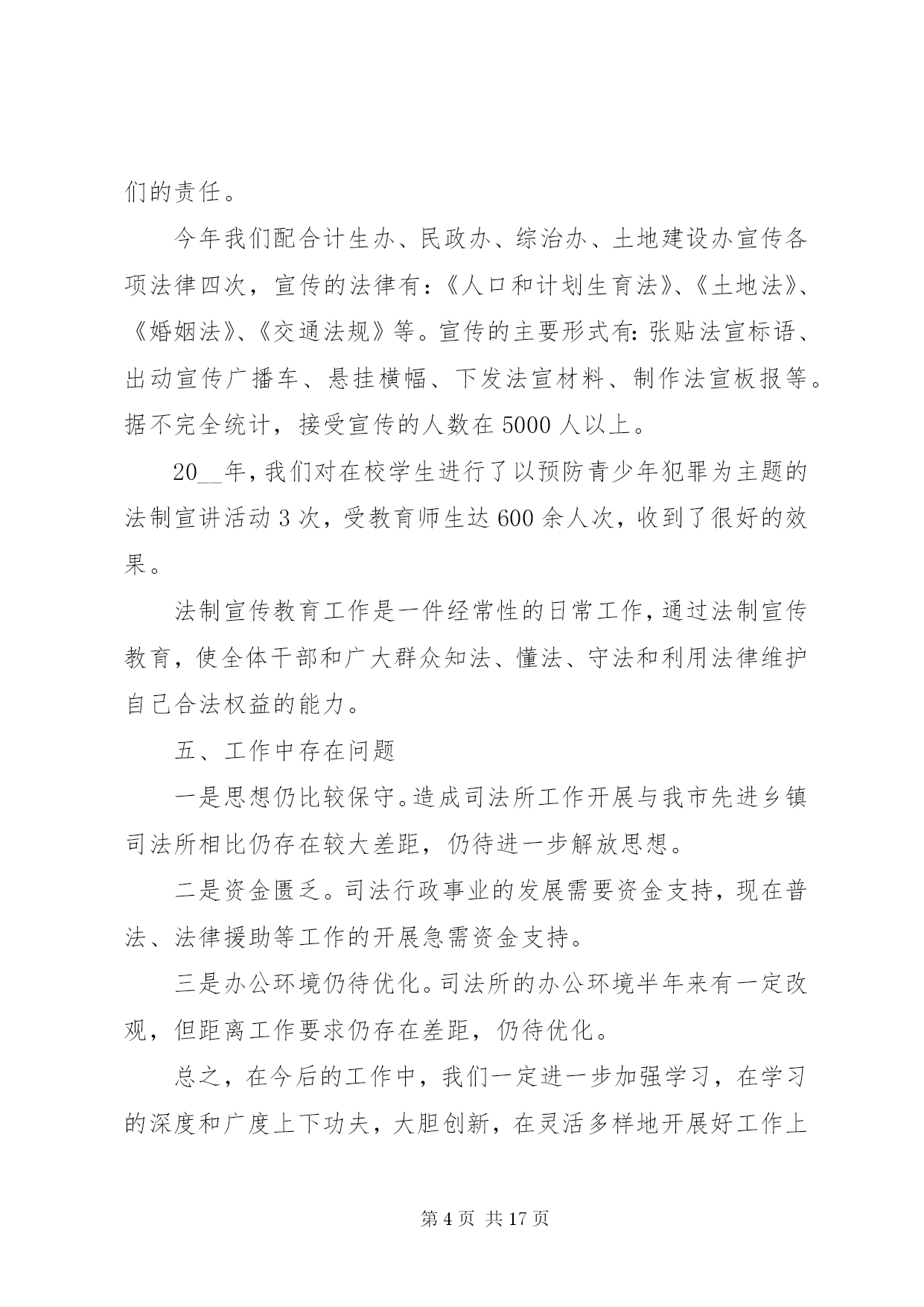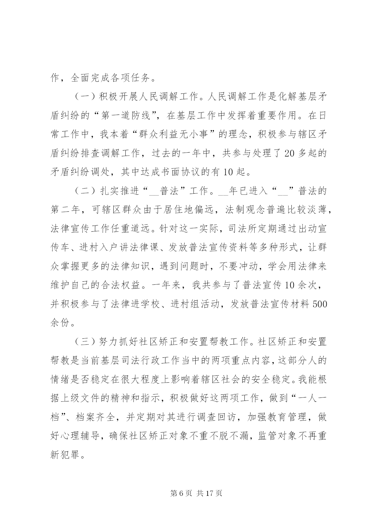 第PAGE\*Arabic\*MERGEFORMAT17页共NUMPAGES\*MERGEFORMAT17页司法工作个人总结多篇由会员“leememmn112”投稿推荐,但愿对你的学习工作能带来参考借鉴作用。工作总结可以全面地,系统地了解以往的工作情况,可以正确认识以往工作中的优缺点。下面是小编给大家精心挑选的工作总结,希望能帮助到大家。司法工作个人总结篇一根据市司法局的工作部署,结合___乡的工作实际,在司法所收编的第一年,我们以创新务实的工作姿态,认真学习党的“__大”,按照“执法为民”的要求,认真实践依法治国的方略,创新普法与依法治理工作,拓展和规范法律服务,夯实基层基础,加强队伍建设,坚持执法为民的思想,牢固树立正确的执法观念和服务观念,切实改进工作作风,做到观念上有新转变,思想上有新飞跃,思路上有新调整,工作上有新突破,在提高工作水平,提升干部形象上有新发展,更好地为地方经济发展和社会稳定服务。现将~年全乡司法行政各项工作开展情况总结如下:一、司法所建设今年是司法所收编的第一年,高标准、高质量、高起点建好司法所是我们的工作重点之一,司法所现有编制2人。为了逐步实现司法所的规范化管理,我们制定了下列规章制度:1、司法所工作职责。2、司法所应遵守的原则和工作要求。3、司法所工作制度。4、两劳安置帮教管理规定。5、例会制度。6、司法所长的工作职责。7、档案管理工作制度。8、人民调解工作管理办法。上述规章制度均已悬挂上墙,起到了提高司法所的知名度,宣传了司法所的工作职能,树立司法所形象的重要作用。二、人民调解工作__年来,乡司法所建立健全了包含乡人民调解委员会的11个调委会,人员进行调整充实。经调整后,1个乡级人民调解委员会调解成员10人,10个村级人民调解委员会,调解成员30人。在4月20日,我们利用乡政府工作会议之机,召集组织了全乡10个基层调委会共30名调解成员集中进行了业务培训,通过培训,使我乡人民调解员提升了自身素质,业务知识和实际操作能力有了很大的提高,充分发挥了人民调解组织在社会治安综合治理方面的重要作用。半年来,我乡人民调解委员会充分发挥其职能作用,在巩固去年的成绩后,多次深入各村、组排查调处各类矛盾纠纷16件,其中:土地纠纷3件,调成3件;婚姻纠纷6件,调成6件;邻里纠纷4件,调成4件;其他纠纷3件,调成3件,调处成功率100%。三、两劳安置帮教工作抓好两劳安置帮教工作组织是保证,制度是规范。在组织健全的基础上,我们建立了两劳安置帮教工作管理规定并悬挂上墙。管理规定的主要内容有:(1)两劳安置帮教工作管理规定(2)衔接制度(3)重点帮教制度(4)例会制度(5)汇报制度(6)档案制度。两劳安置帮教工作是维护地区稳定,维护社会治安,防止释放人员重新犯罪,给社会重新造成危害的重要日常工作。目前全乡范围内共有刑释解教人员8名,其中:凤鸣村3名,李维村2名,前刘村2名,盐锅村1名。在各村帮教领导小组的指导下,对每一个帮教对象成立了帮教小组,做他们的思想工作,想尽一切办法帮他们解决这样那样的困难,经过各个帮教小组耐心细致的工作,很好的完成了帮教工作任务,为维护我乡的稳定和创建“平安乡”做出了重大贡献。目前,我乡8名安置帮教对象(含新回归1名)均已得到妥善安置,无重新犯罪迹象,今年我乡共解除了3名安置帮教人员。四、普法和法宣工作普法和法宣工作是司法所日常工作的重要组成部分,主动协调乡政府各职能部门,做好经常性和阶段性普法和法宣工作是我们的责任。今年我们配合计生办、民政办、综治办、土地建设办宣传各项法律四次,宣传的法律有:《人口和计划生育法》、《土地法》、《婚姻法》、《交通法规》等。宣传的主要形式有:张贴法宣标语、出动宣传广播车、悬挂横幅、下发法宣材料、制作法宣板报等。据不完全统计,接受宣传的人数在5000人以上。20__年,我们对在校学生进行了以预防青少年犯罪为主题的法制宣讲活动3次,受教育师生达600余人次,收到了很好的效果。法制宣传教育工作是一件经常性的日常工作,通过法制宣传教育,使全体干部和广大群众知法、懂法、守法和利用法律维护自己合法权益的能力。五、工作中存在问题一是思想仍比较保守。造成司法所工作开展与我市先进乡镇司法所相比仍存在较大差距,仍待进一步解放思想。二是资金匮乏。司法行政事业的发展需要资金支持,现在普法、法律援助等工作的开展急需资金支持。三是办公环境仍待优化。司法所的办公环境半年来有一定改观,但距离工作要求仍存在差距,仍待优化。总之,在今后的工作中,我们一定进一步加强学习,在学习的深度和广度上下功夫,大胆创新,在灵活多样地开展好工作上下功夫,把我所的工作推上一个新台阶。司法工作个人总结篇二在过去的一年里,在区司法局、桥南镇党委的正确领导下,我按照所在岗位的职责要求,自觉服从组织