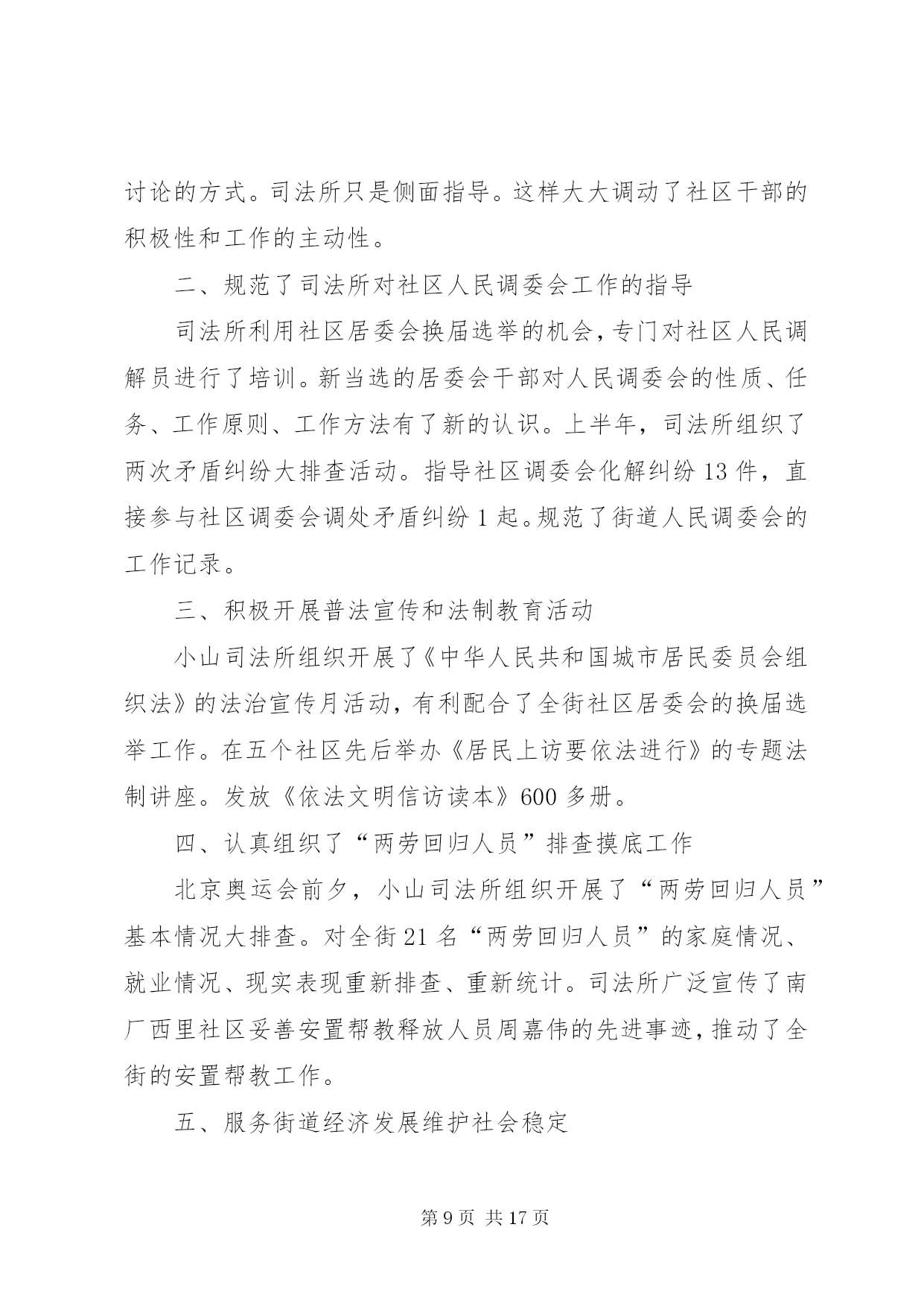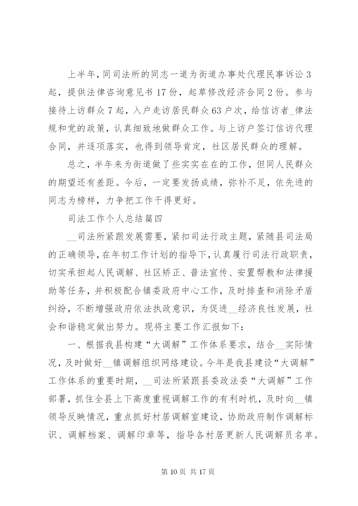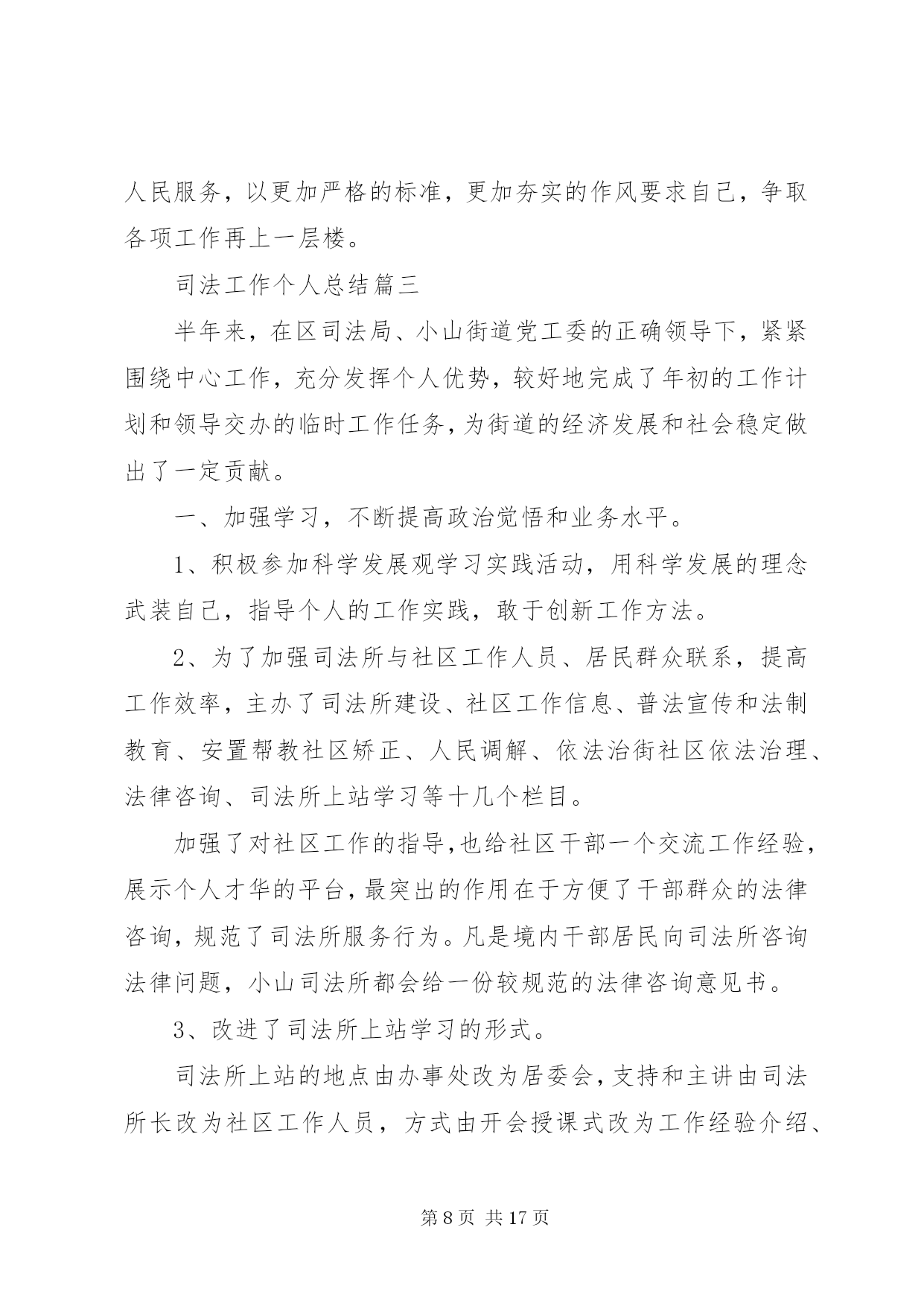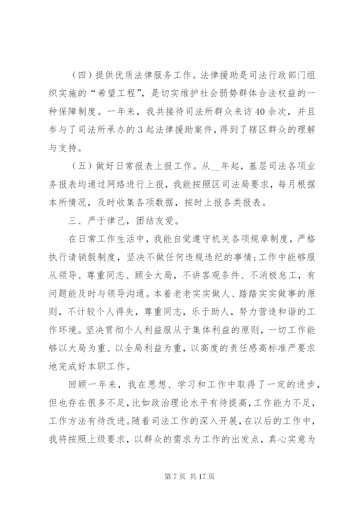 第PAGE\*Arabic\*MERGEFORMAT17页共NUMPAGES\*MERGEFORMAT17页司法工作个人总结多篇由会员“leememmn112”投稿推荐,但愿对你的学习工作能带来参考借鉴作用。工作总结可以全面地,系统地了解以往的工作情况,可以正确认识以往工作中的优缺点。下面是小编给大家精心挑选的工作总结,希望能帮助到大家。司法工作个人总结篇一根据市司法局的工作部署,结合___乡的工作实际,在司法所收编的第一年,我们以创新务实的工作姿态,认真学习党的“__大”,按照“执法为民”的要求,认真实践依法治国的方略,创新普法与依法治理工作,拓展和规范法律服务,夯实基层基础,加强队伍建设,坚持执法为民的思想,牢固树立正确的执法观念和服务观念,切实改进工作作风,做到观念上有新转变,思想上有新飞跃,思路上有新调整,工作上有新突破,在提高工作水平,提升干部形象上有新发展,更好地为地方经济发展和社会稳定服务。现将~年全乡司法行政各项工作开展情况总结如下:一、司法所建设今年是司法所收编的第一年,高标准、高质量、高起点建好司法所是我们的工作重点之一,司法所现有编制2人。为了逐步实现司法所的规范化管理,我们制定了下列规章制度:1、司法所工作职责。2、司法所应遵守的原则和工作要求。3、司法所工作制度。4、两劳安置帮教管理规定。5、例会制度。6、司法所长的工作职责。7、档案管理工作制度。8、人民调解工作管理办法。上述规章制度均已悬挂上墙,起到了提高司法所的知名度,宣传了司法所的工作职能,树立司法所形象的重要作用。二、人民调解工作__年来,乡司法所建立健全了包含乡人民调解委员会的11个调委会,人员进行调整充实。经调整后,1个乡级人民调解委员会调解成员10人,10个村级人民调解委员会,调解成员30人。在4月20日,我们利用乡政府工作会议之机,召集组织了全乡10个基层调委会共30名调解成员集中进行了业务培训,通过培训,使我乡人民调解员提升了自身素质,业务知识和实际操作能力有了很大的提高,充分发挥了人民调解组织在社会治安综合治理方面的重要作用。半年来,我乡人民调解委员会充分发挥其职能作用,在巩固去年的成绩后,多次深入各村、组排查调处各类矛盾纠纷16件,其中:土地纠纷3件,调成3件;婚姻纠纷6件,调成6件;邻里纠纷4件,调成4件;其他纠纷3件,调成3件,调处成功率100%。三、两劳安置帮教工作抓好两劳安置帮教工作组织是保证,制度是规范。在组织健全的基础上,我们建立了两劳安置帮教工作管理规定并悬挂上墙。管理规定的主要内容有:(1)两劳安置帮教工作管理规定(2)衔接制度(3)重点帮教制度(4)例会制度(5)汇报制度(6)档案制度。两劳安置帮教工作是维护地区稳定,维护社会治安,防止释放人员重新犯罪,给社会重新造成危害的重要日常工作。目前全乡范围内共有刑释解教人员8名,其中:凤鸣村3名,李维村2名,前刘村2名,盐锅村1名。在各村帮教领导小组的指导下,对每一个帮教对象成立了帮教小组,做他们的思想工作,想尽一切办法帮他们解决这样那样的困难,经过各个帮教小组耐心细致的工作,很好的完成了帮教工作任务,为维护我乡的稳定和创建“平安乡”做出了重大贡献。目前,我乡8名安置帮教对象(含新回归1名)均已得到妥善安置,无重新犯罪迹象,今年我乡共解除了3名安置帮教人员。四、普法和法宣工作普法和法宣工作是司法所日常工作的重要组成部分,主动协调乡政府各职能部门,做好经常性和阶段性普法和法宣工作是我们的责任。今年我们配合计生办、民政办、综治办、土地建设办宣传各项法律四次,宣传的法律有:《人口和计划生育法》、《土地法》、《婚姻法》、《交通法规》等。宣传的主要形式有:张贴法宣标语、出动宣传广播车、悬挂横幅、下发法宣材料、制作法宣板报等。据不完全统计,接受宣传的人数在5000人以上。20__年,我们对在校学生进行了以预防青少年犯罪为主题的法制宣讲活动3次,受教育师生达600余人次,收到了很好的效果。法制宣传教育工作是一件经常性的日常工作,通过法制宣传教育,使全体干部和广大群众知法、懂法、守法和利用法律维护自己合法权益的能力。五、工作中存在问题一是思想仍比较保守。造成司法所工作开展与我市先进乡镇司法所相比仍存在较大差距,仍待进一步解放思想。二是资金匮乏。司法行政事业的发展需要资金支持,现在普法、法律援助等工作的开展急需资金支持。三是办公环境仍待优化。司法所的办公环境半年来有一定改观,但距离工作要求仍存在差距,仍待优化。总之,在今后的工作中,我们一定进一步加强学习,在学习的深度和广度上下功夫,大胆创新,在灵活多样地开展好工作上下功夫,把我所的工作推上一个新台阶。司法工作个人总结篇二在过去的一年里,在区司法局、桥南镇党委的正确领导下,我按照所在岗位的职责要求,自觉服从组织