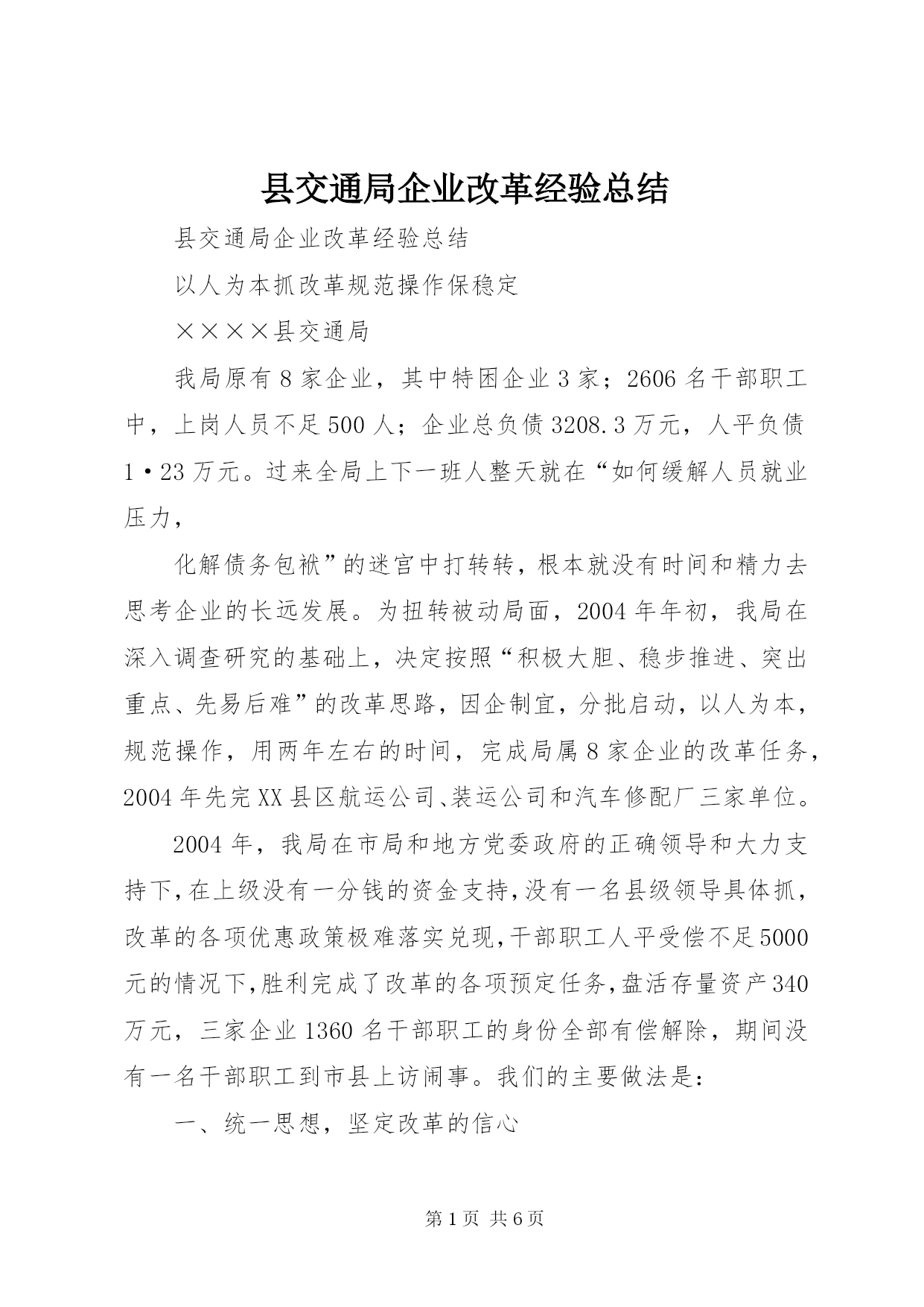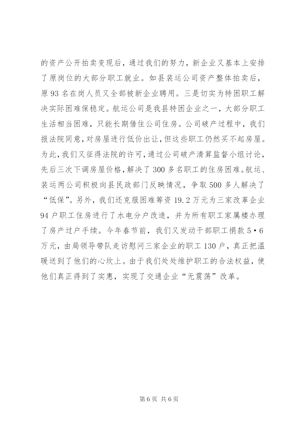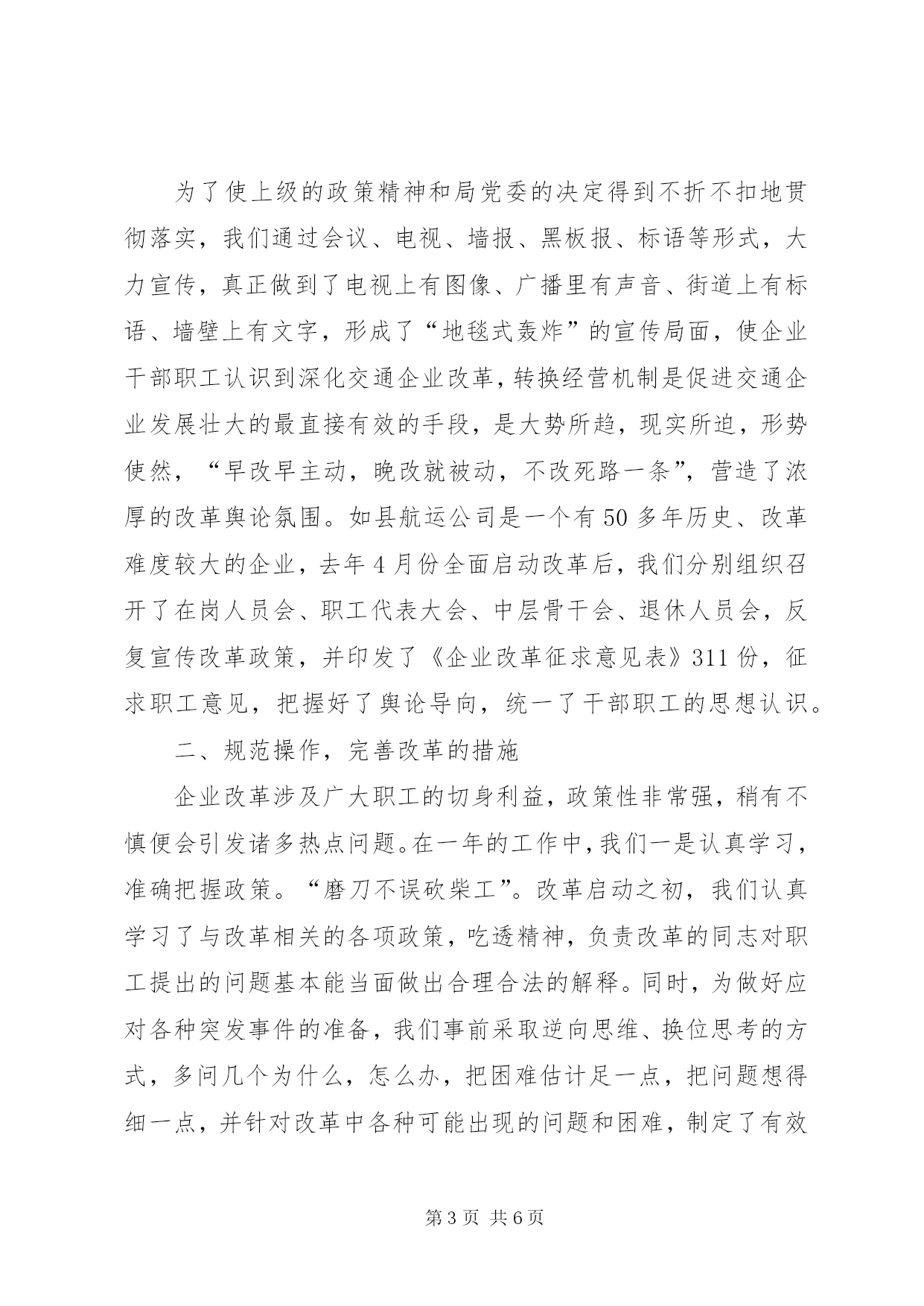 第PAGE\*Arabic\*MERGEFORMAT6页共NUMPAGES\*MERGEFORMAT6页县交通局企业改革经验总结县交通局企业改革经验总结以人为本抓改革规范操作保稳定××××县交通局我局原有8家企业,其中特困企业3家;2606名干部职工中,上岗人员不足500人;企业总负债3208.3万元,人平负债1·23万元。过来全局上下一班人整天就在“如何缓解人员就业压力,化解债务包袱”的迷宫中打转转,根本就没有时间和精力去思考企业的长远发展。为扭转被动局面,2004年年初,我局在深入调查研究的基础上,决定按照“积极大胆、稳步推进、突出重点、先易后难”的改革思路,因企制宜,分批启动,以人为本,规范操作,用两年左右的时间,完成局属8家企业的改革任务,2004年先完XX县区航运公司、装运公司和汽车修配厂三家单位。2004年,我局在市局和地方党委政府的正确领导和大力支持下,在上级没有一分钱的资金支持,没有一名县级领导具体抓,改革的各项优惠政策极难落实兑现,干部职工人平受偿不足5000元的情况下,胜利完成了改革的各项预定任务,盘活存量资产340万元,三家企业1360名干部职工的身份全部有偿解除,期间没有一名干部职工到市县上访闹事。我们的主要做法是:一、统一思想,坚定改革的信心交通企业改革是一场深层次的攻坚战,不仅涉及到利益的调整,而且也触及到观念的碰撞。我县交通企业改不改,如何改。当时可以说是顾虑重重,莫衷一是。有的主张立即改,马上改,趁企业还有一些资产可变现,快点分光走人;有的主张维持现状,认为交通企业点多、线长、面广、摊子大、包袱重、情况复杂,搞得不好就会捅“马蜂窝”,出乱子,怕收不了场;有的认为交通企业属于特殊行业,具有行业优势,不改革也能维持下去,能拖则拖,何必劳神费力,自讨苦吃。为此,局党委在深入调查研究的基础上,两次召开专题会议,经过反复讨论,权衡利弊,大家一致认为企业改革正当其时。一是上级有政策,有优惠条件,支持企业改革。二是企业能够支撑到今天,说到底,靠的是行业垄断优势,如果直面市场,企业必死无疑。三是干部职工有要求。在走访座谈中,大部分干部职工对企业现有的经营机制不满意,要求改革。特别是一些有资金、有技术、有管理经验的同志,要求改革的愿望更强烈。通过讨论,局党委一班人不仅统一了思想,提高了认识,而且树立了信心,坚定了决心。在此基础上,局党委要求负责企业改革的同志,要以人为本,从党性的立场对待改革,千万不能把企业当“包袱”甩;要用发展的观点指导改革,千万不能把改制看作是交通企业“最后的晚餐”;要依法依规实施改革,依法依规维护职工群众的合法权益,不能把企业当作“包袱”“了难”,一卖了之。为了使上级的政策精神和局党委的决定得到不折不扣地贯彻落实,我们通过会议、电视、墙报、黑板报、标语等形式,大力宣传,真正做到了电视上有图像、广播里有声音、街道上有标语、墙壁上有文字,形成了“地毯式轰炸”的宣传局面,使企业干部职工认识到深化交通企业改革,转换经营机制是促进交通企业发展壮大的最直接有效的手段,是大势所趋,现实所迫,形势使然,“早改早主动,晚改就被动,不改死路一条”,营造了浓厚的改革舆论氛围。如县航运公司是一个有50多年历史、改革难度较大的企业,去年4月份全面启动改革后,我们分别组织召开了在岗人员会、职工代表大会、中层骨干会、退休人员会,反复宣传改革政策,并印发了《企业改革征求意见表》311份,征求职工意见,把握好了舆论导向,统一了干部职工的思想认识。二、规范操作,完善改革的措施企业改革涉及广大职工的切身利益,政策性非常强,稍有不慎便会引发诸多热点问题。在一年的工作中,我们一是认真学习,准确把握政策。“磨刀不误砍柴工”。改革启动之初,我们认真学习了与改革相关的各项政策,吃透精神,负责改革的同志对职工提出的问题基本能当面做出合理合法的解释。同时,为做好应对各种突发事件的准备,我们事前采取逆向思维、换位思考的方式,多问几个为什么,怎么办,把困难估计足一点,把问题想得细一点,并针对改革中各种可能出现的问题和困难,制定了有效的应对措施和应急预案。二是阳光操作,接受群众监督。在改革过程中,我们严格遵照《破产法》、《劳动法》等法律法规XX县区委县政府出台的改革文件,认真理解法律法规及文件的原意和精髓,不变样,不走调;坚持一碗水端平,一把尺子量到底;谁说了都不算,只按法律法规政策规定的办。保证了政策执行的刚性和各企业横向之间的可比性,避免了人为制造心理上的不平衡。在具体操作过程中,我们没有关起门唱“独角戏”,做群众的“包办者”和代言人,而是开门改革,坚持了公开透明、阳光作业的原则,资产清查结果、职工身份状况、资产处置过程、职工受偿情况等全部上墙公开。一句话,只要能够向职工公开的统统上墙公开,并留下充足的时间让职工针对公