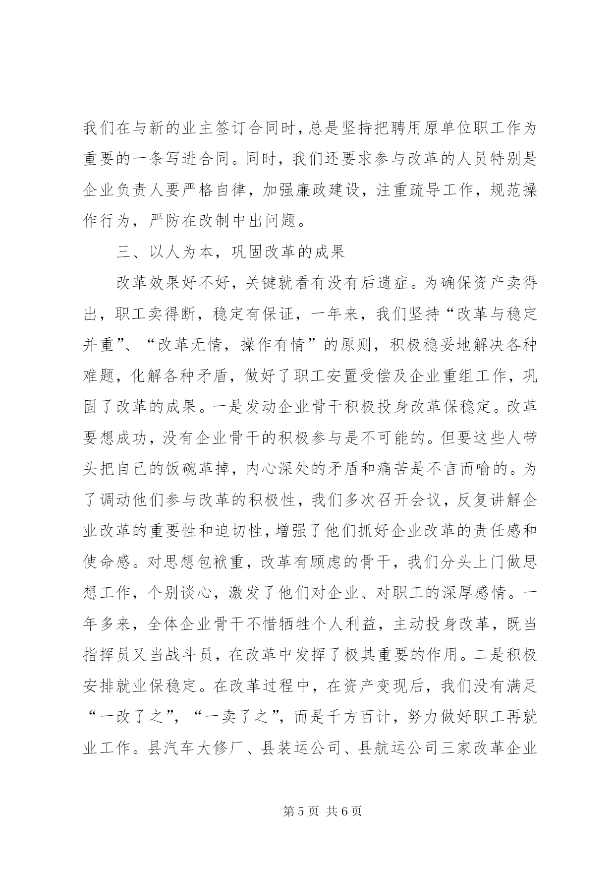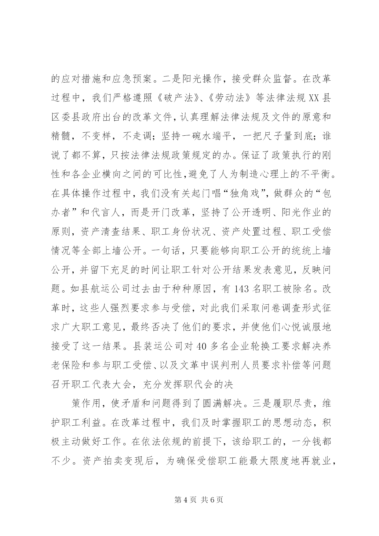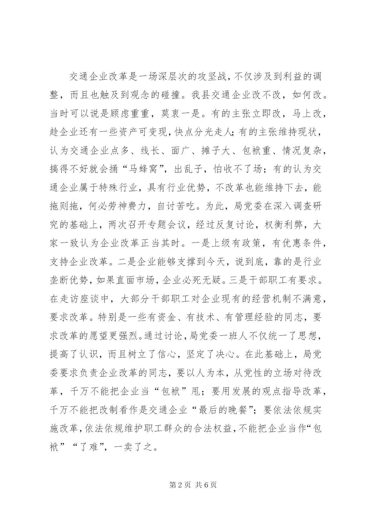 第PAGE\*Arabic\*MERGEFORMAT6页共NUMPAGES\*MERGEFORMAT6页县交通局企业改革经验总结县交通局企业改革经验总结以人为本抓改革规范操作保稳定××××县交通局我局原有8家企业,其中特困企业3家;2606名干部职工中,上岗人员不足500人;企业总负债3208.3万元,人平负债1·23万元。过来全局上下一班人整天就在“如何缓解人员就业压力,化解债务包袱”的迷宫中打转转,根本就没有时间和精力去思考企业的长远发展。为扭转被动局面,2004年年初,我局在深入调查研究的基础上,决定按照“积极大胆、稳步推进、突出重点、先易后难”的改革思路,因企制宜,分批启动,以人为本,规范操作,用两年左右的时间,完成局属8家企业的改革任务,2004年先完XX县区航运公司、装运公司和汽车修配厂三家单位。2004年,我局在市局和地方党委政府的正确领导和大力支持下,在上级没有一分钱的资金支持,没有一名县级领导具体抓,改革的各项优惠政策极难落实兑现,干部职工人平受偿不足5000元的情况下,胜利完成了改革的各项预定任务,盘活存量资产340万元,三家企业1360名干部职工的身份全部有偿解除,期间没有一名干部职工到市县上访闹事。我们的主要做法是:一、统一思想,坚定改革的信心交通企业改革是一场深层次的攻坚战,不仅涉及到利益的调整,而且也触及到观念的碰撞。我县交通企业改不改,如何改。当时可以说是顾虑重重,莫衷一是。有的主张立即改,马上改,趁企业还有一些资产可变现,快点分光走人;有的主张维持现状,认为交通企业点多、线长、面广、摊子大、包袱重、情况复杂,搞得不好就会捅“马蜂窝”,出乱子,怕收不了场;有的认为交通企业属于特殊行业,具有行业优势,不改革也能维持下去,能拖则拖,何必劳神费力,自讨苦吃。为此,局党委在深入调查研究的基础上,两次召开专题会议,经过反复讨论,权衡利弊,大家一致认为企业改革正当其时。一是上级有政策,有优惠条件,支持企业改革。二是企业能够支撑到今天,说到底,靠的是行业垄断优势,如果直面市场,企业必死无疑。三是干部职工有要求。在走访座谈中,大部分干部职工对企业现有的经营机制不满意,要求改革。特别是一些有资金、有技术、有管理经验的同志,要求改革的愿望更强烈。通过讨论,局党委一班人不仅统一了思想,提高了认识,而且树立了信心,坚定了决心。在此基础上,局党委要求负责企业改革的同志,要以人为本,从党性的立场对待改革,千万不能把企业当“包袱”甩;要用发展的观点指导改革,千万不能把改制看作是交通企业“最后的晚餐”;要依法依规实施改革,依法依规维护职工群众的合法权益,不能把企业当作“包袱”“了难”,一卖了之。为了使上级的政策精神和局党委的决定得到不折不扣地贯彻落实,我们通过会议、电视、墙报、黑板报、标语等形式,大力宣传,真正做到了电视上有图像、广播里有声音、街道上有标语、墙壁上有文字,形成了“地毯式轰炸”的宣传局面,使企业干部职工认识到深化交通企业改革,转换经营机制是促进交通企业发展壮大的最直接有效的手段,是大势所趋,现实所迫,形势使然,“早改早主动,晚改就被动,不改死路一条”,营造了浓厚的改革舆论氛围。如县航运公司是一个有50多年历史、改革难度较大的企业,去年4月份全面启动改革后,我们分别组织召开了在岗人员会、职工代表大会、中层骨干会、退休人员会,反复宣传改革政策,并印发了《企业改革征求意见表》311份,征求职工意见,把握好了舆论导向,统一了干部职工的思想认识。二、规范操作,完善改革的措施企业改革涉及广大职工的切身利益,政策性非常强,稍有不慎便会引发诸多热点问题。在一年的工作中,我们一是认真学习,准确把握政策。“磨刀不误砍柴工”。改革启动之初,我们认真学习了与改革相关的各项政策,吃透精神,负责改革的同志对职工提出的问题基本能当面做出合理合法的解释。同时,为做好应对各种突发事件的准备,我们事前采取逆向思维、换位思考的方式,多问几个为什么,怎么办,把困难估计足一点,把问题想得细一点,并针对改革中各种可能出现的问题和困难,制定了有效的应对措施和应急预案。二是阳光操作,接受群众监督。在改革过程中,我们严格遵照《破产法》、《劳动法》等法律法规XX县区委县政府出台的改革文件,认真理解法律法规及文件的原意和精髓,不变样,不走调;坚持一碗水端平,一把尺子量到底;谁说了都不算,只按法律法规政策规定的办。保证了政策执行的刚性和各企业横向之间的可比性,避免了人为制造心理上的不平衡。在具体操作过程中,我们没有关起门唱“独角戏”,做群众的“包办者”和代言人,而是开门改革,坚持了公开透明、阳光作业的原则,资产清查结果、职工身份状况、资产处置过程、职工受偿情况等全部上墙公开。一句话,只要能够向职工公开的统统上墙公开,并留下充足的时间让职工针对公