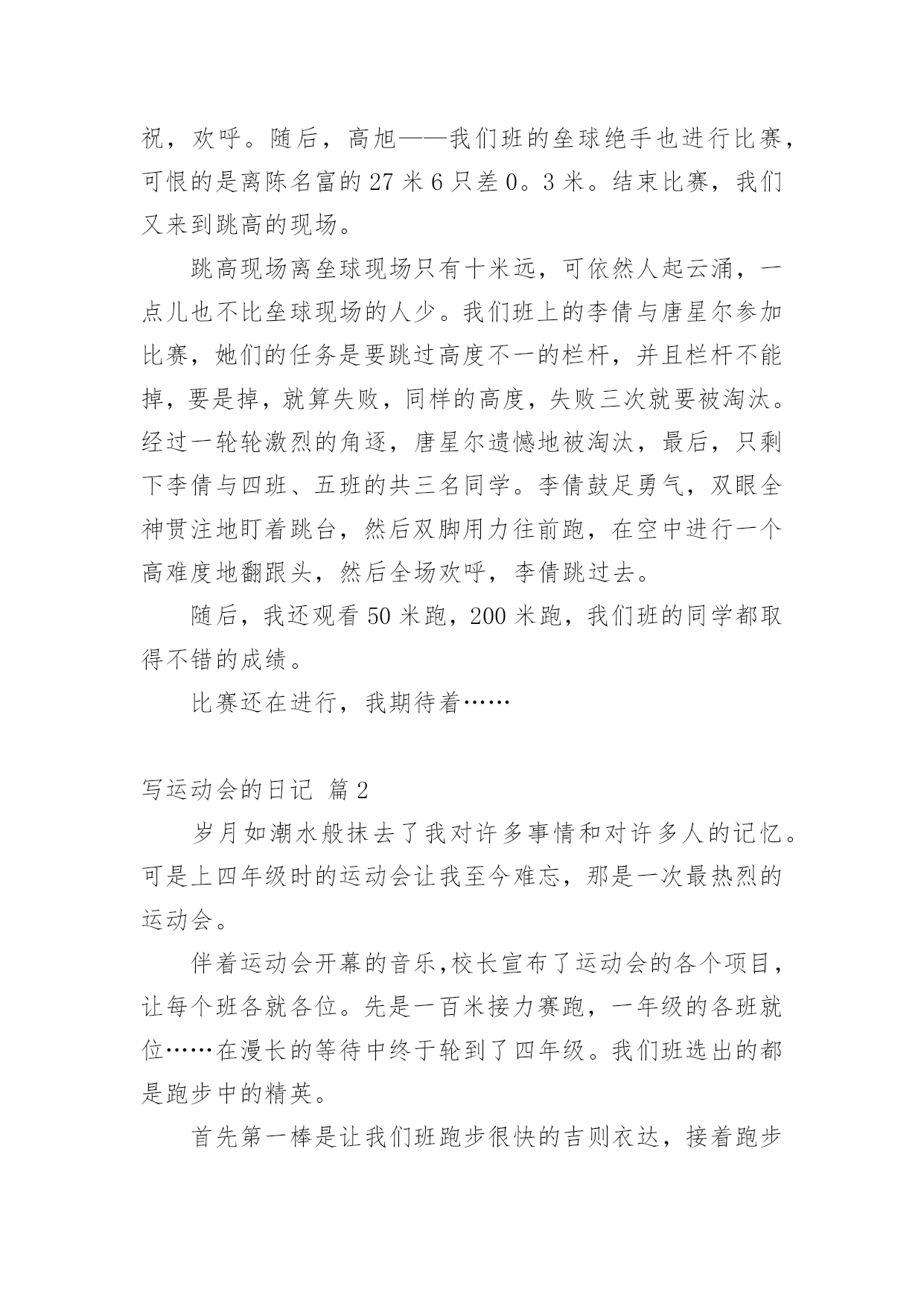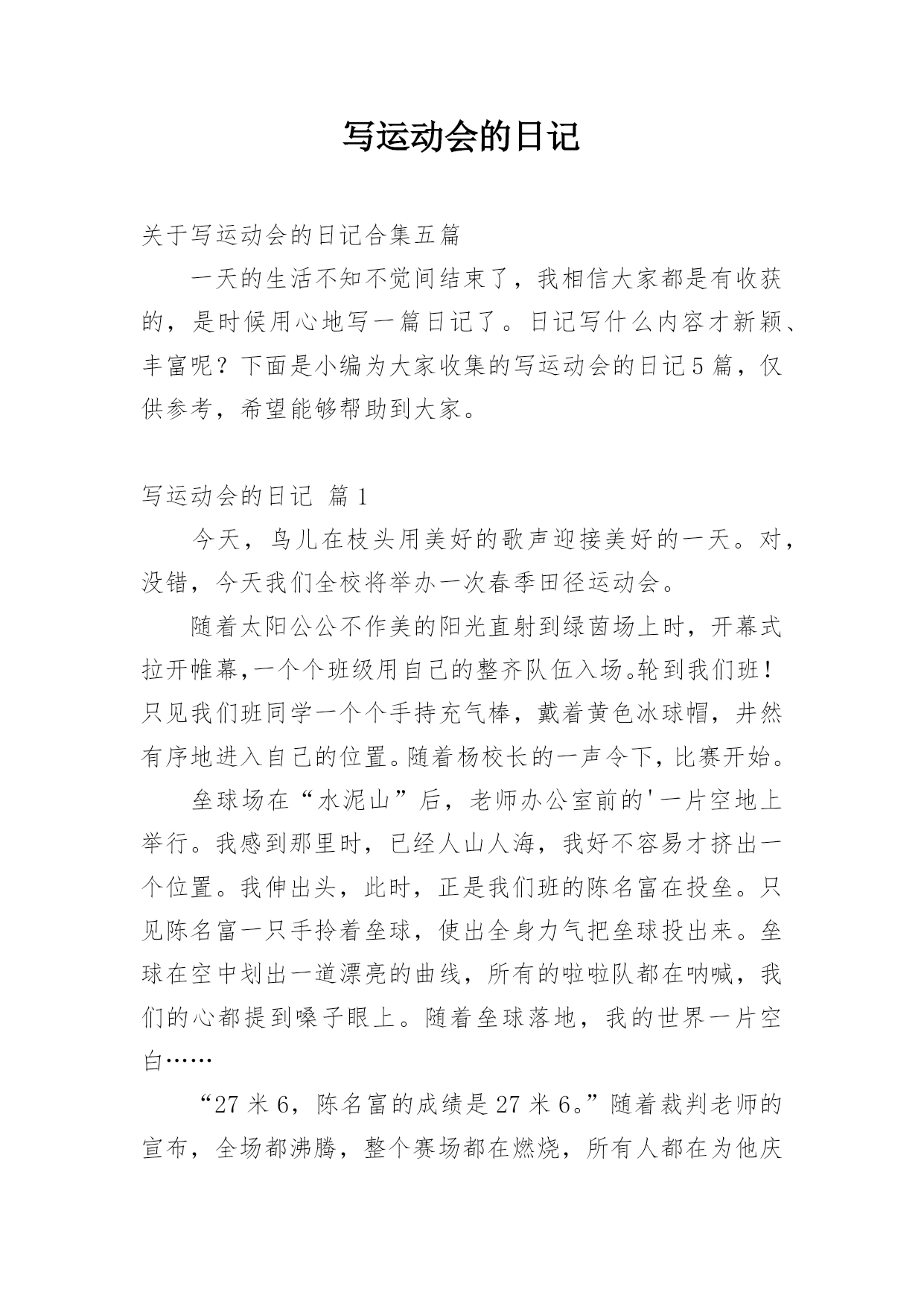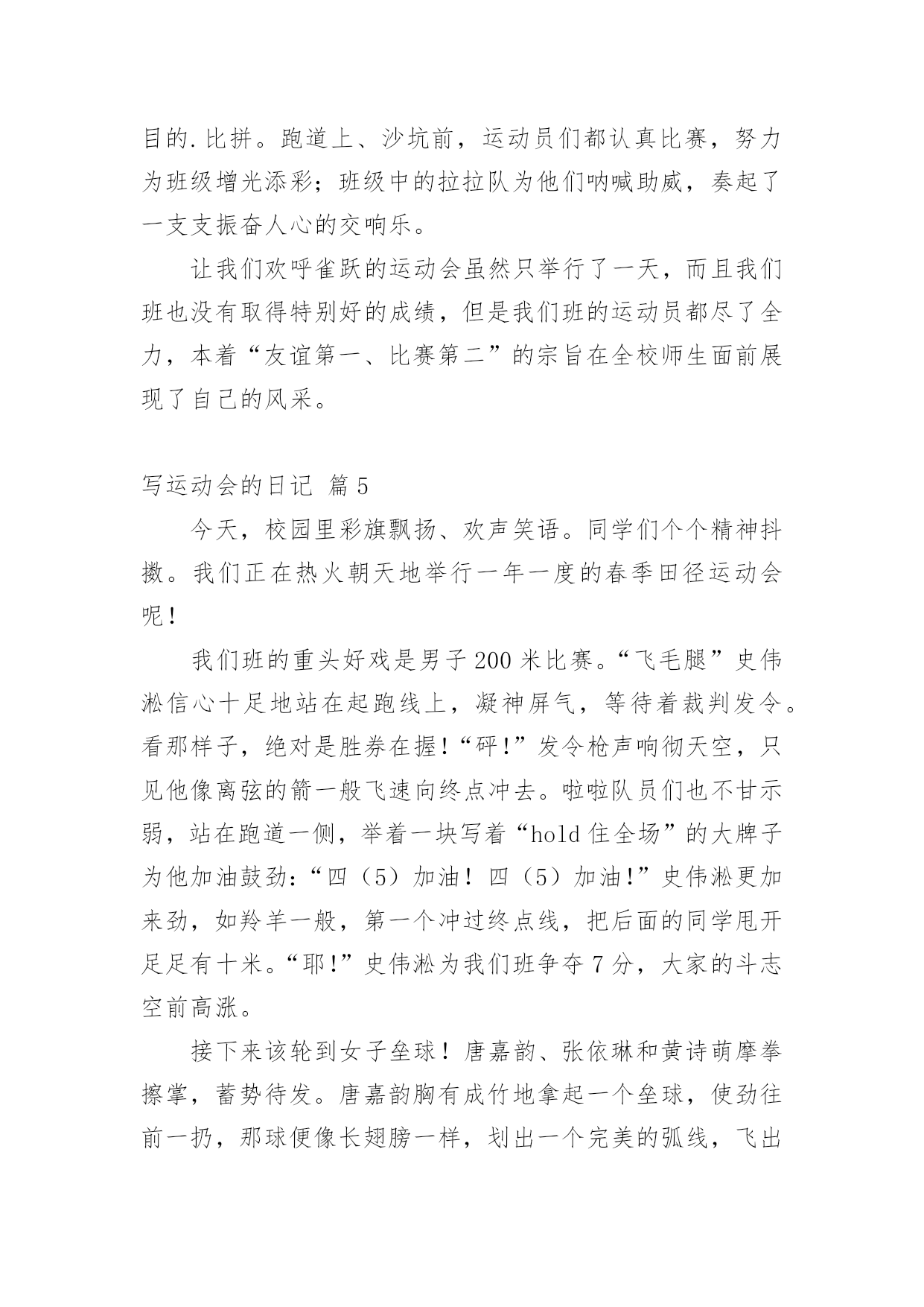写运动会的日记关于写运动会的日记合集五篇一天的生活不知不觉间结束了,我相信大家都是有收获的,是时候用心地写一篇日记了。日记写什么内容才新颖、丰富呢?下面是小编为大家收集的写运动会的日记5篇,仅供参考,希望能够帮助到大家。写运动会的日记篇1今天,鸟儿在枝头用美好的歌声迎接美好的一天。对,没错,今天我们全校将举办一次春季田径运动会。随着太阳公公不作美的阳光直射到绿茵场上时,开幕式拉开帷幕,一个个班级用自己的整齐队伍入场。轮到我们班!只见我们班同学一个个手持充气棒,戴着黄色冰球帽,井然有序地进入自己的位置。随着杨校长的一声令下,比赛开始。垒球场在“水泥山”后,老师办公室前的'一片空地上举行。我感到那里时,已经人山人海,我好不容易才挤出一个位置。我伸出头,此时,正是我们班的陈名富在投垒。只见陈名富一只手拎着垒球,使出全身力气把垒球投出来。垒球在空中划出一道漂亮的曲线,所有的啦啦队都在呐喊,我们的心都提到嗓子眼上。随着垒球落地,我的世界一片空白……“27米6,陈名富的成绩是27米6。”随着裁判老师的宣布,全场都沸腾,整个赛场都在燃烧,所有人都在为他庆祝,欢呼。随后,高旭——我们班的垒球绝手也进行比赛,可恨的是离陈名富的27米6只差0。3米。结束比赛,我们又来到跳高的现场。跳高现场离垒球现场只有十米远,可依然人起云涌,一点儿也不比垒球现场的人少。我们班上的李倩与唐星尔参加比赛,她们的任务是要跳过高度不一的栏杆,并且栏杆不能掉,要是掉,就算失败,同样的高度,失败三次就要被淘汰。经过一轮轮激烈的角逐,唐星尔遗憾地被淘汰,最后,只剩下李倩与四班、五班的共三名同学。李倩鼓足勇气,双眼全神贯注地盯着跳台,然后双脚用力往前跑,在空中进行一个高难度地翻跟头,然后全场欢呼,李倩跳过去。随后,我还观看50米跑,200米跑,我们班的同学都取得不错的成绩。比赛还在进行,我期待着……写运动会的日记篇2岁月如潮水般抹去了我对许多事情和对许多人的记忆。可是上四年级时的运动会让我至今难忘,那是一次最热烈的运动会。伴着运动会开幕的音乐,校长宣布了运动会的各个项目,让每个班各就各位。先是一百米接力赛跑,一年级的各班就位……在漫长的等待中终于轮到了四年级。我们班选出的都是跑步中的精英。首先第一棒是让我们班跑步很快的吉则衣达,接着跑步进步了激烈的阶段,我们班比其它班超出很多,大家都十分高兴,可现在我们班不小心掉棒了!我们心里像装着一只兔子一直跳个不停。哎,因为这次的掉棒我们班落下了一大截,不过因为男生的努力,我们终于赶了上来,我们则在旁边使劲呐喊助威,后来我们班超了其他班,大家也终于松了一口气。就在这时,我们班马上就要赶上那个班的时候,裁判的哨子响了,最得到了第2名。接着就是跳绳和扔沙包。跳绳要开始的时候,才发现我们班有两个同学没有带跳绳,急得我们像热锅上的`蚂蚁,可幸好我们班从体育老师那里接来了跳绳。今天我们班遭遇了许多倒霉的事,不过在全班同学的努力下,我们班还是取得了比以往好得多的成绩。其中最倒霉的还是在扔沙包的时候,因为扔沙包的有位同学感冒了,他竟然把所有的沙包都朝外面扔,而且竟然还扔在了一位家长的身上。他还是继续乱扔一番之后,终于目不转睛地盯着桶看了好一会儿,几个沙包都全部投进了。这次运动会都玩得很开心,希望今后的运动会举办得更好。写运动会的日记篇3×月×日星期×天气×本周星期四和星期五我们学校举行了一年一度的秋季田径运动会。田径运动会的项目可多了!有跳绳、立定跳远等等……下面我就说说最精彩的接力赛吧!一开始,由于没轮到三年级,所以,我们大多数女生都在为准备走的实习老师们叠各种各样的`东西!开始比赛了!我们只听到裁判的一声哨响,我们班的男同学就奋力地向前跑!我们女同学接过接力棒,也飞快地向前冲!过了一会儿,马上轮到我了,我就使用我最快的速度冲向前方!又过了一会儿,我们班连续掉棒,我想这下完了,肯定输了!但是,我们班的最后几个同学跑的特别快,而且,第一名的班级的一位同学摔了一跤,所以,最后的大赢家是我们班,我们忘记了实习老师要走的事情,我们大家都开心的蹦了起来!当回到我们座位时,我们又想起了那件事!我们又伤心了起来!这次秋季田径运动会真是太有趣了!从这次田径运动会中,证我体会了失败和胜利的乐趣,同时也明白了不管做什么事都不能轻易想到失败,而应该坚持下去!写运动会的日记篇4金色秋季,阳光明媚,秋风送爽,硕果飘香。在这丰收的季节里,我们东环路小学迎来了一年一度的达标运动会。这个运动会比往年运动会的项目多了许多,有坐位体前屈、肺活量、立定跳远等项目。除了比赛的名次外,学校还要评比出一个精神文明奖:是看哪个班级精神面貌好。运动会在校长鸣枪的一刹那开始了,我参加了好几个项目的.比拼。跑道上、沙坑前,运动员们都认真比赛,努力为班级增光添彩;班级中的拉拉队为他们呐喊助威,奏起了一