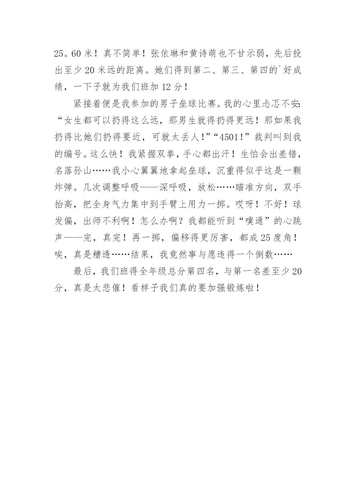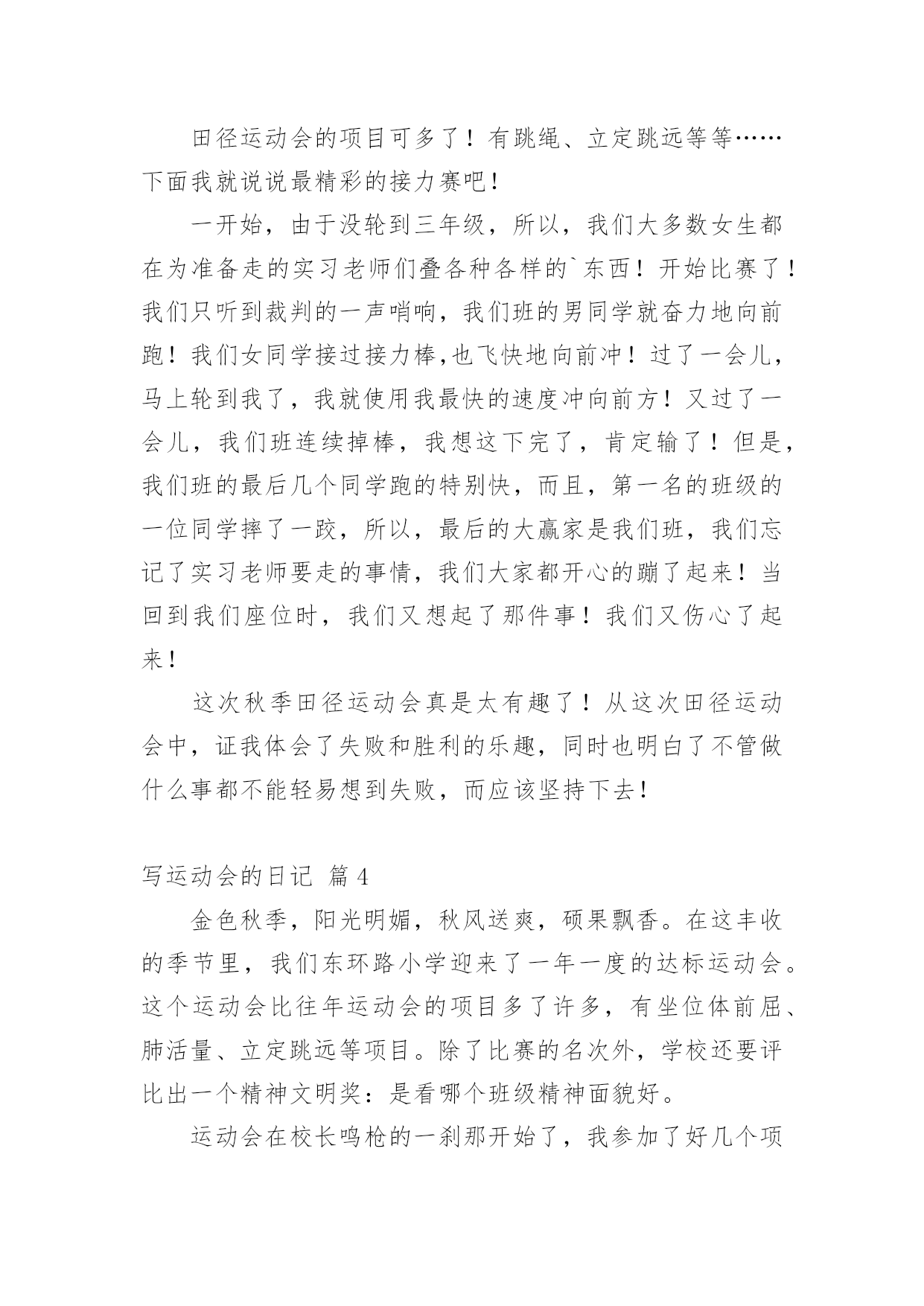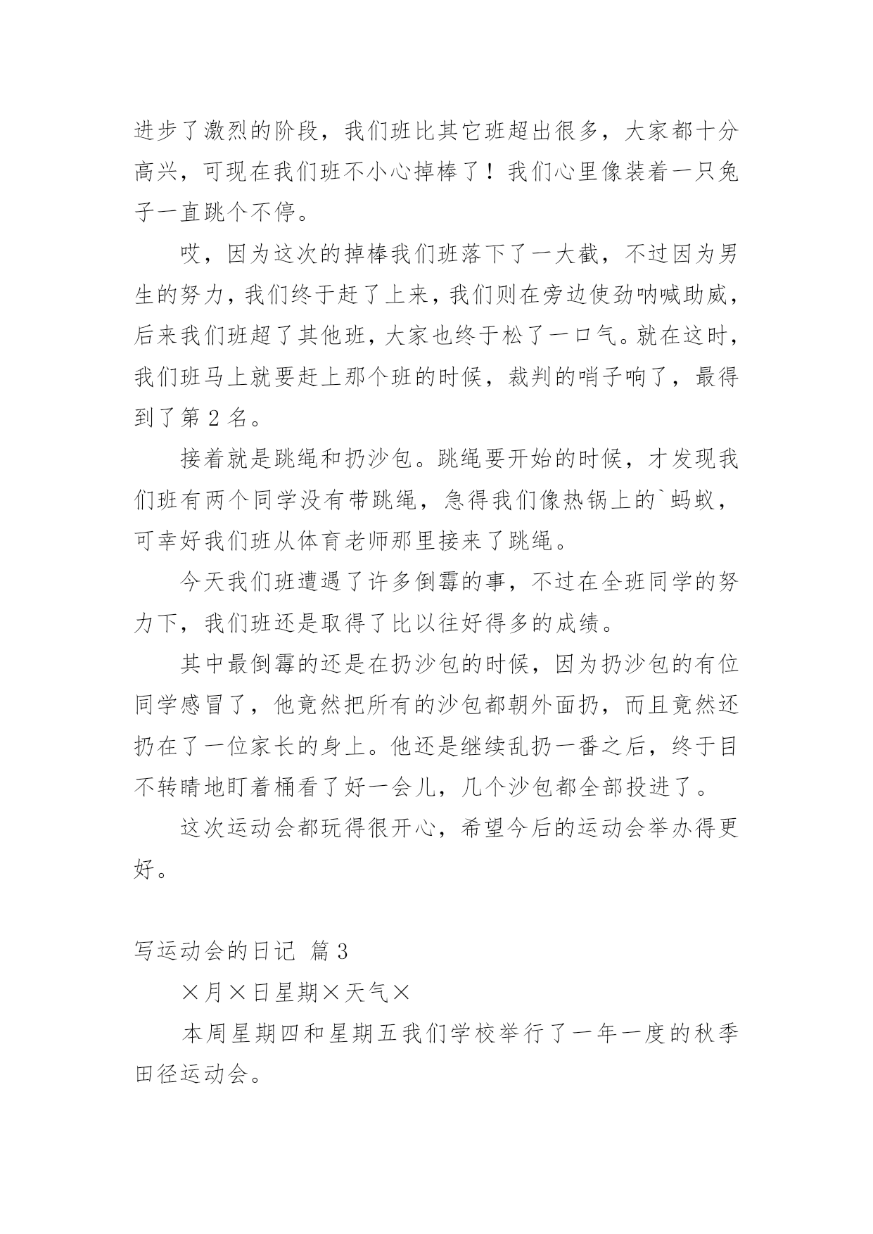 写运动会的日记关于写运动会的日记合集五篇一天的生活不知不觉间结束了,我相信大家都是有收获的,是时候用心地写一篇日记了。日记写什么内容才新颖、丰富呢?下面是小编为大家收集的写运动会的日记5篇,仅供参考,希望能够帮助到大家。写运动会的日记篇1今天,鸟儿在枝头用美好的歌声迎接美好的一天。对,没错,今天我们全校将举办一次春季田径运动会。随着太阳公公不作美的阳光直射到绿茵场上时,开幕式拉开帷幕,一个个班级用自己的整齐队伍入场。轮到我们班!只见我们班同学一个个手持充气棒,戴着黄色冰球帽,井然有序地进入自己的位置。随着杨校长的一声令下,比赛开始。垒球场在“水泥山”后,老师办公室前的'一片空地上举行。我感到那里时,已经人山人海,我好不容易才挤出一个位置。我伸出头,此时,正是我们班的陈名富在投垒。只见陈名富一只手拎着垒球,使出全身力气把垒球投出来。垒球在空中划出一道漂亮的曲线,所有的啦啦队都在呐喊,我们的心都提到嗓子眼上。随着垒球落地,我的世界一片空白……“27米6,陈名富的成绩是27米6。”随着裁判老师的宣布,全场都沸腾,整个赛场都在燃烧,所有人都在为他庆祝,欢呼。随后,高旭——我们班的垒球绝手也进行比赛,可恨的是离陈名富的27米6只差0。3米。结束比赛,我们又来到跳高的现场。跳高现场离垒球现场只有十米远,可依然人起云涌,一点儿也不比垒球现场的人少。我们班上的李倩与唐星尔参加比赛,她们的任务是要跳过高度不一的栏杆,并且栏杆不能掉,要是掉,就算失败,同样的高度,失败三次就要被淘汰。经过一轮轮激烈的角逐,唐星尔遗憾地被淘汰,最后,只剩下李倩与四班、五班的共三名同学。李倩鼓足勇气,双眼全神贯注地盯着跳台,然后双脚用力往前跑,在空中进行一个高难度地翻跟头,然后全场欢呼,李倩跳过去。随后,我还观看50米跑,200米跑,我们班的同学都取得不错的成绩。比赛还在进行,我期待着……写运动会的日记篇2岁月如潮水般抹去了我对许多事情和对许多人的记忆。可是上四年级时的运动会让我至今难忘,那是一次最热烈的运动会。伴着运动会开幕的音乐,校长宣布了运动会的各个项目,让每个班各就各位。先是一百米接力赛跑,一年级的各班就位……在漫长的等待中终于轮到了四年级。我们班选出的都是跑步中的精英。首先第一棒是让我们班跑步很快的吉则衣达,接着跑步进步了激烈的阶段,我们班比其它班超出很多,大家都十分高兴,可现在我们班不小心掉棒了!我们心里像装着一只兔子一直跳个不停。哎,因为这次的掉棒我们班落下了一大截,不过因为男生的努力,我们终于赶了上来,我们则在旁边使劲呐喊助威,后来我们班超了其他班,大家也终于松了一口气。就在这时,我们班马上就要赶上那个班的时候,裁判的哨子响了,最得到了第2名。接着就是跳绳和扔沙包。跳绳要开始的时候,才发现我们班有两个同学没有带跳绳,急得我们像热锅上的`蚂蚁,可幸好我们班从体育老师那里接来了跳绳。今天我们班遭遇了许多倒霉的事,不过在全班同学的努力下,我们班还是取得了比以往好得多的成绩。其中最倒霉的还是在扔沙包的时候,因为扔沙包的有位同学感冒了,他竟然把所有的沙包都朝外面扔,而且竟然还扔在了一位家长的身上。他还是继续乱扔一番之后,终于目不转睛地盯着桶看了好一会儿,几个沙包都全部投进了。这次运动会都玩得很开心,希望今后的运动会举办得更好。写运动会的日记篇3×月×日星期×天气×本周星期四和星期五我们学校举行了一年一度的秋季田径运动会。田径运动会的项目可多了!有跳绳、立定跳远等等……下面我就说说最精彩的接力赛吧!一开始,由于没轮到三年级,所以,我们大多数女生都在为准备走的实习老师们叠各种各样的`东西!开始比赛了!我们只听到裁判的一声哨响,我们班的男同学就奋力地向前跑!我们女同学接过接力棒,也飞快地向前冲!过了一会儿,马上轮到我了,我就使用我最快的速度冲向前方!又过了一会儿,我们班连续掉棒,我想这下完了,肯定输了!但是,我们班的最后几个同学跑的特别快,而且,第一名的班级的一位同学摔了一跤,所以,最后的大赢家是我们班,我们忘记了实习老师要走的事情,我们大家都开心的蹦了起来!当回到我们座位时,我们又想起了那件事!我们又伤心了起来!这次秋季田径运动会真是太有趣了!从这次田径运动会中,证我体会了失败和胜利的乐趣,同时也明白了不管做什么事都不能轻易想到失败,而应该坚持下去!写运动会的日记篇4金色秋季,阳光明媚,秋风送爽,硕果飘香。在这丰收的季节里,我们东环路小学迎来了一年一度的达标运动会。这个运动会比往年运动会的项目多了许多,有坐位体前屈、肺活量、立定跳远等项目。除了比赛的名次外,学校还要评比出一个精神文明奖:是看哪个班级精神面貌好。运动会在校长鸣枪的一刹那开始了,我参加了好几个项目的.比拼。跑道上、沙坑前,运动员们都认真比赛,努力为班级增光添彩;班级中的拉拉队为他们呐喊助威,奏起了一