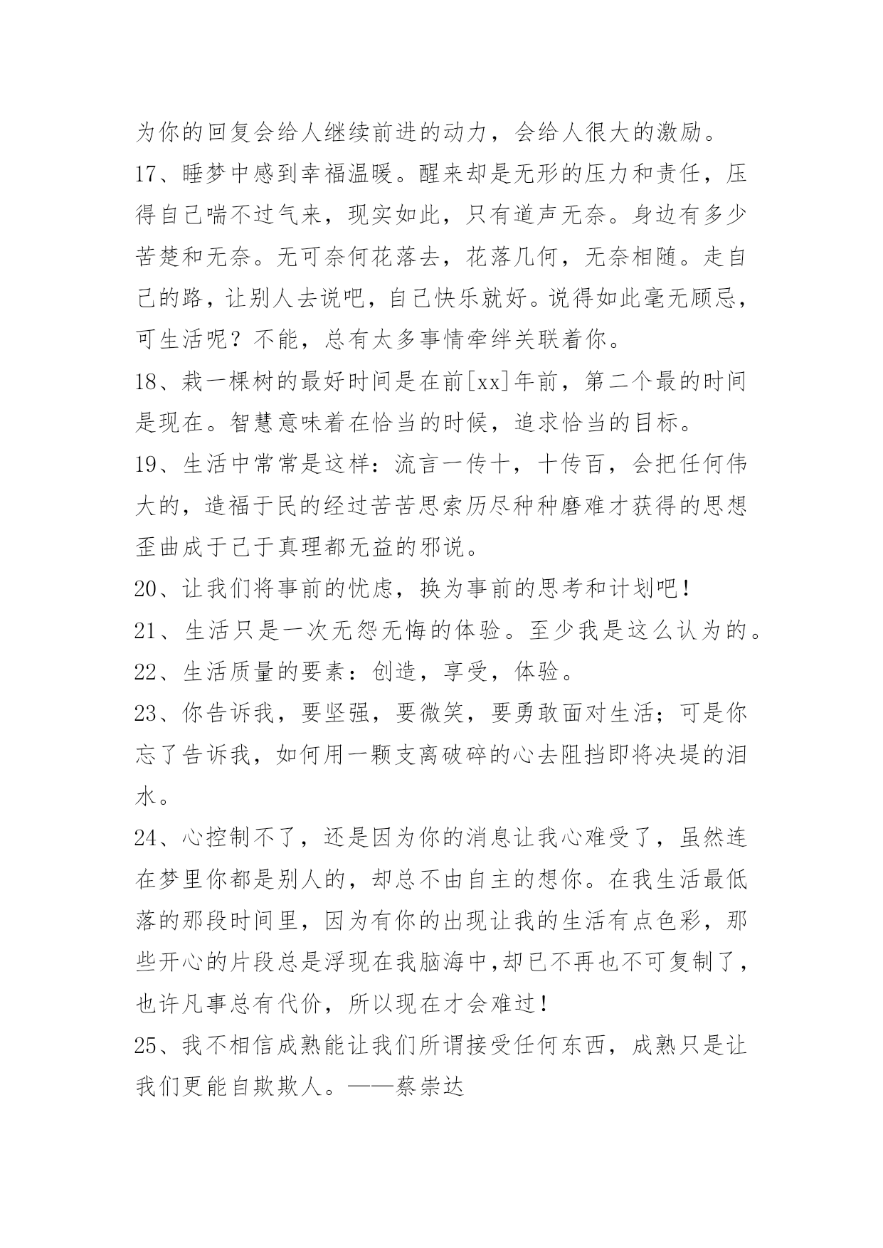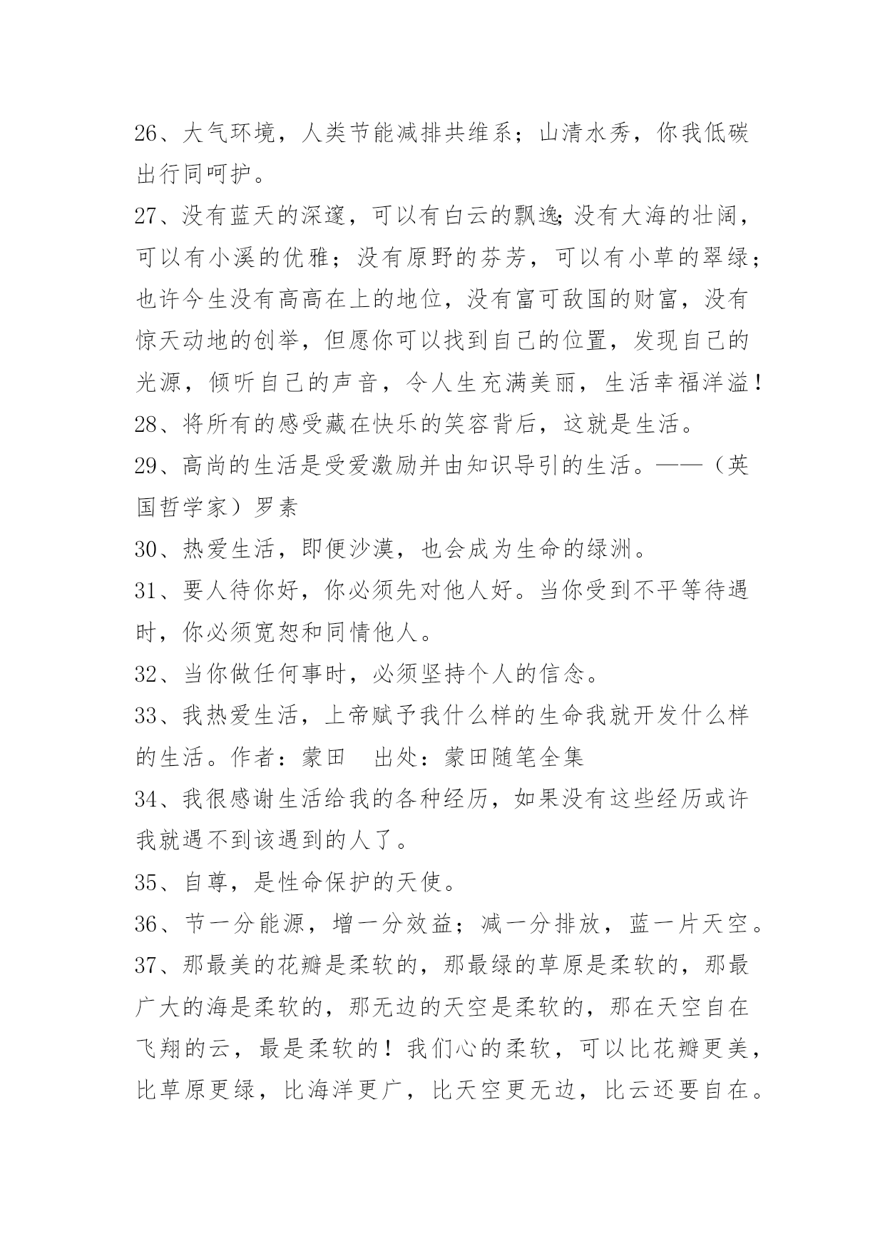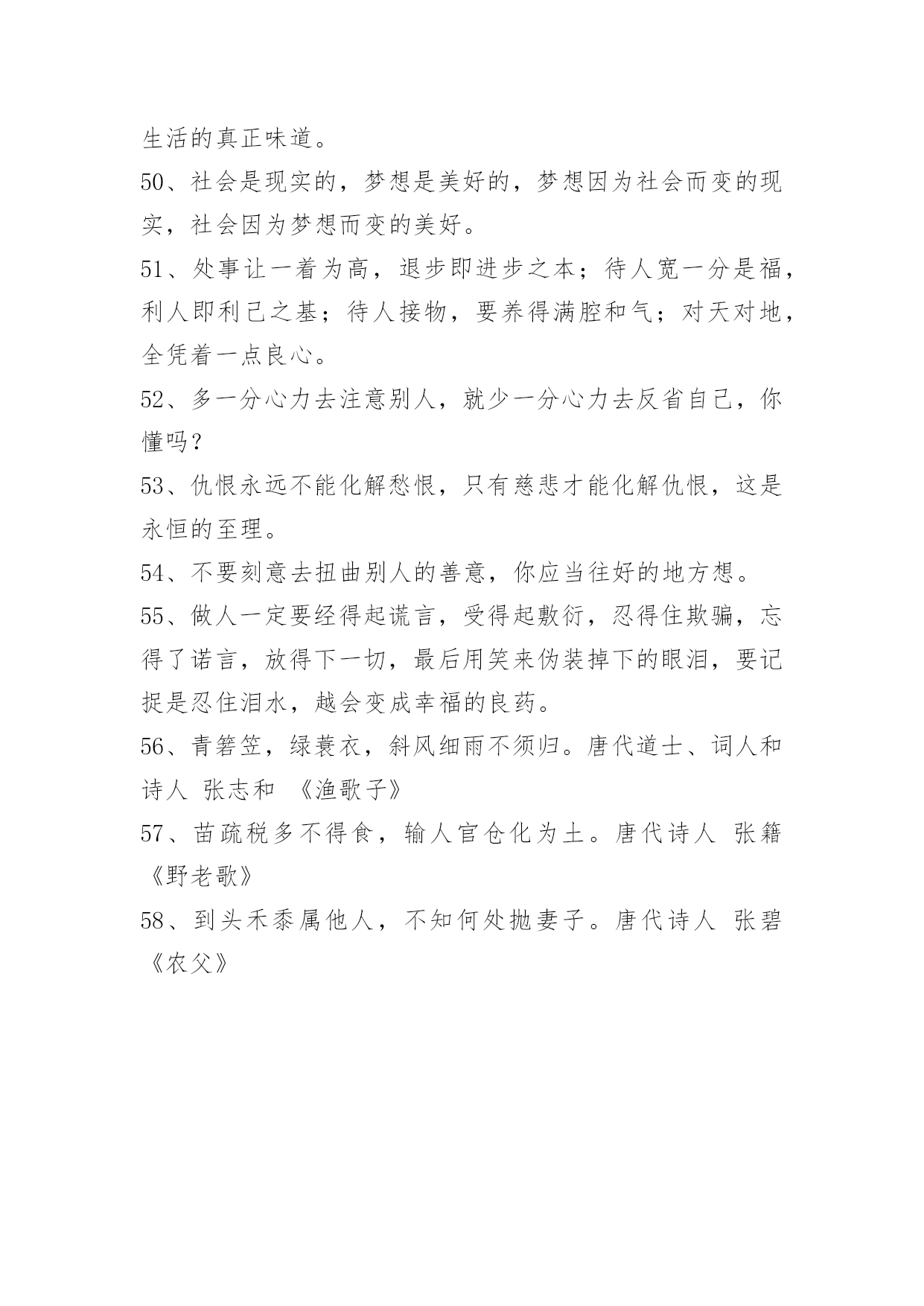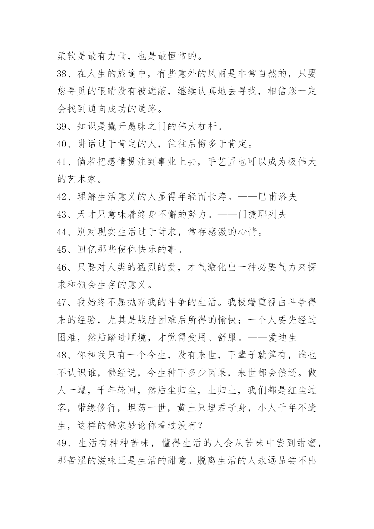生活感悟格言58条生活感悟格言集合58条智慧最后的结论是:生活也好,自由也好,都要天天去赢取,这才有资格去享有它。——歌德以下是小编搜索整理的生活感悟格言58条,供各位参考。1、我热爱生活,上帝赋予我什么样的生命我就开发什么样的生活。2、强大不是说你能打败别人,而是你能帮助别人,也能帮助自己。3、孤独的人分是会存心的记住他生命外呈现过的每一小我,于是我分是意犹未尽地想起你正在每个星光陨落的晚上一遍一遍数我的孤独。4、生活中如果只有幸福、快乐,没有苦难、悲伤,这样的生活至少不是人的生活。企图只去选择享乐和满足的生活,只能带来愚昧和野蛮。5、永久都不要静止微笑即便是在你难受的时候说不定哪一天有人会因为你的笑容面爱上你。6、生活是恼人的牢笼。一个有思想的人到成年时期,对生活有了成熟的感觉,他就不能不感到他关在一个无从脱逃的牢笼里面。7、生活就像骑单车,为了保持平衡你必须一直往前。8、为了在生活中努力发挥自己的作用,热爱人生吧。——罗丹《罗丹艺术论》9、生活真像这杯浓酒,不经三番五次的提炼呵,就不会这样可口!——郭小川10、人生就是一场漫长对抗,有些人笑在开始,有些人却赢在最终。试着微笑,试着回眸,放松自己,不强求、不萎靡、不浮躁。简单生活,随心、随性、随缘,做最好的自己,知足、微笑、淡然!即使再苦再累,只要坚持往前走,属于自己的风景终会出现!11、生活就是用斗争、探索、操劳的火燃烧自己。——[比利时]维尔哈伦12、生活的全部意义在于无穷地探索尚未知道的东西,在于不断地增加更多的知识。——[法国]左拉13、谁逃避由于害怕孤独而引起的斗争,谁就是战胜者……只有诚实的人,才知道真正的英雄主义……世界上只有一种英雄主义,这就是要认识生活,而且还要热爱生活。——[奥地利]茨威格14、走哪条路?为什么要走这条路?应当追求什么?需要不需要有所追求?并不是所有的人都能从生活中得到应得的东西,并不是所有人的生活安排得都像乘法表计算的那样准确。——[前苏联]格里戈里·麦登斯基15、无目标而生活,犹如没有罗盘而行。——拉斯金16、在繁忙中,在喧嚣中,在寂寞中,在困苦中,在得失中,在成败中,在欢愉中,在幸福中,每天拿出十分钟来静静地梳理一下我们的人生,我们会发觉:哦,人生是这样的。如果你看到一个贴子还值得一看的话,那么你一定要回复,因为你的回复会给人继续前进的动力,会给人很大的激励。17、睡梦中感到幸福温暖。醒来却是无形的压力和责任,压得自己喘不过气来,现实如此,只有道声无奈。身边有多少苦楚和无奈。无可奈何花落去,花落几何,无奈相随。走自己的路,让别人去说吧,自己快乐就好。说得如此毫无顾忌,可生活呢?不能,总有太多事情牵绊关联着你。18、栽一棵树的最好时间是在前[xx]年前,第二个最的时间是现在。智慧意味着在恰当的时候,追求恰当的目标。19、生活中常常是这样:流言一传十,十传百,会把任何伟大的,造福于民的经过苦苦思索历尽种种磨难才获得的思想歪曲成于己于真理都无益的邪说。20、让我们将事前的忧虑,换为事前的思考和计划吧!21、生活只是一次无怨无悔的体验。至少我是这么认为的。22、生活质量的要素:创造,享受,体验。23、你告诉我,要坚强,要微笑,要勇敢面对生活;可是你忘了告诉我,如何用一颗支离破碎的心去阻挡即将决堤的泪水。24、心控制不了,还是因为你的消息让我心难受了,虽然连在梦里你都是别人的,却总不由自主的想你。在我生活最低落的那段时间里,因为有你的出现让我的生活有点色彩,那些开心的片段总是浮现在我脑海中,却已不再也不可复制了,也许凡事总有代价,所以现在才会难过!25、我不相信成熟能让我们所谓接受任何东西,成熟只是让我们更能自欺欺人。——蔡崇达26、大气环境,人类节能减排共维系;山清水秀,你我低碳出行同呵护。27、没有蓝天的深邃,可以有白云的飘逸;没有大海的壮阔,可以有小溪的优雅;没有原野的芬芳,可以有小草的翠绿;也许今生没有高高在上的地位,没有富可敌国的财富,没有惊天动地的创举,但愿你可以找到自己的位置,发现自己的光源,倾听自己的声音,令人生充满美丽,生活幸福洋溢!28、将所有的感受藏在快乐的笑容背后,这就是生活。29、高尚的生活是受爱激励并由知识导引的生活。——(英国哲学家)罗素30、热爱生活,即便沙漠,也会成为生命的绿洲。31、要人待你好,你必须先对他人好。当你受到不平等待遇时,你必须宽恕和同情他人。32、当你做任何事时,必须坚持个人的信念。33、我热爱生活,上帝赋予我什么样的生命我就开发什么样的生活。作者:蒙田出处:蒙田随笔全集34、我很感谢生活给我的各种经历,如果没有这些经历或许我就遇不到该遇到的人了。35、自尊,是性命保护的天使。36、节一分能源,增一分效益;减一分排放,蓝一片天空。37、那最美的花瓣是柔软的,那最绿的草原是柔软的,那最广大的